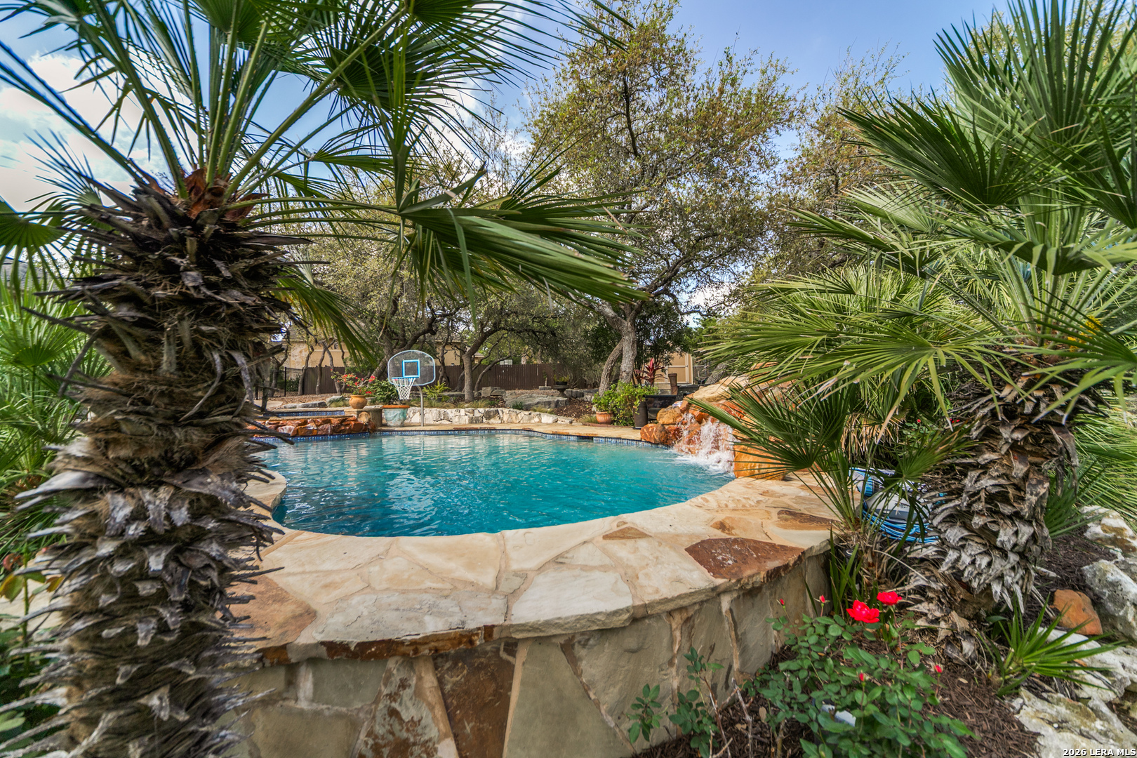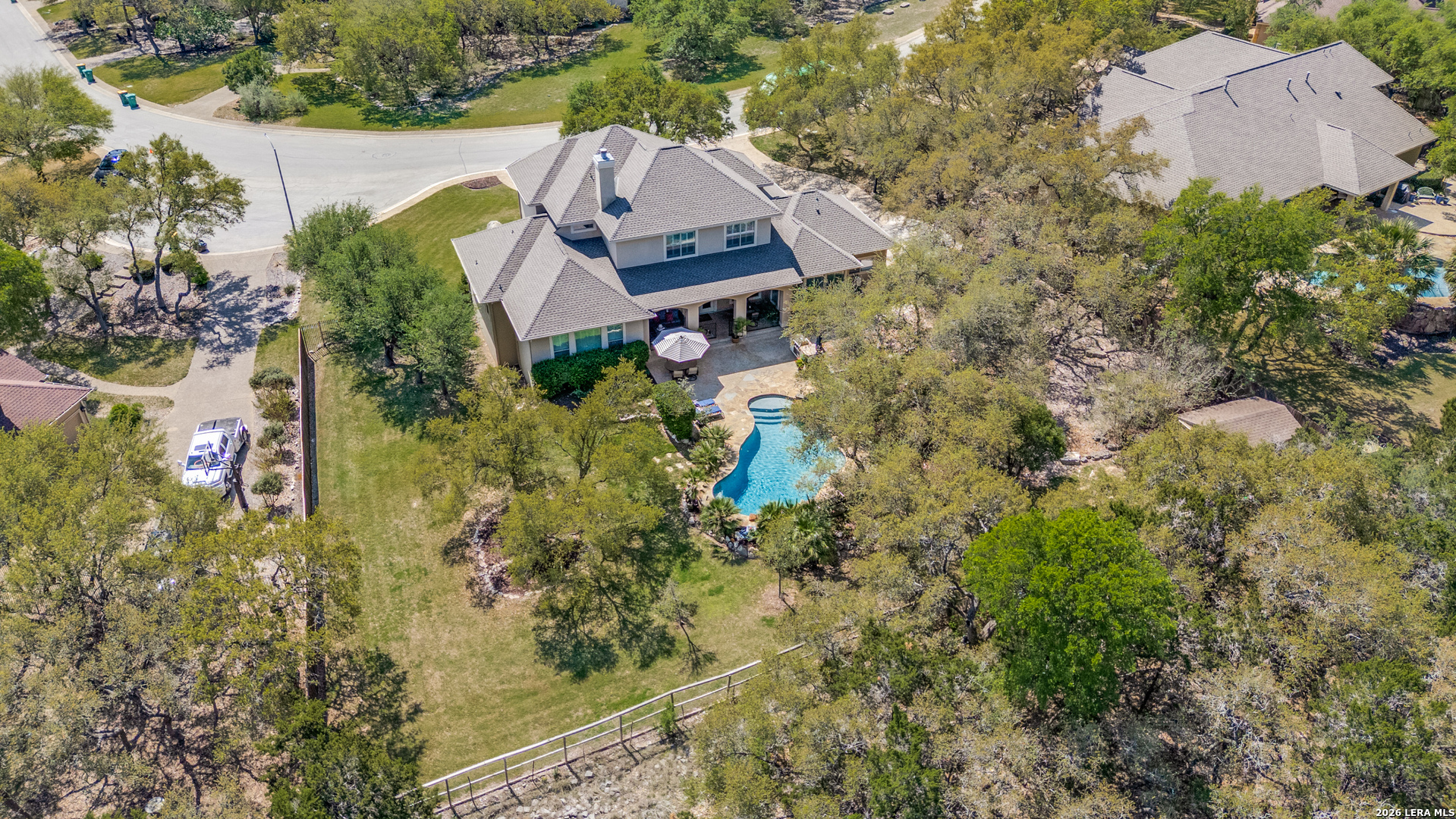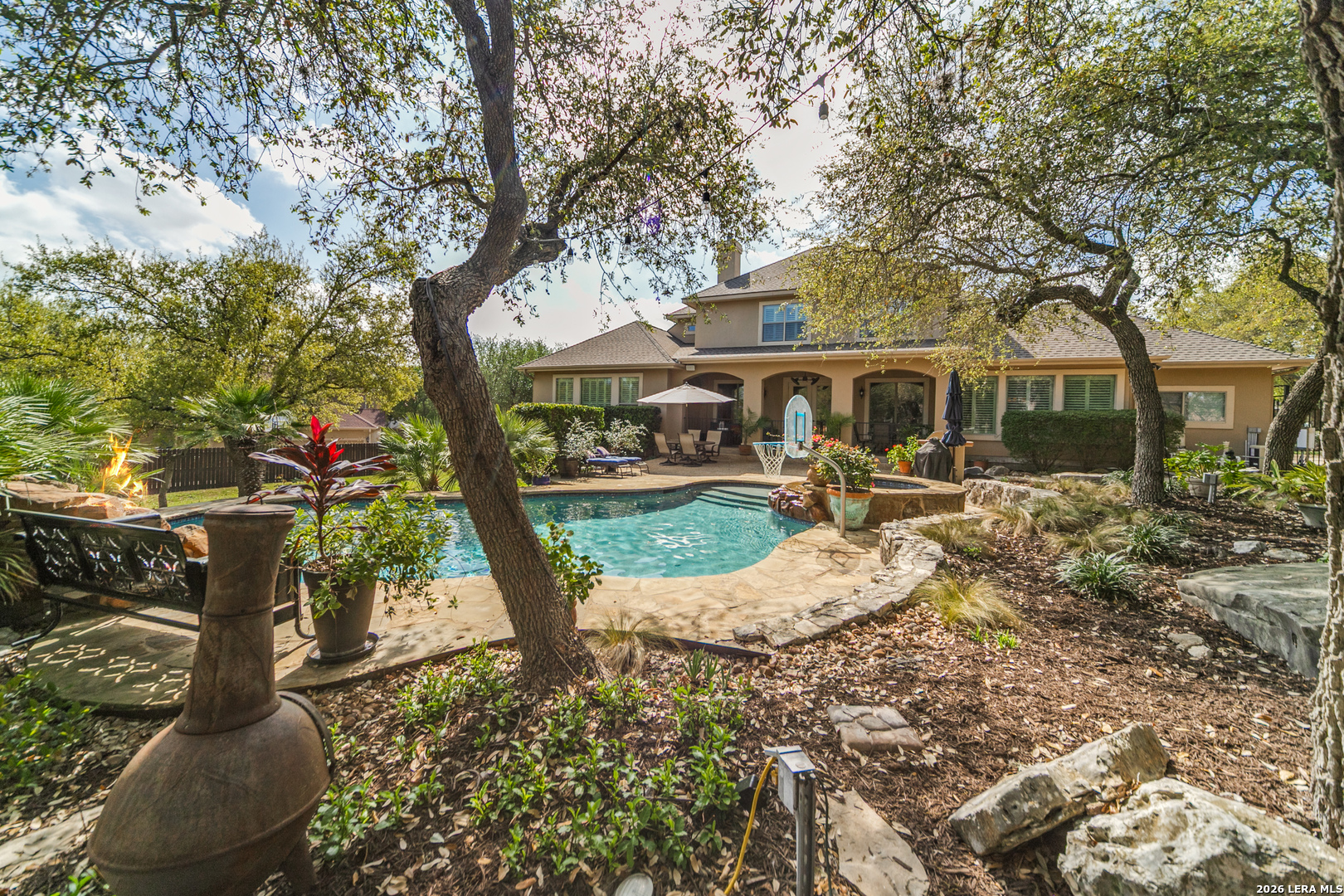 Nestled on a private, over half-acre lot within the gated community of Bent Tree in the highly desirable Heights at Stone Oak, this stunning custom home offers an exceptional blend of comfort, elegance, and thoughtful design. Step inside to an inviting open floor plan, where expansive windows flood the home with natural light and frame picturesque views of your backyard oasis. A formal dining room with custom faux painting and hand-scraped wood flooring creates the perfect setting for memorable gatherings, while a dedicated study provides an ideal space for working from home. The spacious main living area is anchored by a striking floor-to-ceiling rock fireplace with a built-in TV niche, creating a warm and welcoming centerpiece. The adjacent chef's kitchen is beautifully appointed with granite countertops, a gas cooktop, double ovens, a large walk-in pantry, and a cozy breakfast area for casual dining. The oversized primary suite, located on the main level, serves as a private retreat with a spa-like bathroom featuring separate vanities, a glass walk-in shower, a garden tub, and a generous walk-in closet. A convenient half bath and well-equipped laundry room with additional storage and a sink complete the main floor. Upstairs, three spacious bedrooms are complemented by two full bathrooms and a large game room, offering plenty of space for relaxation and entertainment. Plantation shutters throughout the home add timeless style and privacy. Step outside to your own resort-style backyard, where a covered patio overlooks a sparkling heated pool and spa with a tranquil waterfall feature. Surrounded by mature trees, this outdoor space offers both privacy and the perfect setting for entertaining or unwinding. The backyard also includes a Tuff Shed, providing additional storage or workspace. Additional highlights include a 3-car attached garage and ample storage throughout. This exceptional home combines luxury living with everyday functionality, an incredible opportunity to own a private sanctuary in one of Stone Oak's most sought-after gated communities.