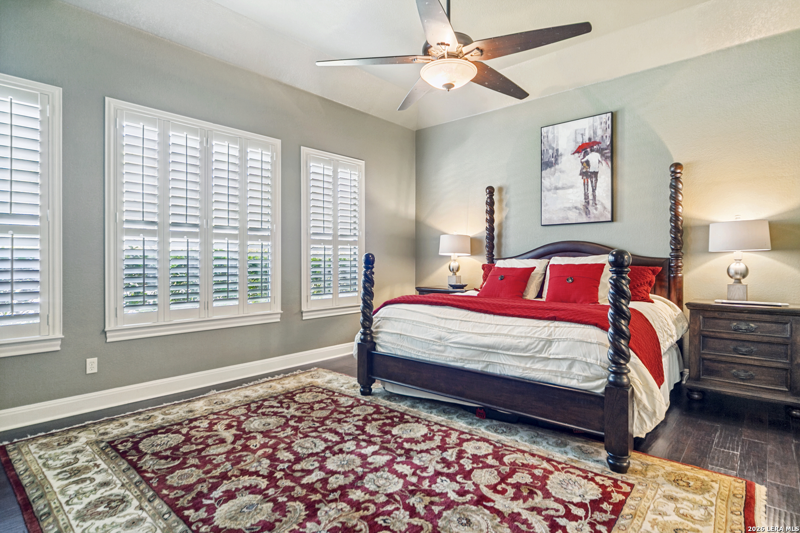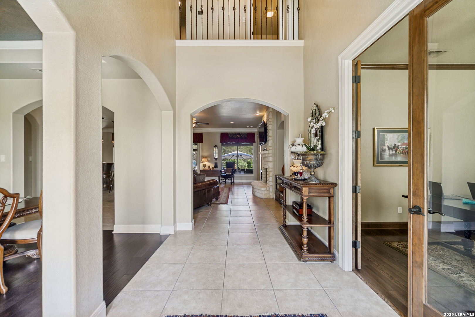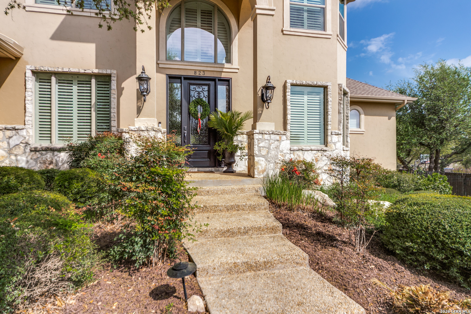 Nestled on a private, over half-acre lot within the gated community of Bent Tree in the highly desirable Heights at Stone Oak, this stunning custom home offers an exceptional blend of comfort, elegance, and thoughtful design. Step inside to an inviting open floor plan, where expansive windows flood the home with natural light and frame picturesque views of your backyard oasis. A formal dining room with custom faux painting and hand-scraped wood flooring creates the perfect setting for memorable gatherings, while a dedicated study provides an ideal space for working from home. The spacious main living area is anchored by a striking floor-to-ceiling rock fireplace with a built-in TV niche, creating a warm and welcoming centerpiece. The adjacent chef's kitchen is beautifully appointed with granite countertops, a gas cooktop, double ovens, a large walk-in pantry, and a cozy breakfast area for casual dining. The oversized primary suite, located on the main level, serves as a private retreat with a spa-like bathroom featuring separate vanities, a glass walk-in shower, a garden tub, and a generous walk-in closet. A convenient half bath and well-equipped laundry room with additional storage and a sink complete the main floor. Upstairs, three spacious bedrooms are complemented by two full bathrooms and a large game room, offering plenty of space for relaxation and entertainment. Plantation shutters throughout the home add timeless style and privacy. Step outside to your own resort-style backyard, where a covered patio overlooks a sparkling heated pool and spa with a tranquil waterfall feature. Surrounded by mature trees, this outdoor space offers both privacy and the perfect setting for entertaining or unwinding. The backyard also includes a Tuff Shed, providing additional storage or workspace. Additional highlights include a 3-car attached garage and ample storage throughout. This exceptional home combines luxury living with everyday functionality, an incredible opportunity to own a private sanctuary in one of Stone Oak's most sought-after gated communities.