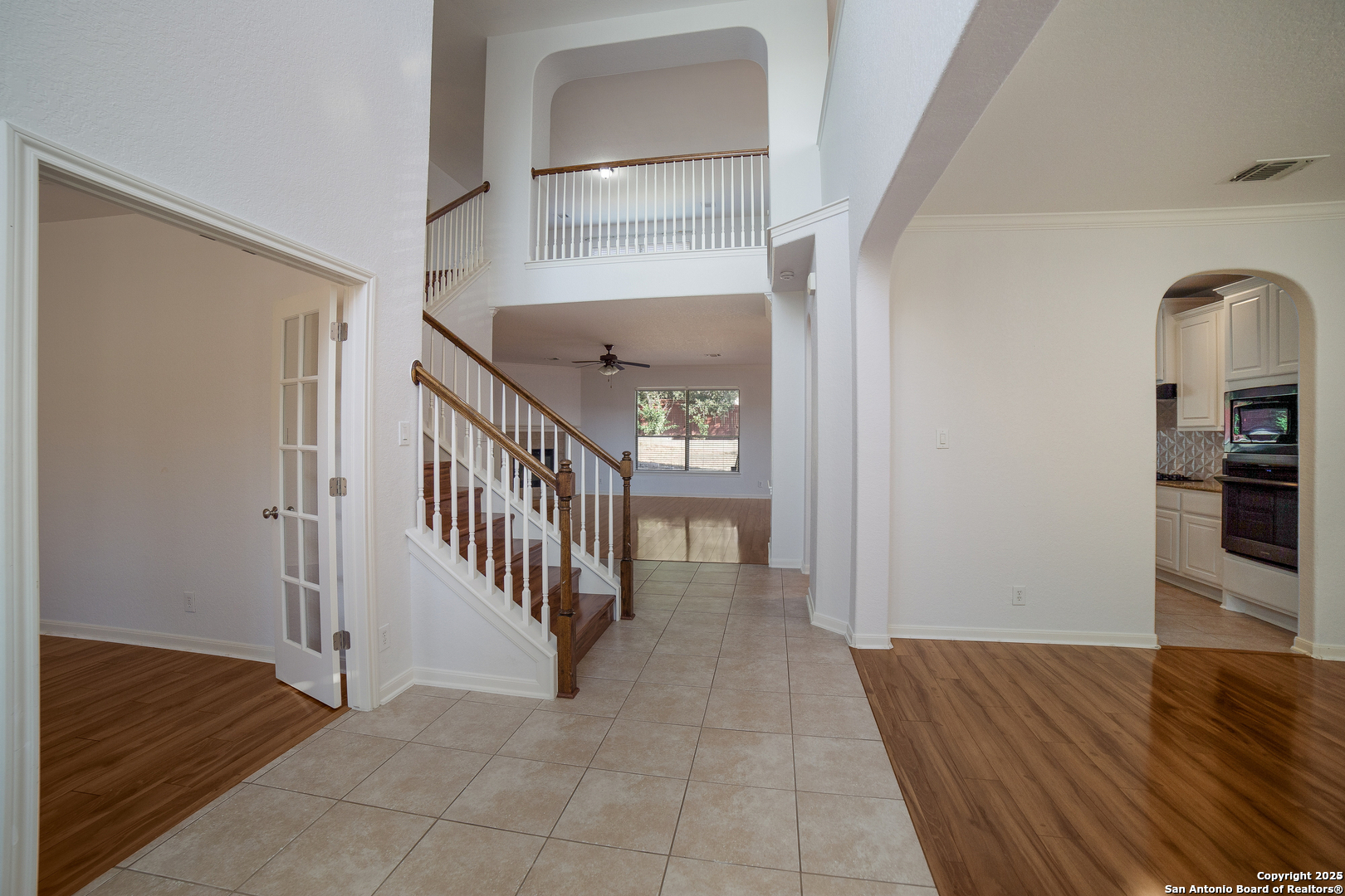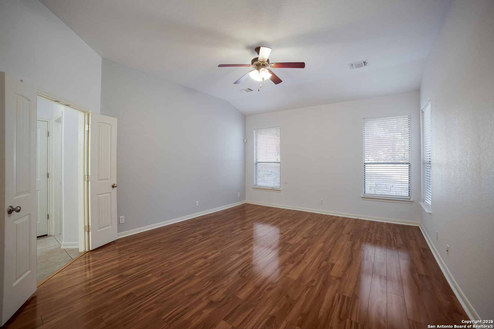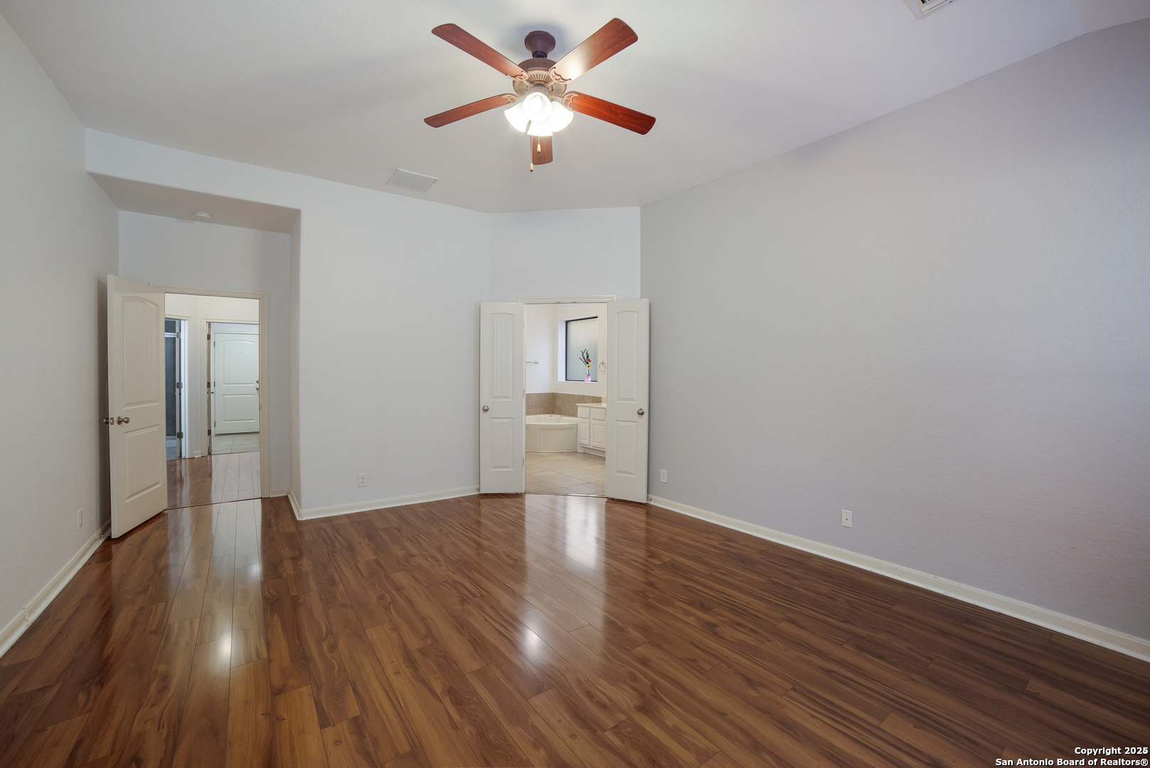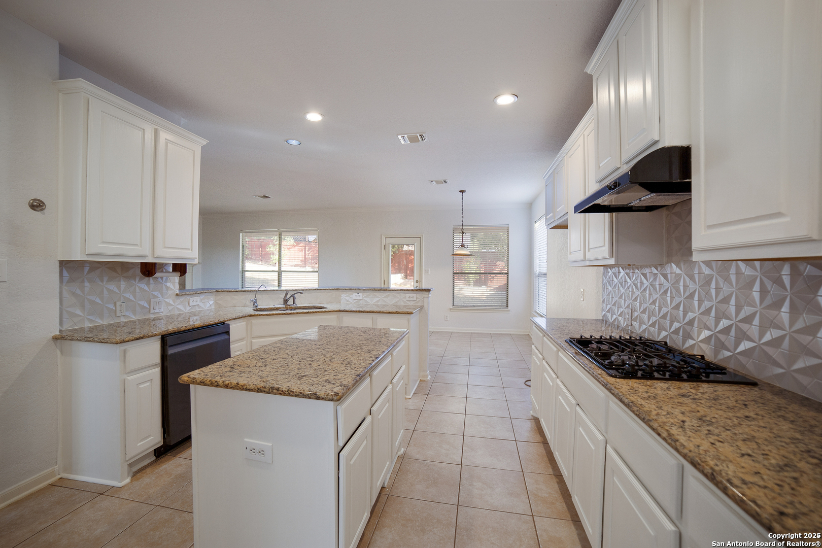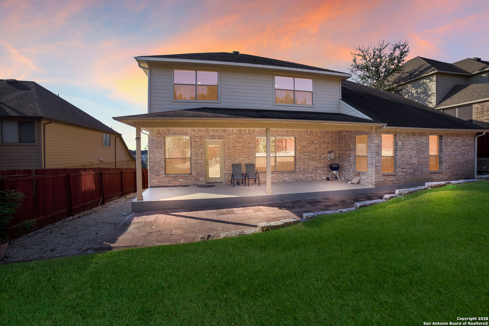 Beautiful 5-bedroom, 4-bath home located in the gated community of Terra Bella in Stone Oak. This property offers an open floor plan with high ceilings, luxury vinyl plank and tile flooring, and a spacious dining room. The gourmet kitchen features granite countertops, gas cooking, stainless steel built-in appliances, abundant cabinet space, and an eat-in breakfast area. The family room includes a gas fireplace and large windows for natural light. The downstairs primary suite offers a garden tub, separate shower, dual vanities, and walk-in closet. A secondary bedroom with full bath is also located on the first floor. Upstairs you'll find a large game room, media room with projector and screen, Jack-and-Jill bedrooms with shared bath, and an additional bedroom with private bath. Exterior features include a covered patio, oversized 2-car garage with high ceilings, and sprinkler system. Recent updates include new dishwasher, built-in oven, downstairs AC, and roof (Feb 2025). Community amenities include clubhouse, pool, playground, park, and sports courts. Convenient access to Highway 281, Loop 1604, shopping, dining, and Northeast ISD schools with no city taxes.