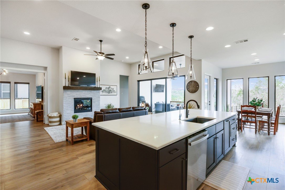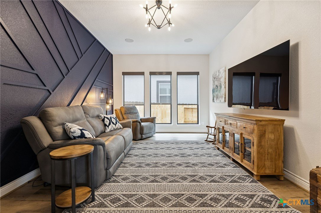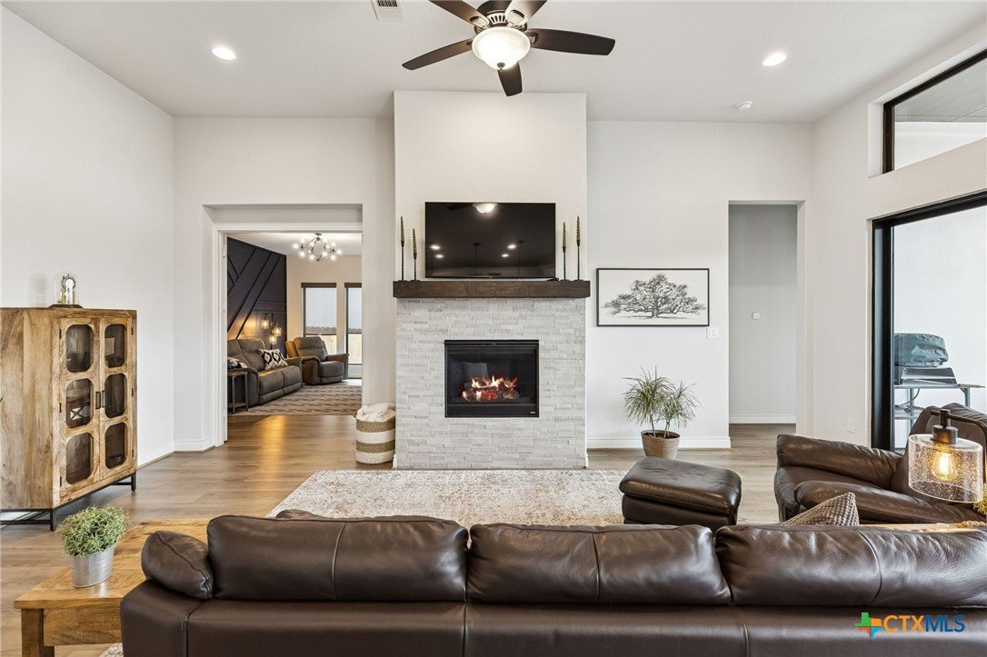 Welcome to this exceptional, better-than-new single-story Perry Home in the highly sought-after La Cima neighborhood. Thoughtfully designed and meticulously maintained, this stunning residence offers 2,895 square feet of beautifully curated living space with soaring ceilings and an open, airy feel throughout. Featuring 4 bedrooms and 4 bathrooms, the layout is ideal for both everyday living and entertaining. A versatile flex space just off the living room is perfect for a media room, playroom, or office and is already wired for surround sound. The heart of the home is the impressive kitchen, showcasing stainless steel appliances, floor-to-ceiling white cabinetry with glass-front uppers, quartz countertops, and a large island with ample storage and seating. An alkaline water dispenser at the sink adds an elevated touch. The kitchen opens seamlessly to the spacious living room, highlighted by beamed ceilings and a cozy fireplace. Tucked privately at the back of the home, the primary suite offers peaceful views through large picture windows without harsh sun exposure. The ensuite bath features dual vanities, an oversized soaking tub, and a separate walk-in shower. One secondary bedroom includes its own ensuite bath—ideal for guests or multigenerational living—while two additional bedrooms share a Jack-and-Jill bathroom. A convenient guest half bath completes the interior. Expansive sliding glass doors lead to an oversized covered porch, creating inviting indoor-outdoor living. With private property behind, you’ll enjoy beautiful views and no rear neighbors. The fully landscaped exterior includes trim lighting with a lifetime warranty. The three-car garage features epoxy flooring with a lifetime warranty, plus a water softener and whole-house filtration system. Located in a community with resort-style amenities including a pool, trails, parks, playgrounds, fitness center, and clubhouse, this move-in-ready home offers luxury, comfort, and exceptional lifestyle living.