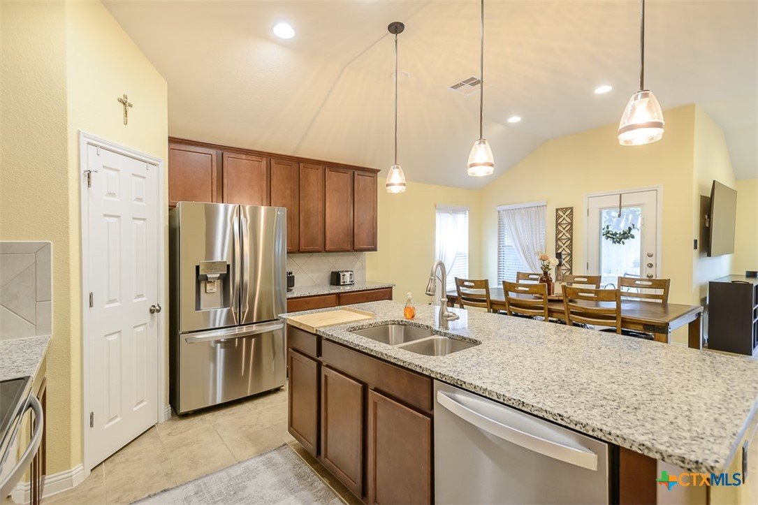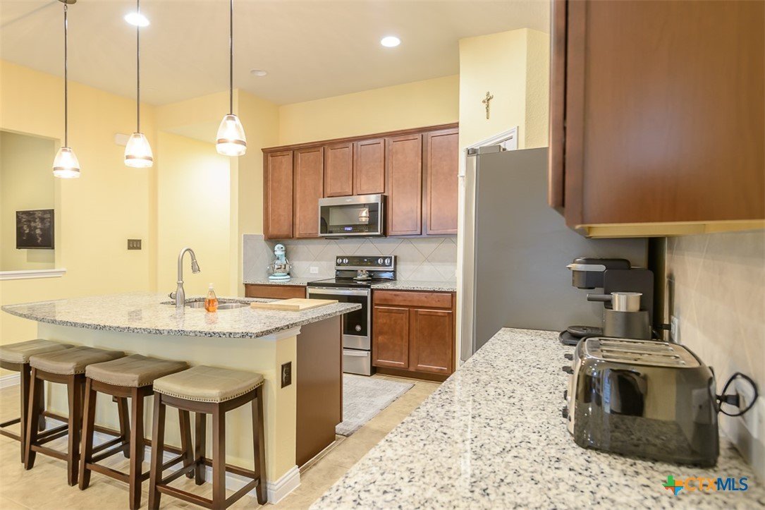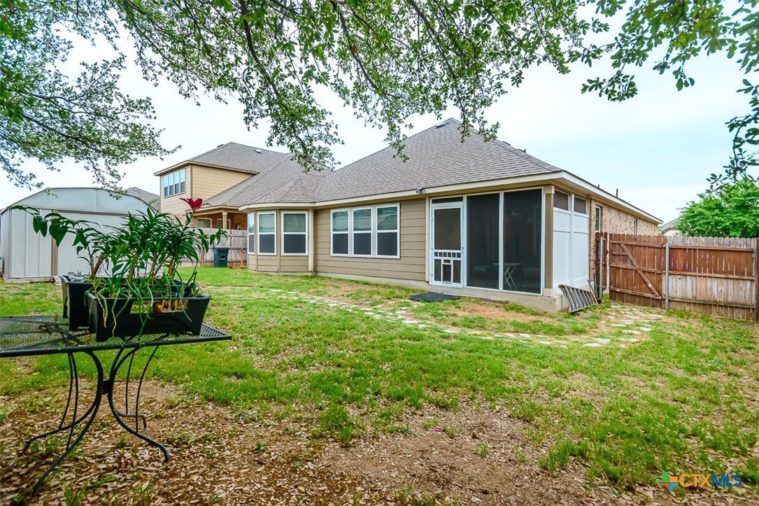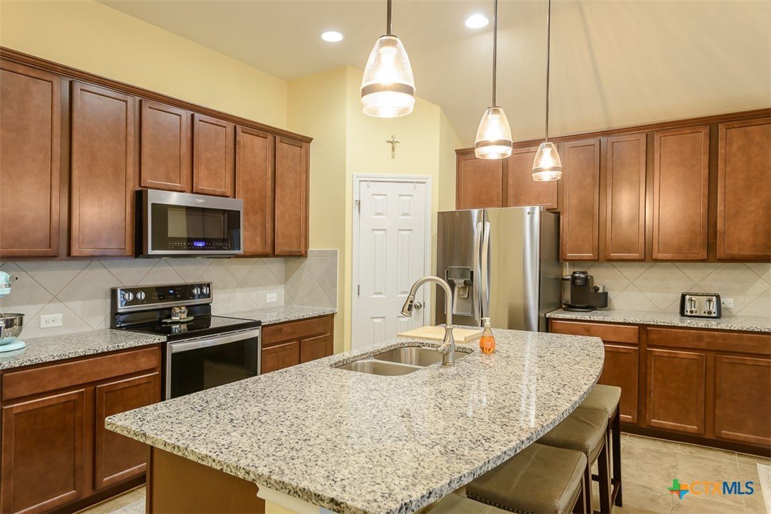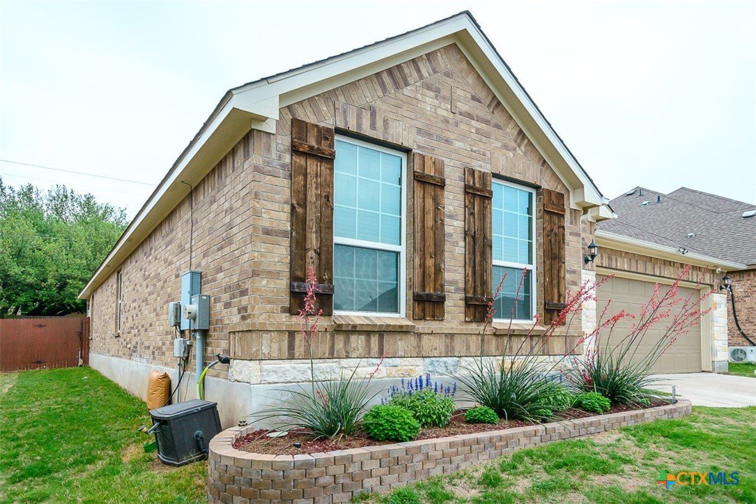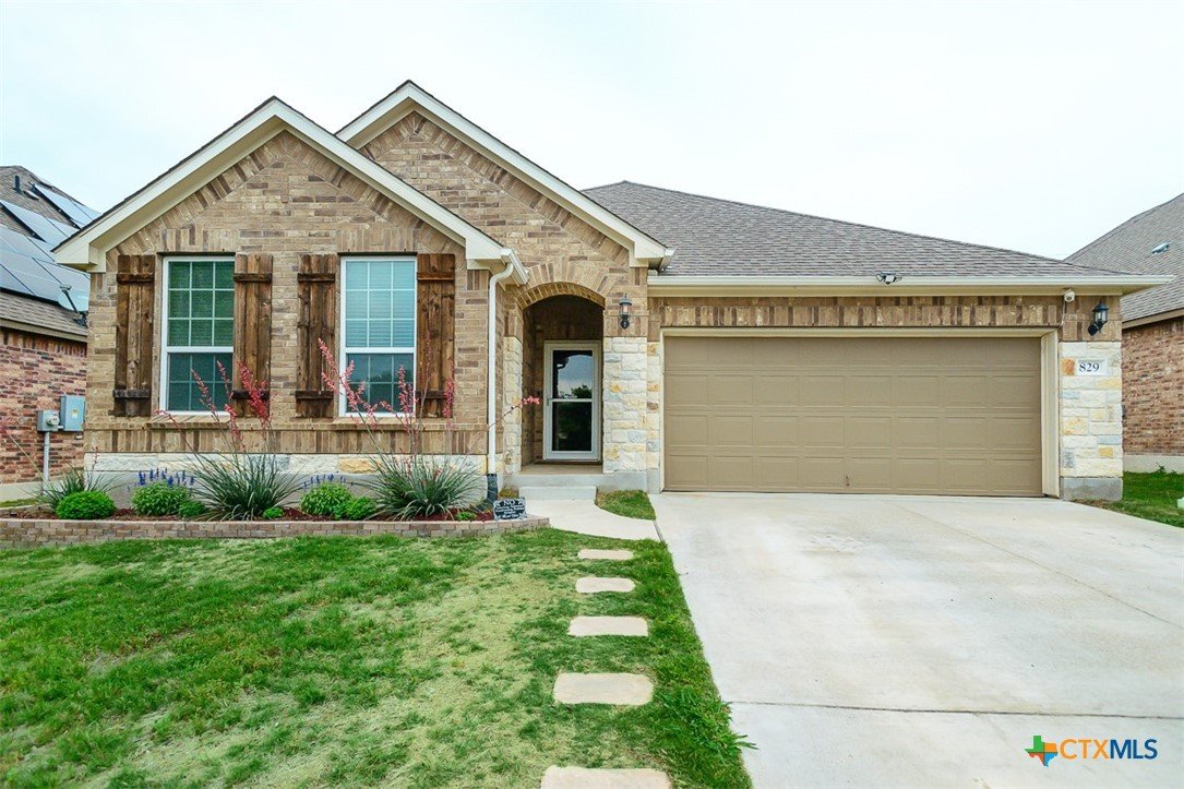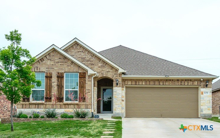 Set in a quiet neighborhood with easy access to schools, parks, shopping, and dining, this home offers both convenience and charm. A striking blend of brick and stone is complemented by wood shutters and an arched entryway, creating standout appeal from the curb. The backyard features a covered patio and ample room for outdoor fun or relaxing evenings. Step inside to a bright, open layout where the kitchen, dining area, and great room flow together under high ceilings with tile floors and abundant natural light. The island kitchen is ideal for entertaining or daily life, with granite countertops, stainless steel appliances, and extensive cabinet storage. A built-in desk nook offers the perfect command center for staying organized while staying connected to the heart of the home. The owner's suite feels like a retreat with a high ceiling and a large window that lets in the light. The attached bath includes a soaking tub, separate shower, and generous storage. Additional highlights include a dedicated mud room .