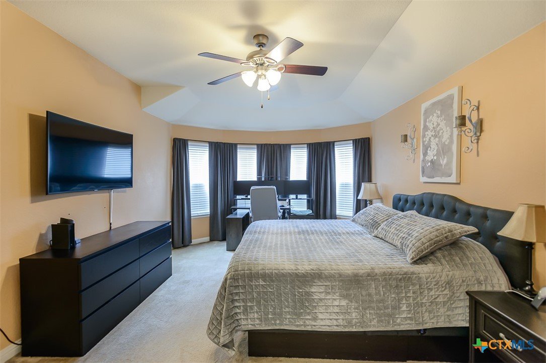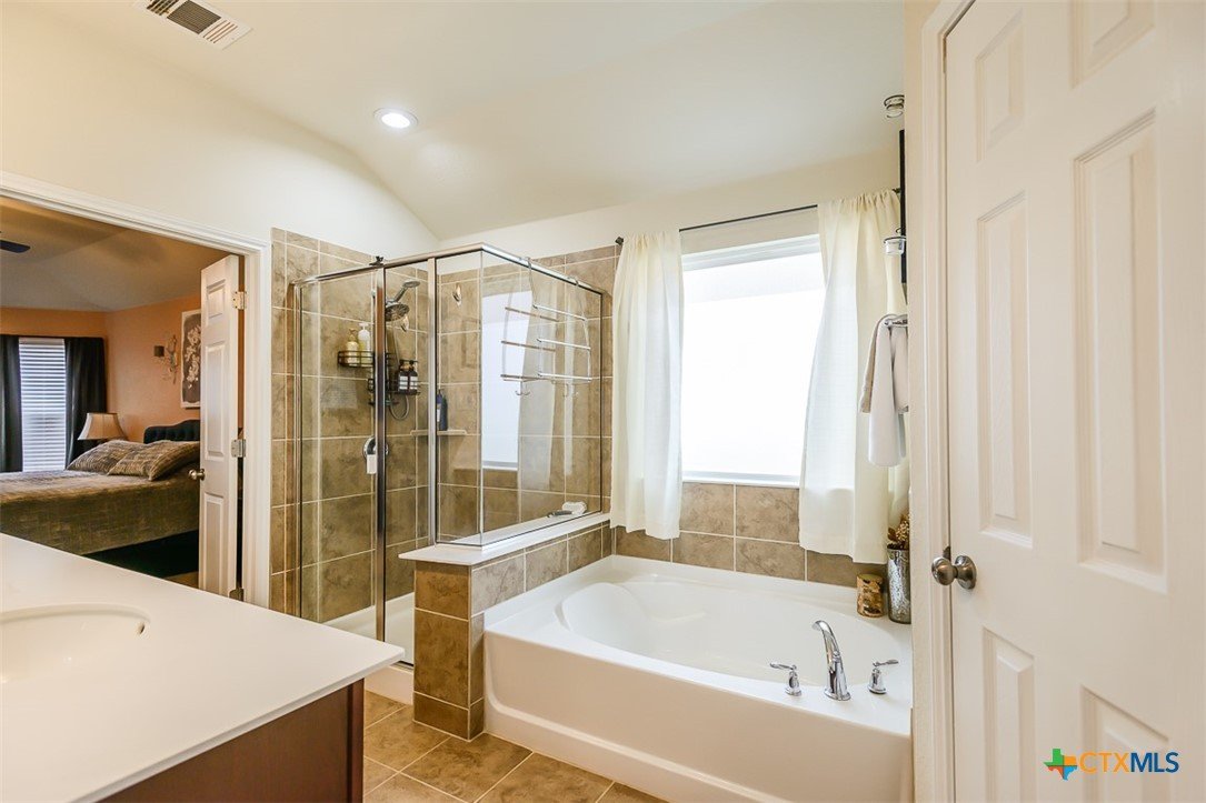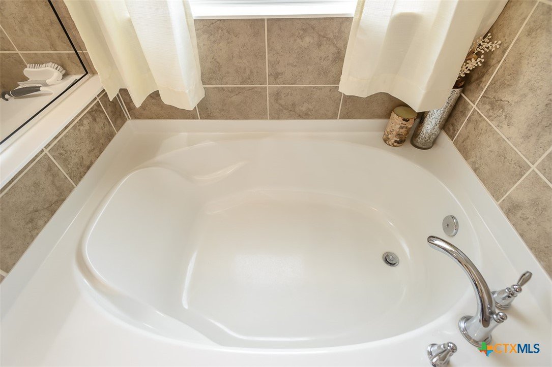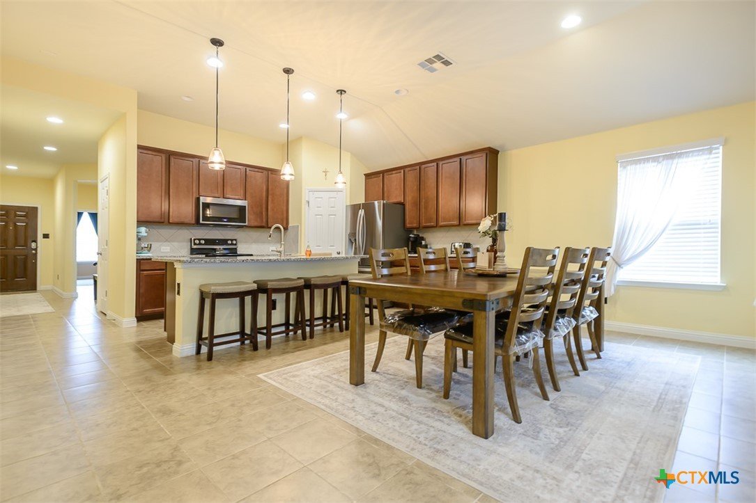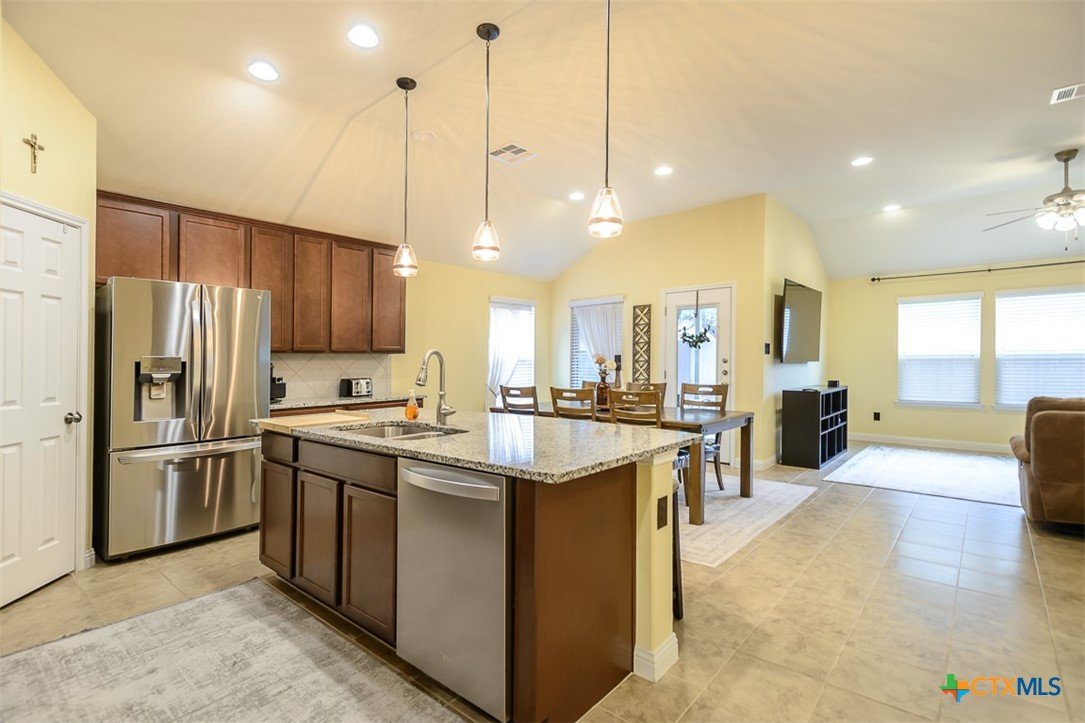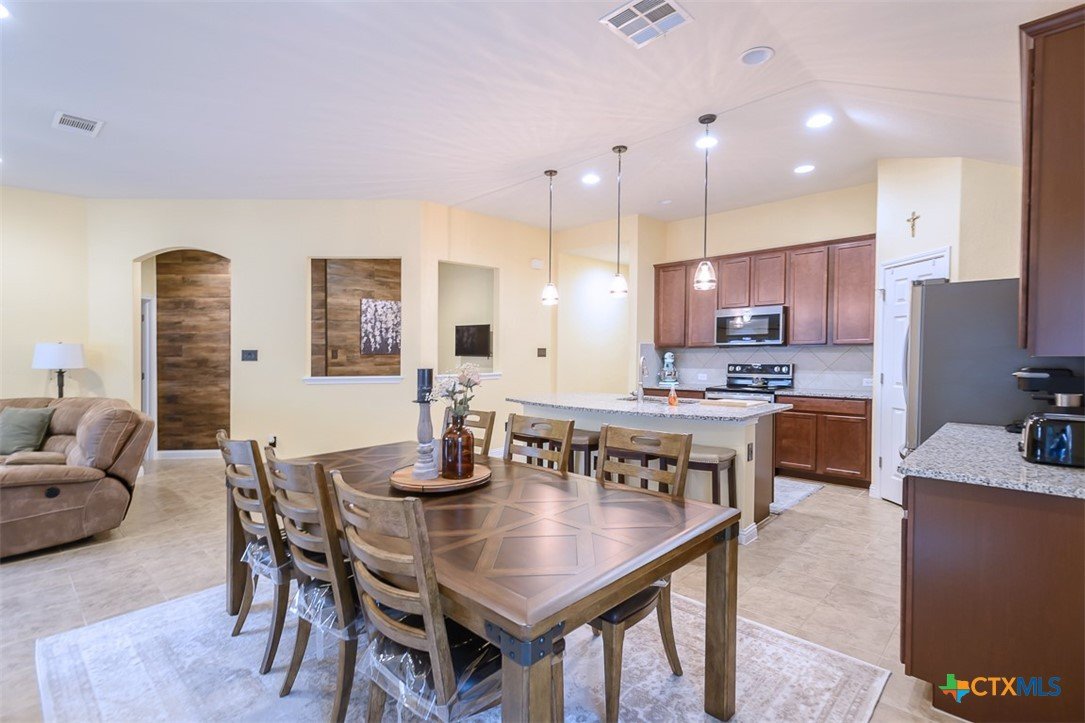 Set in a quiet neighborhood with easy access to schools, parks, shopping, and dining, this home offers both convenience and charm. A striking blend of brick and stone is complemented by wood shutters and an arched entryway, creating standout appeal from the curb. The backyard features a covered patio and ample room for outdoor fun or relaxing evenings. Step inside to a bright, open layout where the kitchen, dining area, and great room flow together under high ceilings with tile floors and abundant natural light. The island kitchen is ideal for entertaining or daily life, with granite countertops, stainless steel appliances, and extensive cabinet storage. A built-in desk nook offers the perfect command center for staying organized while staying connected to the heart of the home. The owner's suite feels like a retreat with a high ceiling and a large window that lets in the light. The attached bath includes a soaking tub, separate shower, and generous storage. Additional highlights include a dedicated mud room .