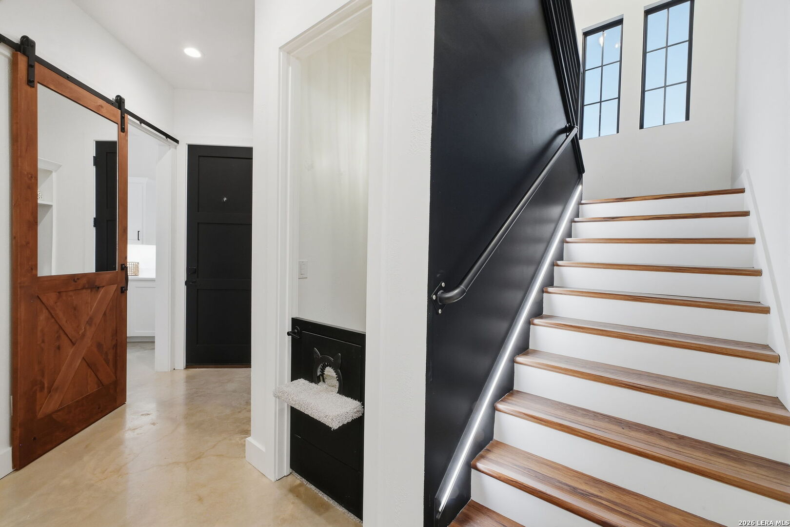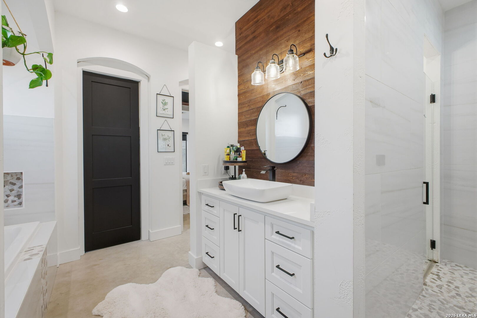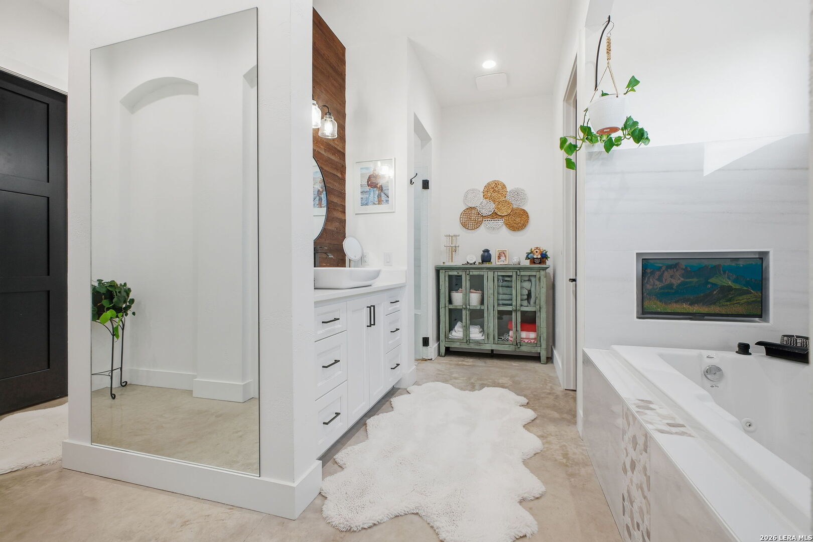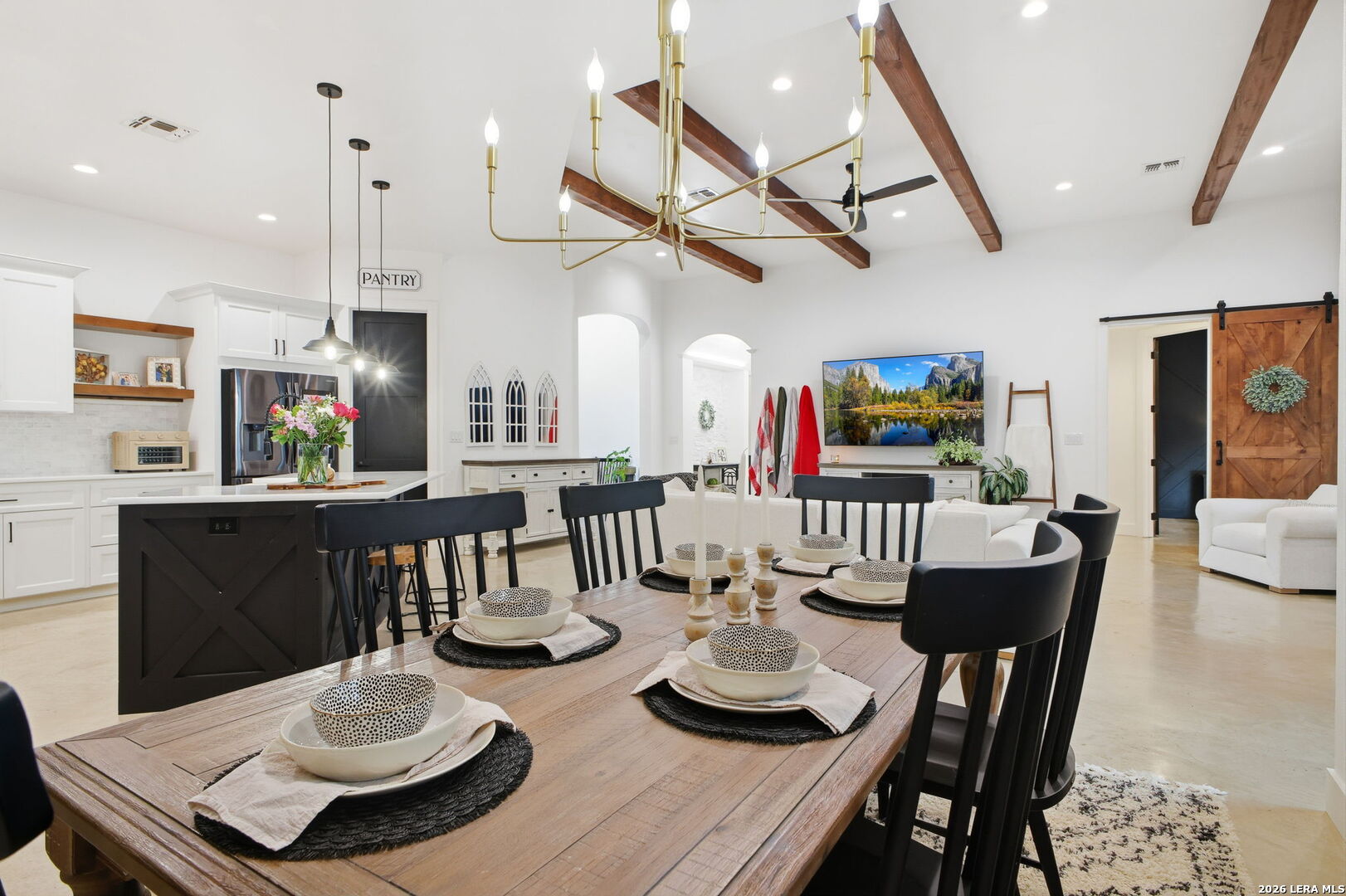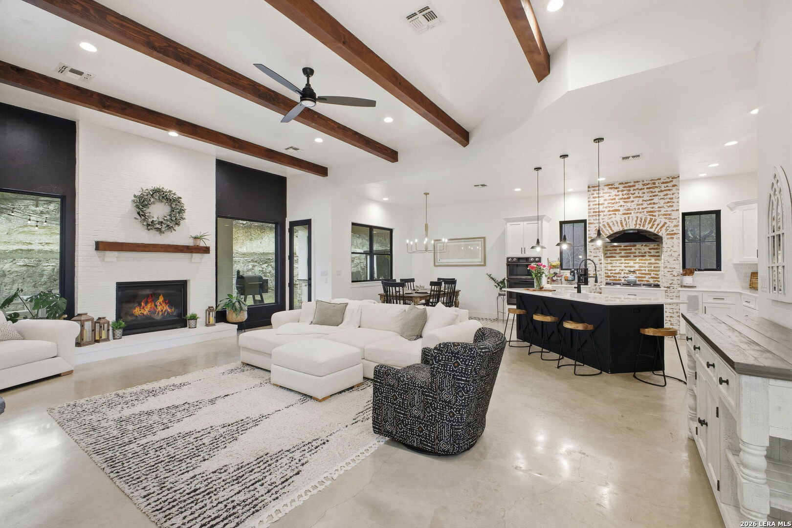 Beautiful custom home built in 2022 located on a half-acre lot at the end of a cul-de-sac, positioned at the top of a hill with beautiful views, in the gated Woods of Fair Oaks community. This 4-bedroom, 4.5-bath home features an open-concept layout with stained concrete floors, high ceilings, and abundant natural light. The kitchen offers marble countertops and opens to the living and dining areas. The property backs to and sits alongside a greenbelt, offering added privacy and peaceful views. This is the only home in the neighborhood connected to public sewer instead of septic. Unique features include a dog shower in the laundry room, a second laundry room in the garage, and a TV in the primary bathroom bathtub area. Additional highlights include en-suite bathrooms in all bedrooms, a game room, an oversized 3-car garage, a covered patio with outdoor kitchen, and an ample driveway providing generous parking. Community amenities include controlled access and a playground, with Fair Oaks Golf Course less than one mile away. Zoned to Boerne ISD.