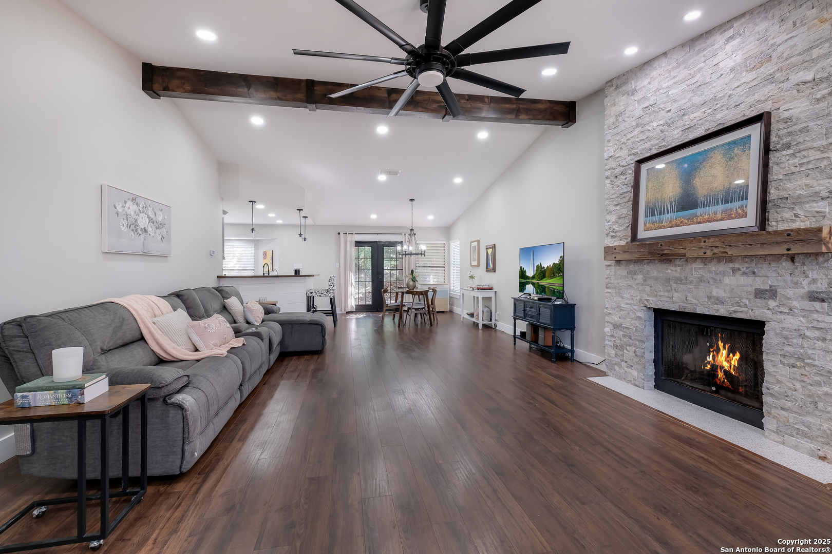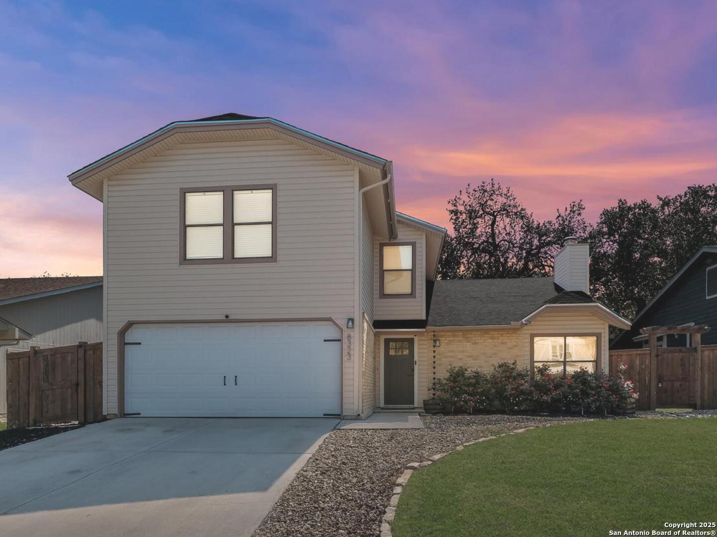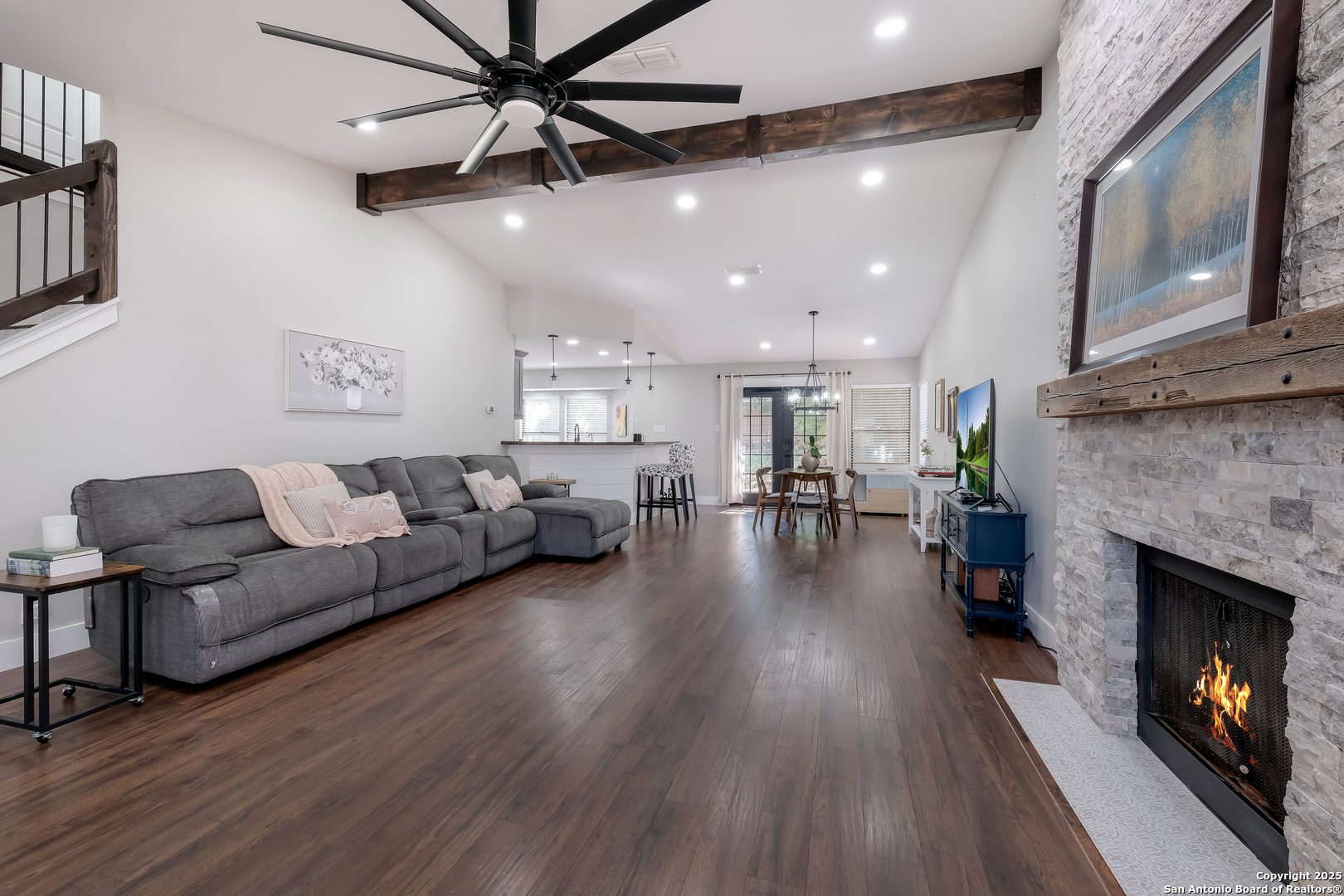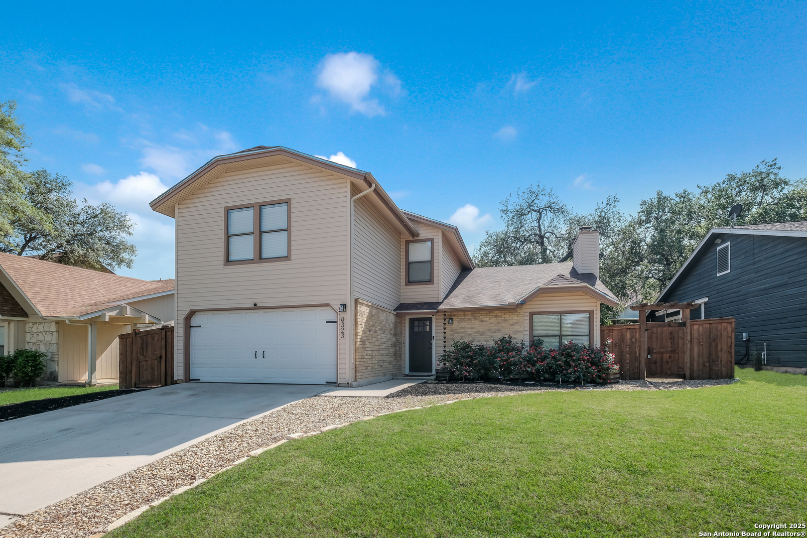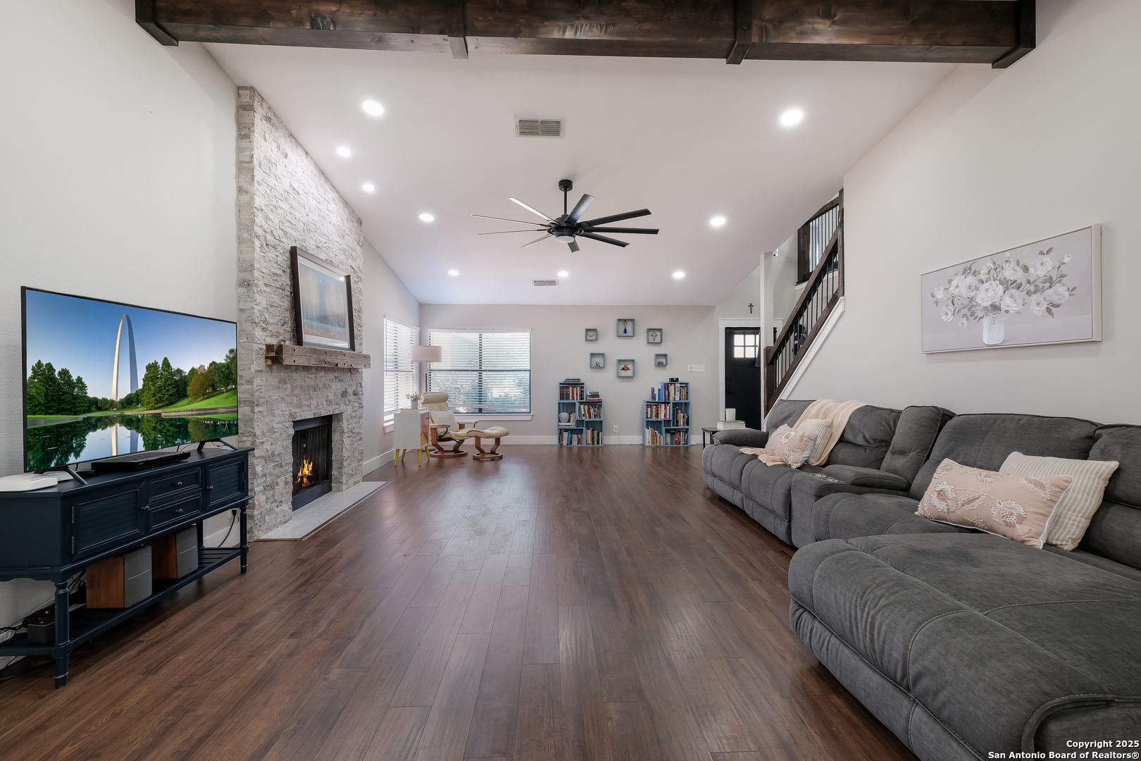 This beautifully designed home features an open floor plan with a striking stone fireplace as the centerpiece. Enjoy modern and neutral finishes throughout, creating a clean and versatile aesthetic. The spacious primary suite is conveniently located downstairs and boasts a large ensuite bath with a dual walk-in shower and a generous walk-in closet. Upstairs, you'll find three additional bedrooms and a versatile family room-ideal for gatherings or relaxation. The expansive backyard is shaded by mature trees, offering a perfect retreat from the Texas summer sun. The HVAC, water heater, and water softener all replaced within the last 16 months. Welcome home!