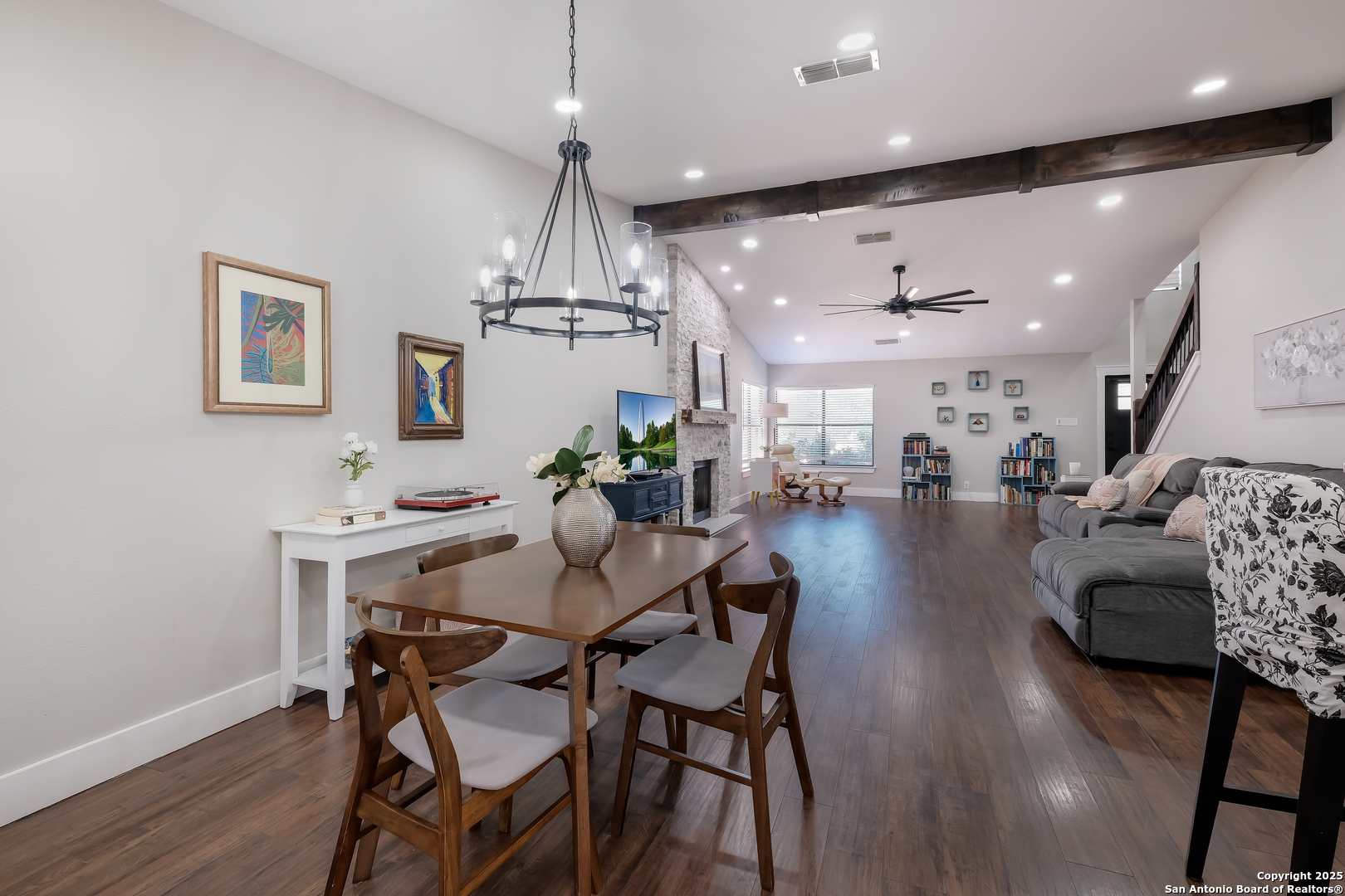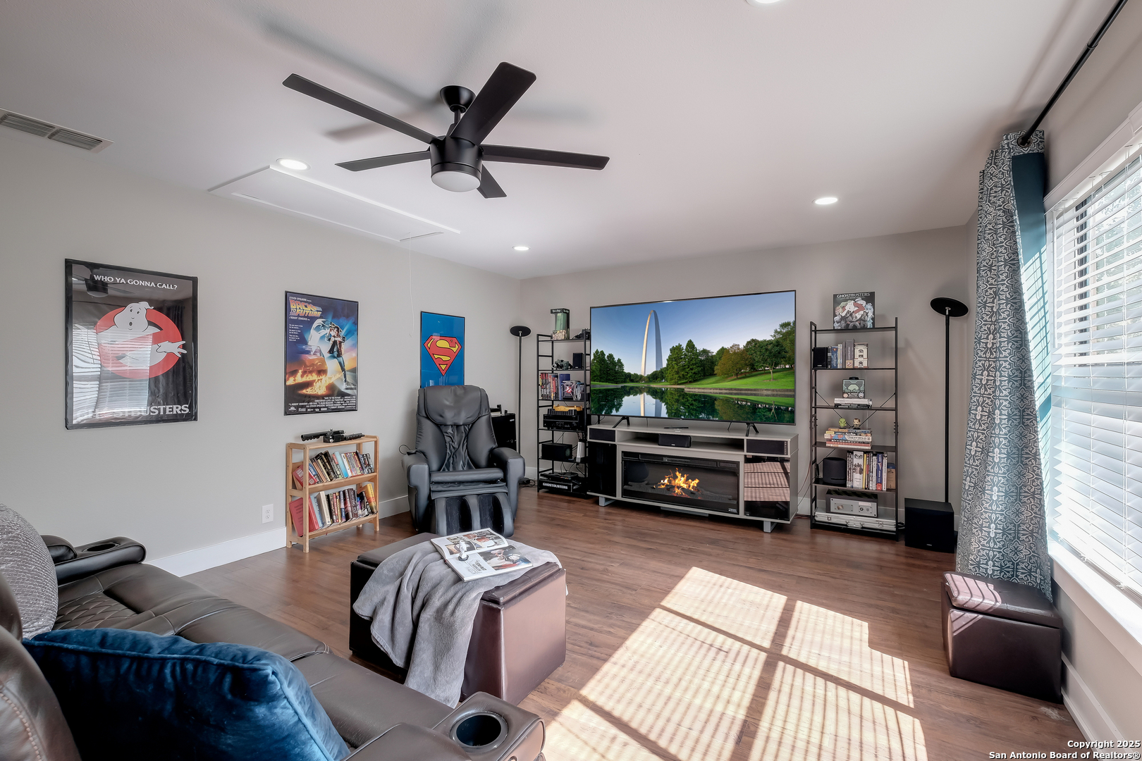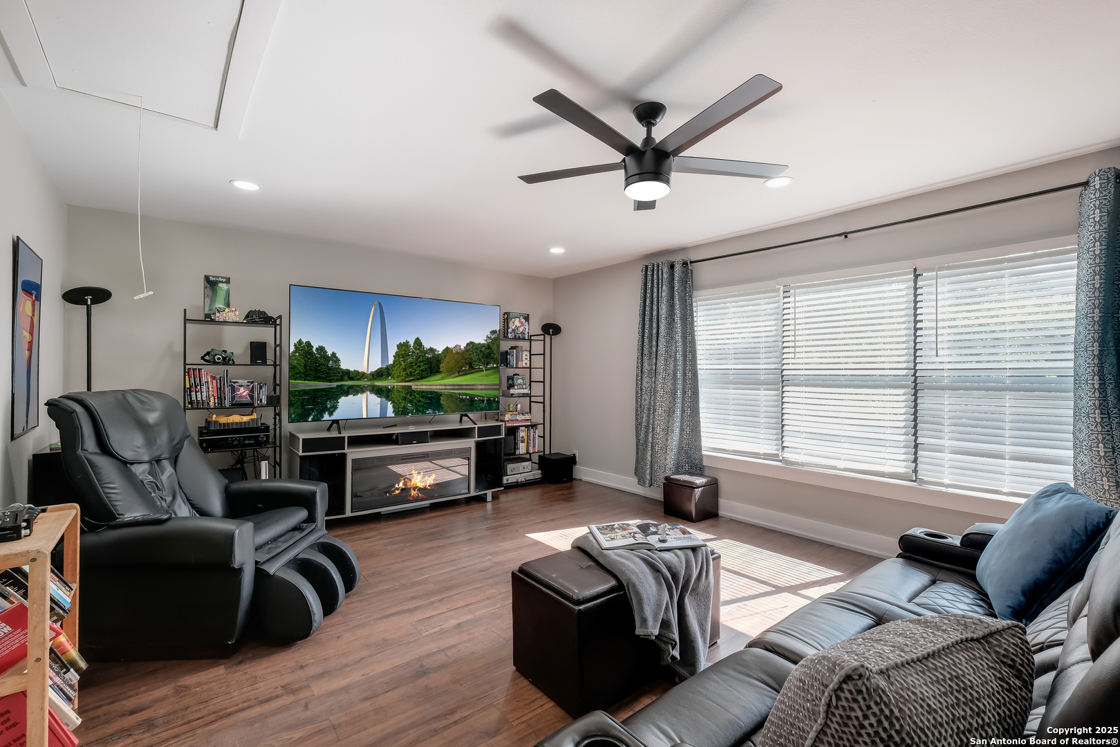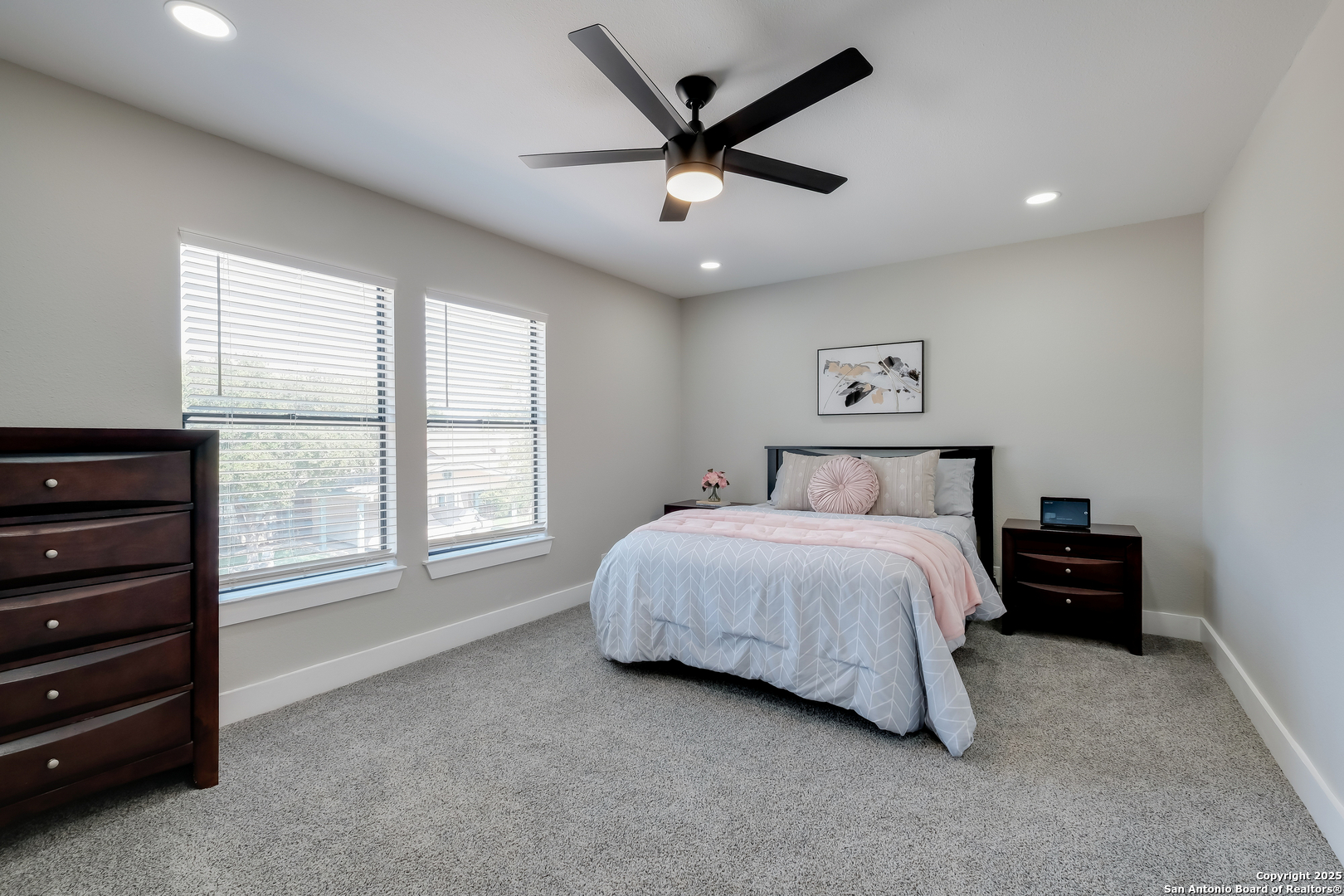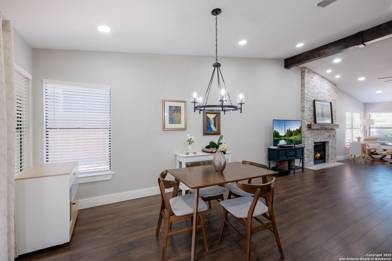 This beautifully designed home features an open floor plan with a striking stone fireplace as the centerpiece. Enjoy modern and neutral finishes throughout, creating a clean and versatile aesthetic. The spacious primary suite is conveniently located downstairs and boasts a large ensuite bath with a dual walk-in shower and a generous walk-in closet. Upstairs, you'll find three additional bedrooms and a versatile family room-ideal for gatherings or relaxation. The expansive backyard is shaded by mature trees, offering a perfect retreat from the Texas summer sun. The HVAC, water heater, and water softener all replaced within the last 16 months. Welcome home!