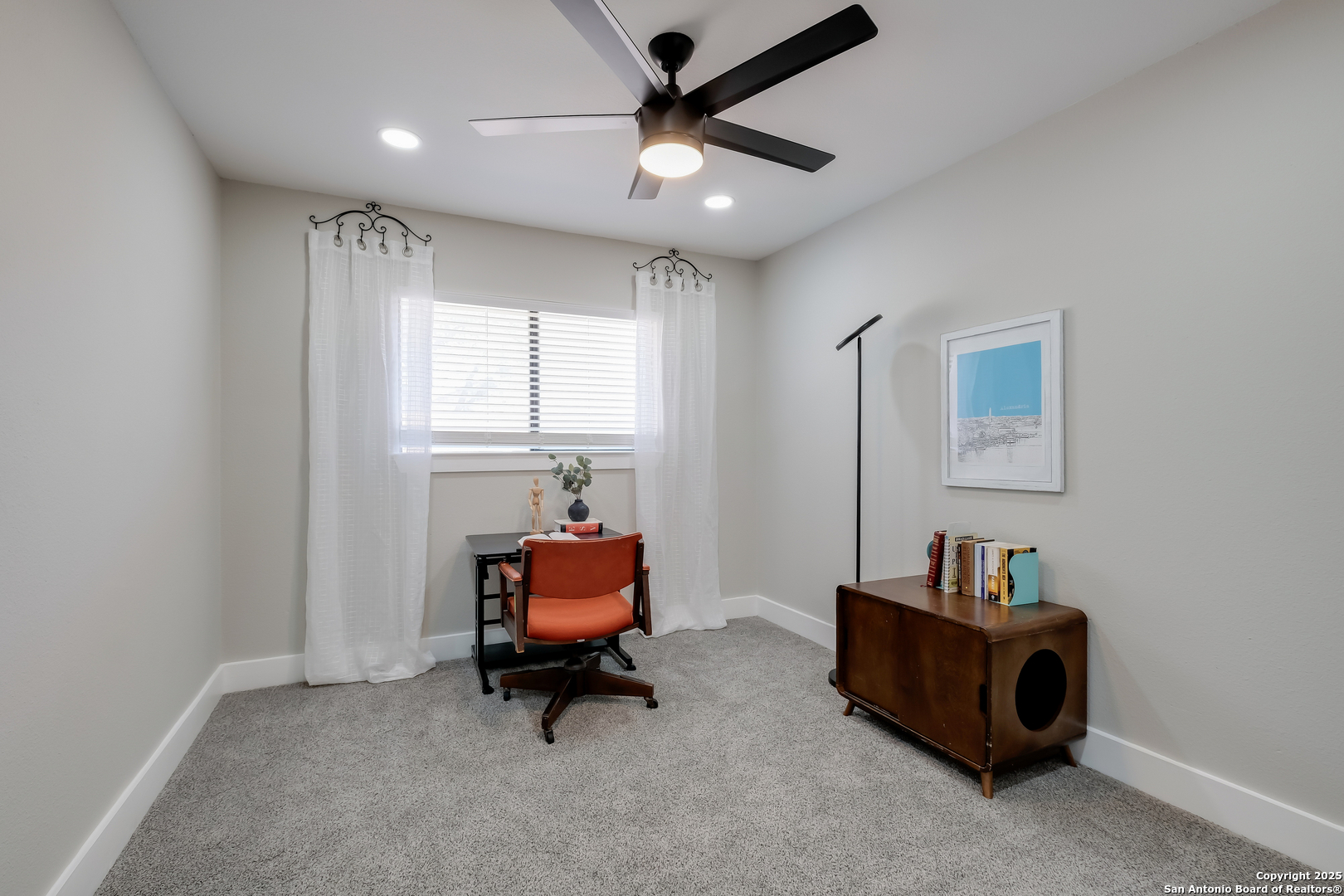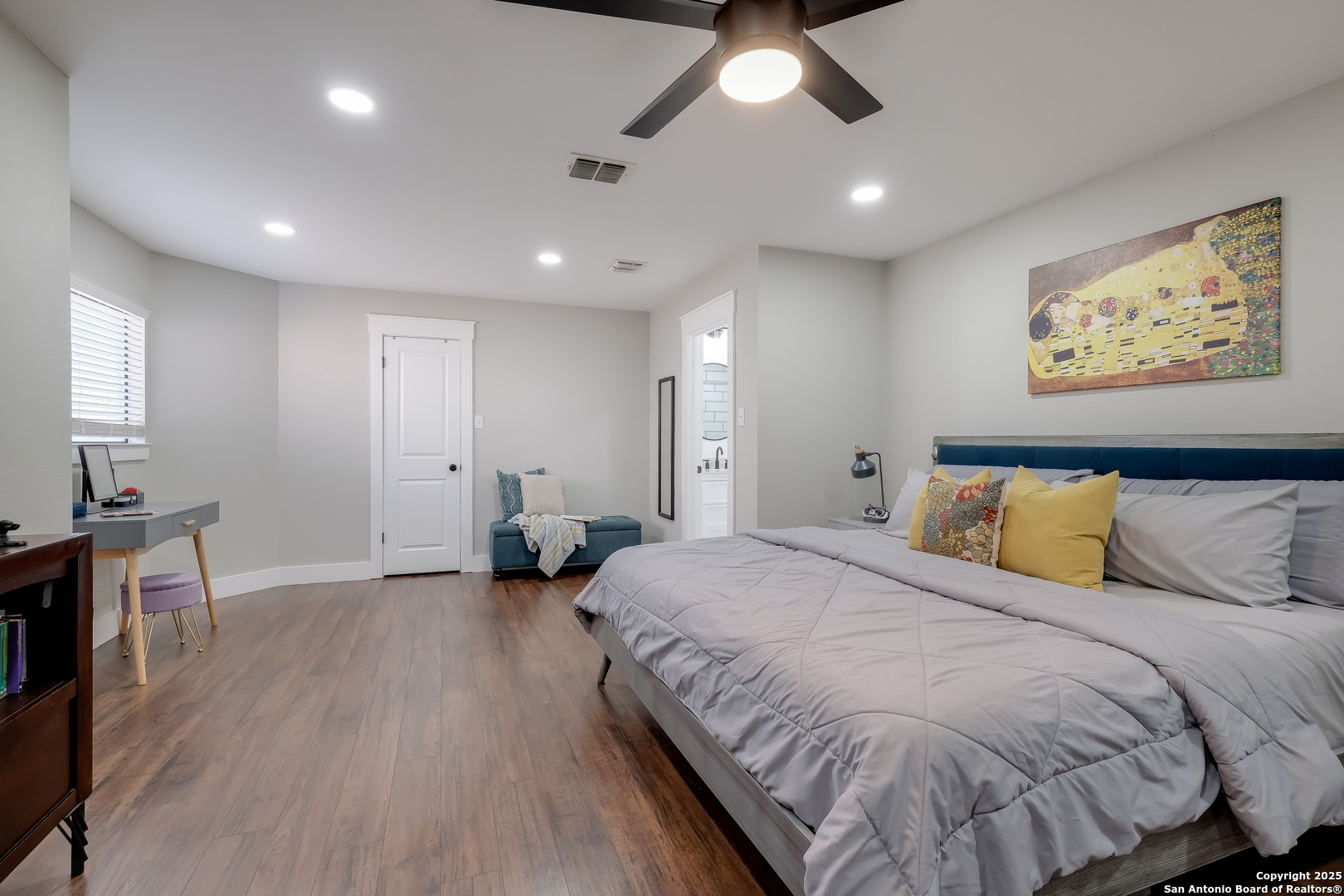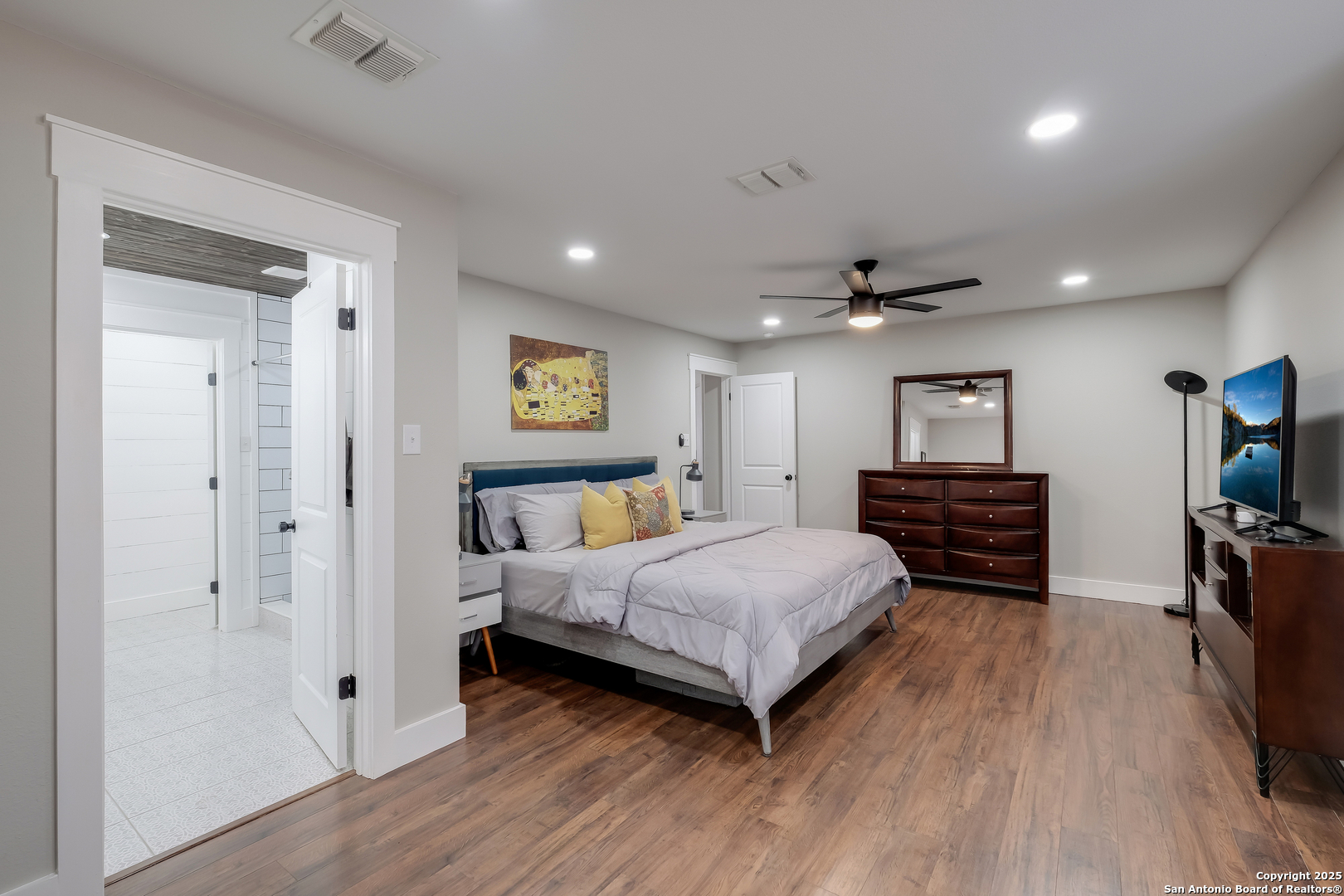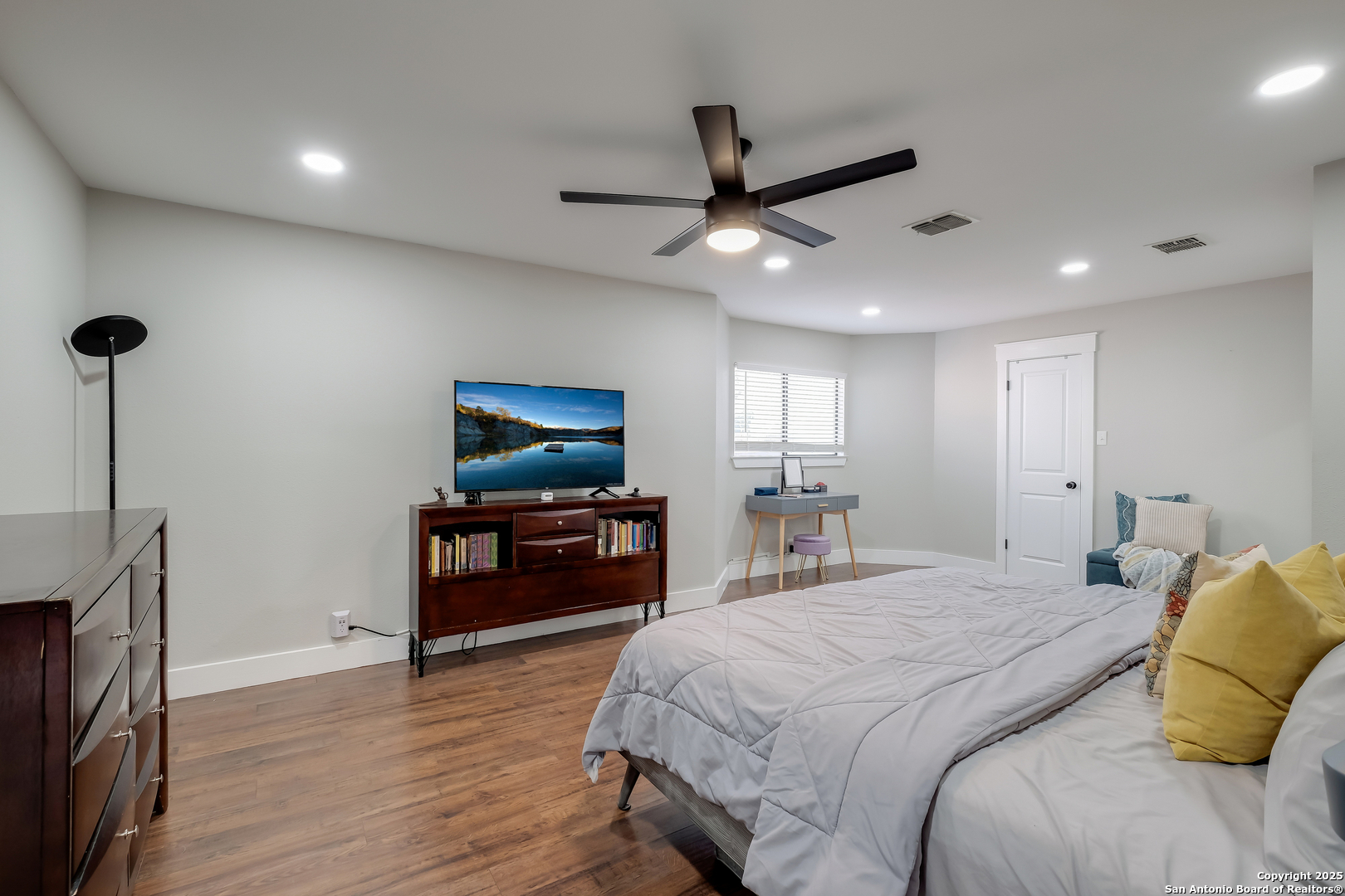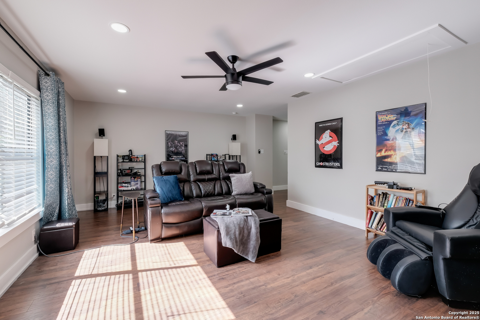 This beautifully designed home features an open floor plan with a striking stone fireplace as the centerpiece. Enjoy modern and neutral finishes throughout, creating a clean and versatile aesthetic. The spacious primary suite is conveniently located downstairs and boasts a large ensuite bath with a dual walk-in shower and a generous walk-in closet. Upstairs, you'll find three additional bedrooms and a versatile family room-ideal for gatherings or relaxation. The expansive backyard is shaded by mature trees, offering a perfect retreat from the Texas summer sun. The HVAC, water heater, and water softener all replaced within the last 16 months. Welcome home!