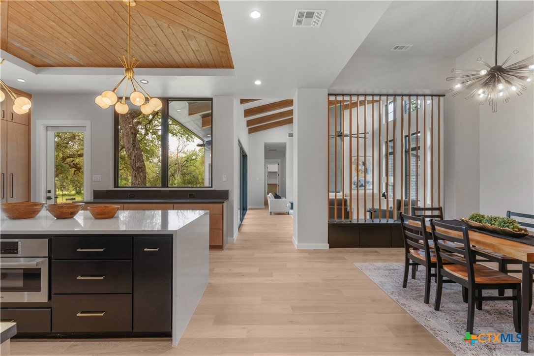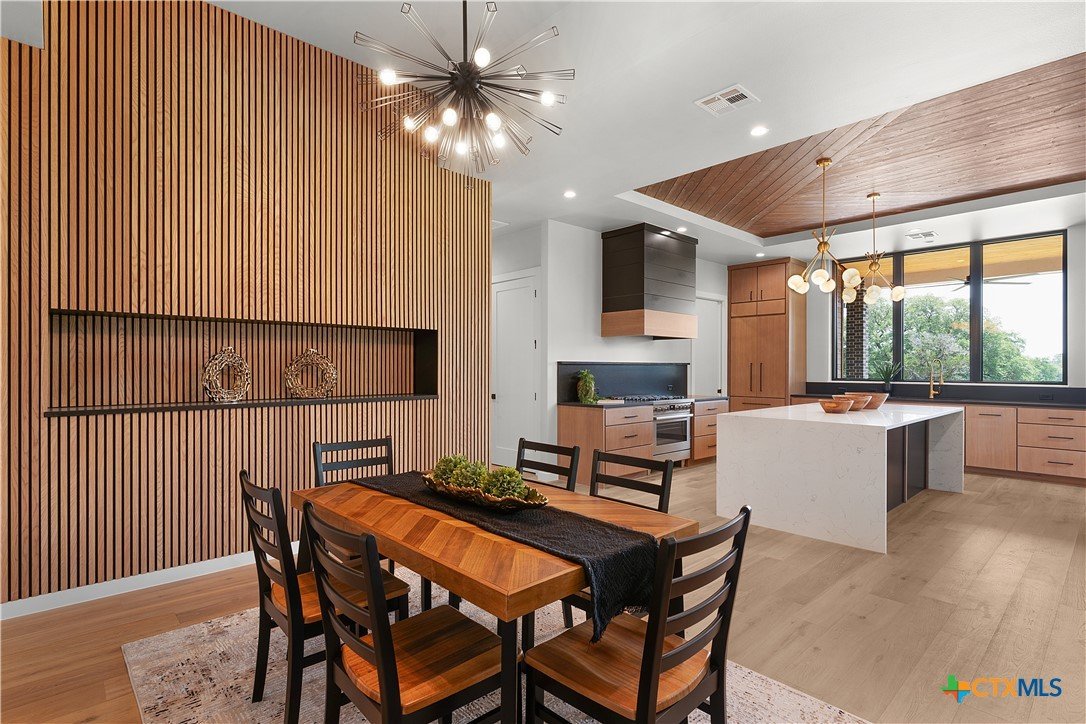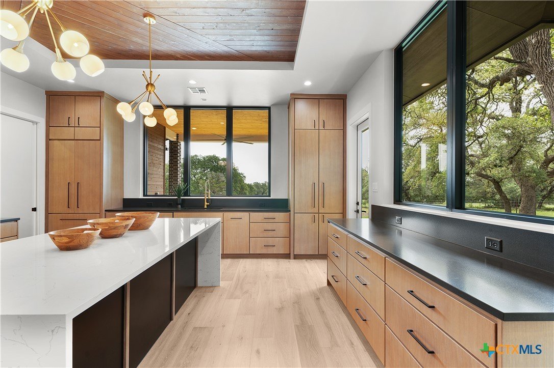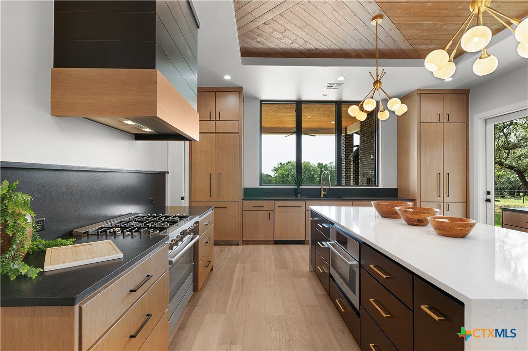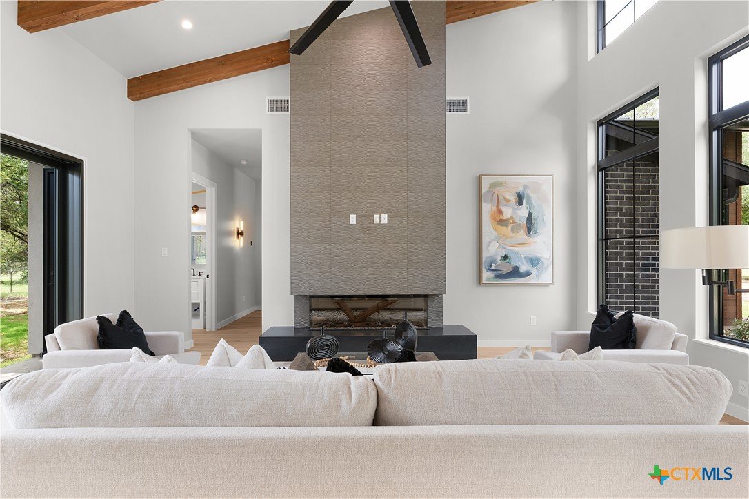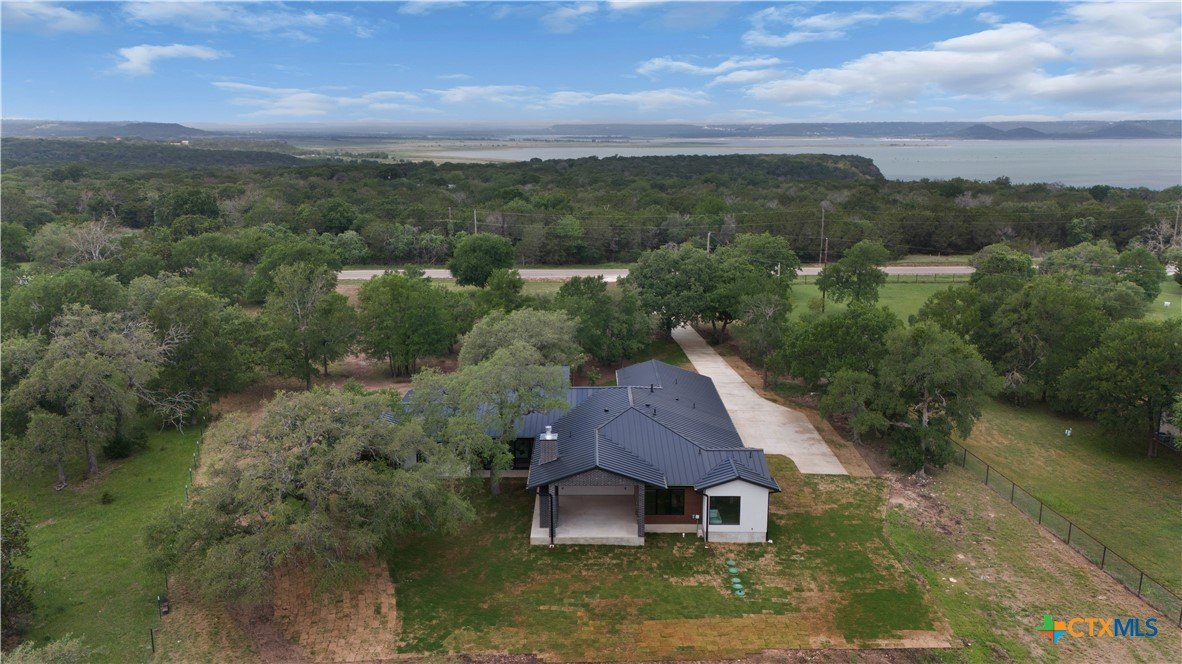 Discover modern elegance and tranquil Hill Country living in this stunning 3,319 sq ft custom-built home by KCE Homes, nestled in the prestigious gated community of South Shores Estates. Backing directly onto the shoreline of Stillhouse Hollow Lake, this residence offers an exceptional blend of luxury, comfort, and natural beauty. With 4 generously sized bedrooms, 3.5 bathrooms, and a dedicated office, the home is thoughtfully designed for both everyday living and upscale entertaining. Exquisite custom woodwork flows throughout, while soaring ceilings with exposed wood beams extend from front to back, creating a bright and open atmosphere filled with natural light. The chef’s kitchen is a true centerpiece, featuring custom rift-sawn oak cabinetry, a quartz waterfall island, panel-ready Bosch appliances, designer lighting, and an expansive walk-in pantry. Unwind in the spa-like primary suite, complete with a sleek designer shower with glass barn doors and a luxurious freestanding tub. Entertain guests in style around the striking 60” electric fireplace in the living room, or enjoy serene outdoor gatherings by the stone fireplace on the back patio—framed by majestic oak trees and unspoiled lakefront views. Set within a quiet gated community surrounded by mature oaks and scenic trails, this remarkable home delivers the perfect balance of refined luxury and peaceful nature.