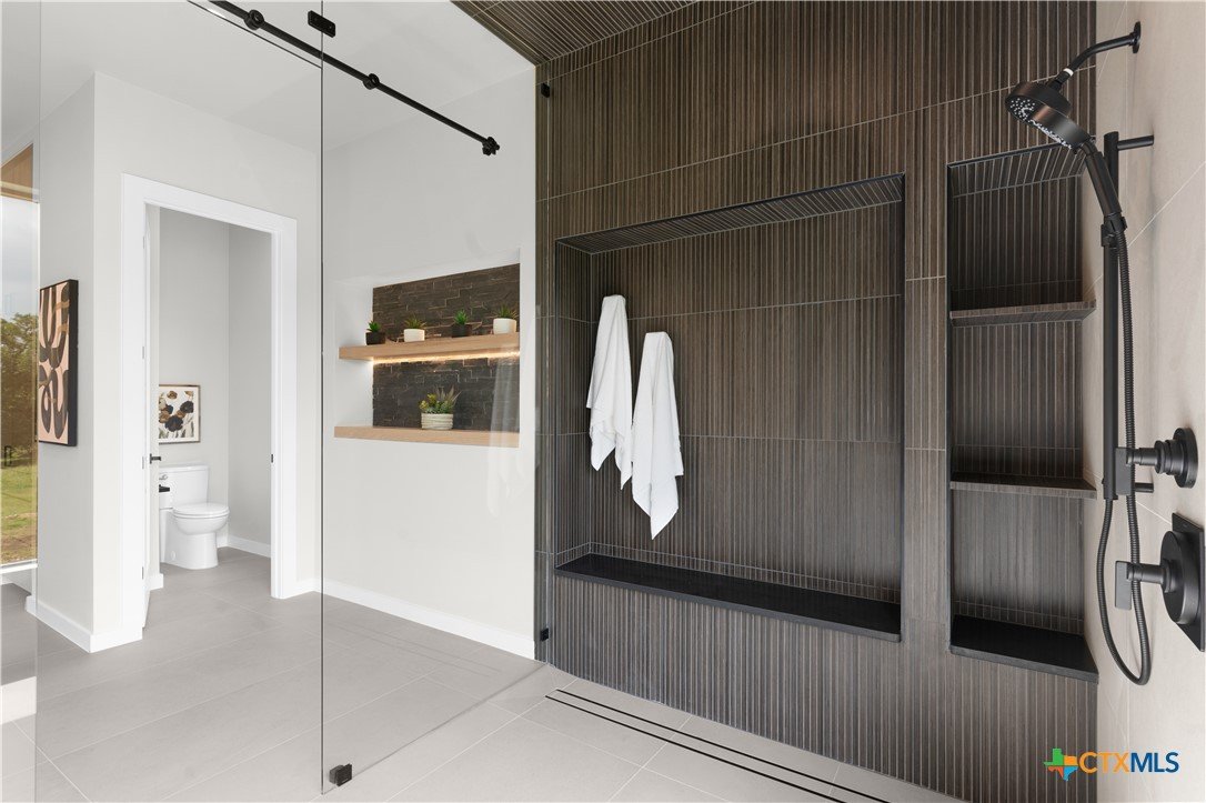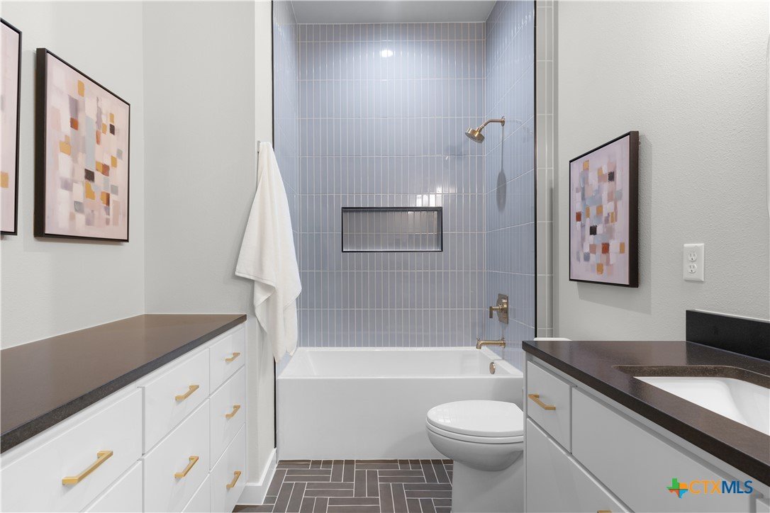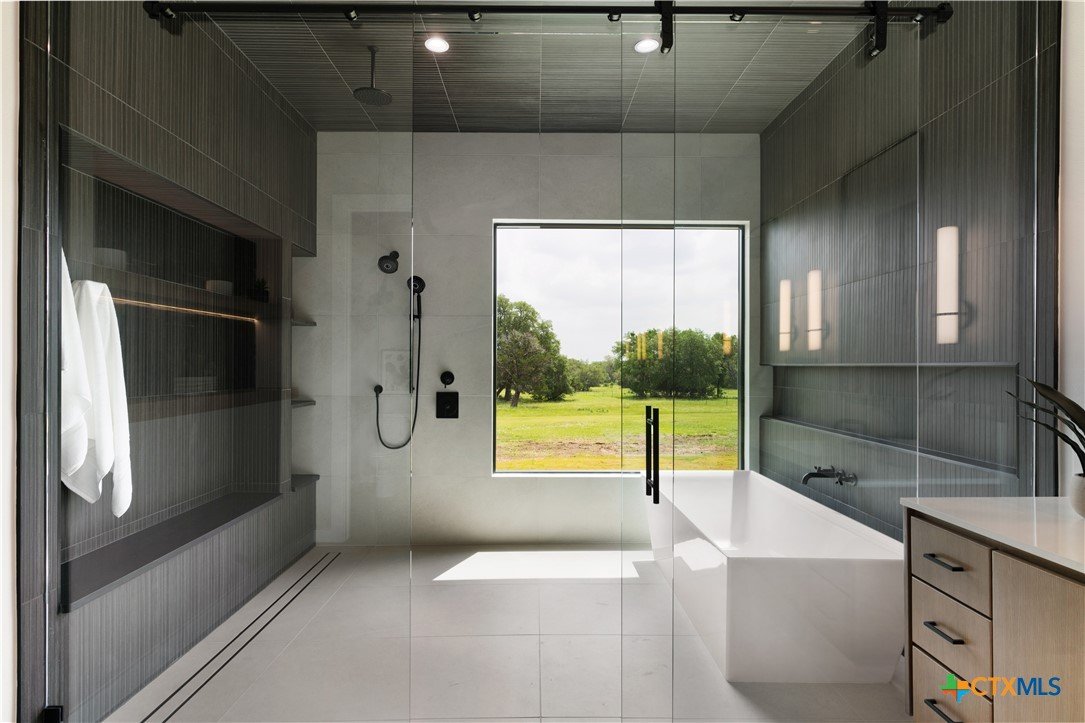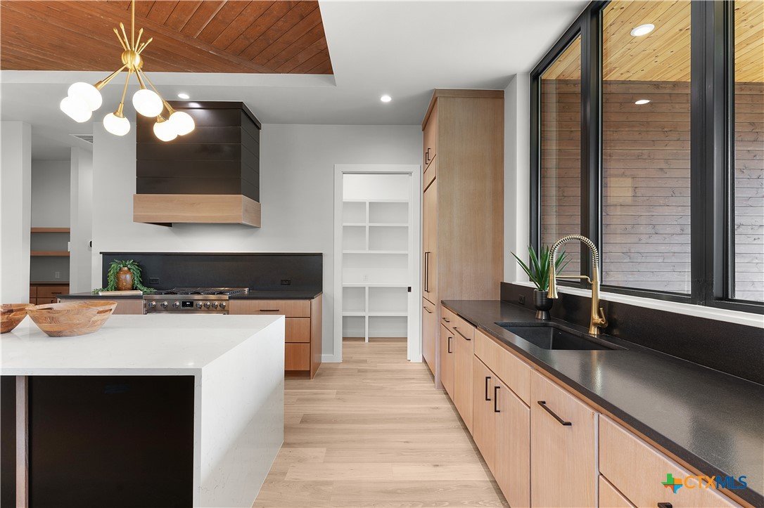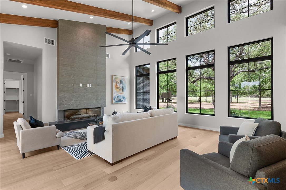 Discover modern elegance and tranquil Hill Country living in this stunning 3,319 sq ft custom-built home by KCE Homes, nestled in the prestigious gated community of South Shores Estates. Backing directly onto the shoreline of Stillhouse Hollow Lake, this residence offers an exceptional blend of luxury, comfort, and natural beauty. With 4 generously sized bedrooms, 3.5 bathrooms, and a dedicated office, the home is thoughtfully designed for both everyday living and upscale entertaining. Exquisite custom woodwork flows throughout, while soaring ceilings with exposed wood beams extend from front to back, creating a bright and open atmosphere filled with natural light. The chef’s kitchen is a true centerpiece, featuring custom rift-sawn oak cabinetry, a quartz waterfall island, panel-ready Bosch appliances, designer lighting, and an expansive walk-in pantry. Unwind in the spa-like primary suite, complete with a sleek designer shower with glass barn doors and a luxurious freestanding tub. Entertain guests in style around the striking 60” electric fireplace in the living room, or enjoy serene outdoor gatherings by the stone fireplace on the back patio—framed by majestic oak trees and unspoiled lakefront views. Set within a quiet gated community surrounded by mature oaks and scenic trails, this remarkable home delivers the perfect balance of refined luxury and peaceful nature.