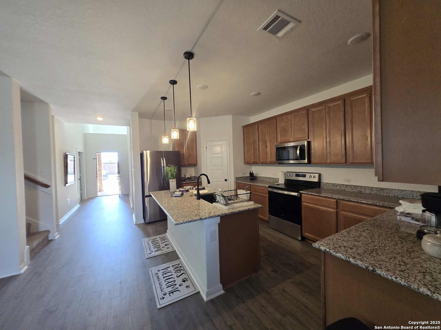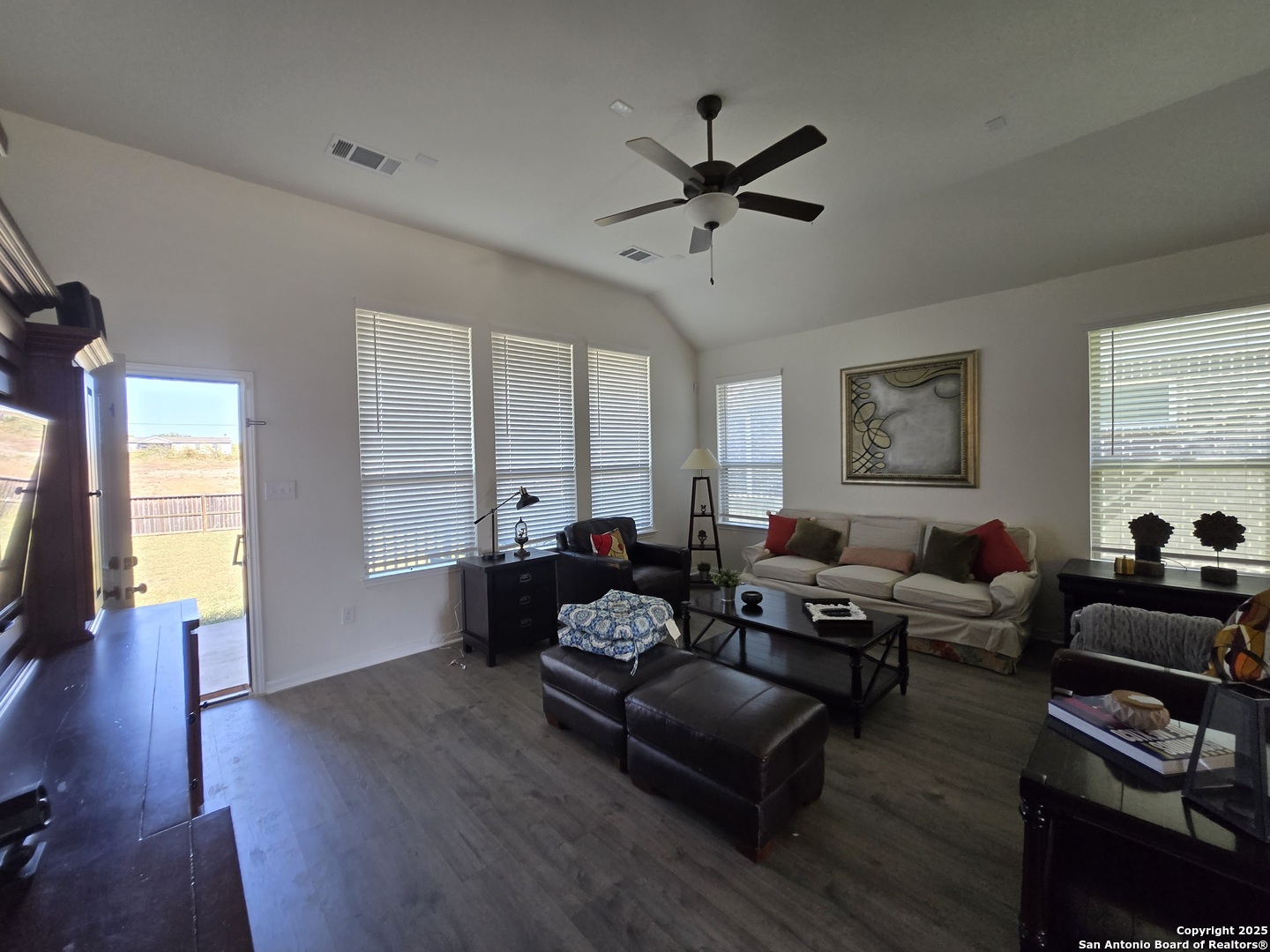 Welcome to your new home, located in the highly sought-after Overlook at Creekside community in the heart of New Braunfels. This fabulous 1.5 story home offers easy access to both San Antonio and Austin. Nestled in the scenic Texas Hill Country, this home is just minutes from Interstate 35, placing you close to prime shopping, dining, and entertainment options. The open-concept layout includes a grand living area that flows into a gourmet kitchen, equipped with an oversized island, stainless steel Whirlpool appliances, 42-inch maple cabinets, a walk-in pantry, and a striking glossy white backsplash. Beautiful wood floors cover most of the home. The kitchen's thoughtful design ensures the chef is always part of the fun during gatherings. Step through the 8-foot modern rain glass front door and be greeted by a foyer leading an open floor plan. Additional features include window treatments throughout, reverse osmosis, whole house filtration system, and a water softener system for added comfort. For Safety, a ring doorbell, entry door keypads, and cameras throughout.