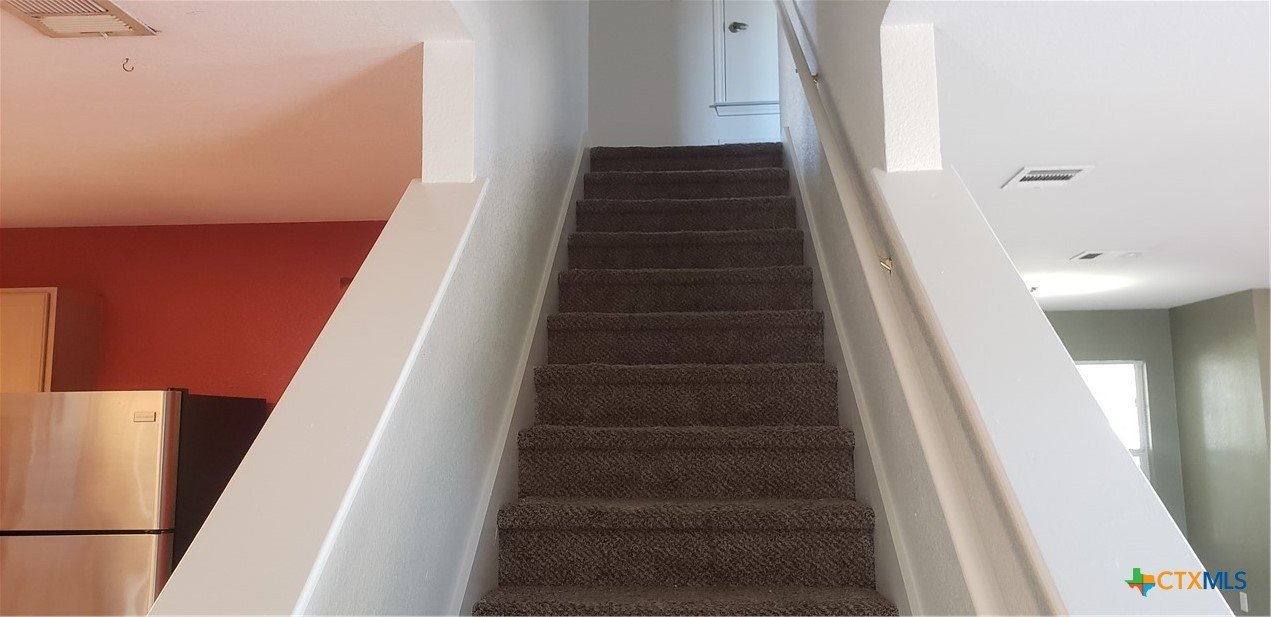 Roomy & charming 3 bedroom, 2.5 bath w/attached 2 car garage, 2 story rental on a cul de sac in Holland Park Subdivision. Walking distance to Texas State University. This home is 1774 sf and built in 2002 by KB Homes. All bedrooms upstairs. Laundry room down. Property comes with a stainless steel refrigerator. Privacy fenced back yard with a separate spacious storage building. Mature trees. Fresh paint and carpet earlier this year, 2025. Pets permitted on a case-by-case basis. Applicants will be asked to submit to and pay for a $45.00 non-refundable background and credit check via online system.