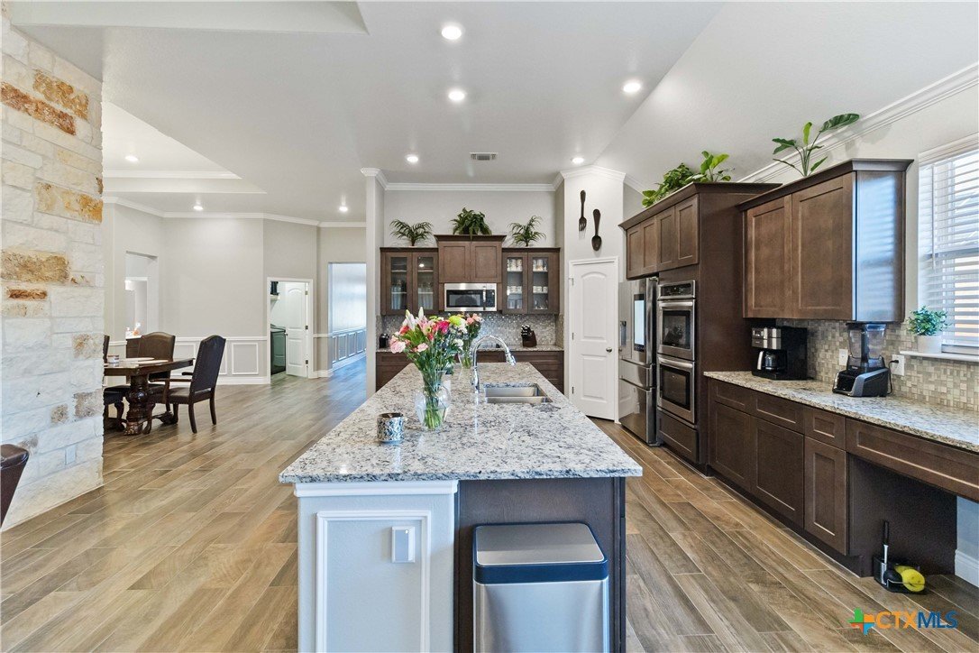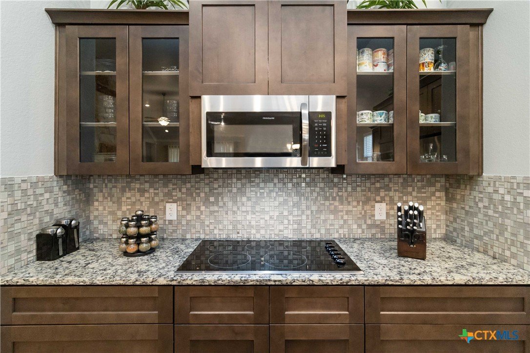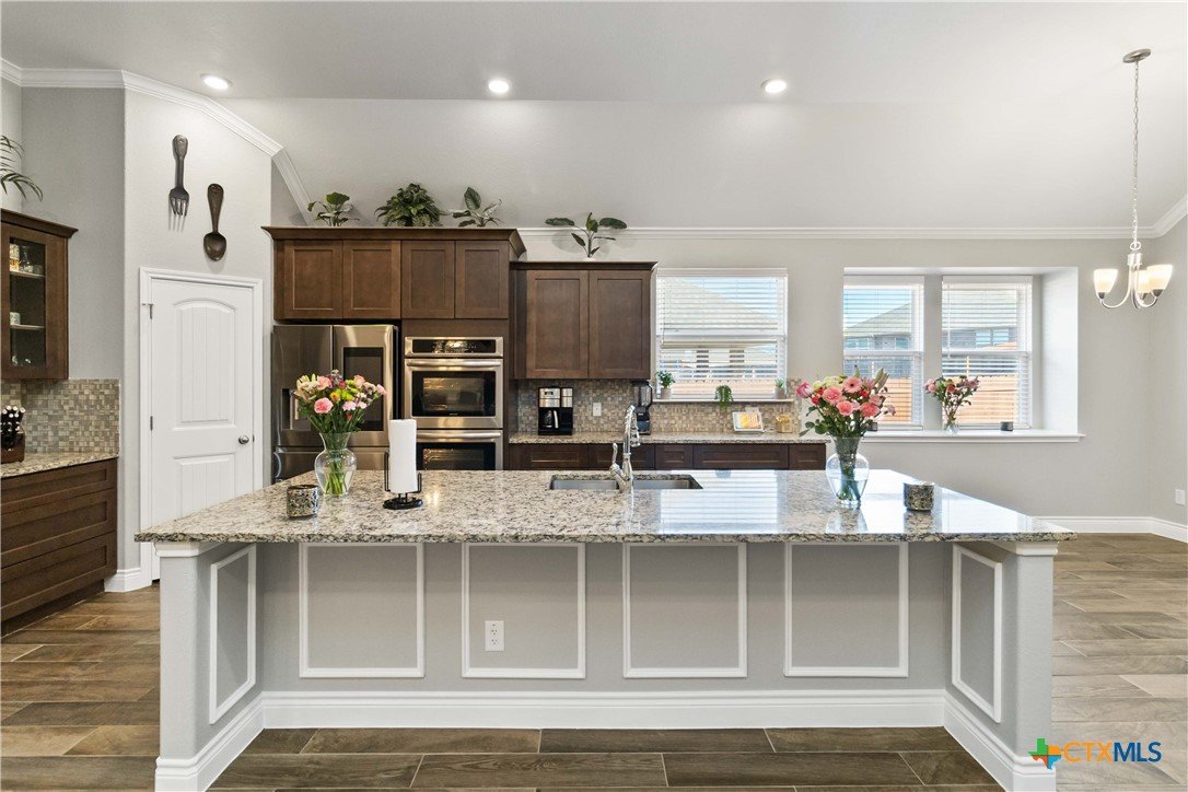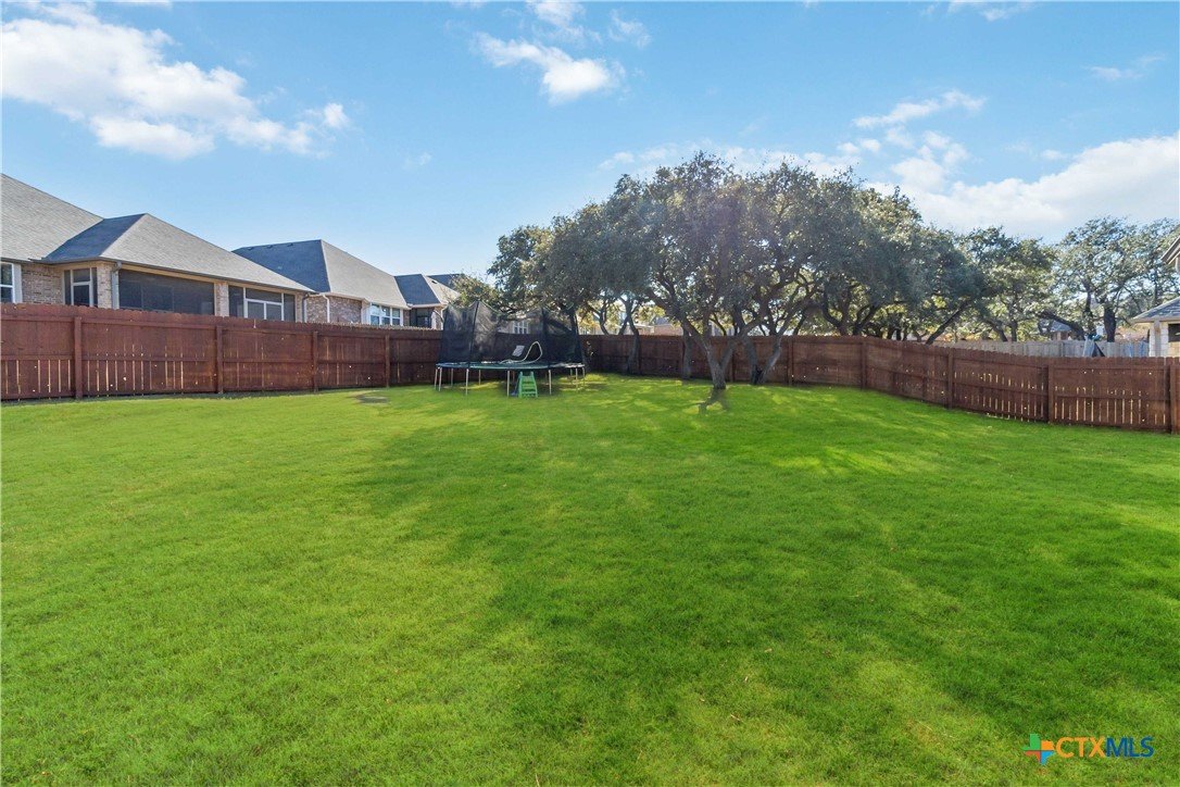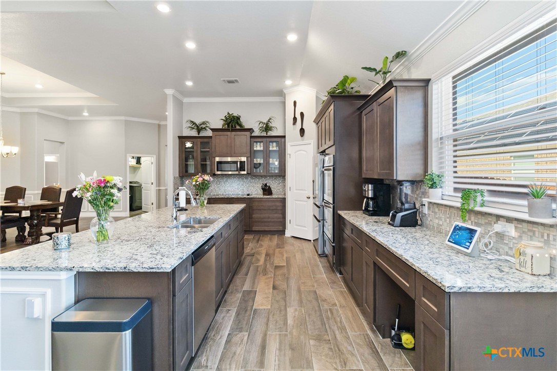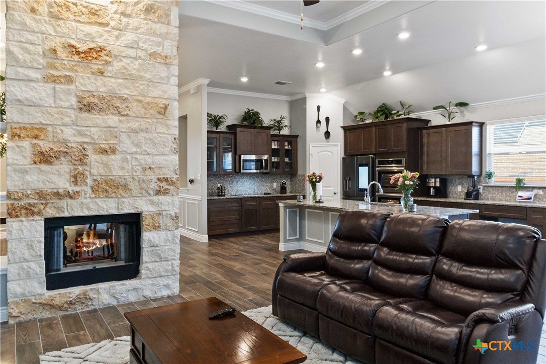 Welcome to 8402 Ridge crest in Harker Heights, Texas a breathtaking one-story home that captivates with its stunning design and inviting charm. This masterfully crafted home is your gateway to opulence, inviting you with a grand foyer and a captivating double-sided cobblestone fireplace, effortlessly distinguishing the formal dining room from the expansive main living area. A true culinary haven, the kitchen boasts stainless steel appliances, a double oven, and an extra-large island, seamlessly connecting to a charming kitchenette. Revel in the allure of the screened-in back patio with epoxy flooring, featuring an outdoor TV mount for your ultimate entertainment pleasure. The three-car garage, adorned with custom overhead storage and elegant epoxy flooring, provides not just space but an experience in organization and sophistication. The master bedroom, a true retreat, offers a spa-like ambiance with a separate shower, garden tub, and a generously-sized walk-in closet. Upgraded details, including custom board and batten, French doors, and elongated toilets in each bathroom, elevate this move-in-ready haven. Don't miss out on experiencing unparalleled comfort! Schedule your exclusive showing today.