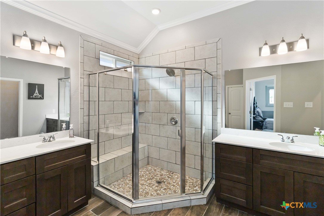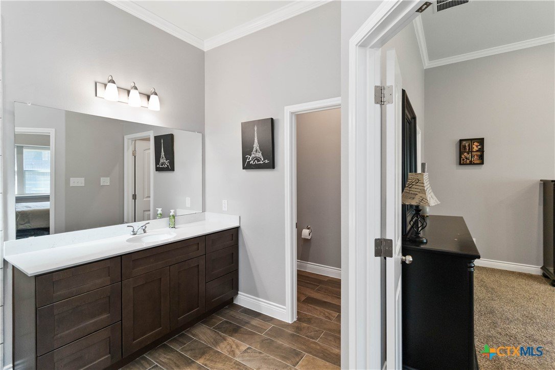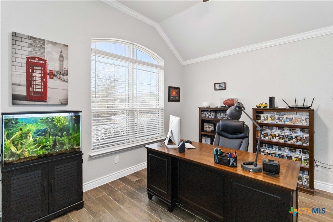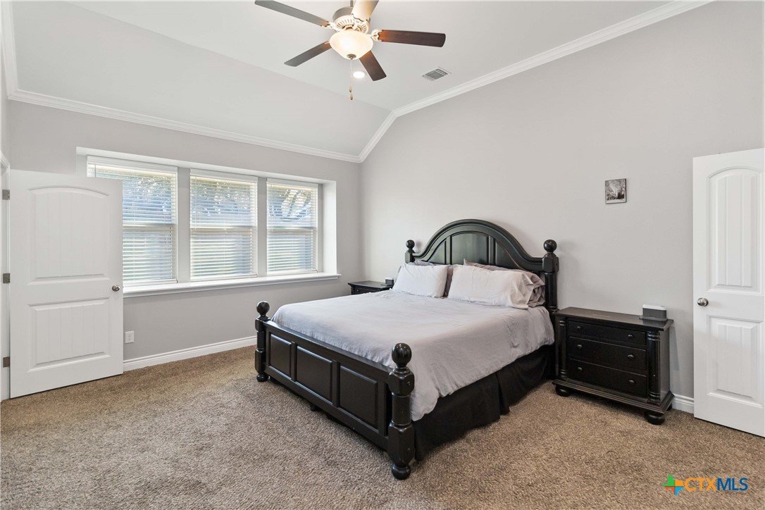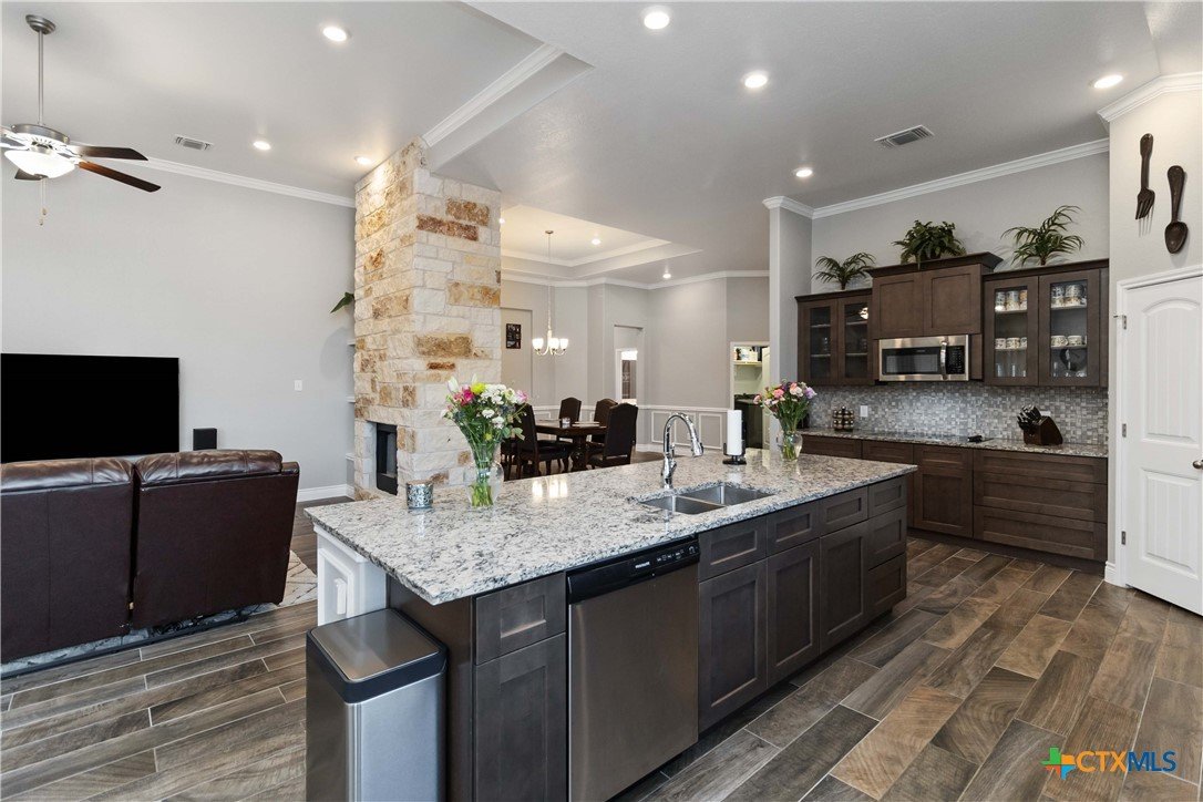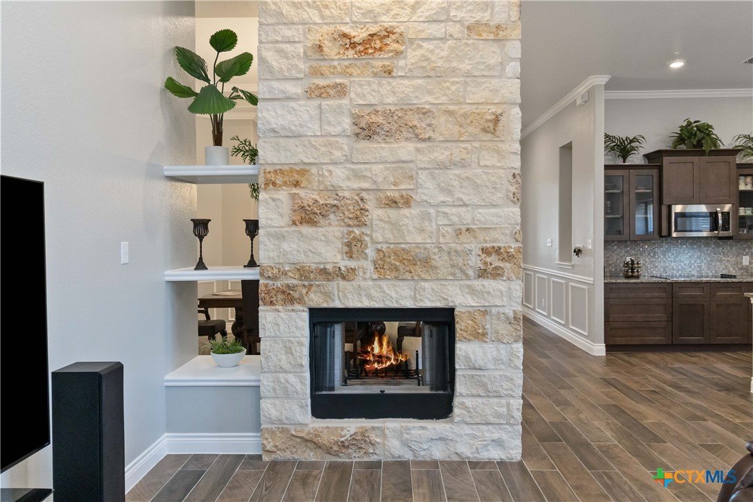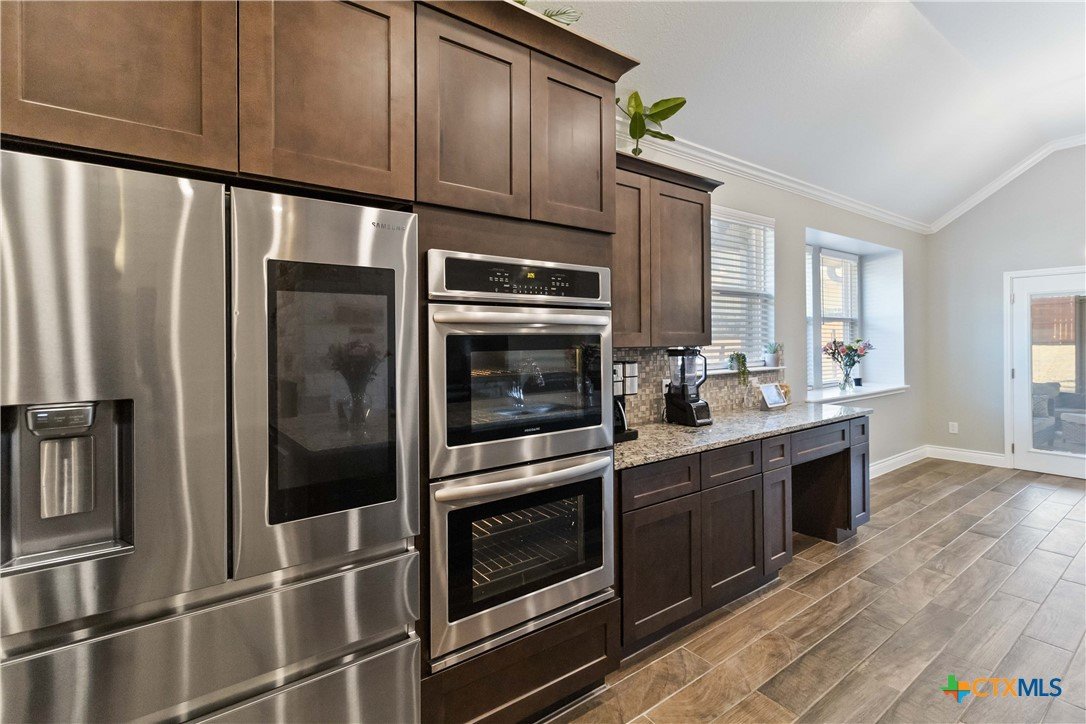 Welcome to 8402 Ridge crest in Harker Heights, Texas a breathtaking one-story home that captivates with its stunning design and inviting charm. This masterfully crafted home is your gateway to opulence, inviting you with a grand foyer and a captivating double-sided cobblestone fireplace, effortlessly distinguishing the formal dining room from the expansive main living area. A true culinary haven, the kitchen boasts stainless steel appliances, a double oven, and an extra-large island, seamlessly connecting to a charming kitchenette. Revel in the allure of the screened-in back patio with epoxy flooring, featuring an outdoor TV mount for your ultimate entertainment pleasure. The three-car garage, adorned with custom overhead storage and elegant epoxy flooring, provides not just space but an experience in organization and sophistication. The master bedroom, a true retreat, offers a spa-like ambiance with a separate shower, garden tub, and a generously-sized walk-in closet. Upgraded details, including custom board and batten, French doors, and elongated toilets in each bathroom, elevate this move-in-ready haven. Don't miss out on experiencing unparalleled comfort! Schedule your exclusive showing today.
