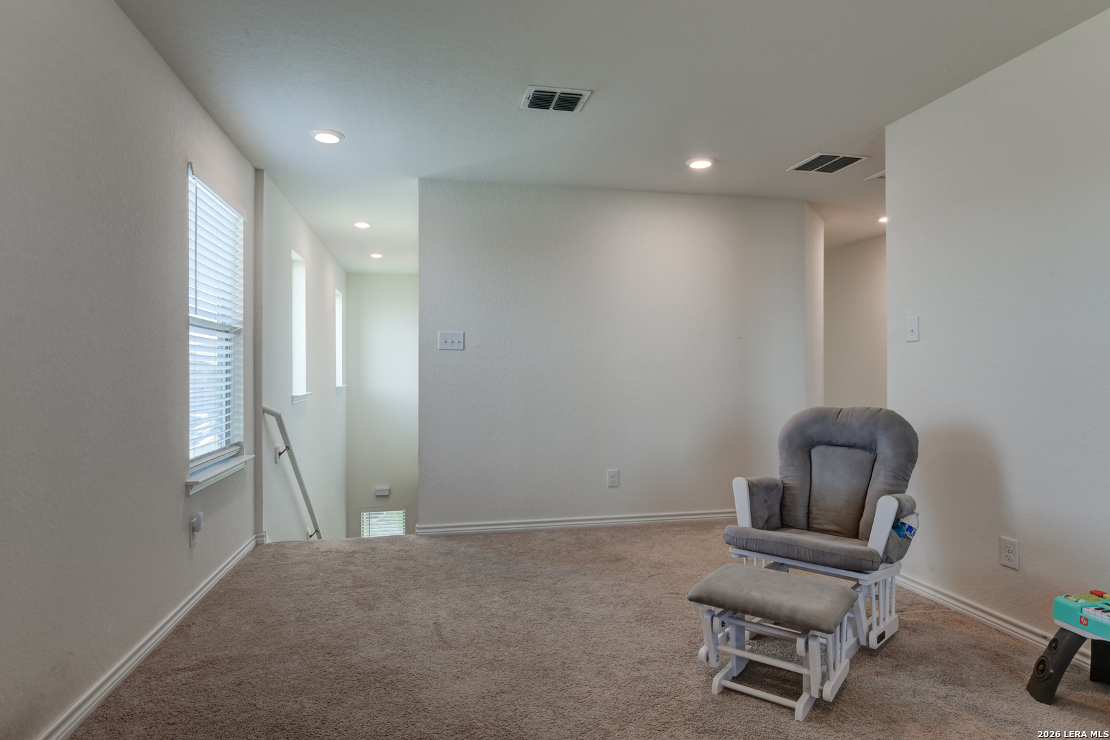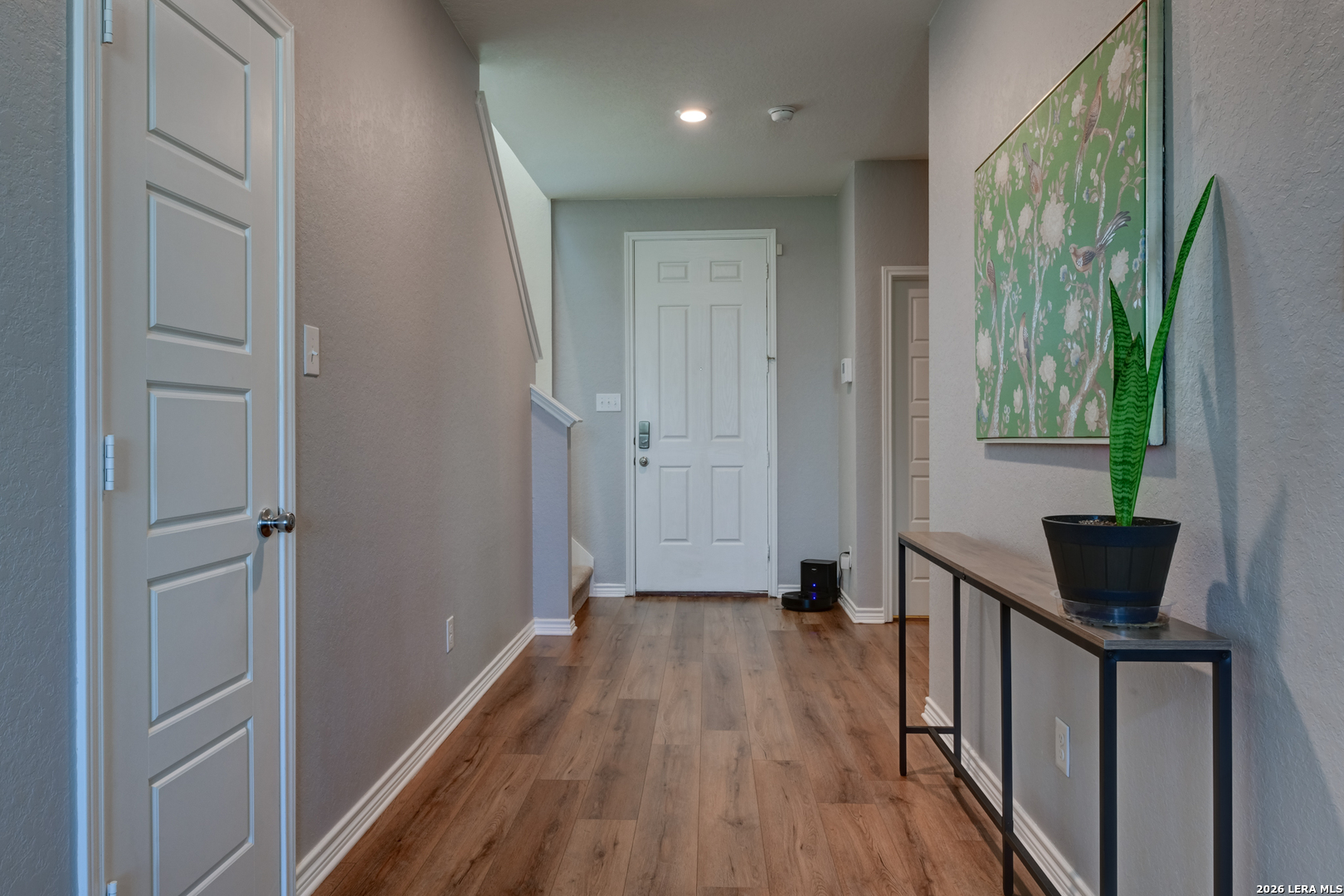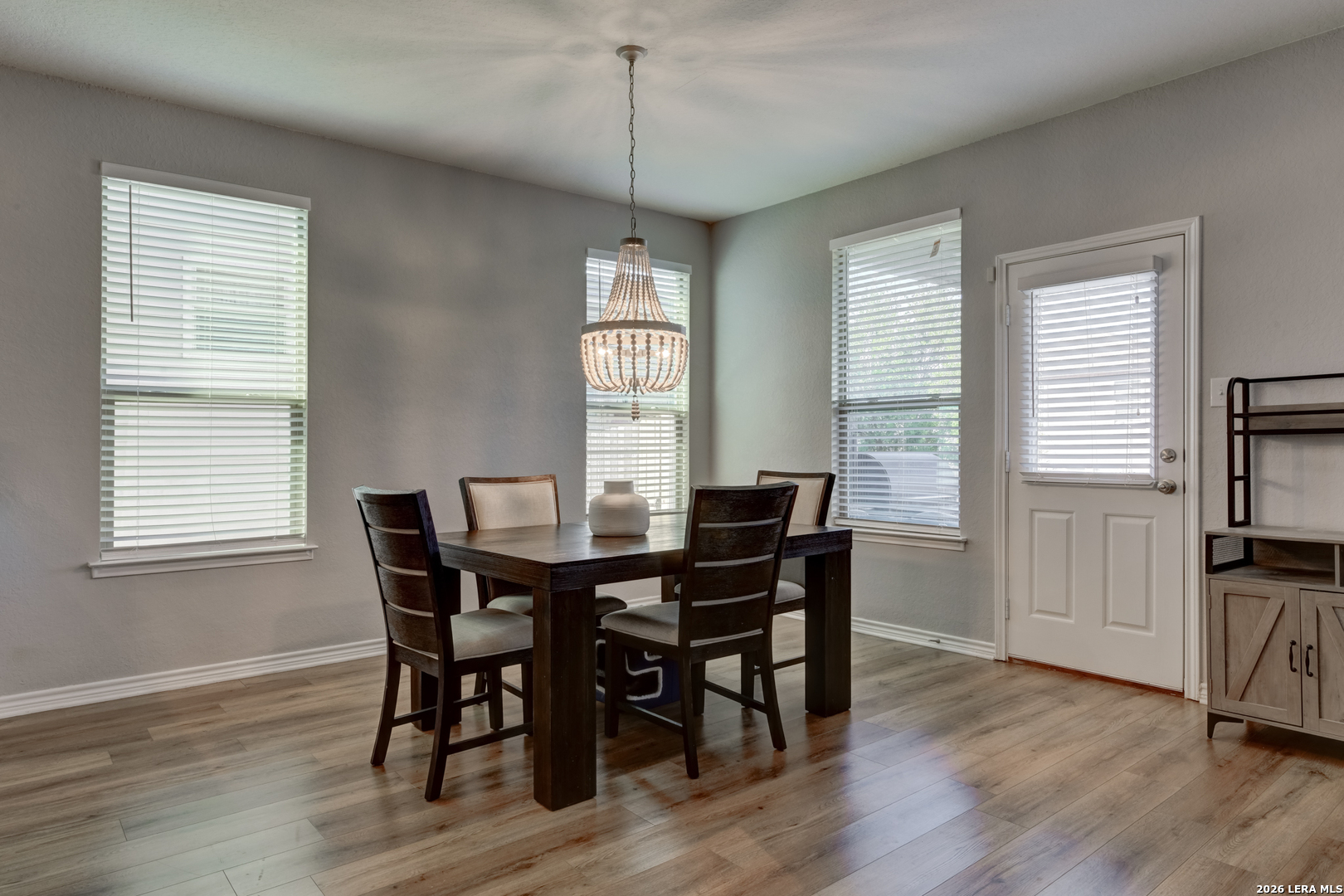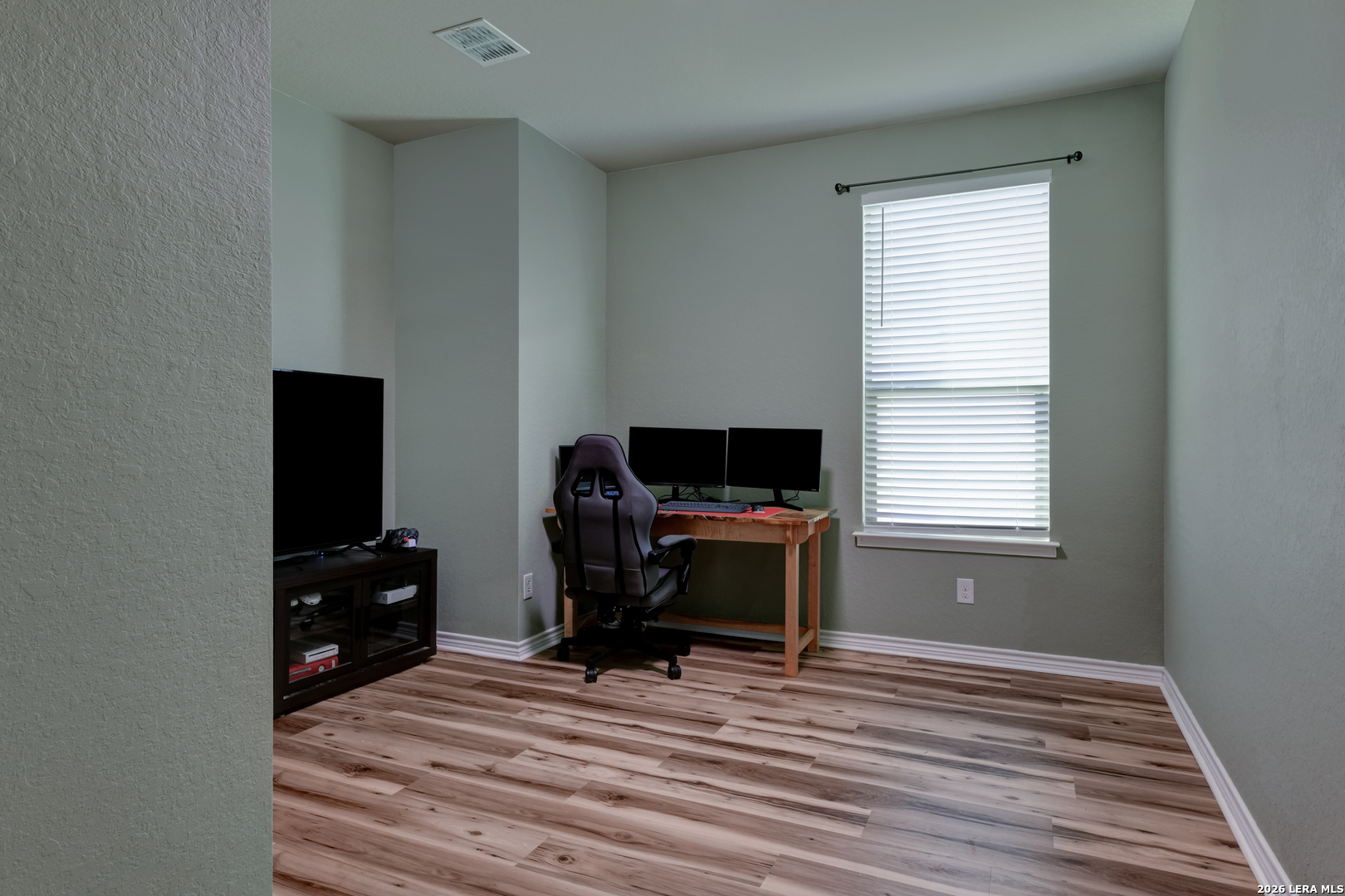 2-story stucco home in Carmona Hills offering 3 bedrooms, 2.5 baths, and an open-concept layout with abundant natural light. Dedicated office/study at the front of the home. Vinyl plank flooring extends throughout the main floor into the spacious living room, dining area, and well-appointed kitchen featuring granite countertops, black appliances, abundant cabinetry, walk-in pantry, window over sink, and peninsula breakfast bar. Private primary suite includes a large walk-in closet and en-suite bath with double vanity and 42-inch garden tub/shower combination. Spacious secondary bedrooms share a full bath. Covered patio overlooks the private backyard with plenty of space for entertaining. Additional highlights include a two-car garage, pre-plumbed for water softener, and sprinkler system. Convenient location near Lackland Air Force Base, shopping, dining, and entertainment.