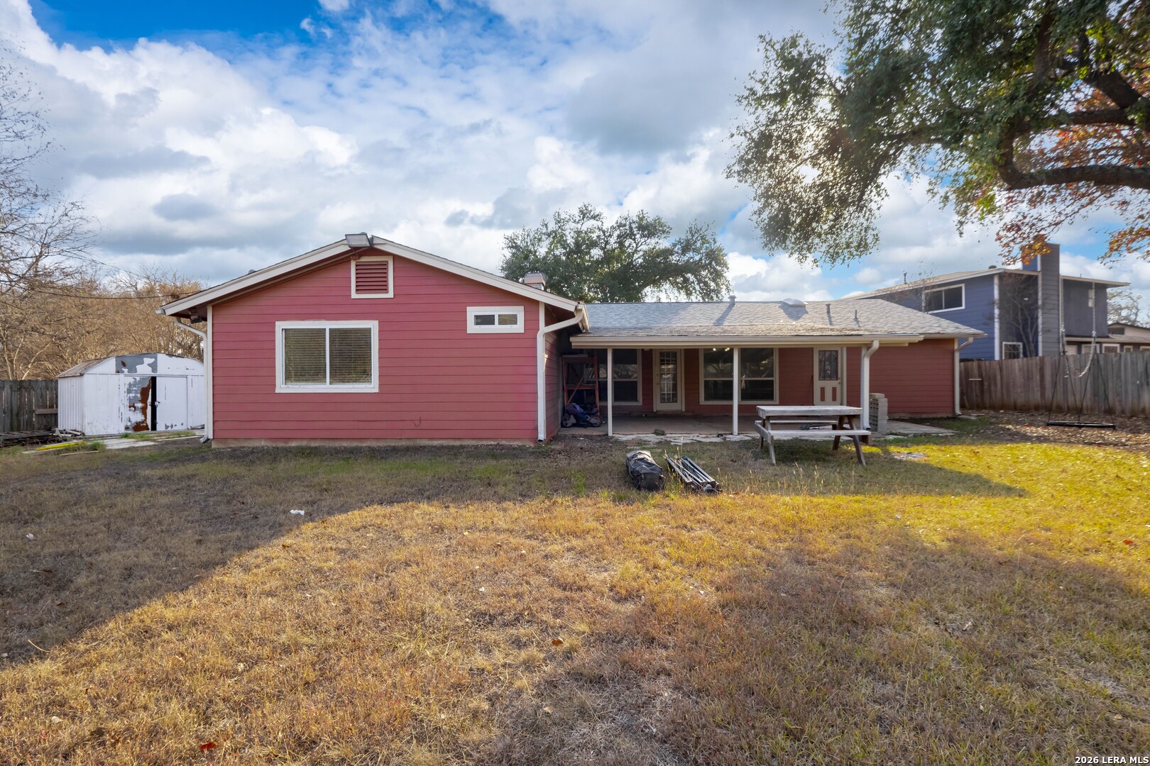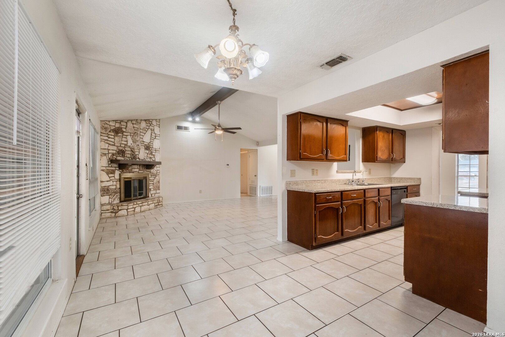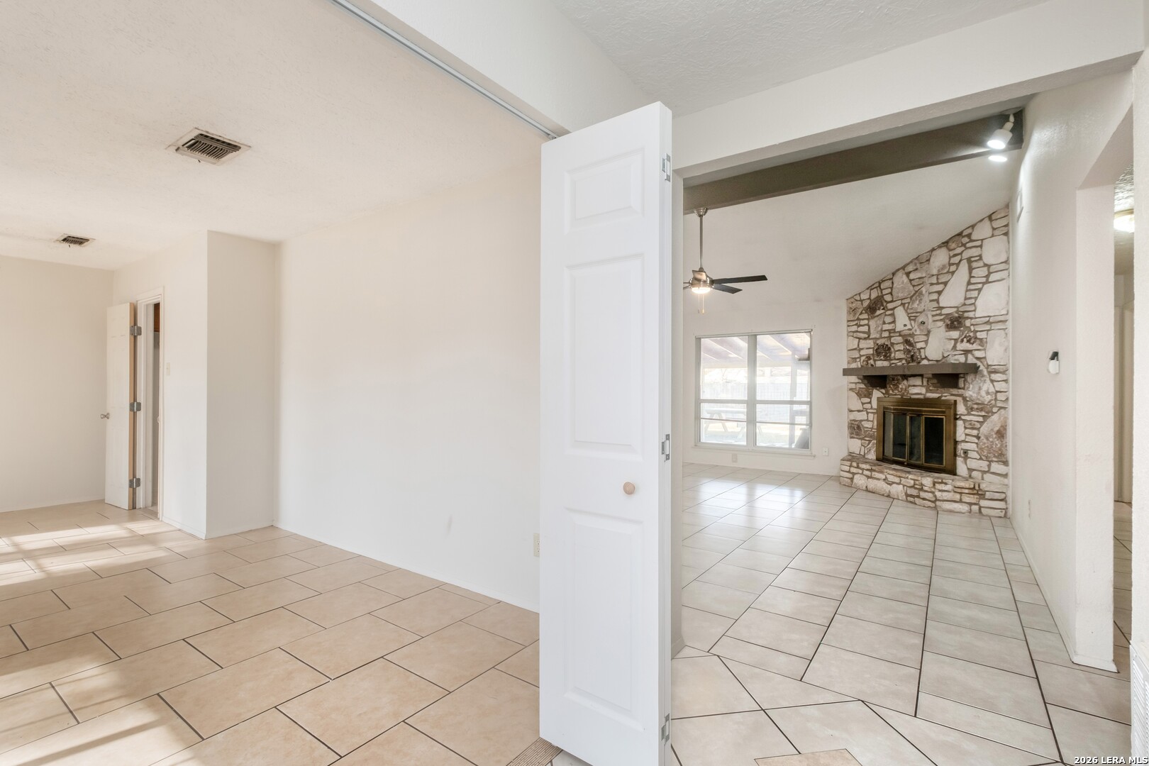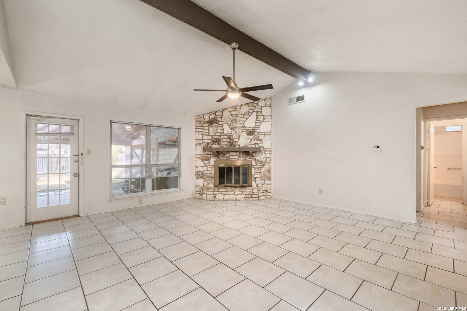 This 4-bedroom, 3-bathroom, one-story vacant home offers 1,775 sq. ft. of living space on a 0.26-acre lot, tucked away in a quiet cul-de-sac. The home features two dining areas: a formal dining room just off the foyer and a bright breakfast nook off the kitchen, providing versatile spaces for everyday meals and entertaining. The living room boasts a beamed ceiling and striking stone fireplace, flowing seamlessly into the dining area for an open, airy feel. The eat-in kitchen offers ample cabinet space and prep area, perfect for family gatherings or hosting friends. The primary suite is positioned at the rear, offering privacy, dual closets, and an ensuite bath with a shower/tub combination. The third full bathroom is conveniently located in the garage. With no carpet throughout, the home is easy to maintain and exudes a modern aesthetic. Step outside to the expansive wooden-fenced backyard, ideal for entertaining, complete with a large covered patio surrounded by trees and backing up to Timber Ridge Park. Other highlights include a 2-car attached garage for convenient parking and additional storage. Don't miss this must-see property!