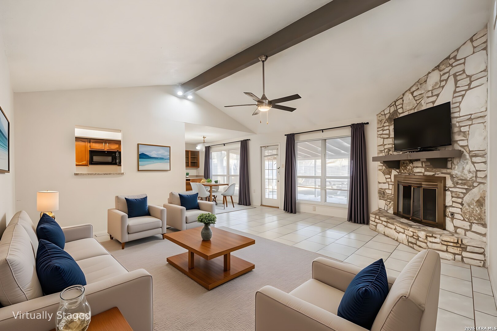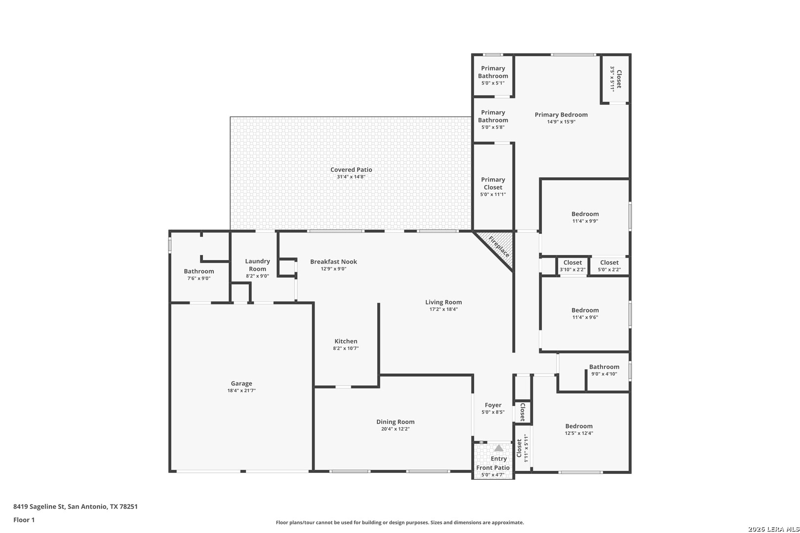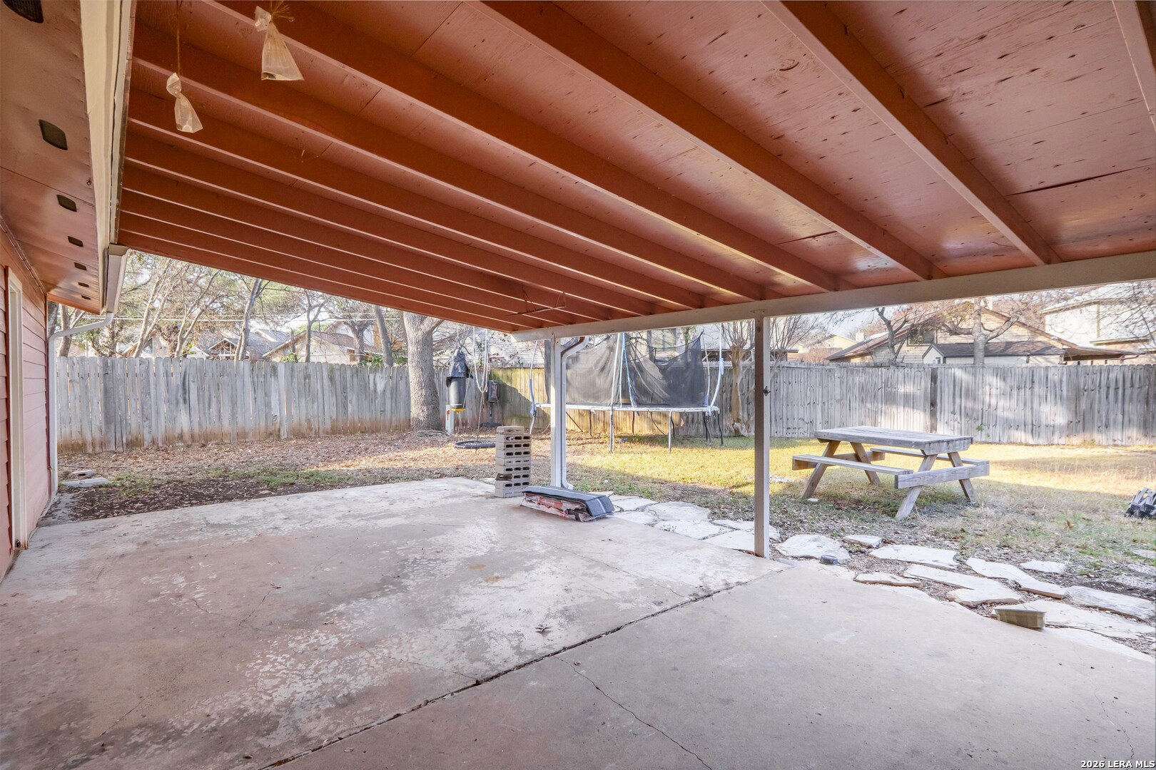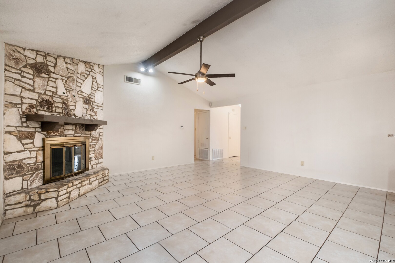 This 4-bedroom, 3-bathroom, one-story vacant home offers 1,775 sq. ft. of living space on a 0.26-acre lot, tucked away in a quiet cul-de-sac. The home features two dining areas: a formal dining room just off the foyer and a bright breakfast nook off the kitchen, providing versatile spaces for everyday meals and entertaining. The living room boasts a beamed ceiling and striking stone fireplace, flowing seamlessly into the dining area for an open, airy feel. The eat-in kitchen offers ample cabinet space and prep area, perfect for family gatherings or hosting friends. The primary suite is positioned at the rear, offering privacy, dual closets, and an ensuite bath with a shower/tub combination. The third full bathroom is conveniently located in the garage. With no carpet throughout, the home is easy to maintain and exudes a modern aesthetic. Step outside to the expansive wooden-fenced backyard, ideal for entertaining, complete with a large covered patio surrounded by trees and backing up to Timber Ridge Park. Other highlights include a 2-car attached garage for convenient parking and additional storage. Don't miss this must-see property!