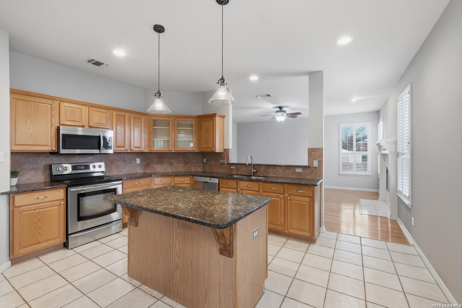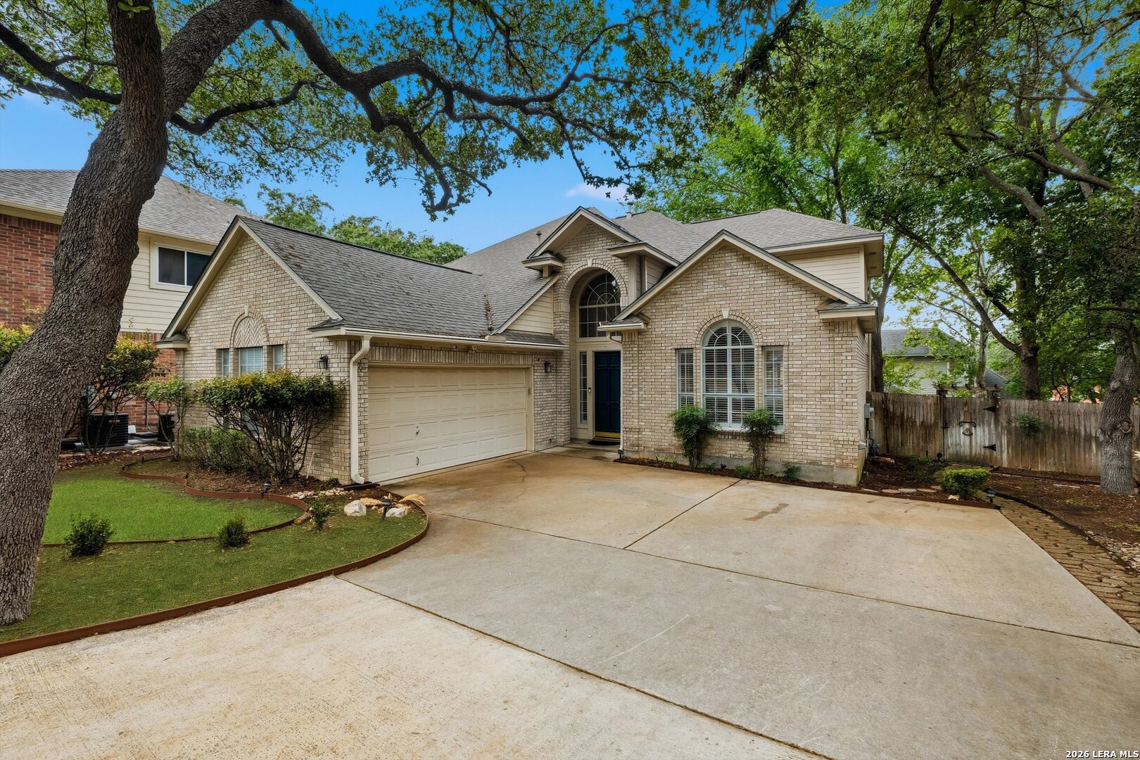 Lovingly cared for 2-story home in Olympia Hills with many mature oak trees. Downstairs features high ceilings, crown molding, plantation shutters, beautiful hardwood floors and a cozy fireplace. A great place for entertaining with two living areas and two eating areas. Gorgeous island kitchen with granite counters and custom cabinets. Fridge conveys. The primary bedroom has a spa-like bath with garden tub and separate shower, and a huge walk-in closet. The garage has an insulated door, utility sink AND an electric car charger! There is a shed out back with electricity. Fence replaced 2024. Walk to the neighborhood pool, clubhouse and tennis/pickleball courts! Also NO cluster mailbox!! Super convenient to I-35, 1604, IH-10, JBSA Randolph and Ft. Sam as well as Olympia Hills golf course, Forum shopping/restaurants, Costco and IKEA. Walk to the community pool, tennis/pickleball courts and Olympia elementary school.