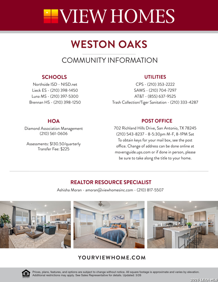 Discover the charm and comfort of the Azalea floorplan, a beautifully designed 4bedroom, 3.5bath home located in the highly soughtafter Weston Oaks community. This spacious layout offers the perfect blend of style, functionality, and modern living, ideal for families who love to entertain or simply enjoy room to grow. Step inside to an inviting openconcept living area filled with natural light, seamlessly connecting the kitchen, dining, and family spaces. The thoughtfully designed kitchen provides generous counter space, a large island, and plenty of storage-perfect for everyday meals or hosting gatherings. The primary suite offers a peaceful retreat with a wellappointed bathroom and ample closet space. Additional bedrooms are generously sized, providing flexibility for family, guests, or a dedicated home office. With 3.5 baths, everyone enjoys convenience and privacy. Upstairs, the Azalea continues to impress with a versatile layout that supports both relaxation and productivity. The 2car garage adds practicality and extra storage options. Located in Weston Oaks, residents enjoy access to community amenities, nearby shopping, dining, and toprated schools-all while being just minutes from major San Antonio attractions. The Azalea floorplan delivers comfort, space, and timeless design in a community you'll love calling home.