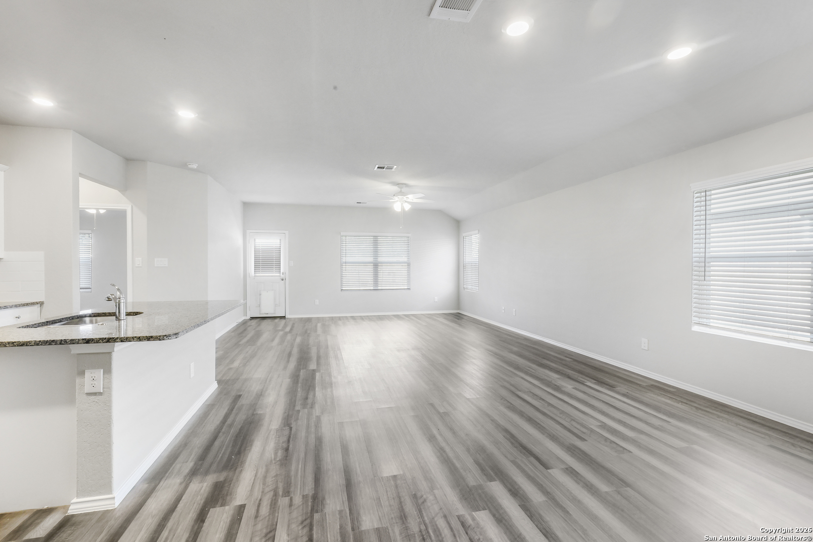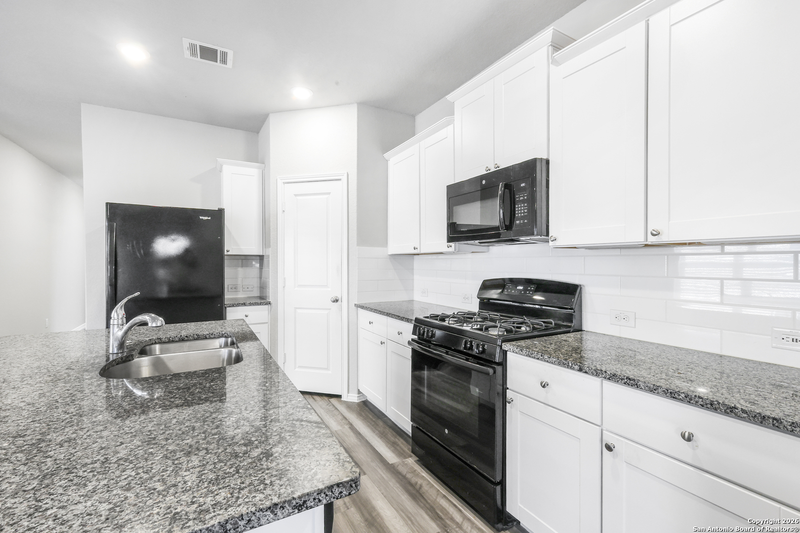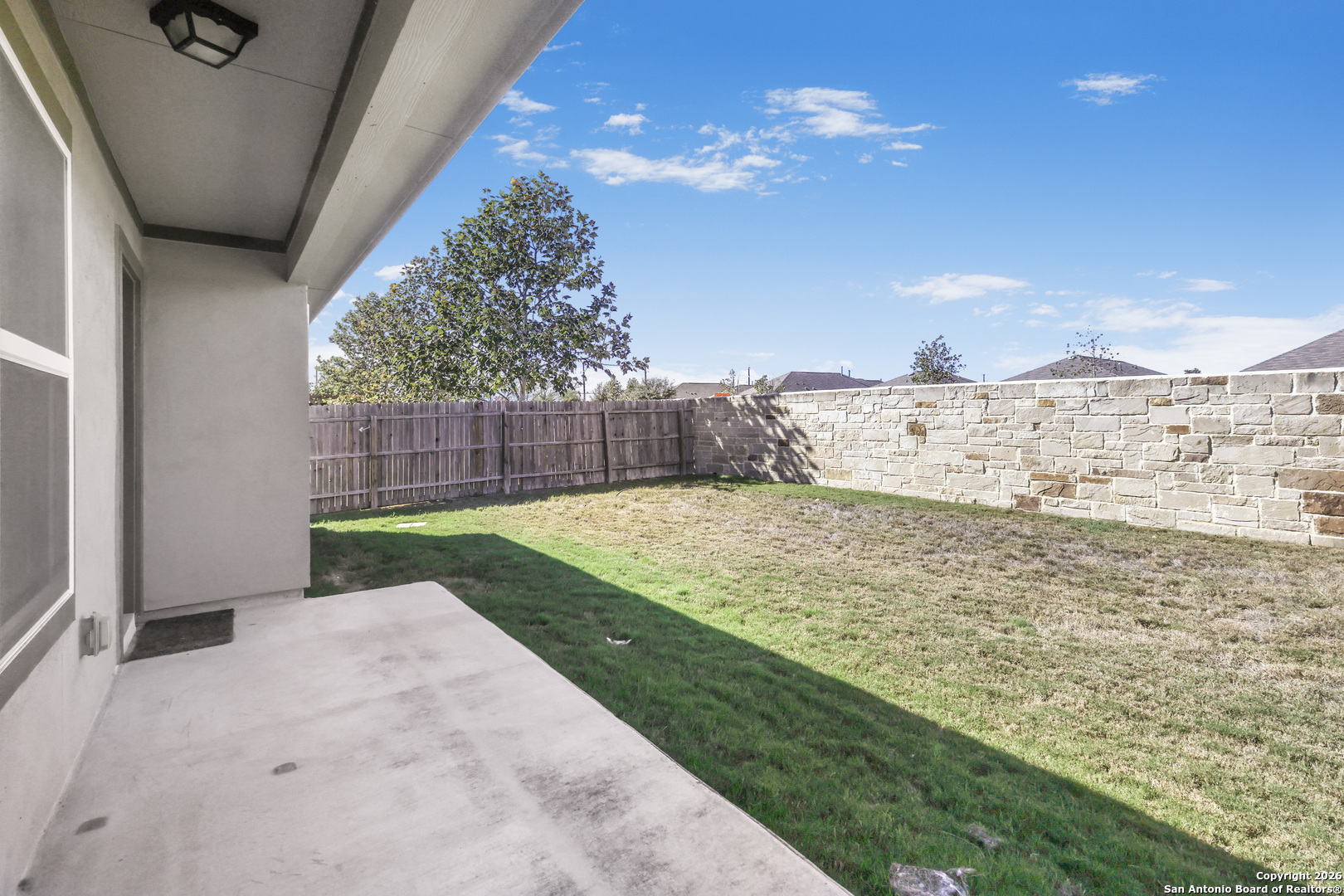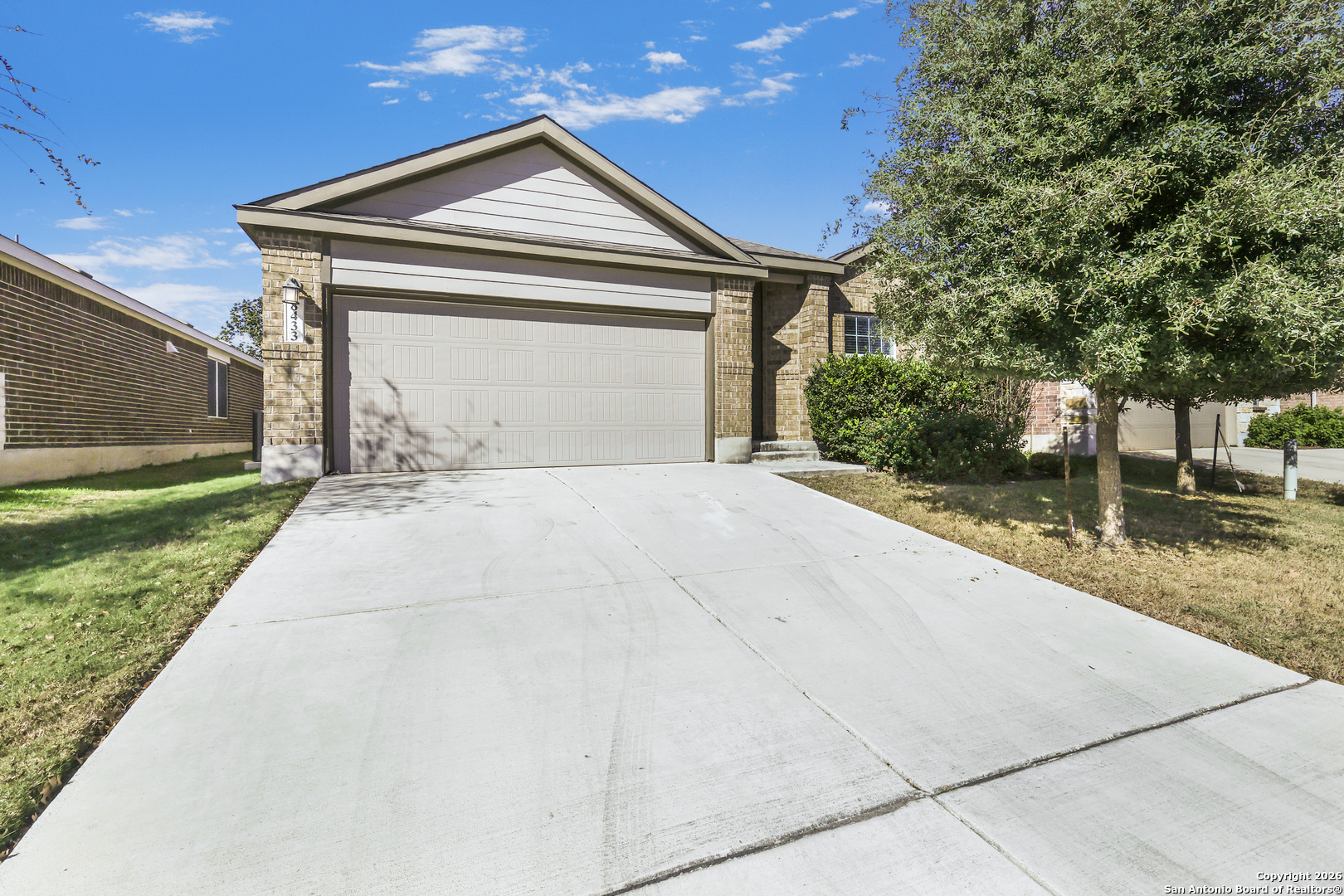 This beautiful three-bedroom, two-bath home is nestled in the desirable Waterwheel community of Northwest San Antonio and offers an ideal blend of comfort, style, and convenience. The single-story layout welcomes you with impressive curb appeal, highlighted by a stone and brick facade, manicured landscaping, and a spacious driveway leading to a two-car garage. Inside, a bright and airy open-concept design unfolds with luxury vinyl plank flooring throughout the main living areas and abundant natural light that enhances the inviting atmosphere. The stylish kitchen features granite countertops, ample cabinetry, and generous storage, seamlessly connecting to both the dining area and an adjacent breakfast nook that provide flexible spaces for everyday meals or special gatherings. The oversized living room offers plenty of space to relax and entertain while maintaining a natural flow into the kitchen and dining areas for effortless connection. The private primary suite serves as a peaceful retreat with large windows, a walk-in closet, and a double-vanity ensuite bath. Outdoors, the home has a new roof which was replaced in July 2025 and the fully fenced backyard is perfectly suited for quiet mornings or evening get-togethers, featuring a covered patio, lush green lawn and the added privacy of a cul-de-sac lot. Additional features include Ring doorbell, smart thermostat and a whole home wifi extender, a dedicated laundry room, recessed lighting, ceiling fans throughout, and a neutral color palette ready for personal touches. Zoned to Northside ISD and conveniently located near shopping, dining, parks, and major highways, this home offers a wonderful opportunity to enjoy Northwest San Antonio living at its best!