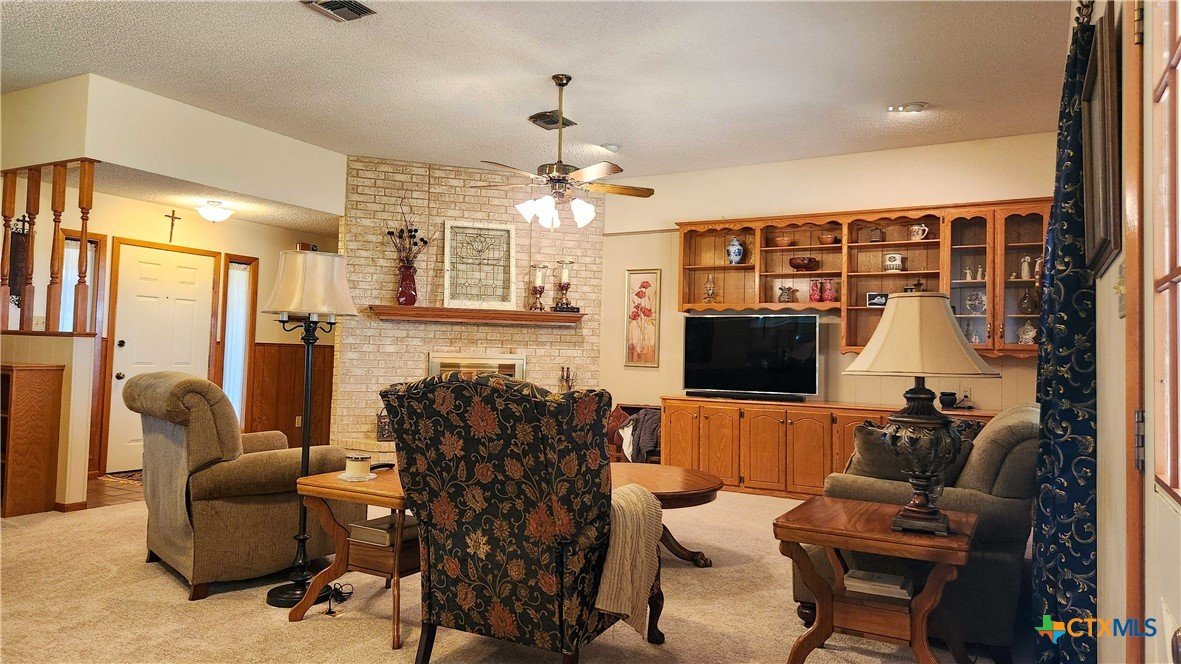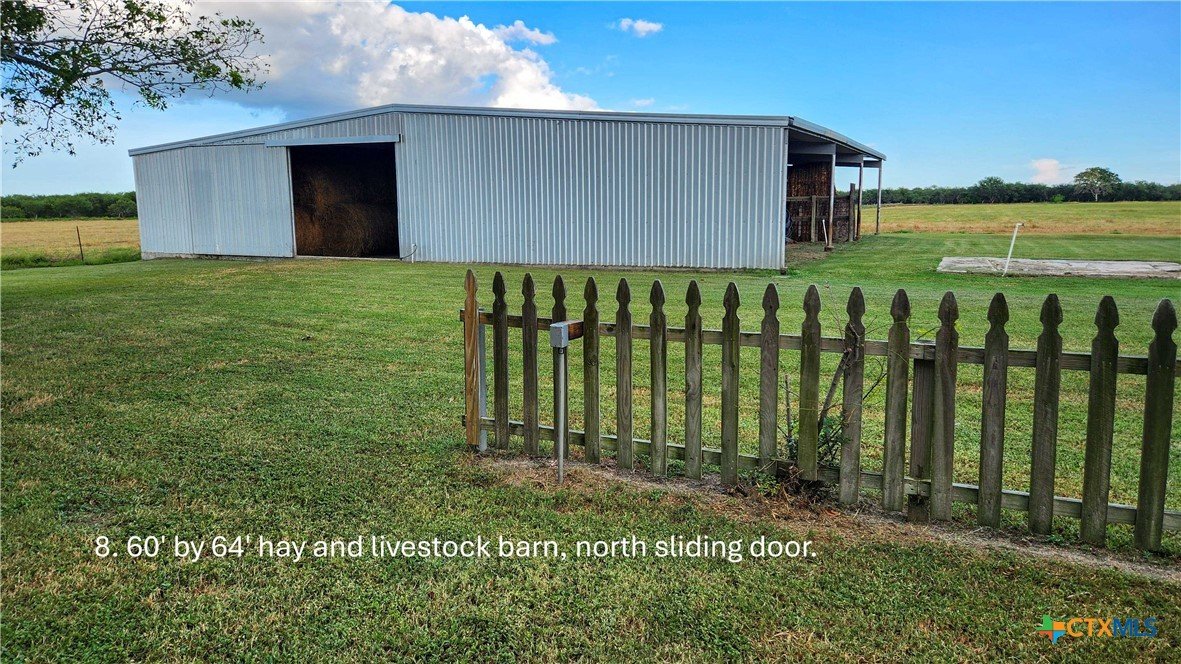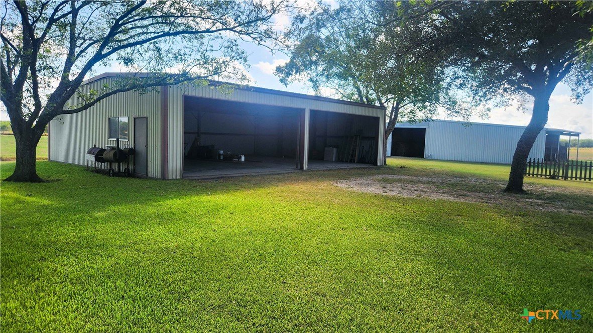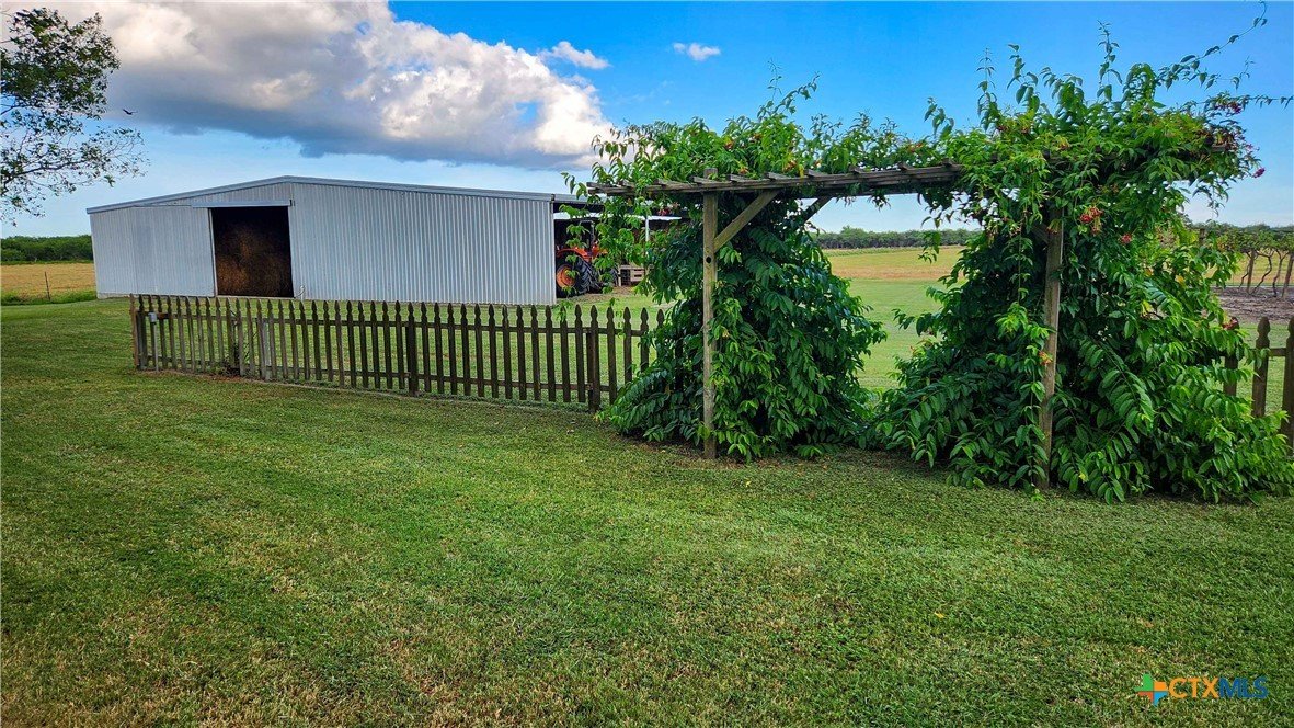 Beautiful Country Estate on 20.98 acres, well-located close to Victoria. This custom-built home features an oversized garage, a covered front porch to catch those sunsets, and a large covered patio. The updated interior complements the well-thought-out floor plan. The foundation is reinforced with 14' bell-bottom piers during construction. Beams are spaced 10-12' apart, and a 4" slab is built to withstand generations. The living room has a wood-burning fireplace. The interior is freshly updated. Double-pane windows add to the efficiency. The kitchen has a center island and plenty of cabinets and countertop space for meal preparation and serving. Outside, you will love all the buildings. There is a large equipment/livestock barn with 3,840 sf, power, water, and compressed air lines. There is an additional large shop with a 2,200 sf concrete floor, power, water, air, and tiedowns. The 416 sf well house makes for additional storage and workspace. The land is as functional as beautiful. There are 44 Live Oaks, including 32 providing a double-sided tree-lined entrance. There are 26 mature shade trees in the yard, providing natural cooling and storm protection. The 9 Mesquite trees provide shade for livestock. As an addditional feature, you get a 20-24 vine vineyard for winemaking, juice, or jelly. The raised garden bed has established perennial asparagus plus ample space for seasonal vegetables. There are fruit and nut trees that include six producing pecans (nine varieties, peaches, figs, satsuma oranges, apricot, persimmon, and bananas. The land is fertile and productive, with approximately 20 acres of ag-exempt pasture/cropland. For 38 years, it has consistently produced profitable hay crops of either alfalfa or clover and sorghum-sudan annually. Multiple barns provide ample hay and equipment storage, supporting livestock, farming, or expanded agricultural ventures. This is the perfect home, agricultural operation, or simply enjoying a peaceful country lifestyle.