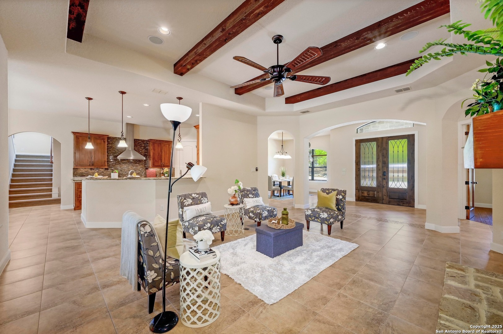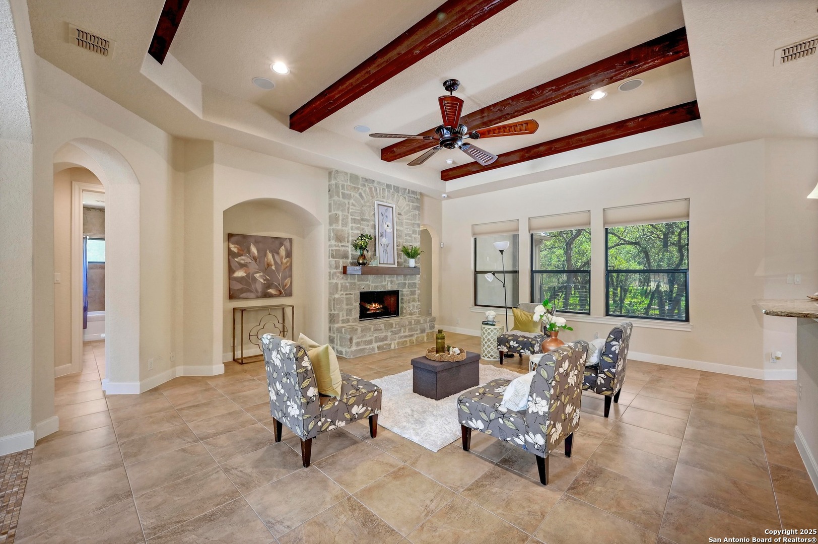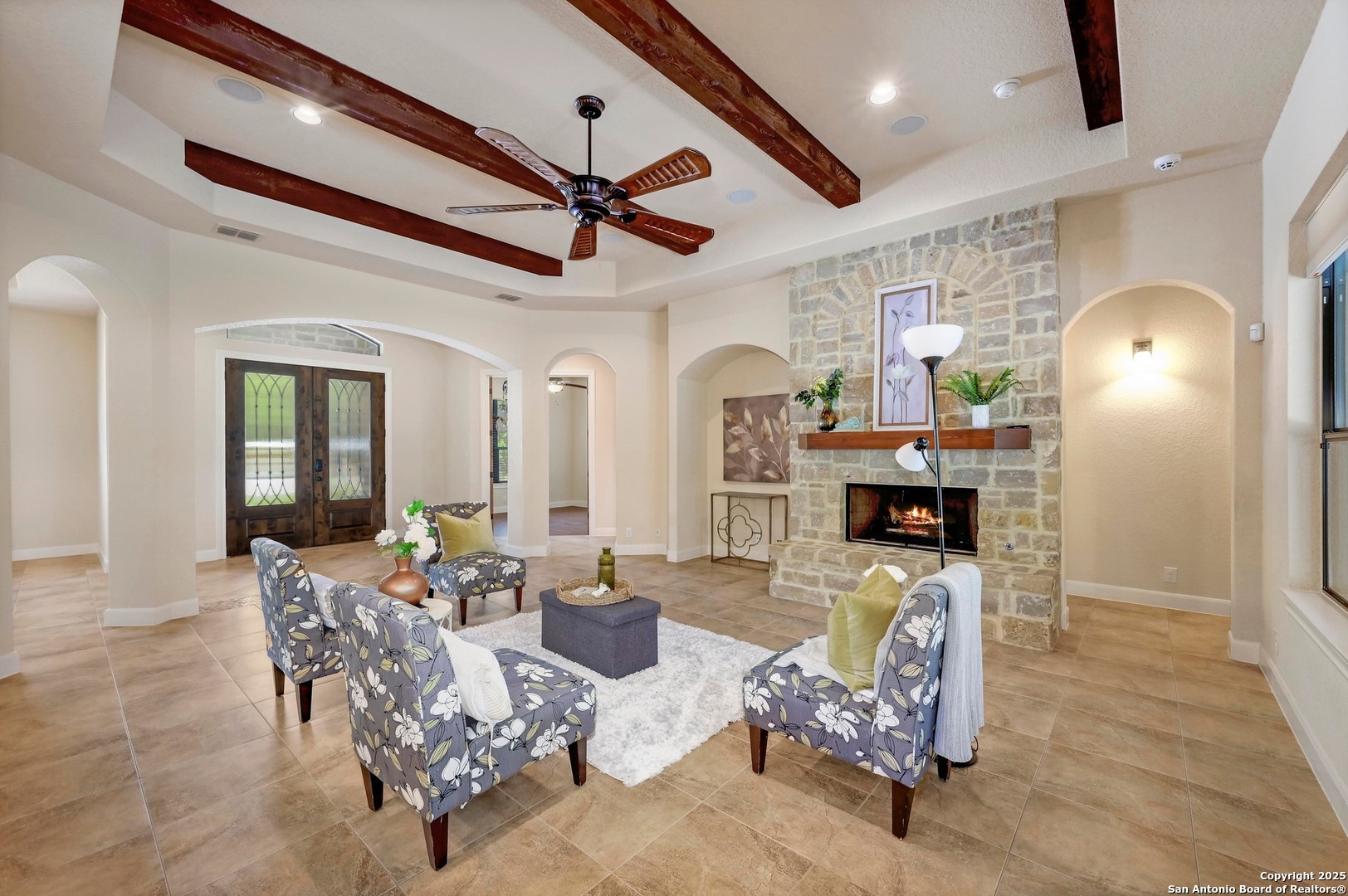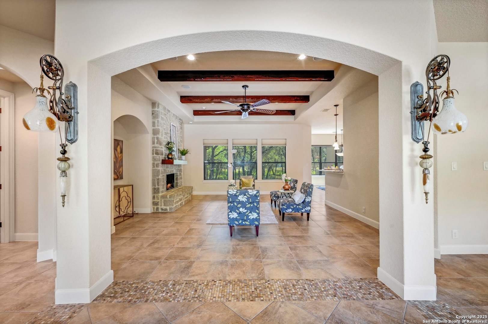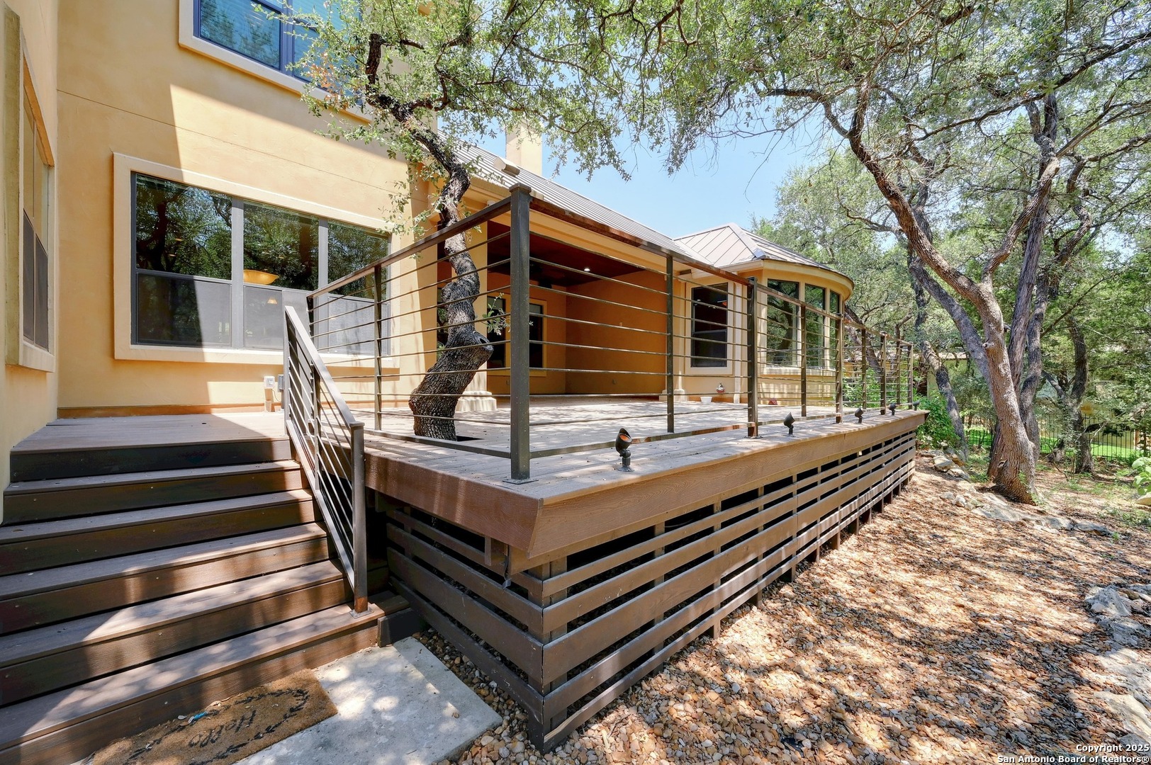 Nestled on a full acre of private, tree-studded land in a premier Hill Country community, this exceptional custom home offers the perfect balance of upscale comfort, scenic beauty, and proximity to some of Central Texas' most sought-after destinations-including New Braunfels, Canyon Lake, Spring Branch, and Bulverde. Step inside to discover a thoughtfully designed layout featuring 4 spacious bedrooms, 3.5 baths, a dedicated home office, formal dining room, versatile media room upstairs, and an additional flex space that can serve as a guest suite, second office, or hobby room. A generously sized workshop or fitness room-complete with storage, utility sink, and its own air conditioning-adds even more functionality to this well-appointed home. The heart of the home is a striking great room anchored by vaulted wood-beamed ceilings and a floor-to-ceiling stone fireplace (which is connected to a 500 gallon proprane gas tank which can also be connected to the outdoor patio grill so you never have to worry about an ice storm again) seamlessly flowing into a gourmet kitchen with an oversized center island, vegetable sink, bar seating, and abundant prep and storage space. Whether entertaining guests or enjoying a quiet evening, this open-concept layout offers comfort and elegance at every turn. Retreat to the primary suite and wake up to tranquil views of the surrounding natural landscape-a private oasis that feels like a luxury getaway. The ensuite bath and walk-in closet complete the space with spa-like ease. And talk about the serenity of the backyard! Fully fenced and surrounded by mature trees enjoy the sounds and scenery of nature. Located within a prestigious John Newcombe Country Club tennis resort and club community, recreational amenities and social opportunities are always within your reach. Yet, with an acre of space and Hill Country views surrounding you, peace and privacy remain the essence of everyday living. This is more than a home-it's a lifestyle. Embrace Hill Country living without compromise. Schedule your private showing today.