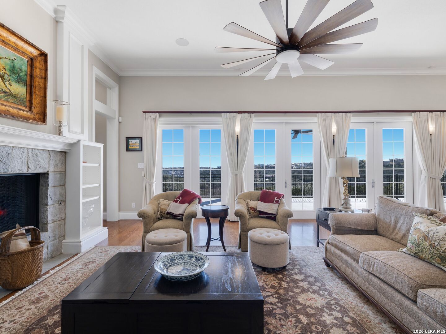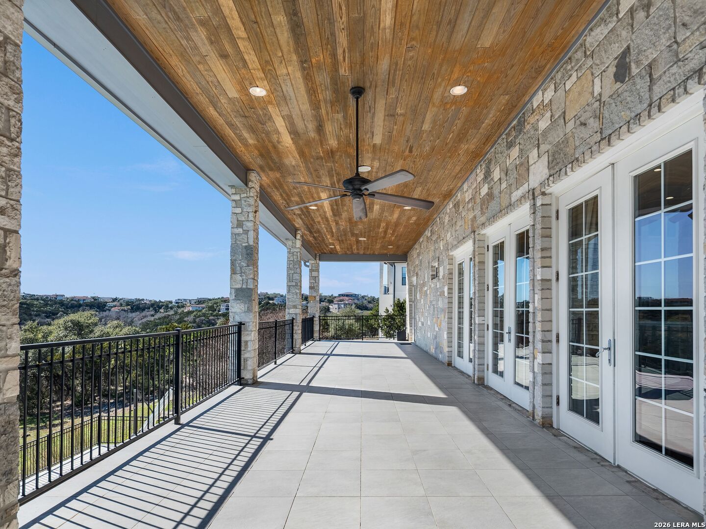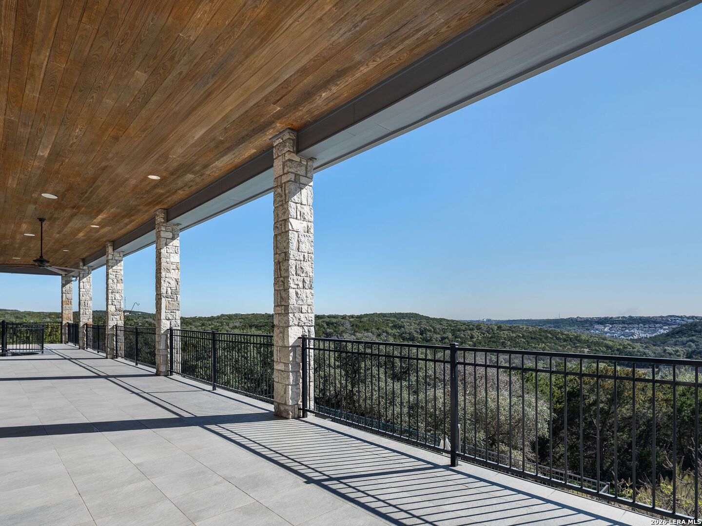 Set on .71 acres overlooking protected greenbelt and natural preserve, this Robare Custom Home offers elevated Hill Country living with a layout designed for both daily comfort and long-term flexibility. Walls of glass line the rear of the home, drawing natural light into the main living areas and framing expansive views across the surrounding landscape. Two covered balconies extend the interior outward, creating seamless indoor-outdoor flow and providing multiple vantage points to enjoy the setting. The main level is anchored by the primary suite and a secondary guest bedroom, allowing for true single-level living without interior steps. Below, the home unfolds into a well-designed Texas basement featuring a spacious game room, dedicated media or theatre room, two additional guest suites, a full bath, and laundry. This level opens directly to a covered patio finished with a wood-paneled ceiling, while a sculptural spiral staircase connects both outdoor living levels. Thoughtful architectural details include gas cooking, crown molding accents, audio, and a floor plan that balances openness with separation. The home's elevated positioning creates privacy while maintaining wide-open sightlines across the preserve beyond. Recent improvements enhance functionality and accessibility while preserving the integrity of the original design, offering a residence that is equally suited for full-time living or refined entertaining in a private Hill Country setting.