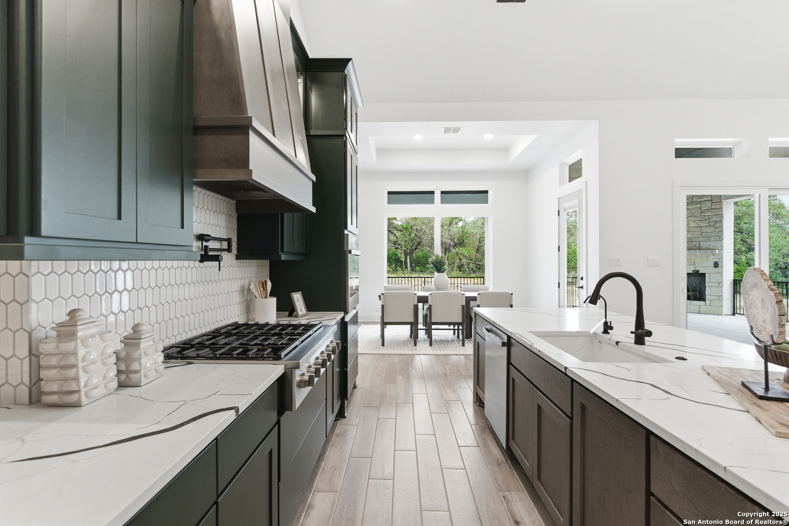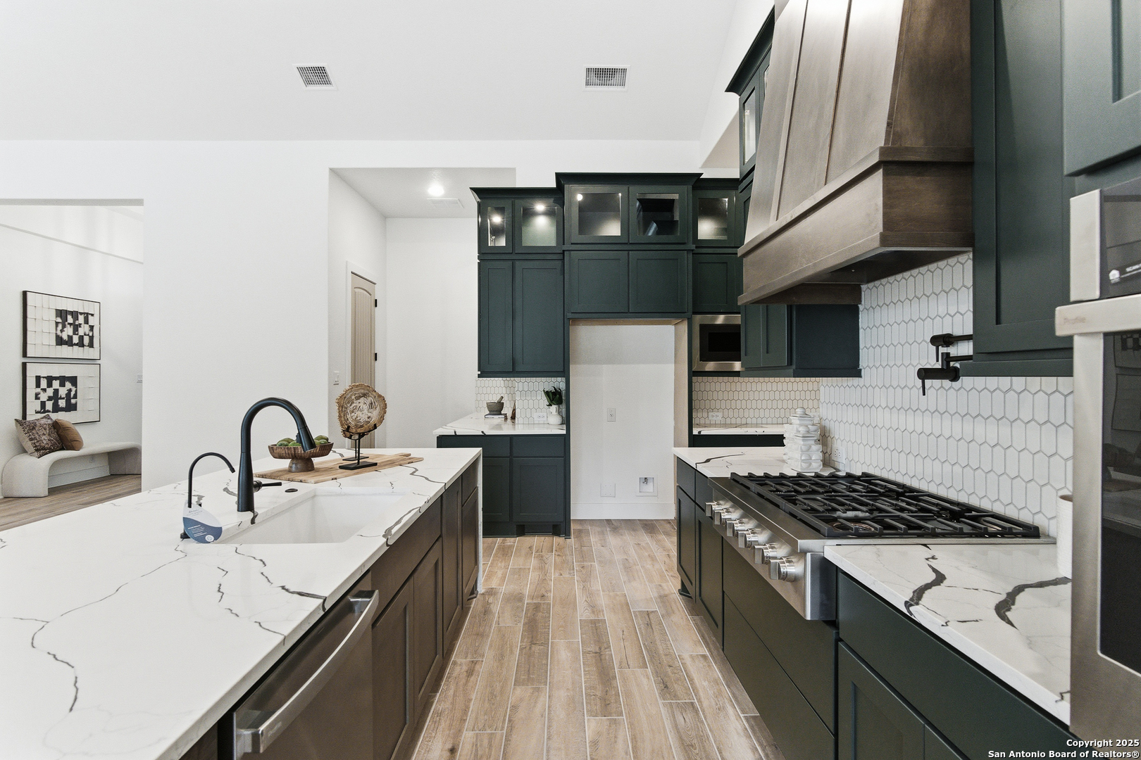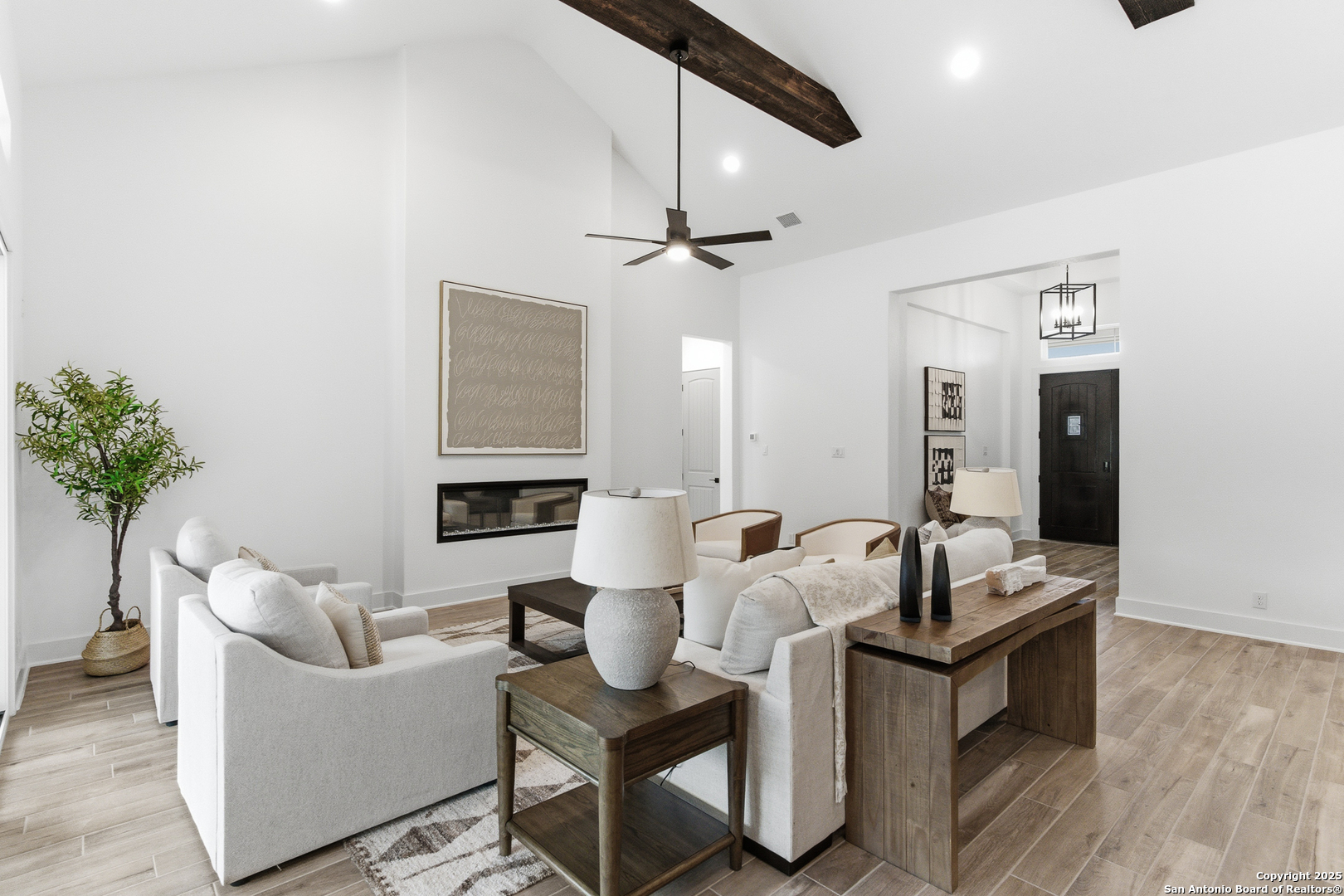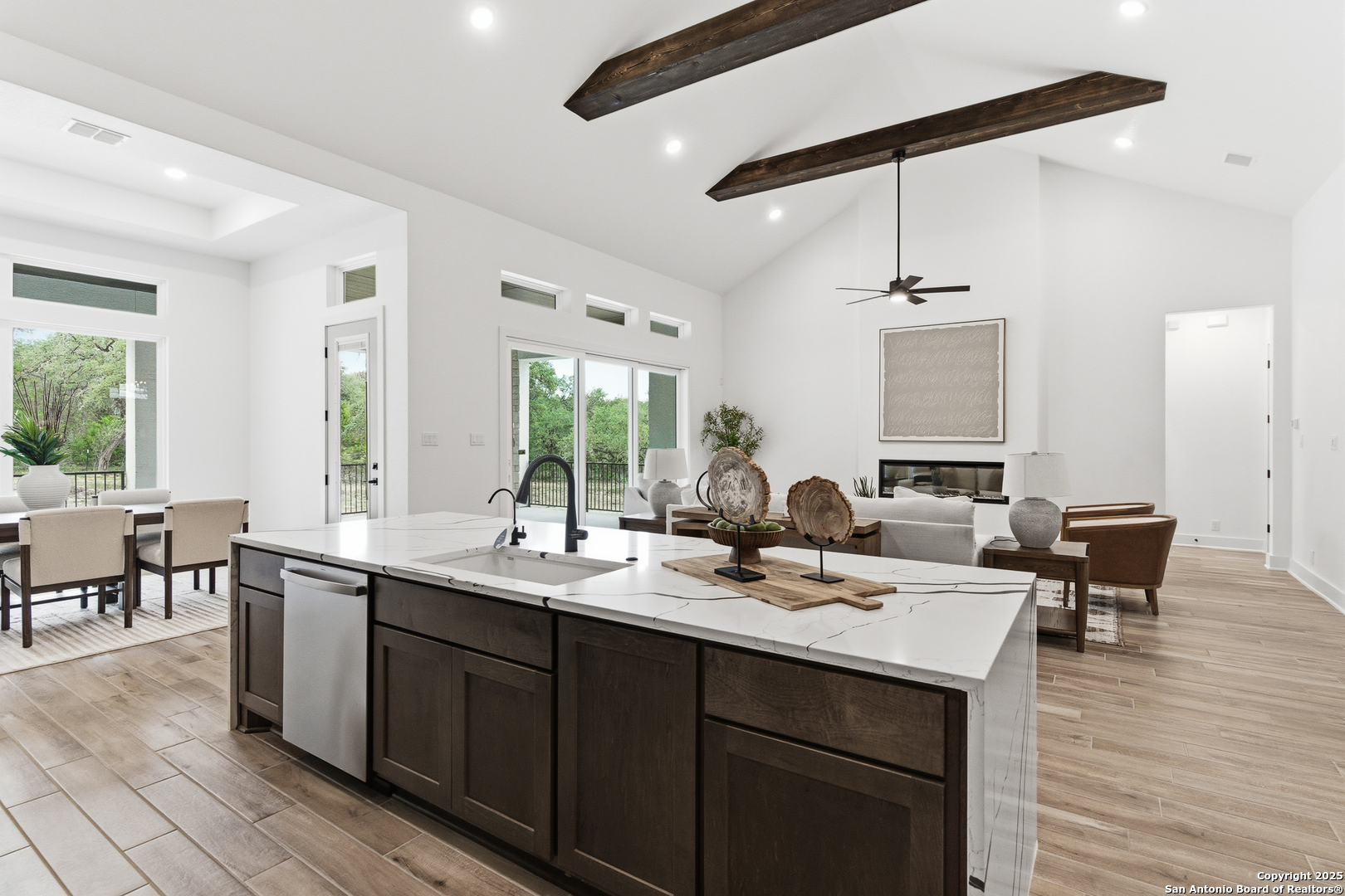 Move in Ready! Beautiful one story 3239 sq. ft. home with 4 bedrooms, 3 1/2 baths, study, game room and a 3-car garage on a 1/2-acre lot all nestled in a beautiful, wooded neighborhood right outside of Garden Ridge, TX. Walk in through the beautiful double front doors into this open floor plan with a fabulous kitchen with an oversized kitchen island with omega stone countertops with apron sides and Silgranit Diamond super single white bowl sink. The kitchen also features stacked cabinets with glass inserts and puck lighting. Enjoy cooking on your cafe 6 burner cooktop and an added pot filler. This home stands out with wooden shutters across the front featuring 4.5" louvers and clear line hidden tilt function. The large family room features suspended cedar beams, oversized sliding glass doors and a 60" Allusion Platinum fireplace. Enjoy your spacious outdoor living with 42" gas fireplace.