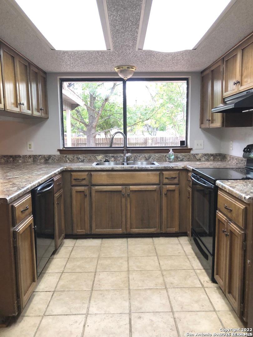 really nice one story home in popular Braun Station, new: interior & exterior paint, carpet, plumbing fixtures. 3 bed rooms, split bed room design, 2 full bathrooms, 2 living areas, 2 eating areas, double sided stone fireplace cathedral ceilings-covered front porch and back patio nestled under mature trees. kitchen area has built-in wood desk, bookcase & china cabinet. window coverings throughout home. Good sized back yard with privacy fencing
