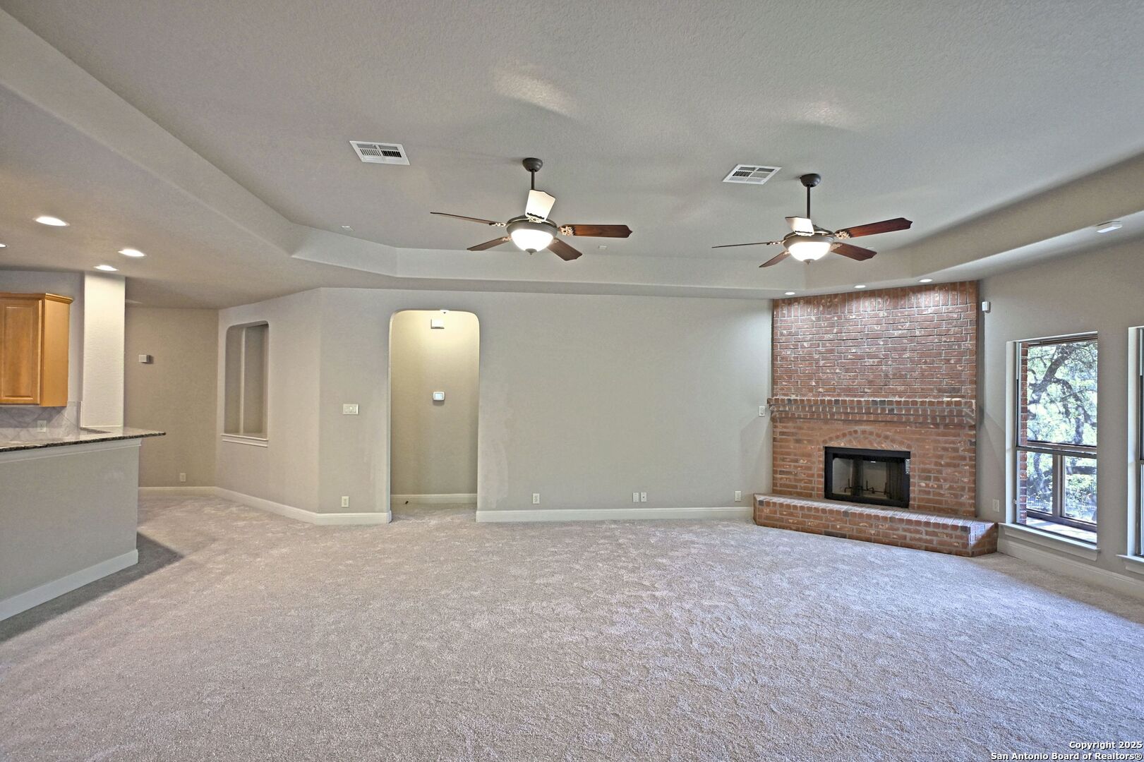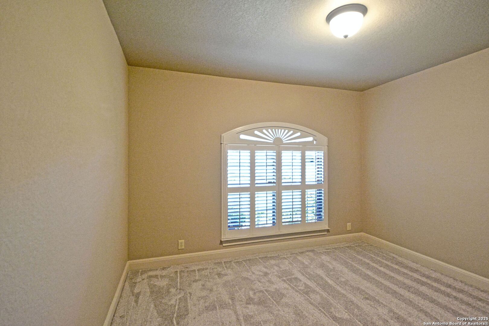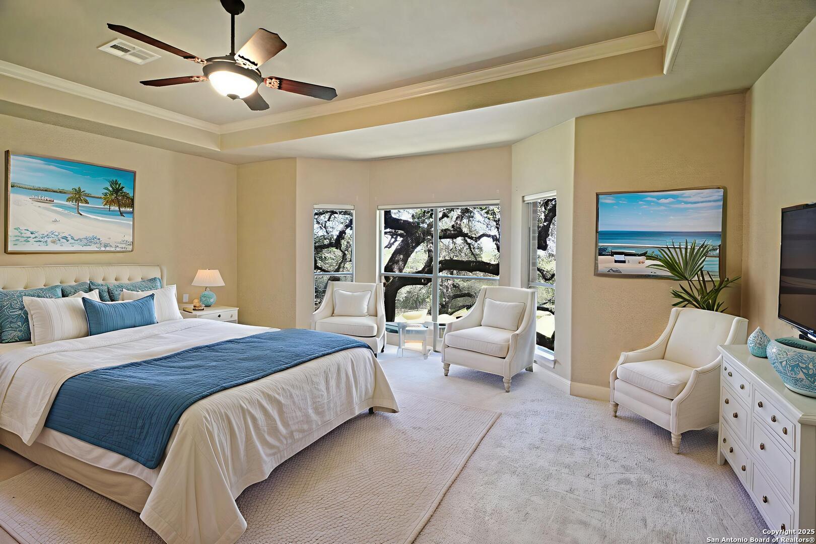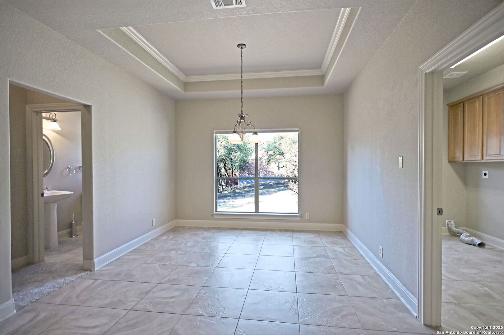 Marvel at the magnificence of this beautiful 4-bedroom, 2.5-bathroom home with a flex room, perfectly situated in the heart of The Enclave community in New Braunfels. A well-shaded path leads you to a welcoming entry, where a striking tray ceiling guides you towards the formal dining area. Right in the heart of the home is the inviting island kitchen, designed with elegant granite countertops, walk-in pantry, and a ceramic tile backsplash. Enjoy your meals and gatherings in the brightly lit breakfast dining area, conveniently located near the half bath. After a long day, cozy up to the warm masonry fireplace in the spacious living room. The luxurious primary bedroom suite is a true retreat, boasting two generous walk-in closets, a garden tub, dual sinks, and a tiled walk-in shower with spa-like features. Step outside to unwind in the enclosed patio, offering tranquil views of the serene backyard. This exceptional property also features an attached three-car garage and a paved driveway with ample space for parking your RV or other recreational vehicles.