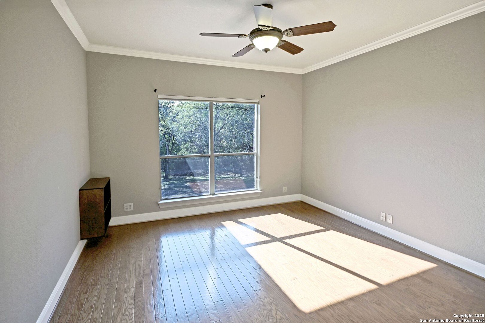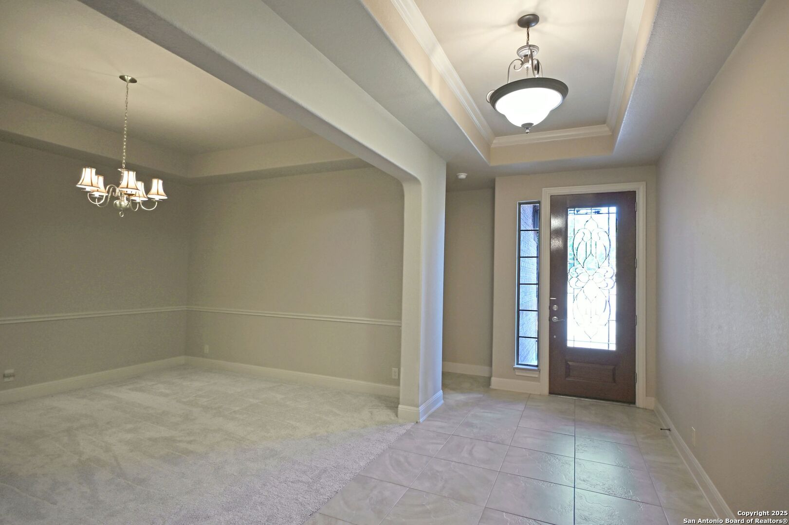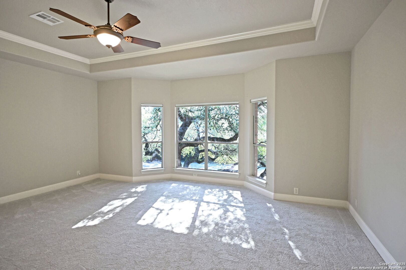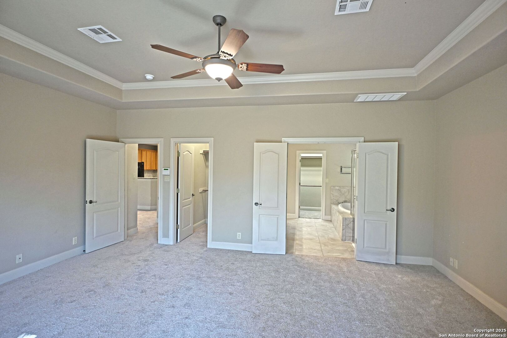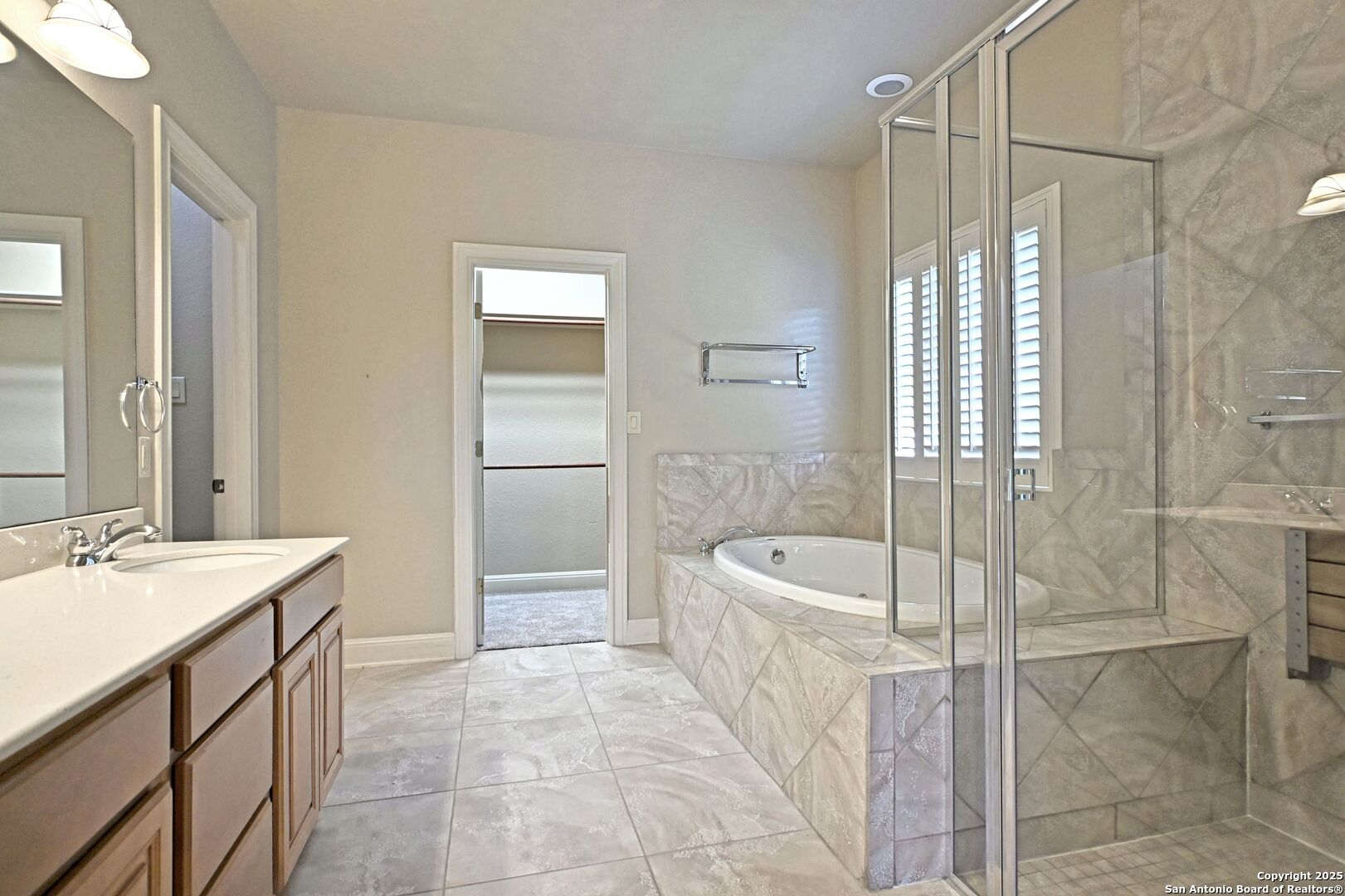 Marvel at the magnificence of this beautiful 4-bedroom, 2.5-bathroom home with a flex room, perfectly situated in the heart of The Enclave community in New Braunfels. A well-shaded path leads you to a welcoming entry, where a striking tray ceiling guides you towards the formal dining area. Right in the heart of the home is the inviting island kitchen, designed with elegant granite countertops, walk-in pantry, and a ceramic tile backsplash. Enjoy your meals and gatherings in the brightly lit breakfast dining area, conveniently located near the half bath. After a long day, cozy up to the warm masonry fireplace in the spacious living room. The luxurious primary bedroom suite is a true retreat, boasting two generous walk-in closets, a garden tub, dual sinks, and a tiled walk-in shower with spa-like features. Step outside to unwind in the enclosed patio, offering tranquil views of the serene backyard. This exceptional property also features an attached three-car garage and a paved driveway with ample space for parking your RV or other recreational vehicles.