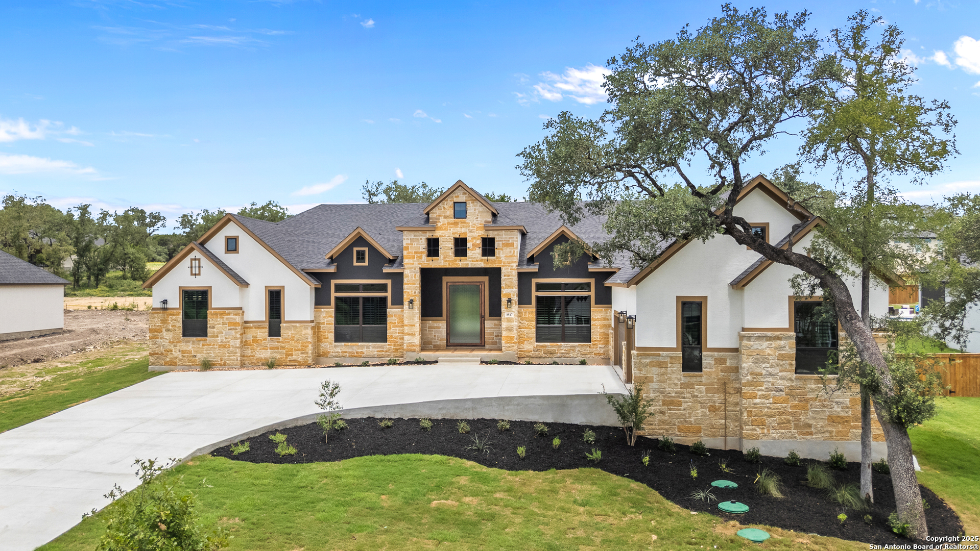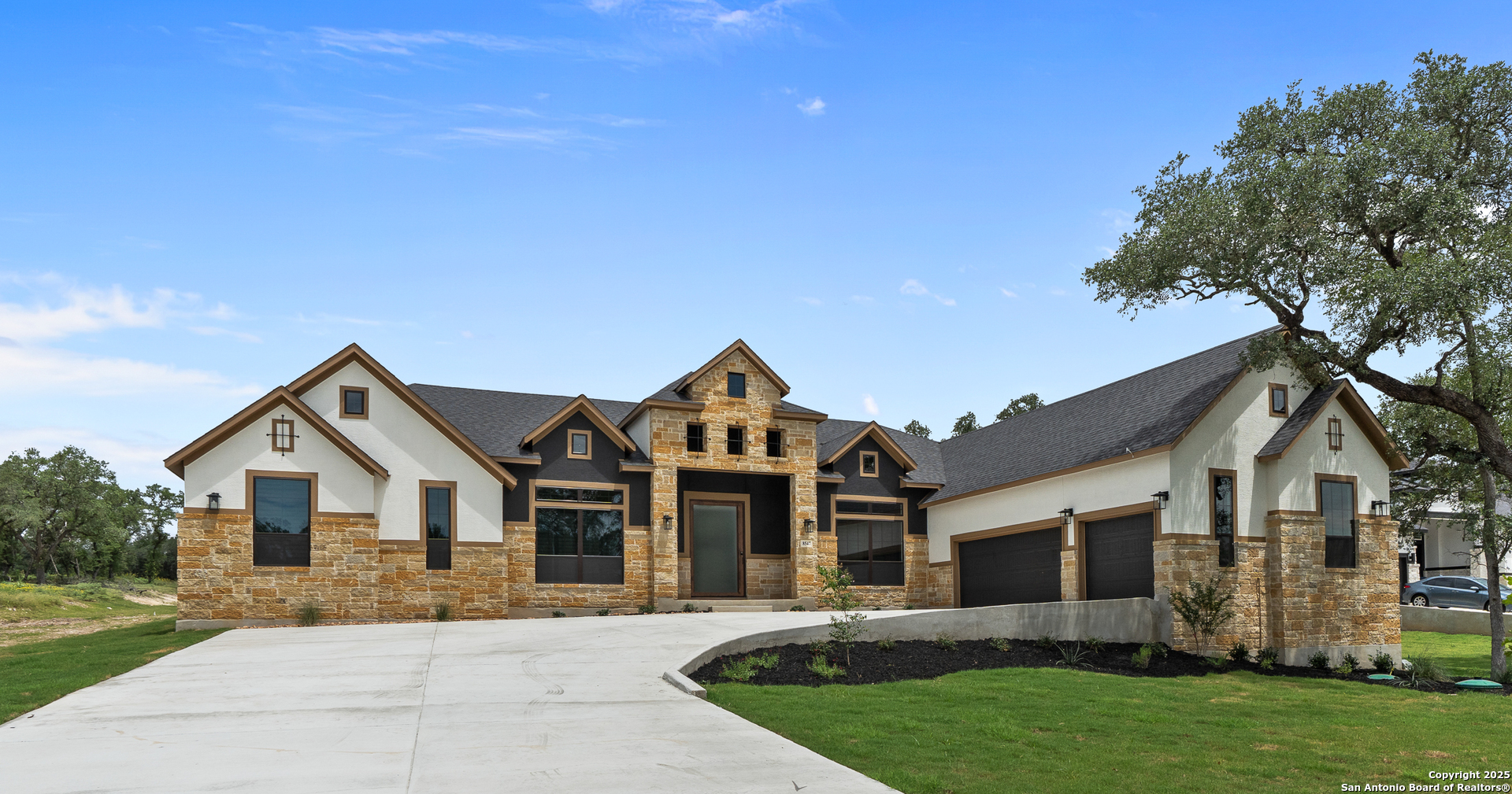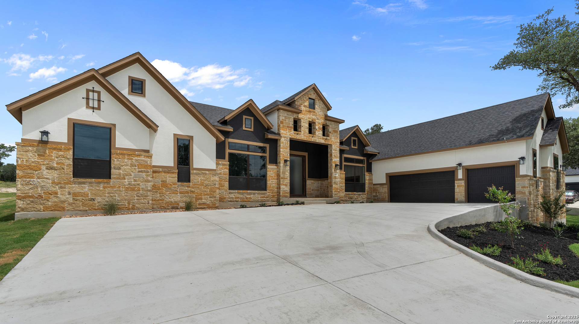 Move in Ready! Beautiful one-story home with three living areas and 3 Car swing in garage on a 1/2-acre lot in the highly sought after Garden Ridge area. This 3939 square foot home features a fabulous kitchen with double islands with omega stone countertops with apron sides, upper stacked cabinets with glass doors and a stainless-steel farm sink. The interior features a 78' electric fireplace, private study, game room and media room. Enjoy your spacious outdoor living with an oversized patio as well as a private owner's suite patio.