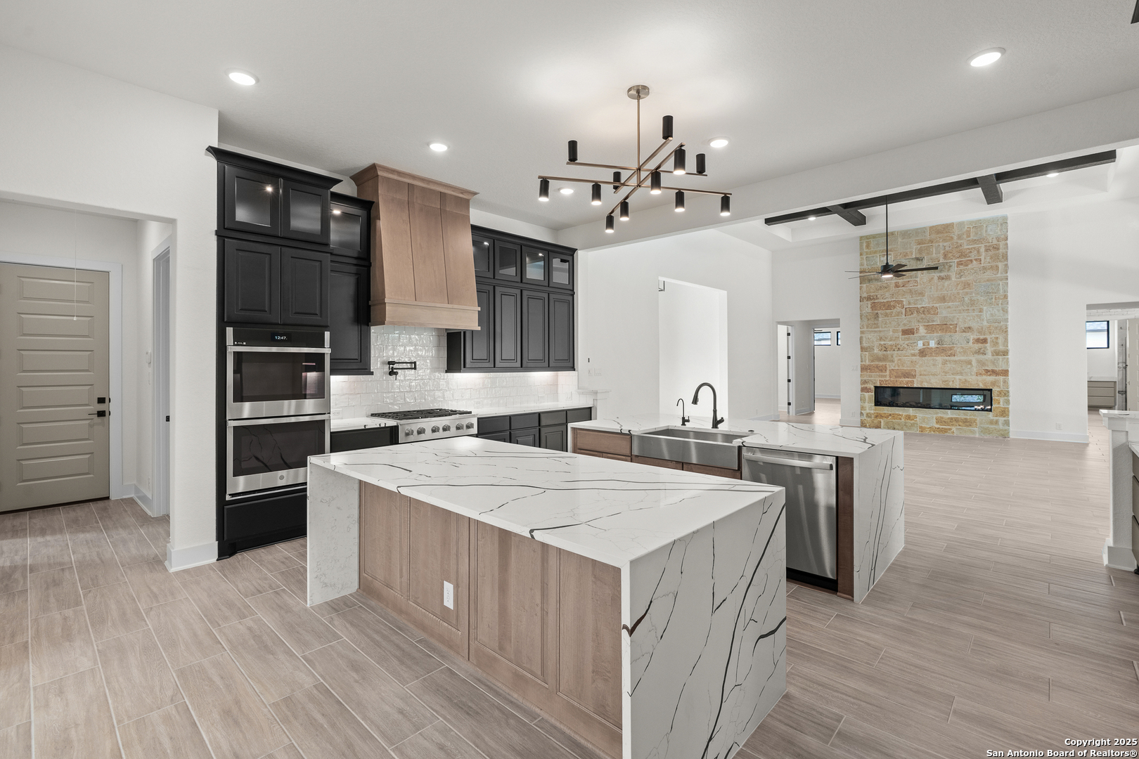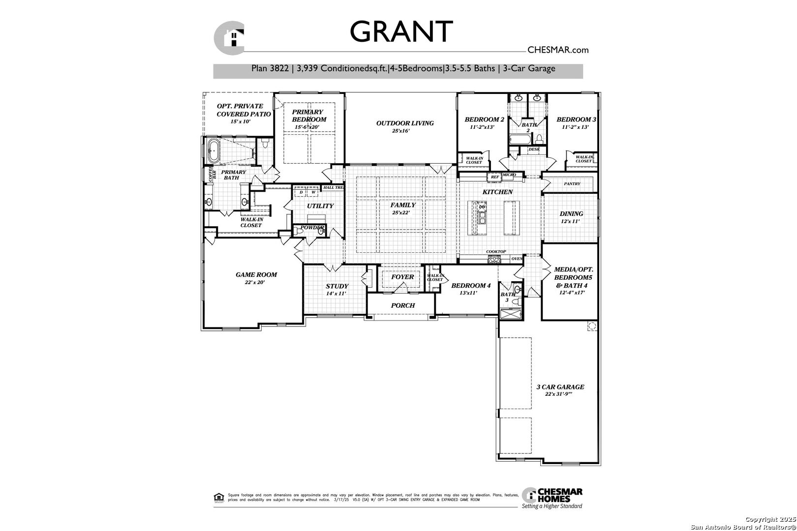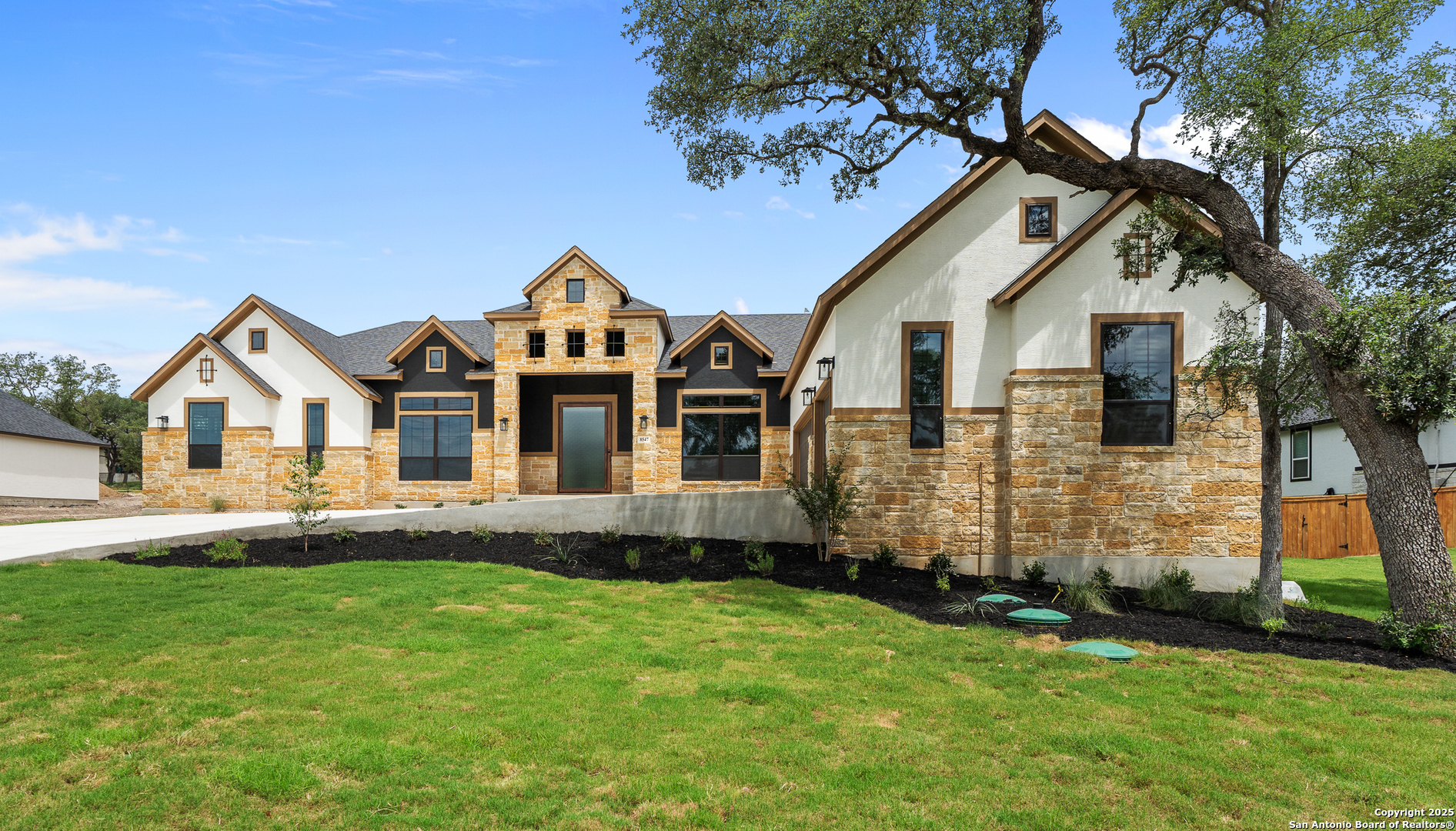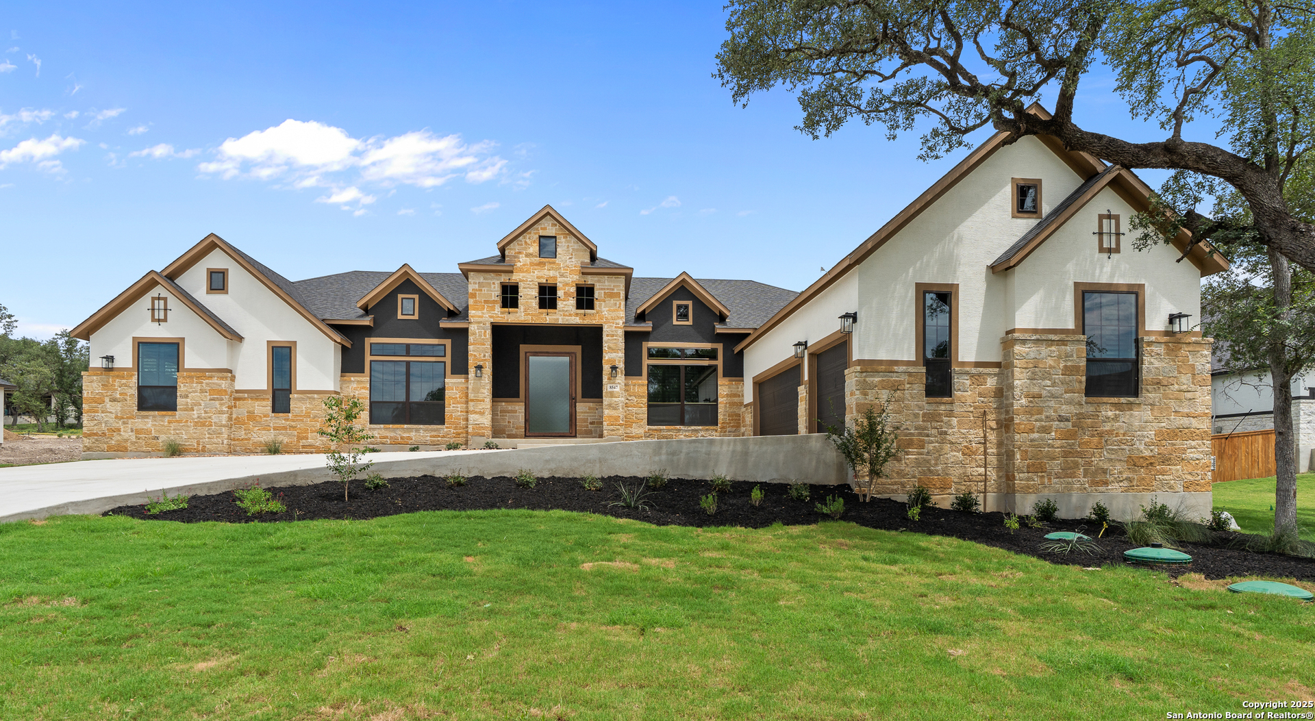 Move in Ready! Beautiful one-story home with three living areas and 3 Car swing in garage on a 1/2-acre lot in the highly sought after Garden Ridge area. This 3939 square foot home features a fabulous kitchen with double islands with omega stone countertops with apron sides, upper stacked cabinets with glass doors and a stainless-steel farm sink. The interior features a 78' electric fireplace, private study, game room and media room. Enjoy your spacious outdoor living with an oversized patio as well as a private owner's suite patio.