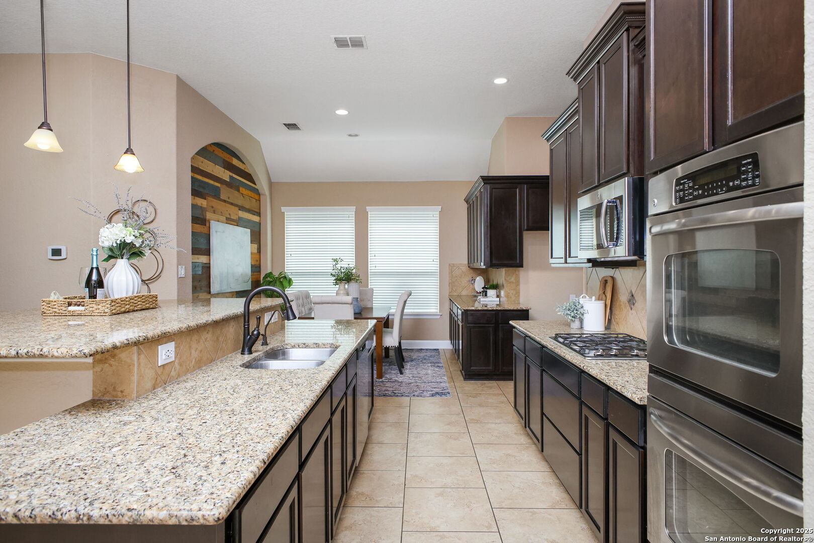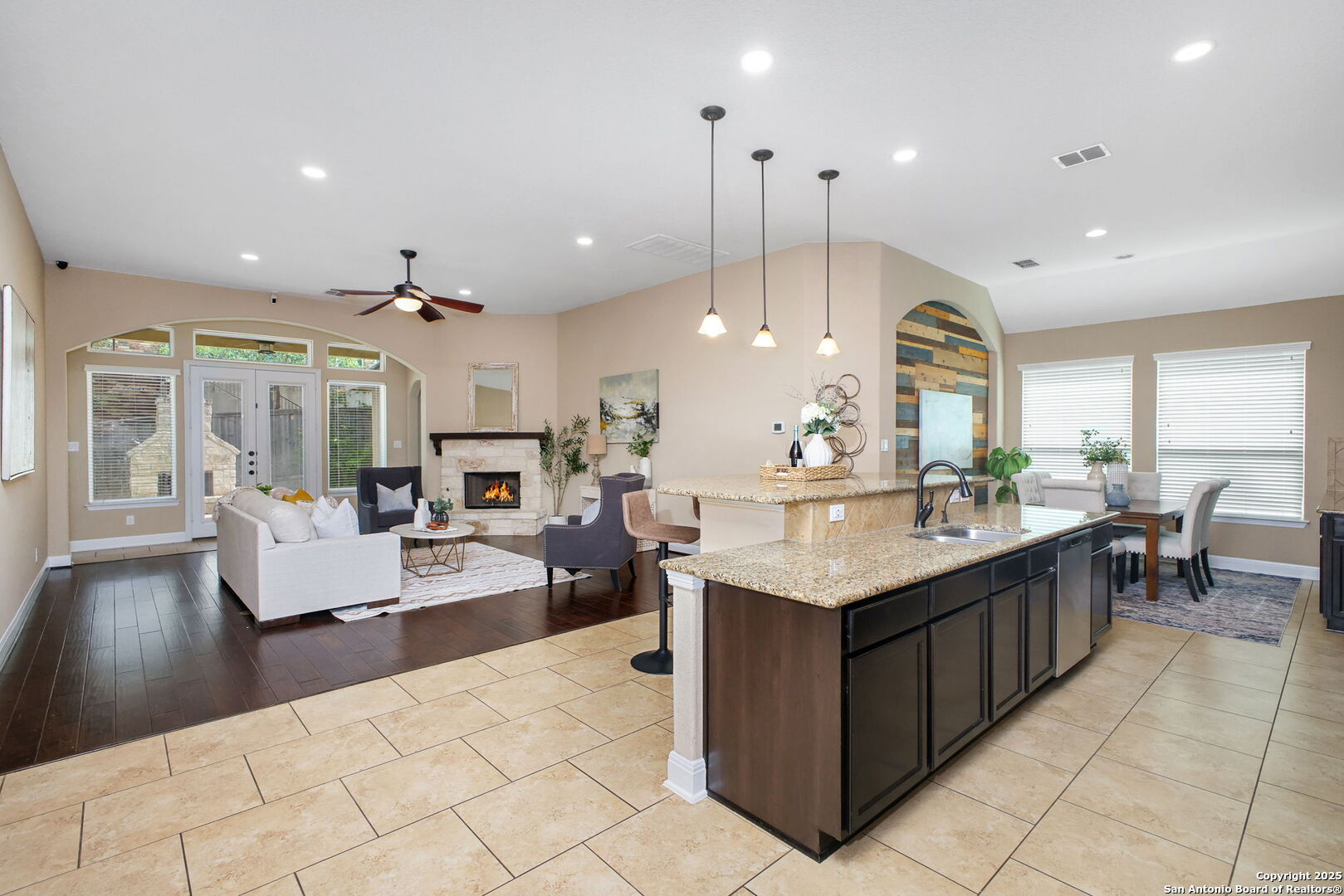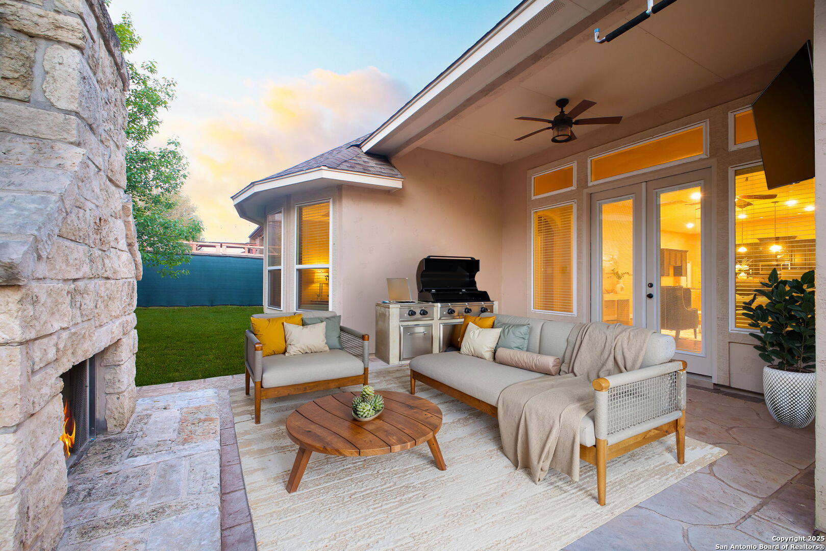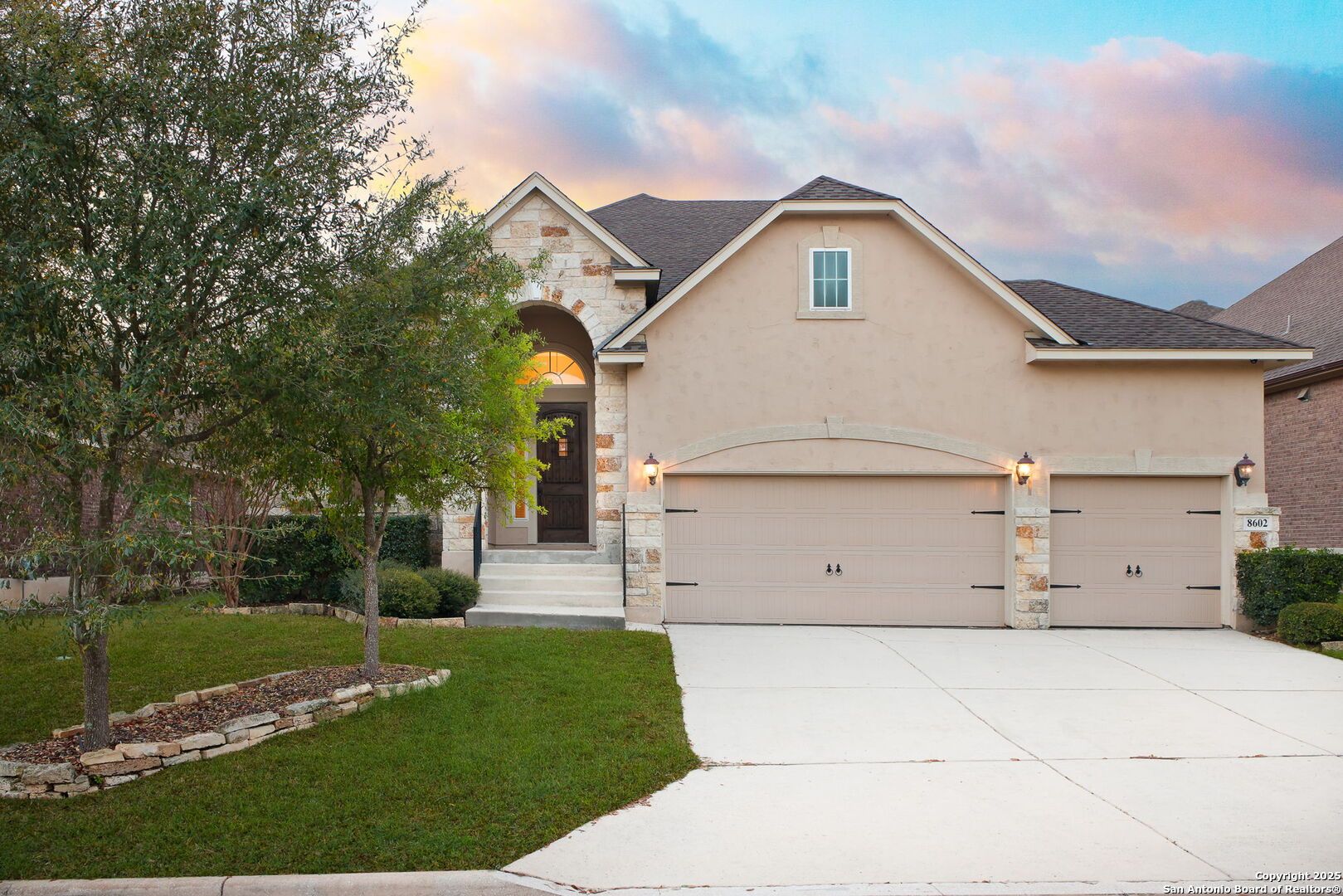 Welcome to this exquisite home, perfectly situated in the picturesque city of Boerne, Texas. Spanning 3,182 square feet of elegant living space, this property offers 5 bedrooms and 4 full bathrooms. It features two generously sized master suite bedrooms, one could serve as a guest room, student suite, or even a game/media room, perfect for a variety of lifestyles. The home is also complemented by high ceilings throughout including the garage. The open-concept design seamlessly connects the spacious living room, which is flooded with abundant natural light, with it's cozy fireplace, to the chef-inspired kitchen, complete with a large island, breakfast bar, double ovens, spacious walk-in pantry, and plenty of cabinetry. The formal dining room, framed by French double doors, adds an element of sophistication. One of the main suites provides a serene retreat with an upgraded bathroom, a spa-like ensuite, and dual vanities. Recent upgrades include fresh interior and exterior paint. Additional highlights include a private study/office, a spacious 3-car garage, and a beautifully landscaped backyard featuring a covered patio, outdoor fireplace, and ceiling fan, perfect for year-round enjoyment. Blending modern luxury with timeless design, this home is priced to sell at $524,500-$40,400 below its CAD appraised value of $564,900. Don't miss out on this incredible opportunity!