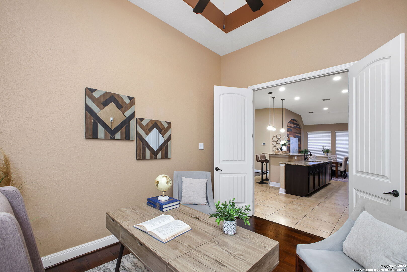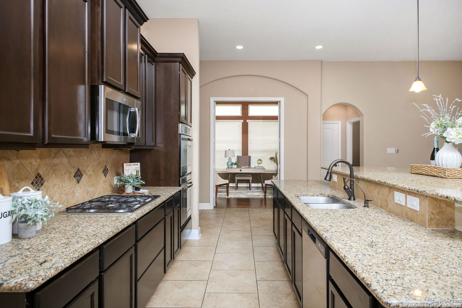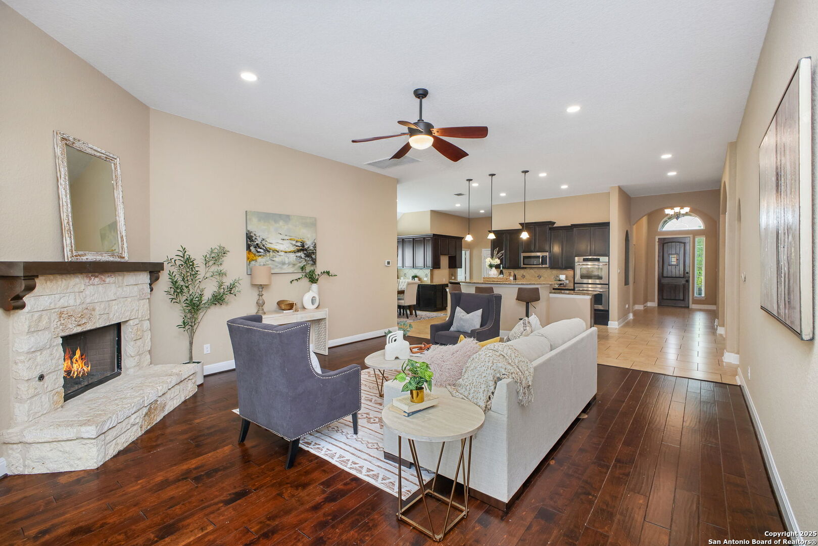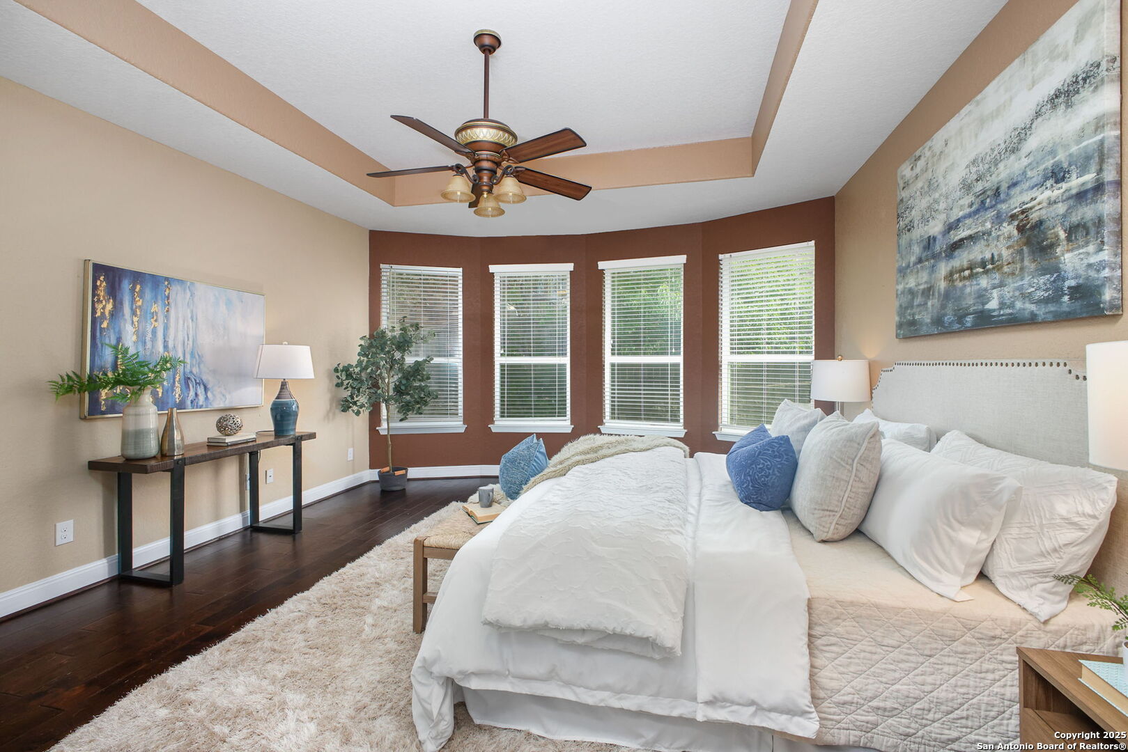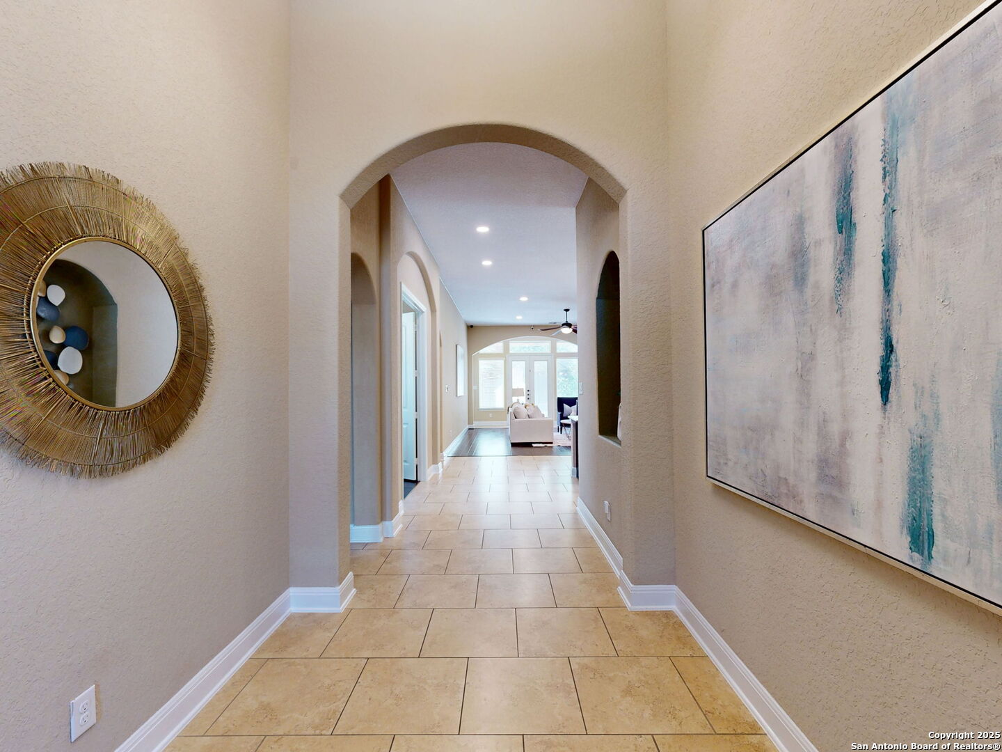Welcome to this exquisite home, perfectly situated in the picturesque city of Boerne, Texas. Spanning 3,182 square feet of elegant living space, this property offers 5 bedrooms and 4 full bathrooms. It features two generously sized master suite bedrooms, one could serve as a guest room, student suite, or even a game/media room, perfect for a variety of lifestyles. The home is also complemented by high ceilings throughout including the garage. The open-concept design seamlessly connects the spacious living room, which is flooded with abundant natural light, with it's cozy fireplace, to the chef-inspired kitchen, complete with a large island, breakfast bar, double ovens, spacious walk-in pantry, and plenty of cabinetry. The formal dining room, framed by French double doors, adds an element of sophistication. One of the main suites provides a serene retreat with an upgraded bathroom, a spa-like ensuite, and dual vanities. Recent upgrades include fresh interior and exterior paint. Additional highlights include a private study/office, a spacious 3-car garage, and a beautifully landscaped backyard featuring a covered patio, outdoor fireplace, and ceiling fan, perfect for year-round enjoyment. Blending modern luxury with timeless design, this home is priced to sell at $524,500-$40,400 below its CAD appraised value of $564,900. Don't miss out on this incredible opportunity!