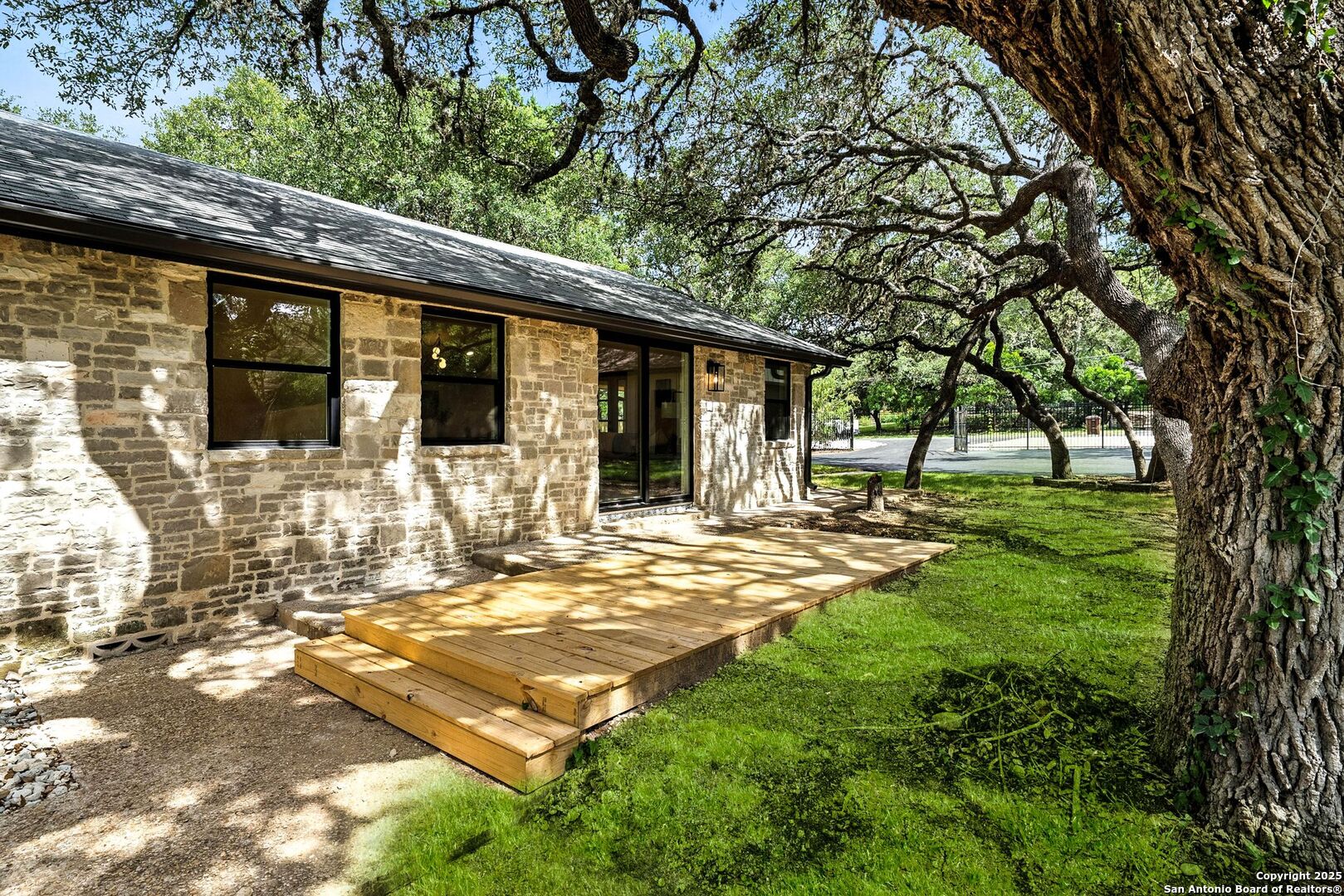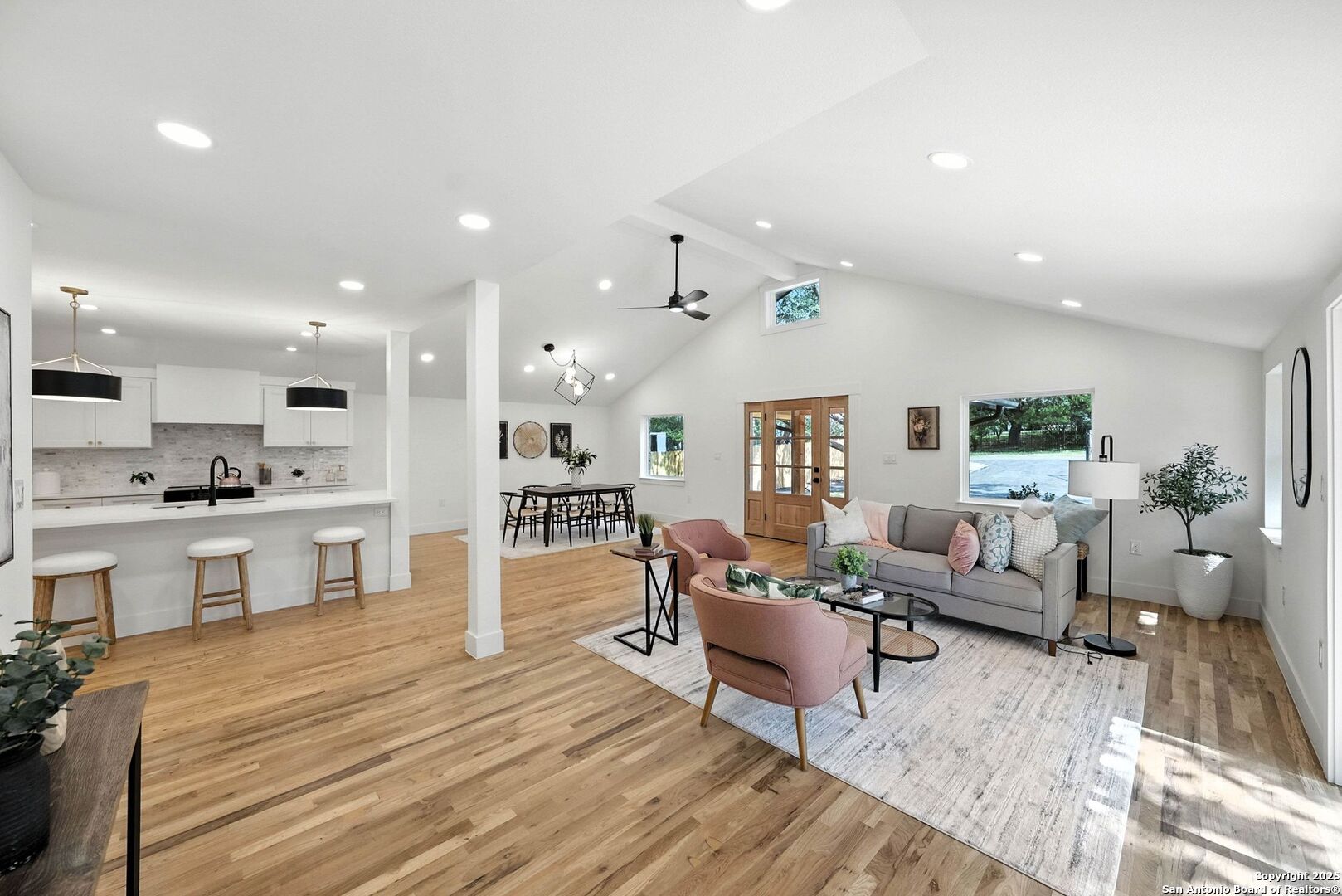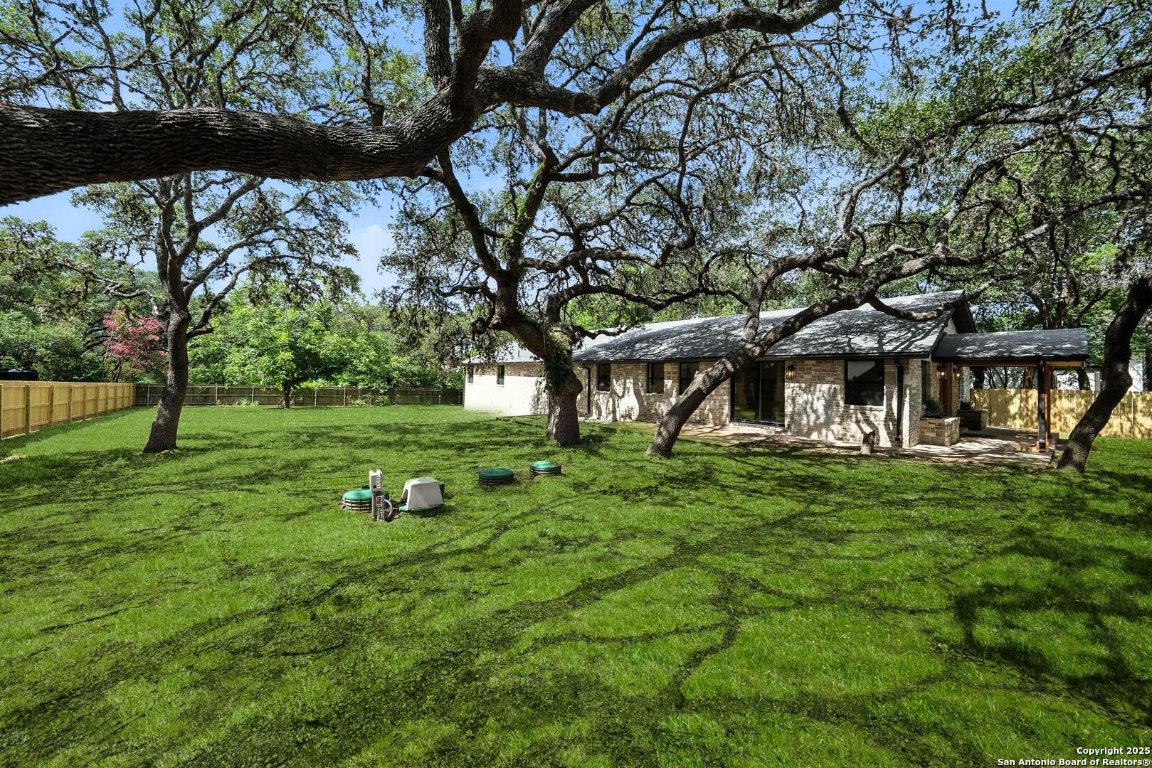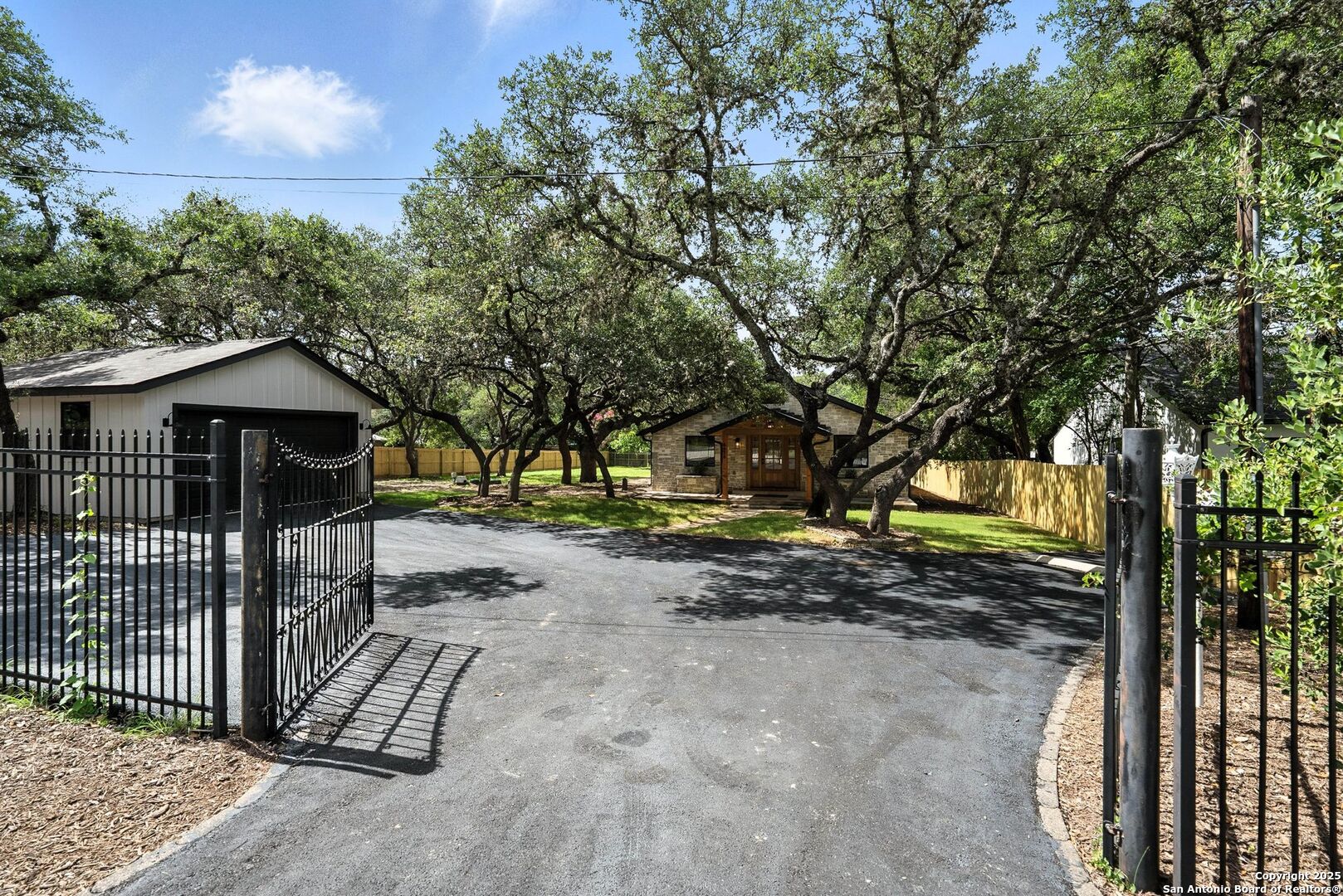 Featuring a beautiful fully remodeled home, seamlessly blending modern upgrades with the original charm and warmth of restored hardwood floors. This home is nestled in the established community of Indian Hills, with no HOA, between San Antonio and Boerne. Spanning .46 acres, this home boasts 3 bedrooms, 3 full bathrooms, 1 half bathroom, and a private study/flex room. This residence offers a one level floor plan tailored for entertaining and everyday living. Upon entry, you're greeted by vaulted ceilings, an inviting open layout of the living room and formal dining. The kitchen features quartz countertops, modern white and black cabinetry, all new stainless-steel appliances, a walk-in pantry and breakfast nook area. The primary suite is a true retreat, featuring a large walk-in shower, dual vanities, and a walk-in closet. There is a guest suite with a full bathroom, all details finished with exceptional craftsmanship and style. Enjoy peace of mind and efficiency with a brand-new A/C, private septic, and water well. The exterior of the home features a detached 2-car garage, large asphalt driveway for additional parking, and fully gated lot with surrounding mature oak trees offering both beauty and privacy. Conveniently located within minutes of Boerne, La Cantera, The Rim, fine dining, and the Medical Center.