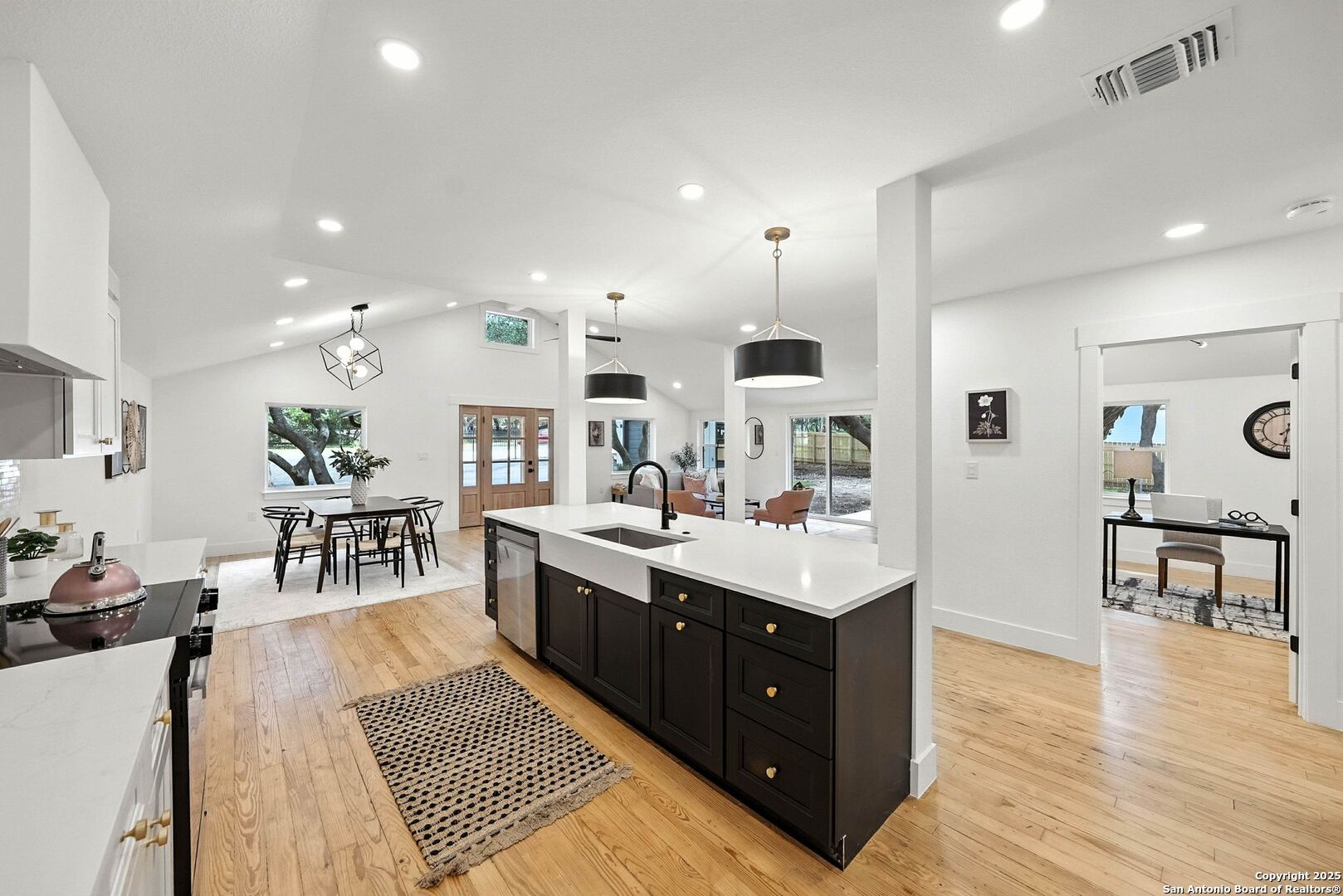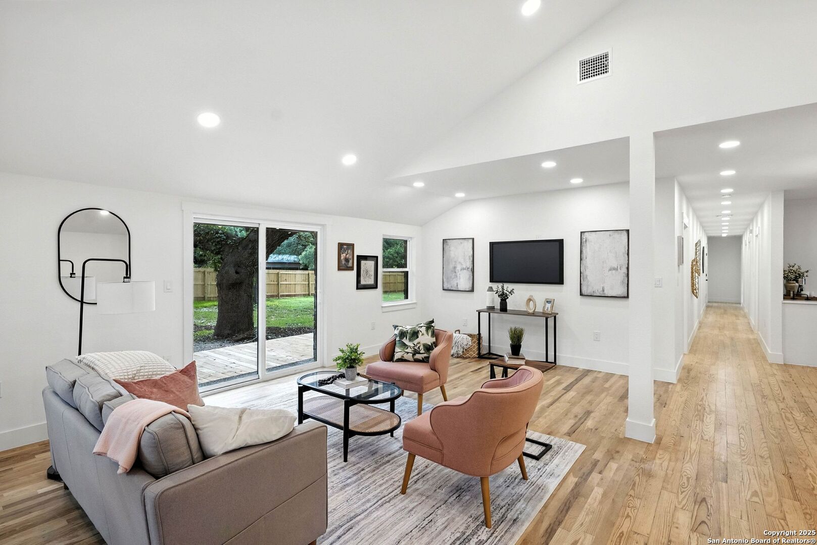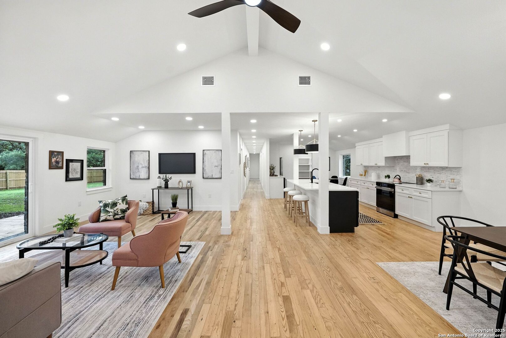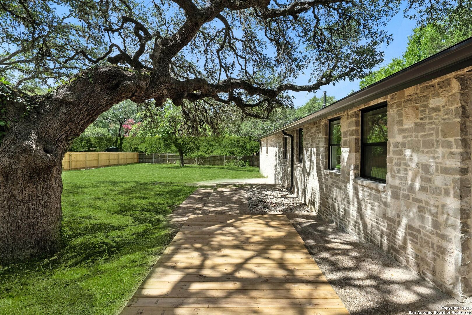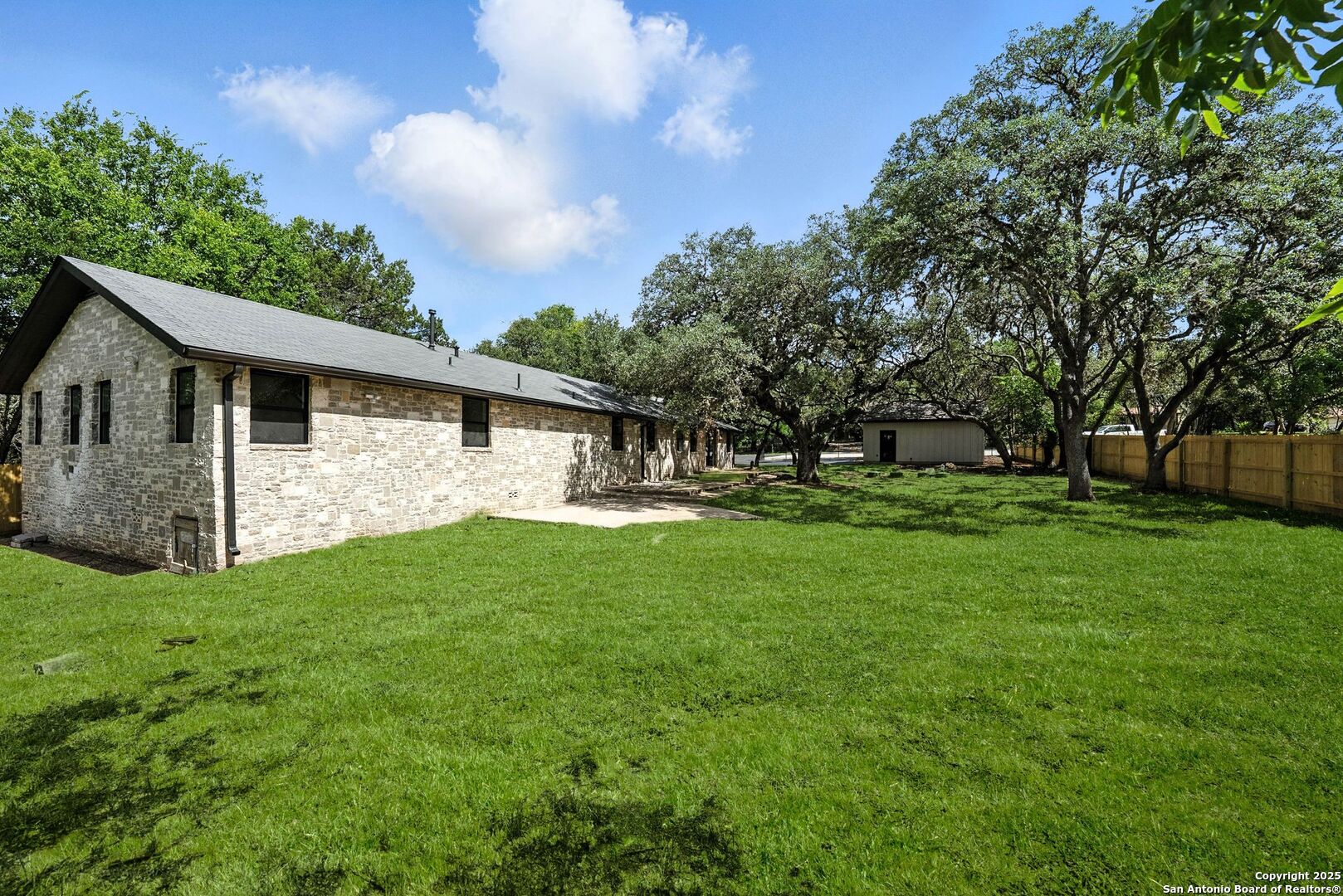 Featuring a beautiful fully remodeled home, seamlessly blending modern upgrades with the original charm and warmth of restored hardwood floors. This home is nestled in the established community of Indian Hills, with no HOA, between San Antonio and Boerne. Spanning .46 acres, this home boasts 3 bedrooms, 3 full bathrooms, 1 half bathroom, and a private study/flex room. This residence offers a one level floor plan tailored for entertaining and everyday living. Upon entry, you're greeted by vaulted ceilings, an inviting open layout of the living room and formal dining. The kitchen features quartz countertops, modern white and black cabinetry, all new stainless-steel appliances, a walk-in pantry and breakfast nook area. The primary suite is a true retreat, featuring a large walk-in shower, dual vanities, and a walk-in closet. There is a guest suite with a full bathroom, all details finished with exceptional craftsmanship and style. Enjoy peace of mind and efficiency with a brand-new A/C, private septic, and water well. The exterior of the home features a detached 2-car garage, large asphalt driveway for additional parking, and fully gated lot with surrounding mature oak trees offering both beauty and privacy. Conveniently located within minutes of Boerne, La Cantera, The Rim, fine dining, and the Medical Center.
