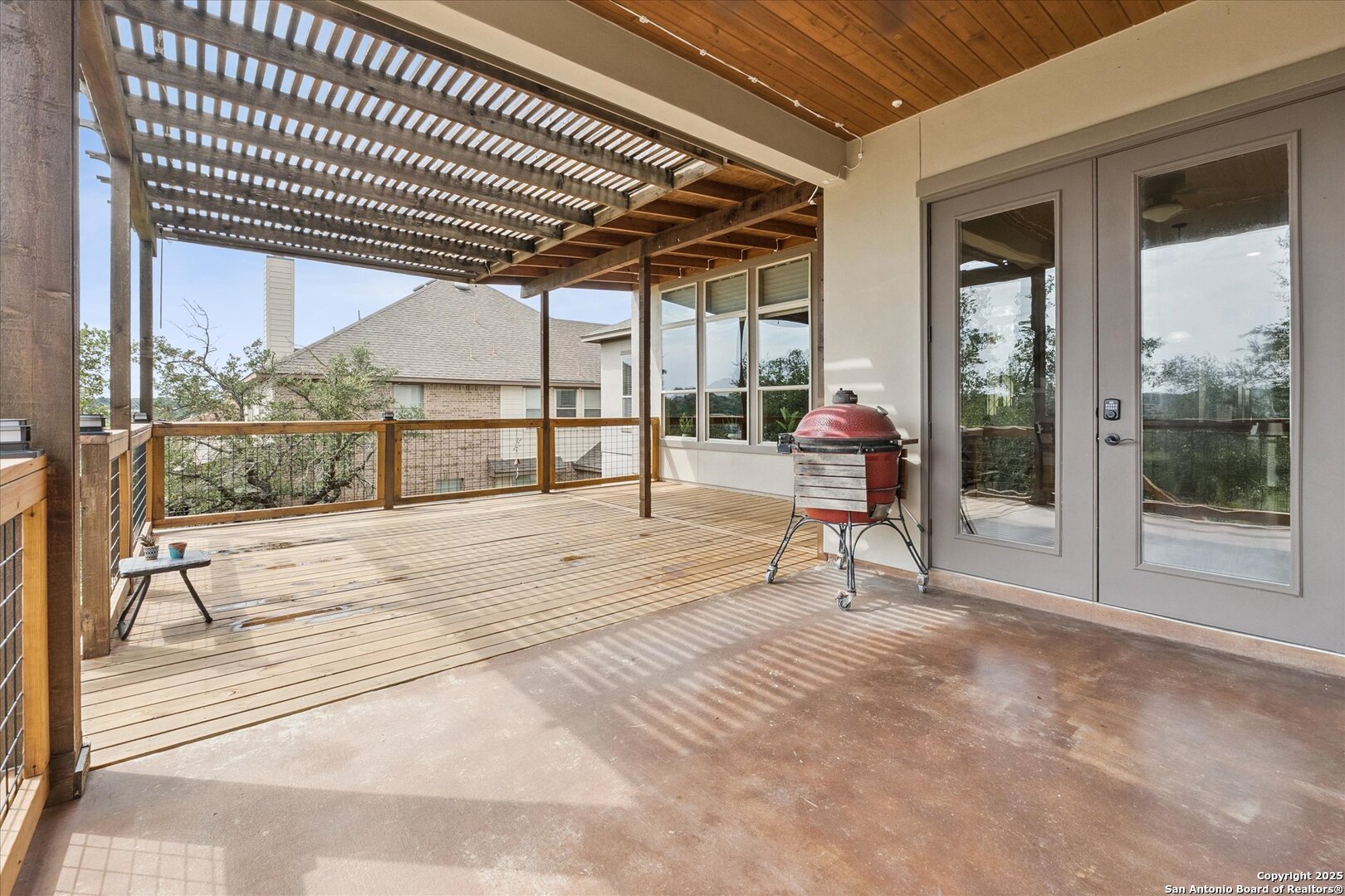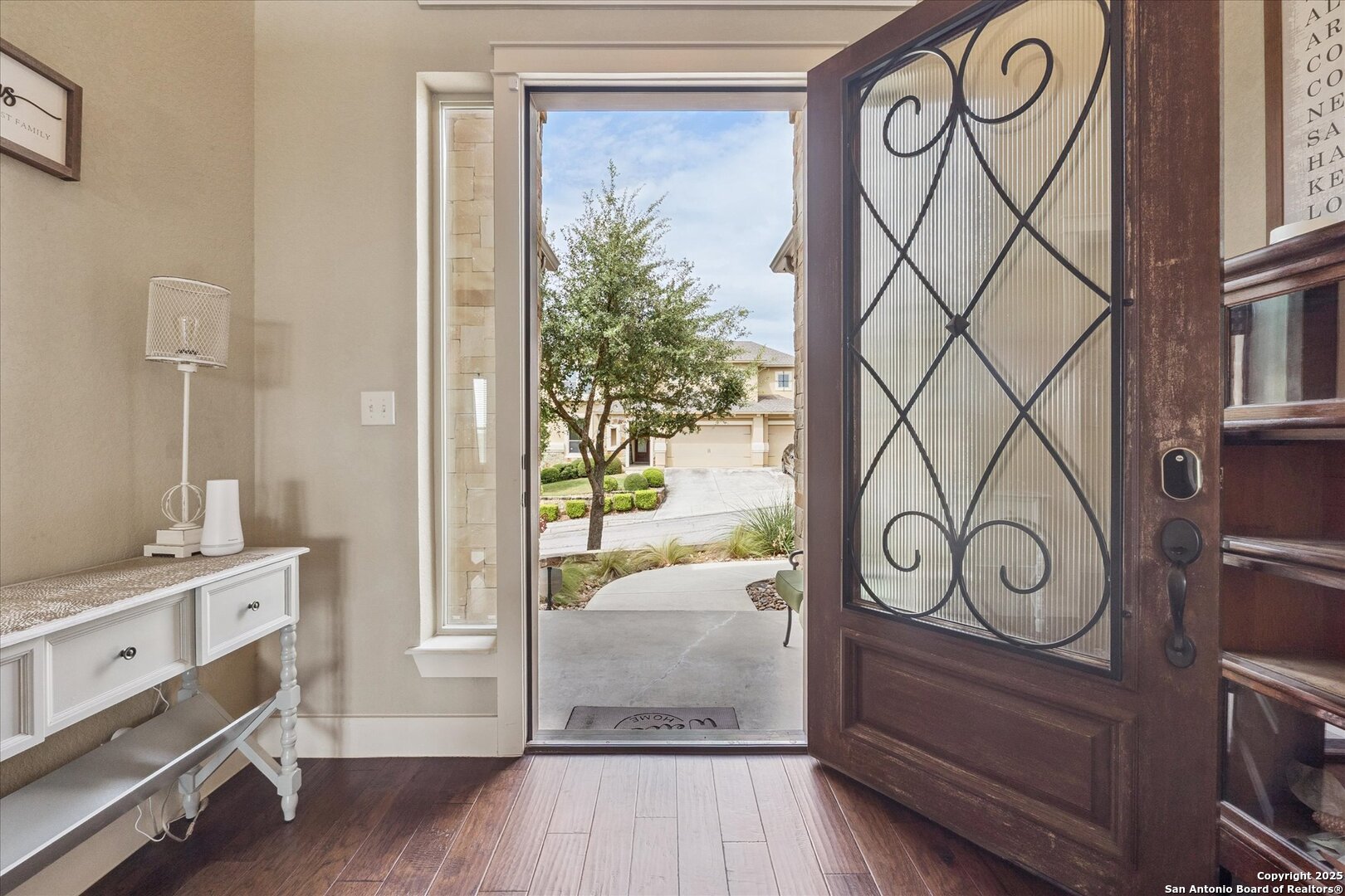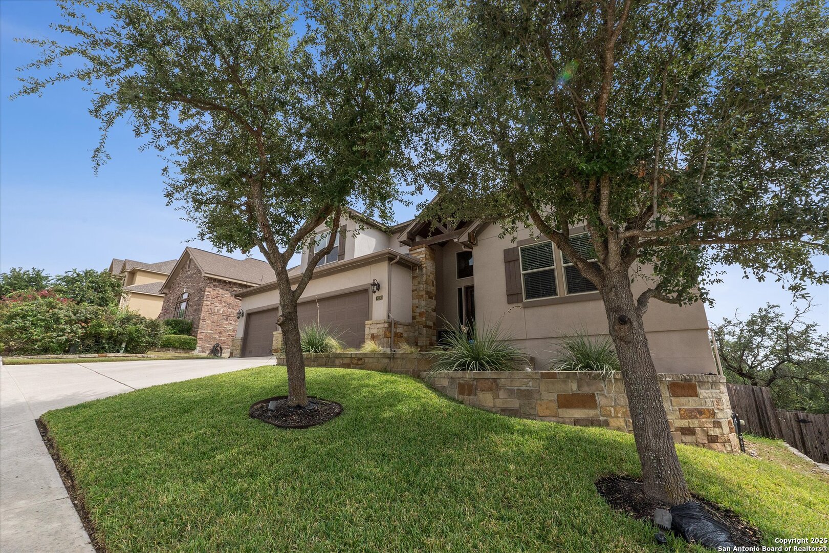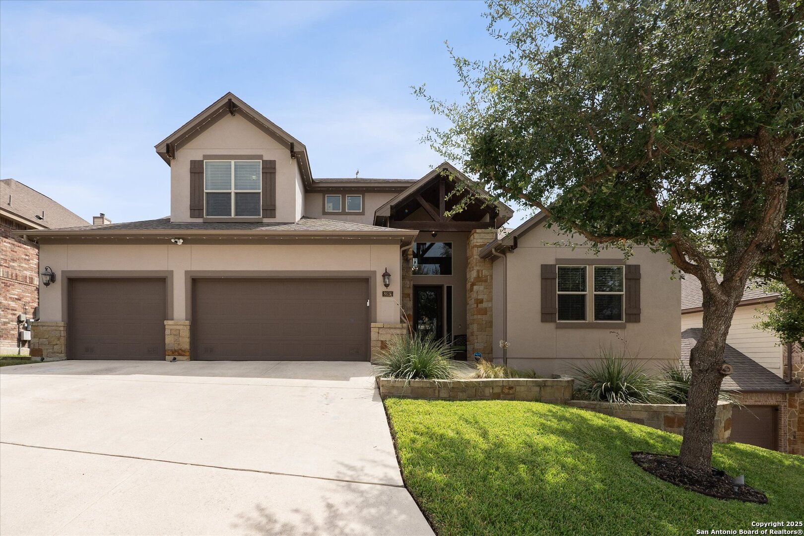 Welcome to this stunning 4-bedroom, 3.5-bath custom home in the coveted gated community of Napa Oaks, set on a private greenbelt lot with sweeping Hill Country views. Built in 2011 by K. Thompson and spanning 3,818 sq. ft., this residence combines timeless craftsmanship with modern upgrades. From the elegant stone-and-stucco exterior to the rare 3-car garage, every detail was thoughtfully designed. Inside, you'll find 8' doors, wood and tile flooring, and custom Kent Moore cabinetry throughout. The gourmet kitchen is a chef's dream, featuring granite countertops, stainless steel appliances, double ovens, and a large island that makes entertaining a breeze. The main-level primary suite is a true retreat with a spa-like bath and a recently remodeled, boutique-style walk-in closet. Upstairs, a spacious bonus room and separate craft room provide endless options-ideal for a game room, home office, or studio. Enjoy seamless indoor-outdoor living with a rebuilt deck overlooking the greenbelt, or take advantage of gated access to the neighborhood pool just steps away. Perfectly located minutes from I-10, La Cantera, The Rim, and top-rated Boerne ISD schools, this home offers the best of Hill Country serenity with city convenience.