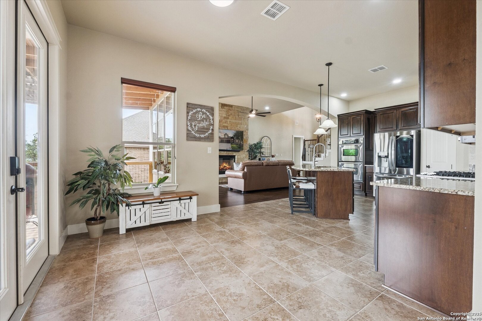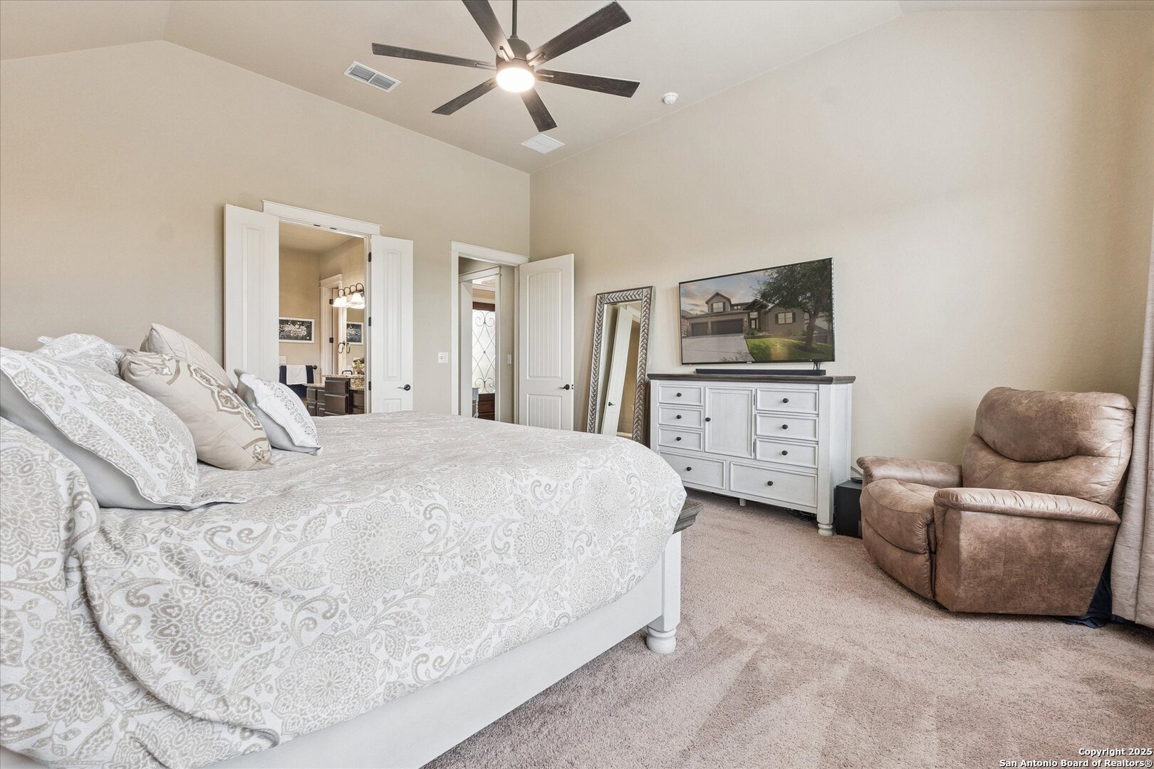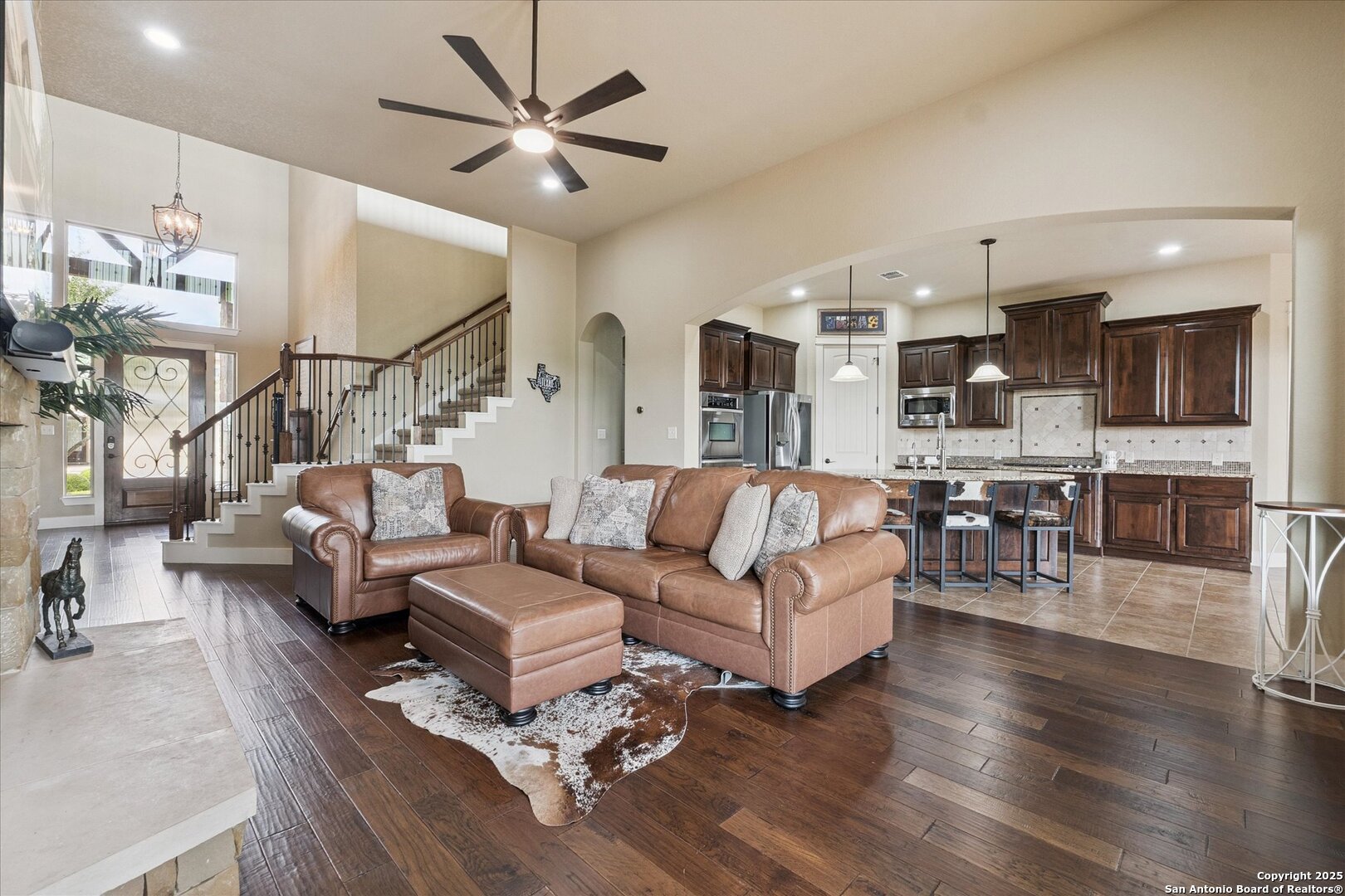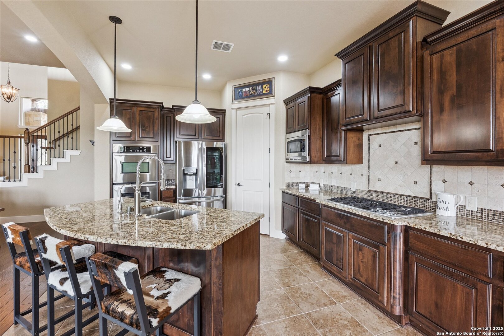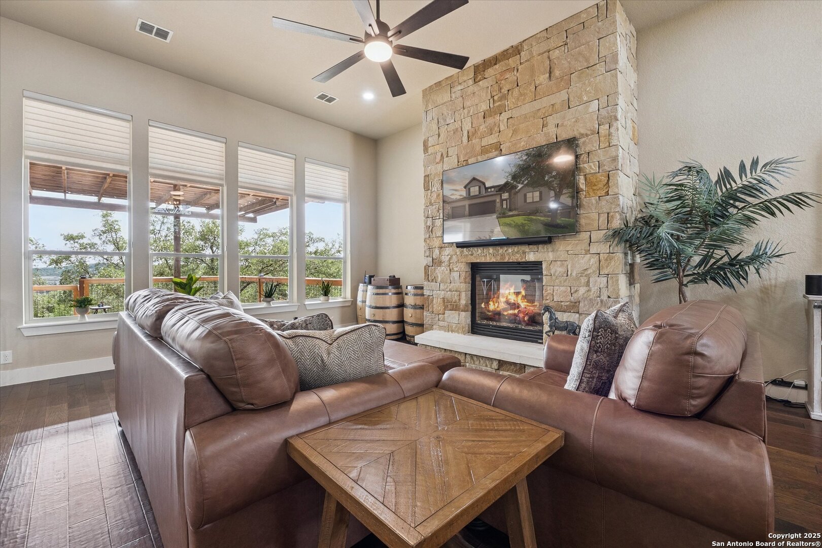 Welcome to this stunning 4-bedroom, 3.5-bath custom home in the coveted gated community of Napa Oaks, set on a private greenbelt lot with sweeping Hill Country views. Built in 2011 by K. Thompson and spanning 3,818 sq. ft., this residence combines timeless craftsmanship with modern upgrades. From the elegant stone-and-stucco exterior to the rare 3-car garage, every detail was thoughtfully designed. Inside, you'll find 8' doors, wood and tile flooring, and custom Kent Moore cabinetry throughout. The gourmet kitchen is a chef's dream, featuring granite countertops, stainless steel appliances, double ovens, and a large island that makes entertaining a breeze. The main-level primary suite is a true retreat with a spa-like bath and a recently remodeled, boutique-style walk-in closet. Upstairs, a spacious bonus room and separate craft room provide endless options-ideal for a game room, home office, or studio. Enjoy seamless indoor-outdoor living with a rebuilt deck overlooking the greenbelt, or take advantage of gated access to the neighborhood pool just steps away. Perfectly located minutes from I-10, La Cantera, The Rim, and top-rated Boerne ISD schools, this home offers the best of Hill Country serenity with city convenience.