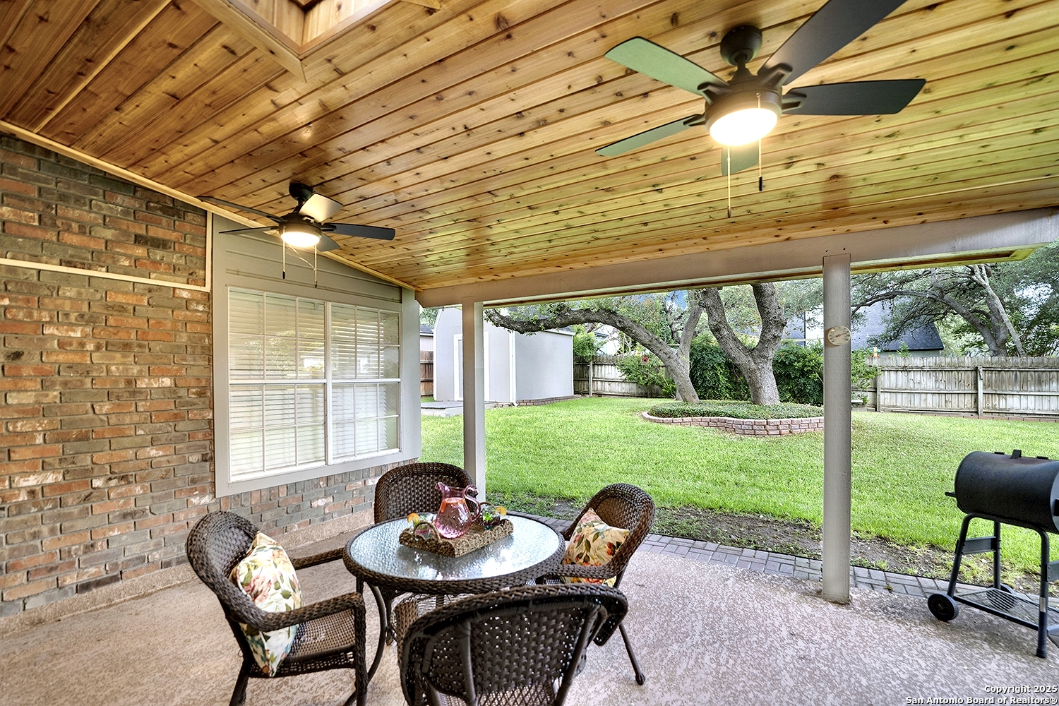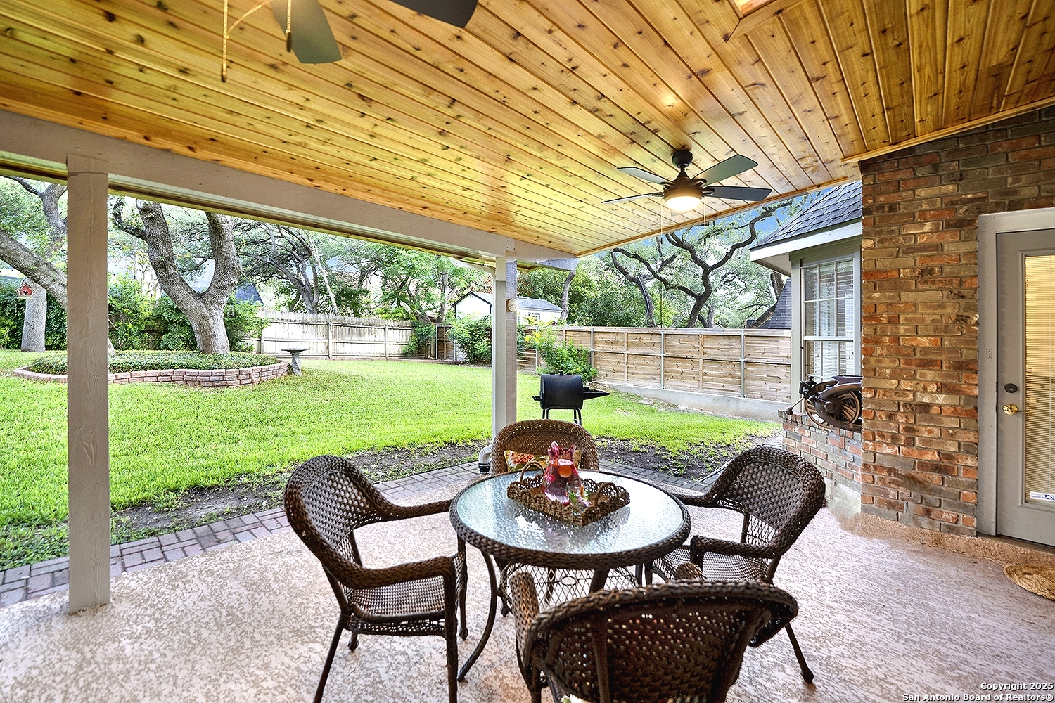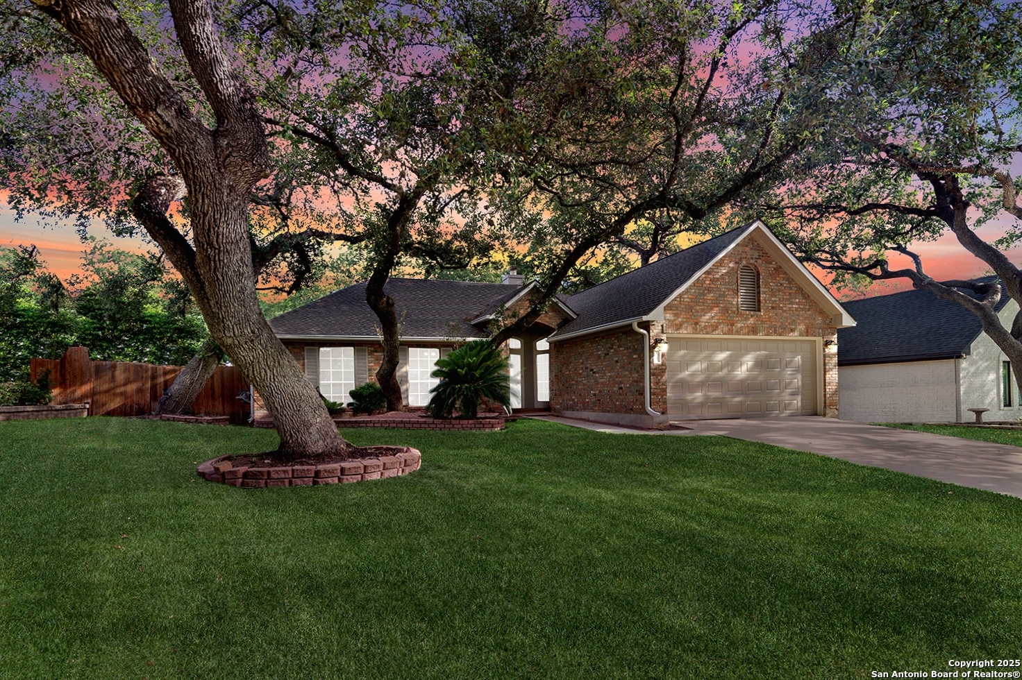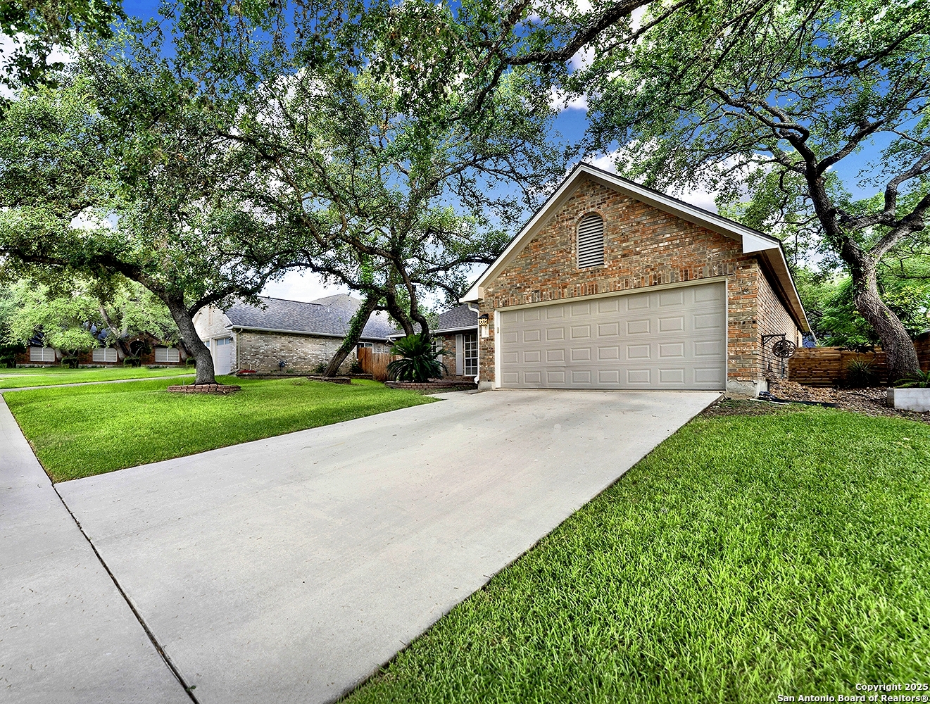 Prepare to fall in love with this immaculate one-story home, featuring four sides brick and perfectly situated on a picturesque cul-de-sac street. As you enter, you'll be greeted by soaring high ceilings that create an airy and inviting atmosphere. This beautiful residence hosts a formal dining area, a large open living room with picture windows that fill the space with natural light, and crown molding that adds an elegant touch. The updated kitchen is a chef's delight, featuring granite counters and custom cabinets designed for optimal storage and practicality. The split master bedroom floor plan offers privacy and comfort, with the spacious master bedroom providing outside access to the serene private covered patio-perfect for enjoying the park-like scenery. The master bath has been updated to include an oversized spa-like walk-in shower, creating a luxurious retreat. Step outside to discover your own private oasis! The covered patio, adorned with a stunning tongue and groove cedar ceiling, skylight, and ceiling fans, is the ideal setting for both entertaining and relaxation. The beautifully landscaped front and back yards, complete with mature oak trees, enhance the tranquil ambiance. Additional highlights include built-in cabinets in both bathrooms, a cozy gas log fireplace, and a welcoming entry foyer. This home has been truly cared for and maintained, exuding wonderful curb appeal. Brand new hot water heater! Don't miss your chance to own this beautifully appointed home in a delightful neighborhood, ready for you to make it your own!