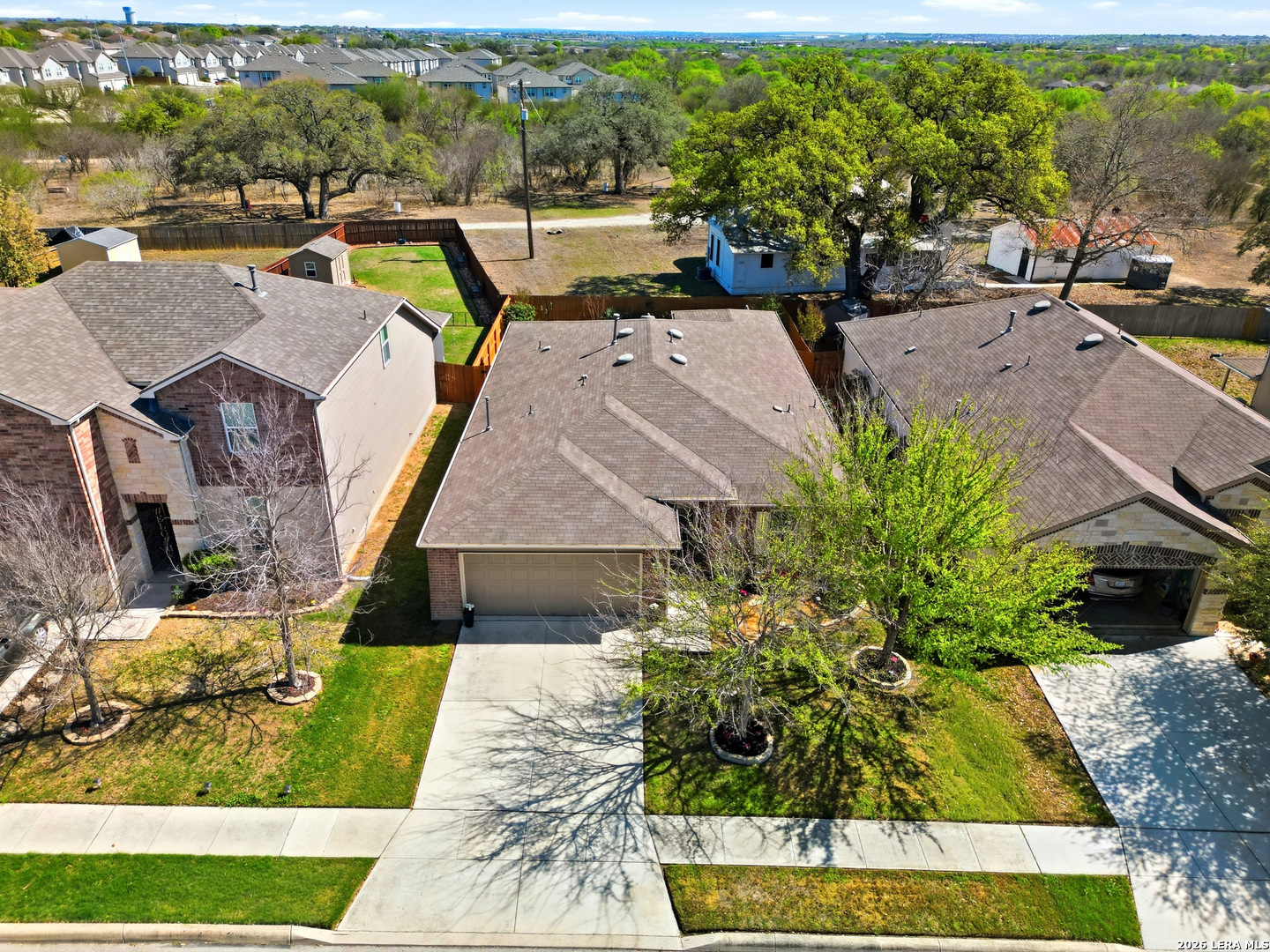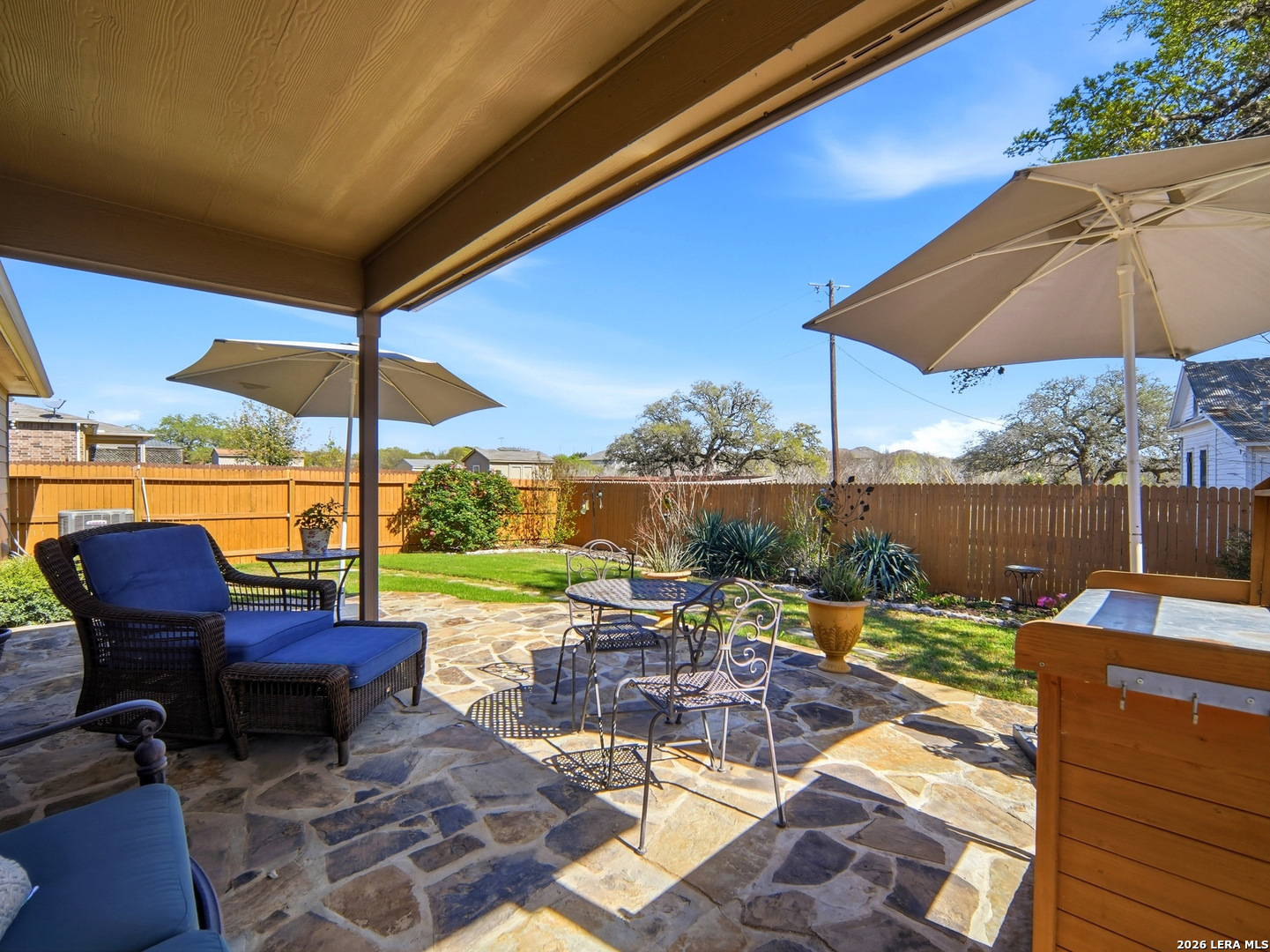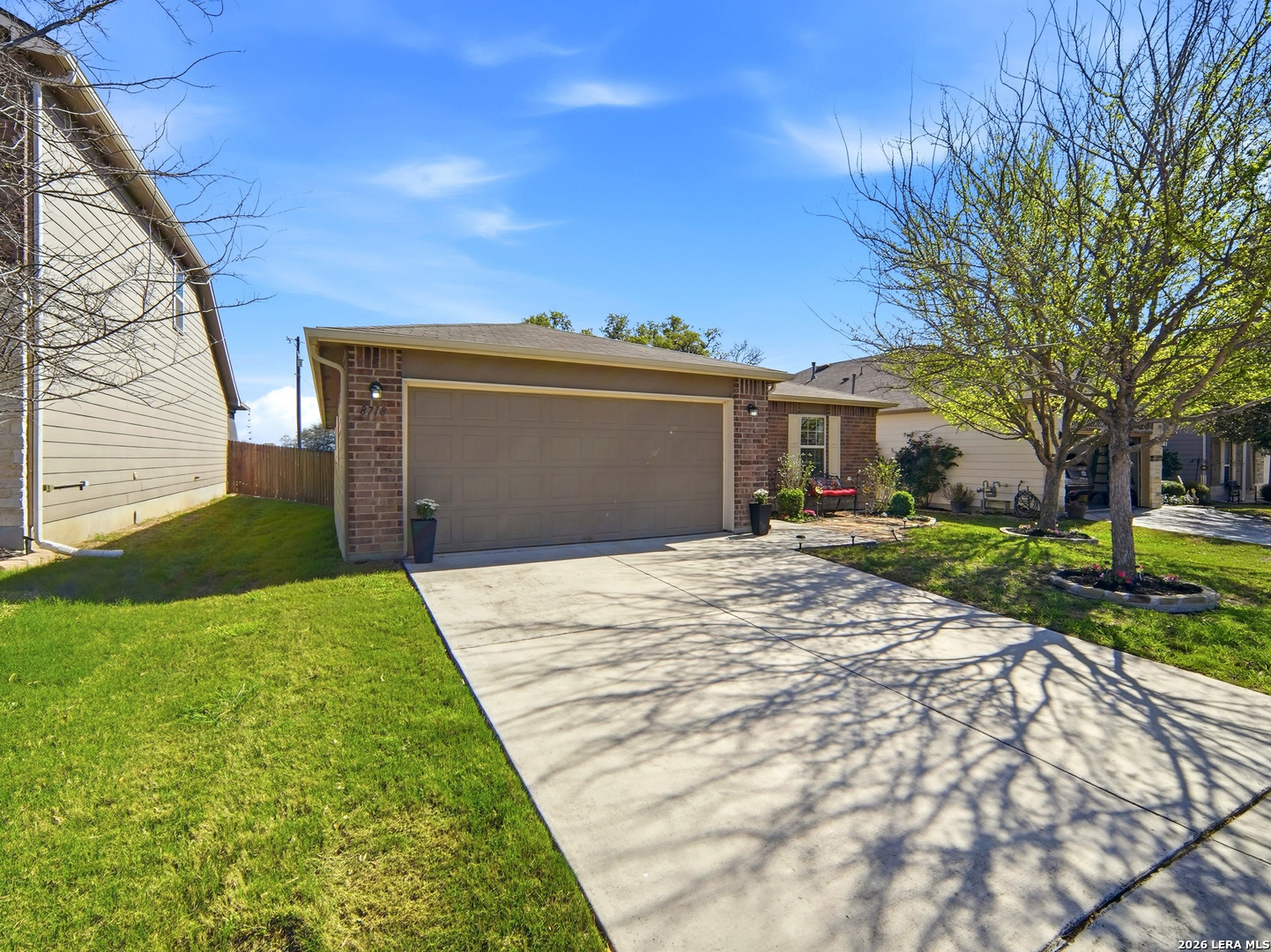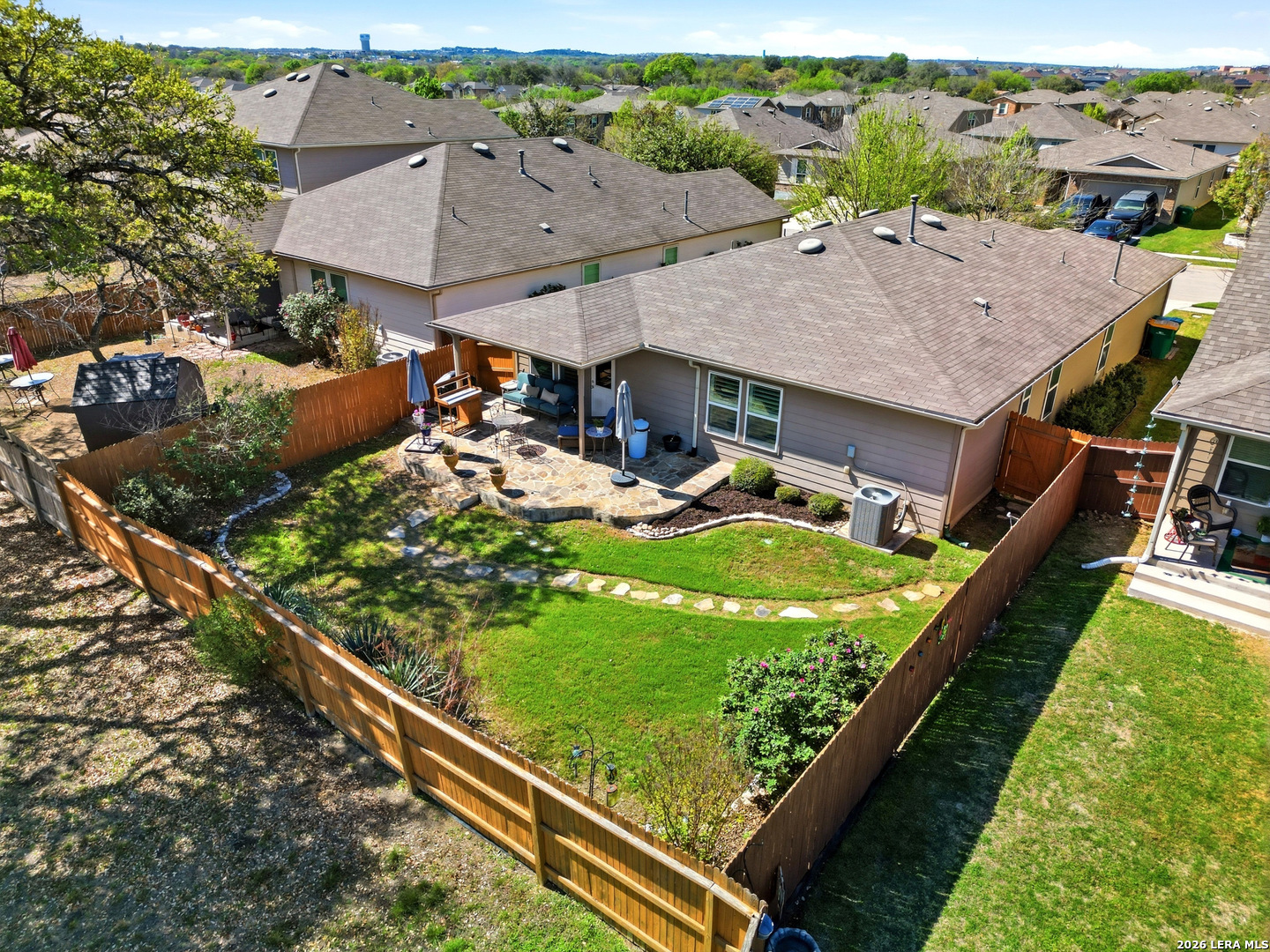Beautifully maintained and thoughtfully upgraded, this inviting Converse home offers comfort, craftsmanship, and a backyard setting that is truly special. An upgraded front entry door immediately elevates the arrival experience, setting the tone for the quality and care found throughout the home. Inside, the open layout allows the living, dining, and kitchen areas to flow naturally together, creating an ideal space for both daily living and entertaining. Gorgeous plantation shutters throughout the home add timeless character while helping keep the interior cool during the warm Texas months. The private owner's suite provides a relaxing retreat and features an upgraded walk-in shower designed with comfort in mind, including a convenient collapsible seat that enhances the overall shower experience. Additional thoughtful features include an owned water softener and reverse osmosis system at the kitchen faucet, providing convenience and enhanced water quality. Outdoors is where this property truly shines. A custom masonry deck, handcrafted with remarkable care by a skilled artisan, anchors the backyard and creates a welcoming space to relax and unwind. With Scheel Farm positioned directly behind the property, the view offers a rare sense of privacy and open space, providing a peaceful and beautiful backdrop. The next homeowner can enjoy quiet mornings with coffee in their backyard oasis or wind down in the evening with a glass of wine or their favorite beverage under the Texas sky. Conveniently located with easy access to I-35, commuting toward San Antonio is simple, with Randolph Air Force Base, shopping, dining, and everyday conveniences just minutes away. Homes offering this combination of thoughtful upgrades, beautifully crafted outdoor living space, and convenient access to major destinations are not often available. Schedule a private tour to experience everything 8718 Flint Rock Way has to offer.