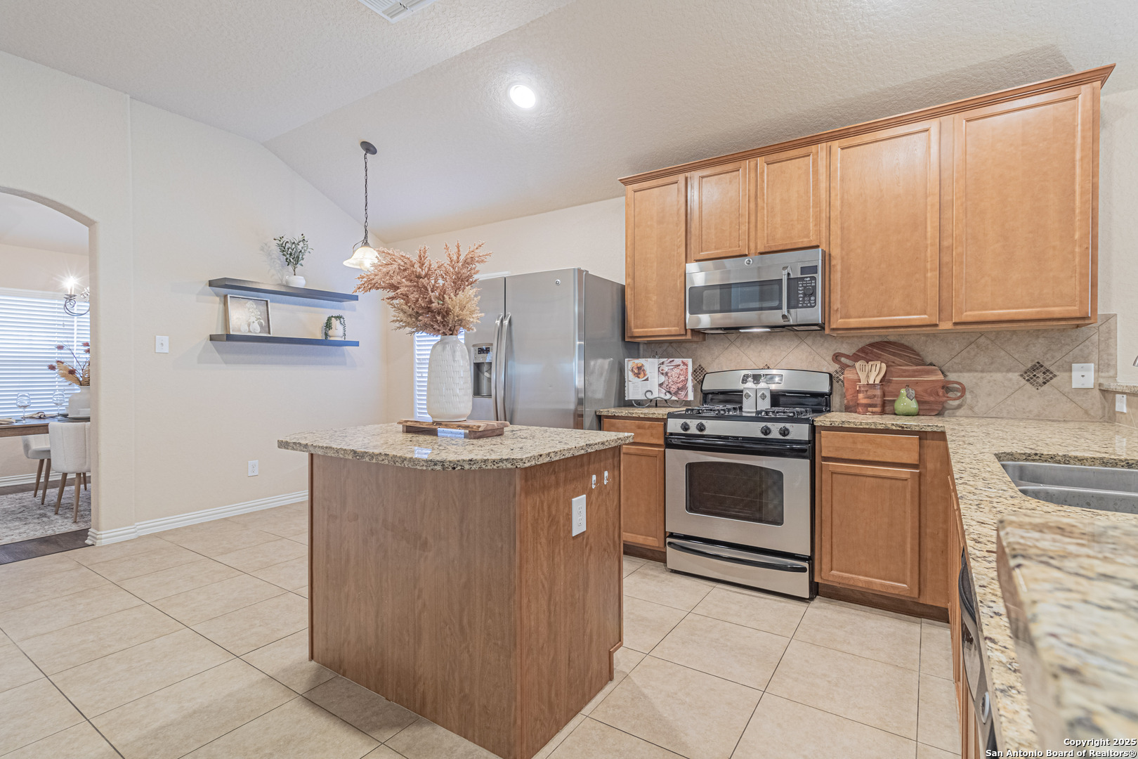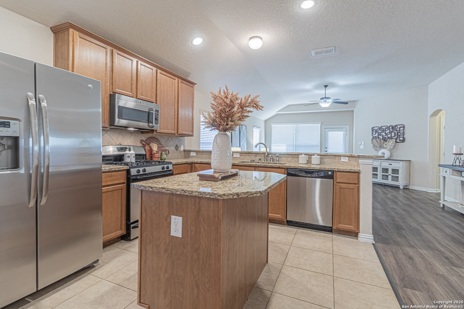 Single-story 3-bedroom, 2-bath home offering 1,925 sq ft of open-concept living in the desirable Estonia subdivision. Built in 2009, this brick-and-stone residence features high ceilings, neutral tones, and a functional floor plan designed for comfort and versatility. The kitchen includes granite countertops, stainless steel appliances, a center island, and ample cabinetry-open to the living area for effortless entertaining. A formal dining room near the entry offers flexibility for dining or office use. The spacious primary suite features dual vanities, a soaking tub, separate walk-in shower, and a large walk-in closet. Two secondary bedrooms share a full bath with modern finishes. Luxury vinyl plank flooring extends through main areas, complemented by ceiling fans and energy-efficient design. Enjoy outdoor living on the covered patio overlooking a fenced backyard. Additional features include a two-car attached garage, gas range and water heater, and a dedicated laundry room with built-in shelving. The Estonia community offers a neighborhood park, playground, and convenient access to shopping, dining, and entertainment. Nearby destinations include H-E-B Plus! (2.2 mi), Alamo Ranch Shopping Center (2.4 mi), Seaworld San Antonio (2.8 mi), and Loop 1604 (approx. 1 mi). Convenient to major employers, Lackland AFB, and northwest medical centers. Move-in ready and well-maintained, this home combines functionality, proximity, and comfort within the sought-after 78251 ZIP code.