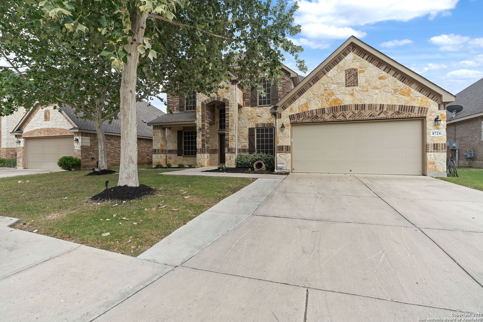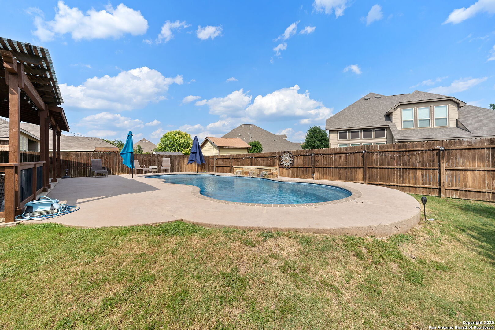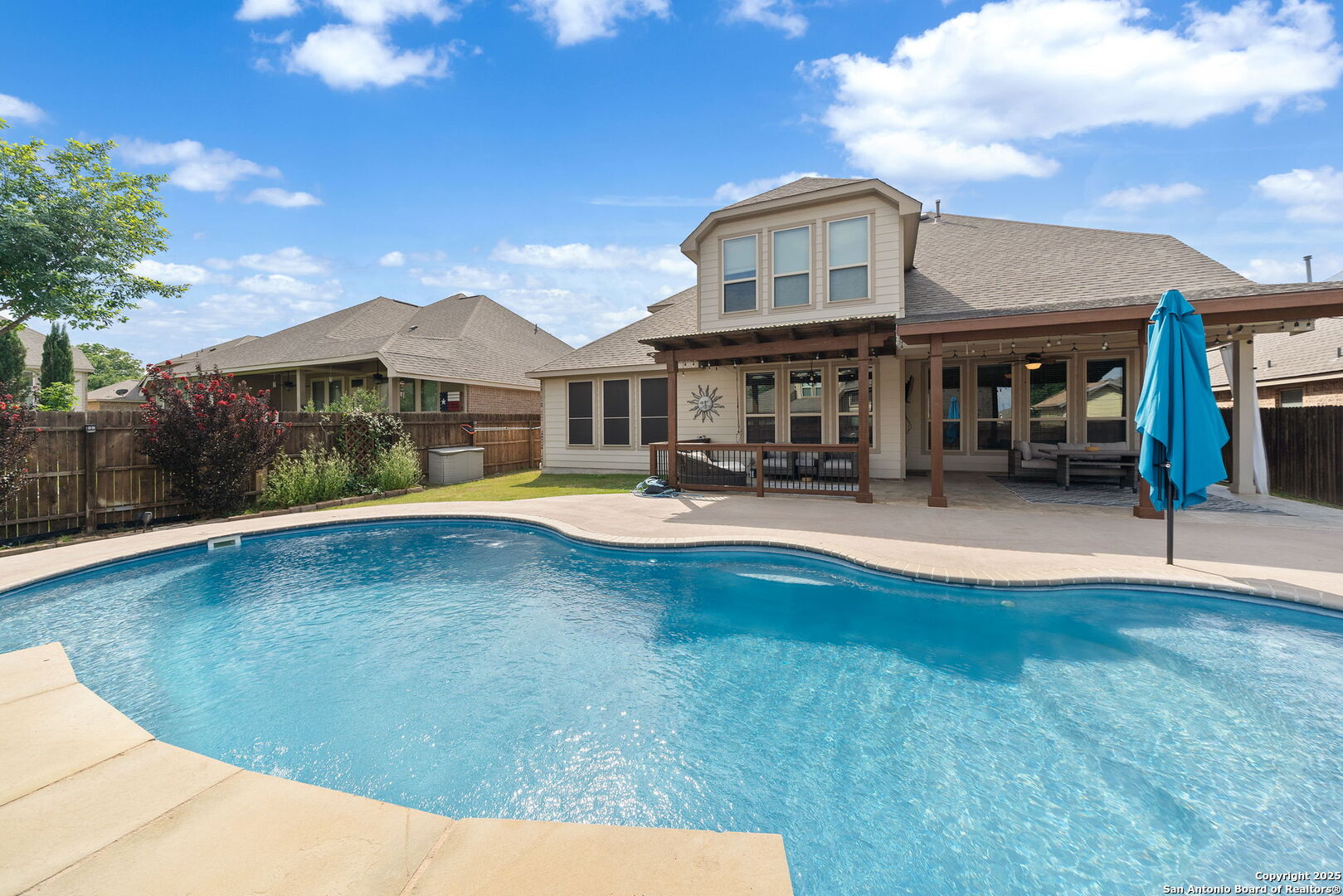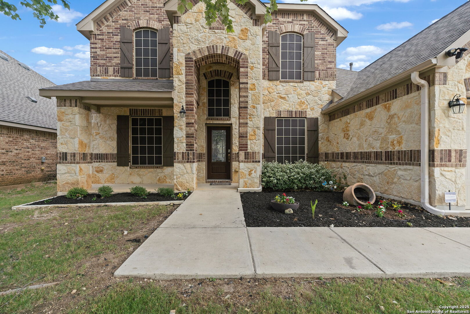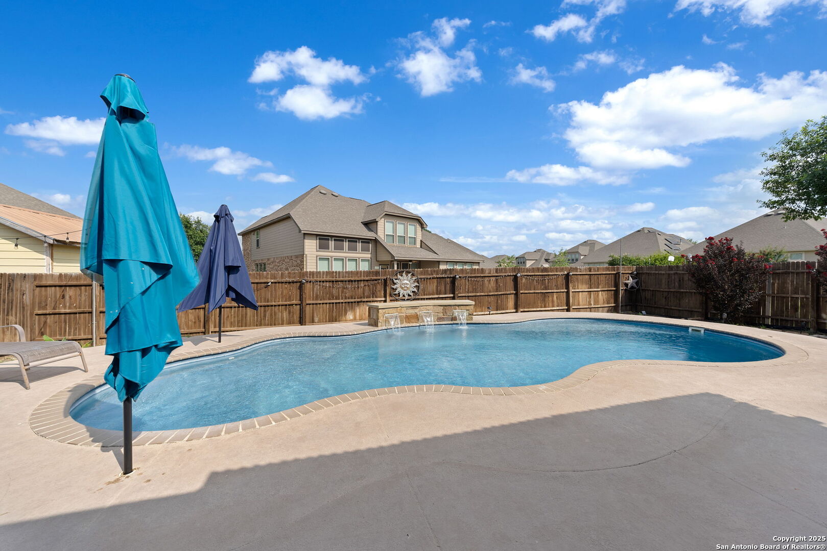 Step into comfort, elegance, and convenience of this beautifully maintained 4-bedroom, 3.5-bath home located in the sought-after Kallison Ranch community of San Antonio. This 2,868 sq ft residence offers elevated design, smart layout, and family-friendly features - all within one of the city's fastest-growing corridors. Enjoy a warm, inviting space with a custom stone backsplash and fireplace as the living room centerpiece. Chef's kitchen featuring granite countertops, 42" cabinetry, gas cooking, and a spacious island for family meals and entertaining. Media room perfect for movie nights, sports viewing, or gaming - your private home theater awaits upstairs. Primary suite downstairs includes double vanities, garden tub, walk-in shower, and a massive closet. Kids hideout: large under-the-stairs closet doubles as a magical nook for kids or clever storage. Enjoy your own resort style retreat with heated in ground pool with waterfall feature, covered patio and pergola and beautiful landscaping! Zoned to John M. Harlan High School, a rising star in Texas athletics! Prime location and exciting growth.