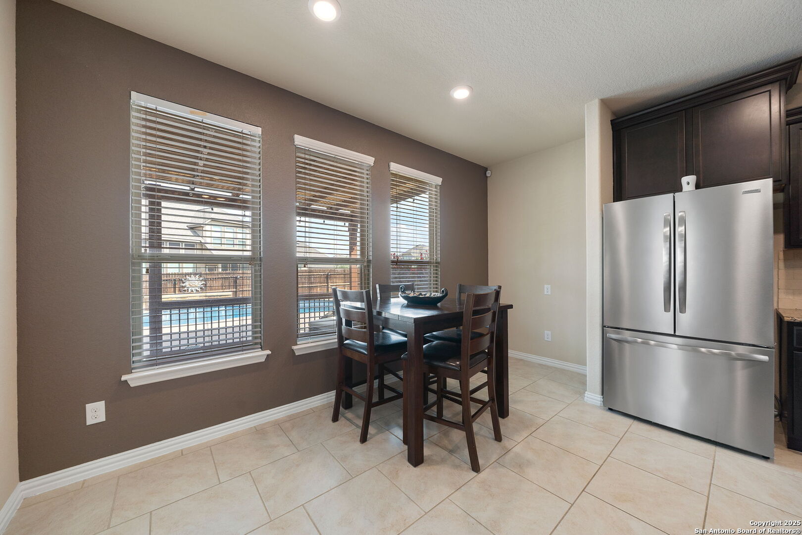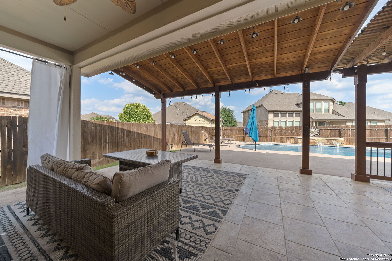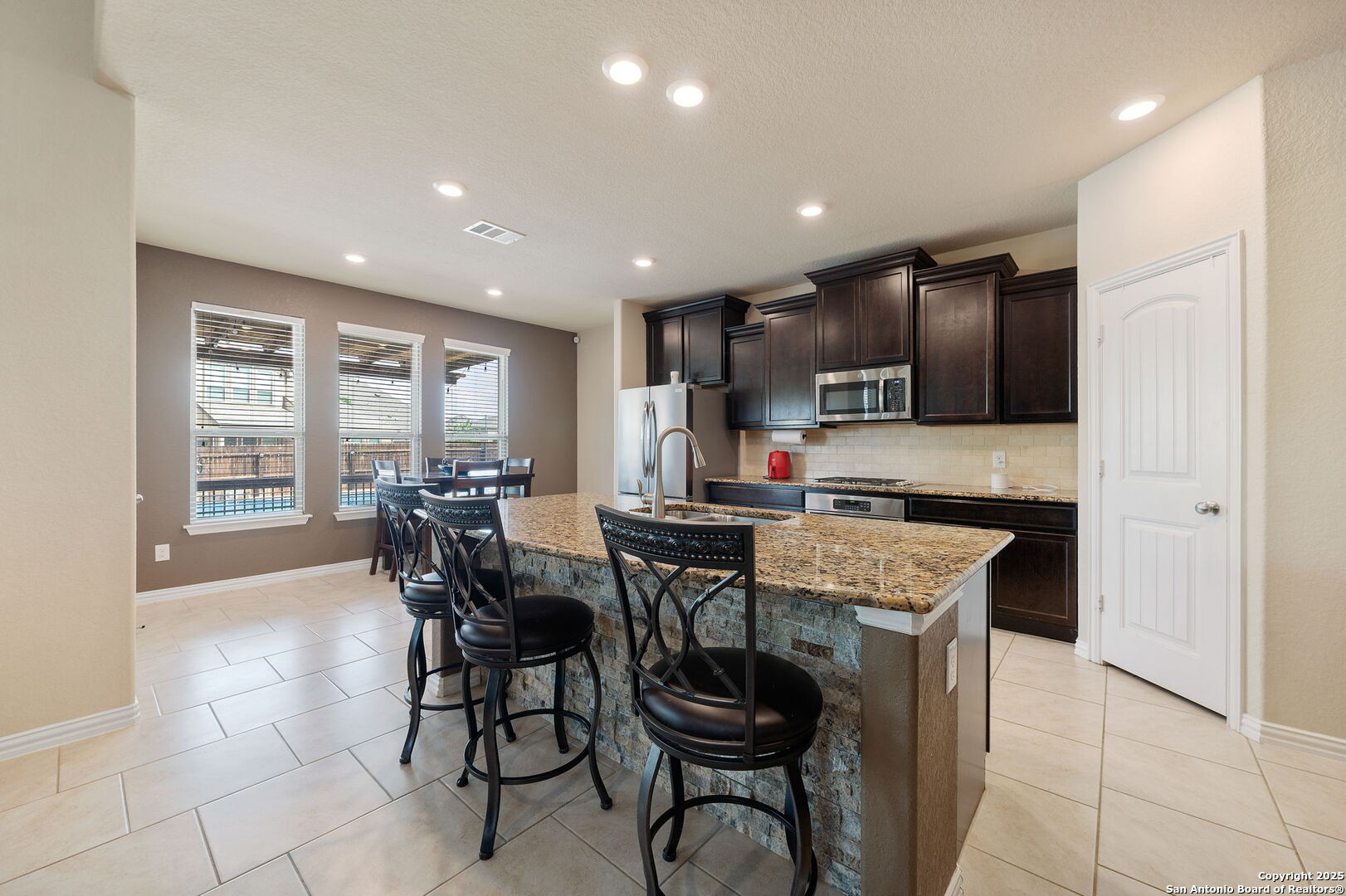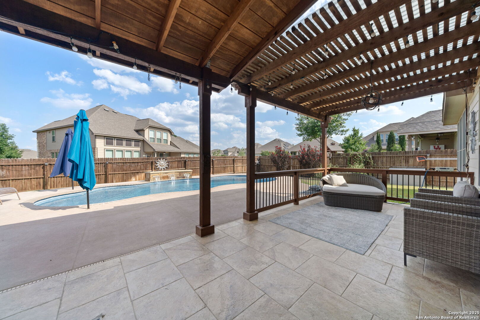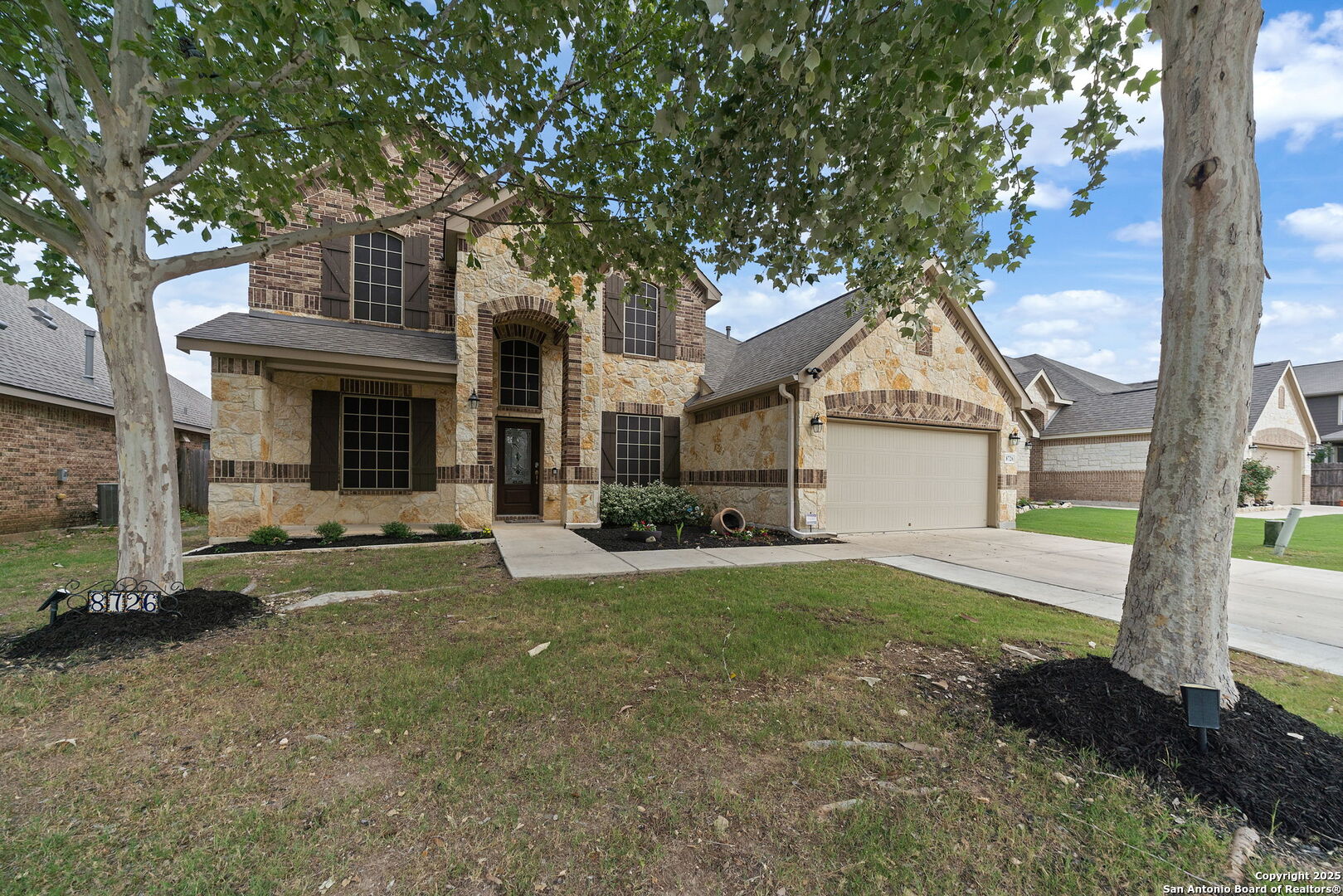 Step into comfort, elegance, and convenience of this beautifully maintained 4-bedroom, 3.5-bath home located in the sought-after Kallison Ranch community of San Antonio. This 2,868 sq ft residence offers elevated design, smart layout, and family-friendly features - all within one of the city's fastest-growing corridors. Enjoy a warm, inviting space with a custom stone backsplash and fireplace as the living room centerpiece. Chef's kitchen featuring granite countertops, 42" cabinetry, gas cooking, and a spacious island for family meals and entertaining. Media room perfect for movie nights, sports viewing, or gaming - your private home theater awaits upstairs. Primary suite downstairs includes double vanities, garden tub, walk-in shower, and a massive closet. Kids hideout: large under-the-stairs closet doubles as a magical nook for kids or clever storage. Enjoy your own resort style retreat with heated in ground pool with waterfall feature, covered patio and pergola and beautiful landscaping! Zoned to John M. Harlan High School, a rising star in Texas athletics! Prime location and exciting growth.