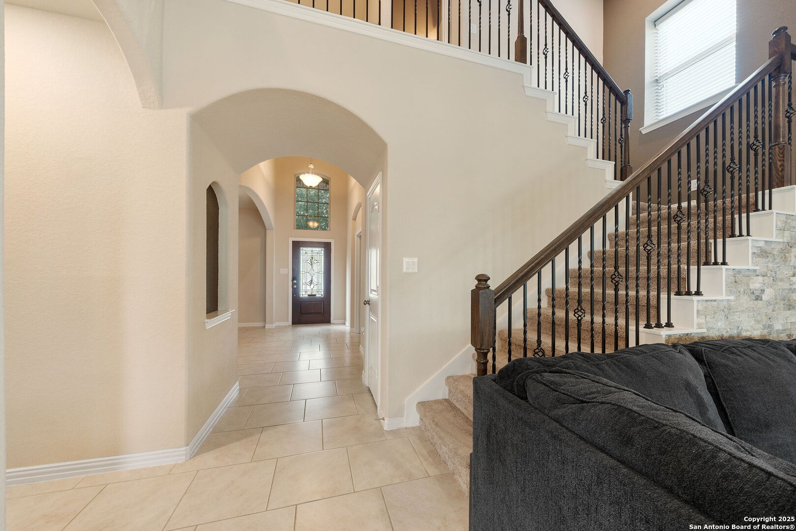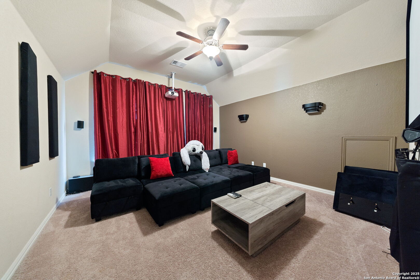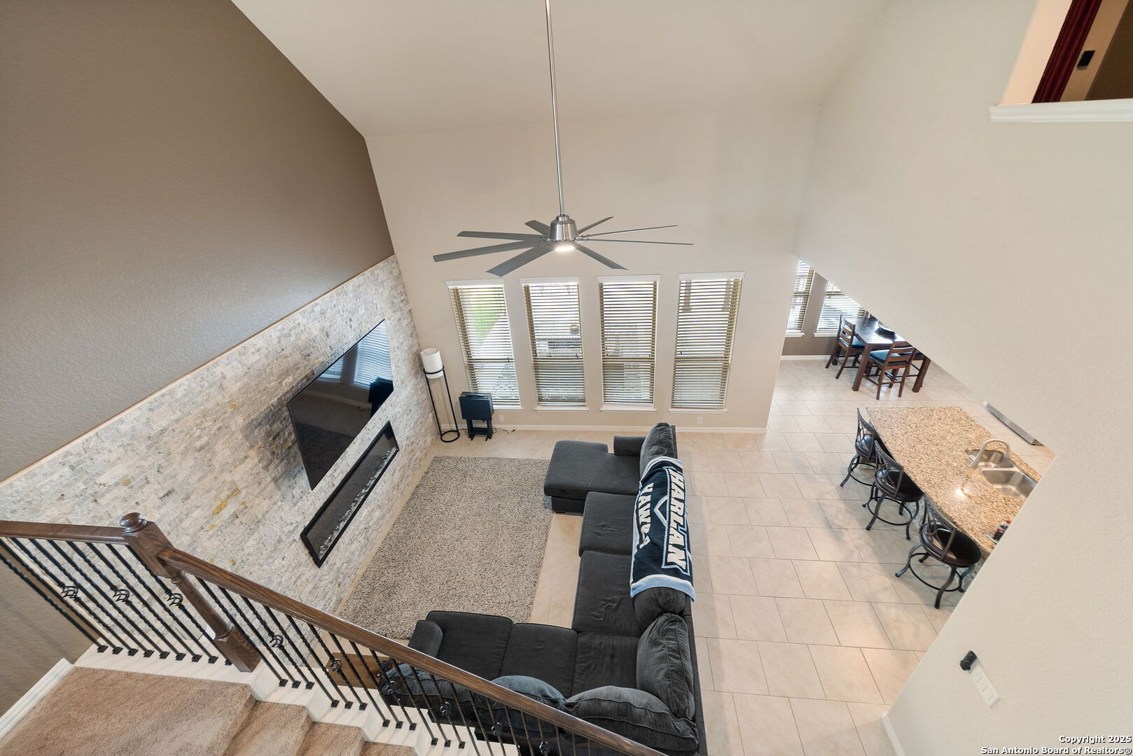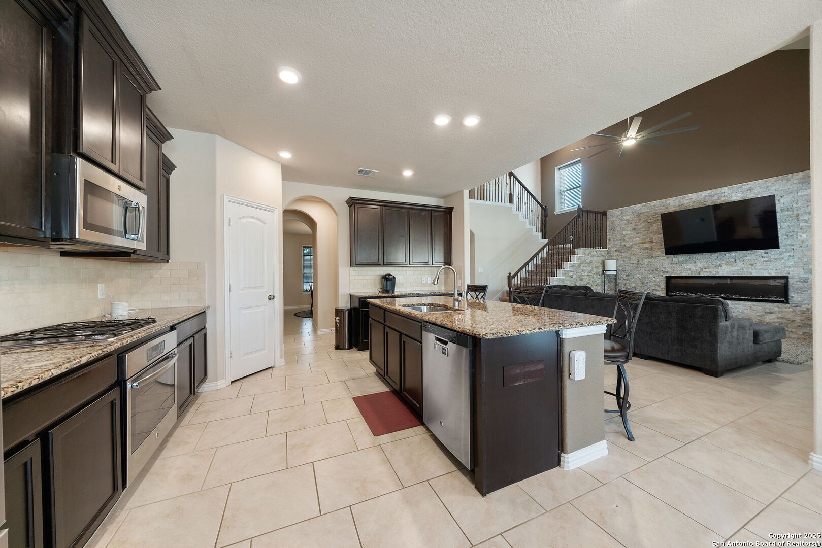 Step into comfort, elegance, and convenience of this beautifully maintained 4-bedroom, 3.5-bath home located in the sought-after Kallison Ranch community of San Antonio. This 2,868 sq ft residence offers elevated design, smart layout, and family-friendly features - all within one of the city's fastest-growing corridors. Enjoy a warm, inviting space with a custom stone backsplash and fireplace as the living room centerpiece. Chef's kitchen featuring granite countertops, 42" cabinetry, gas cooking, and a spacious island for family meals and entertaining. Media room perfect for movie nights, sports viewing, or gaming - your private home theater awaits upstairs. Primary suite downstairs includes double vanities, garden tub, walk-in shower, and a massive closet. Kids hideout: large under-the-stairs closet doubles as a magical nook for kids or clever storage. Enjoy your own resort style retreat with heated in ground pool with waterfall feature, covered patio and pergola and beautiful landscaping! Zoned to John M. Harlan High School, a rising star in Texas athletics! Prime location and exciting growth.