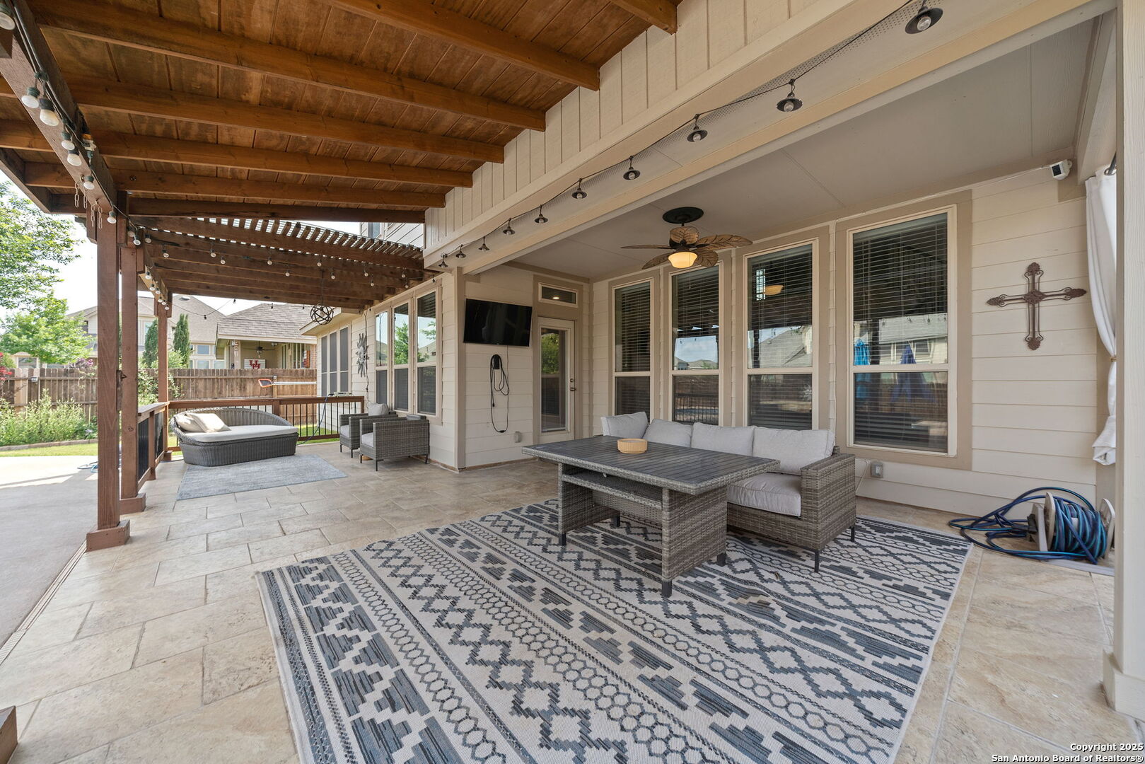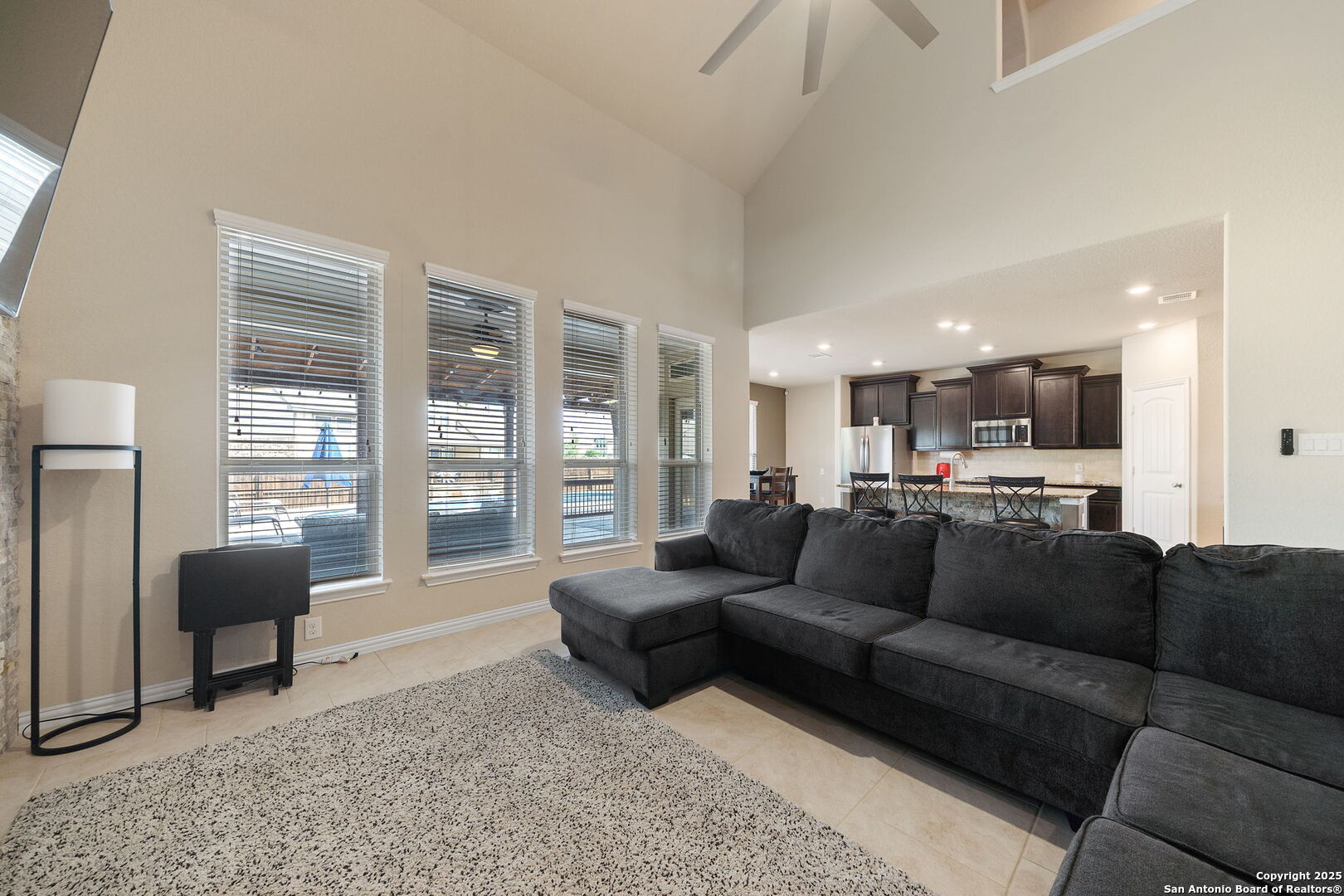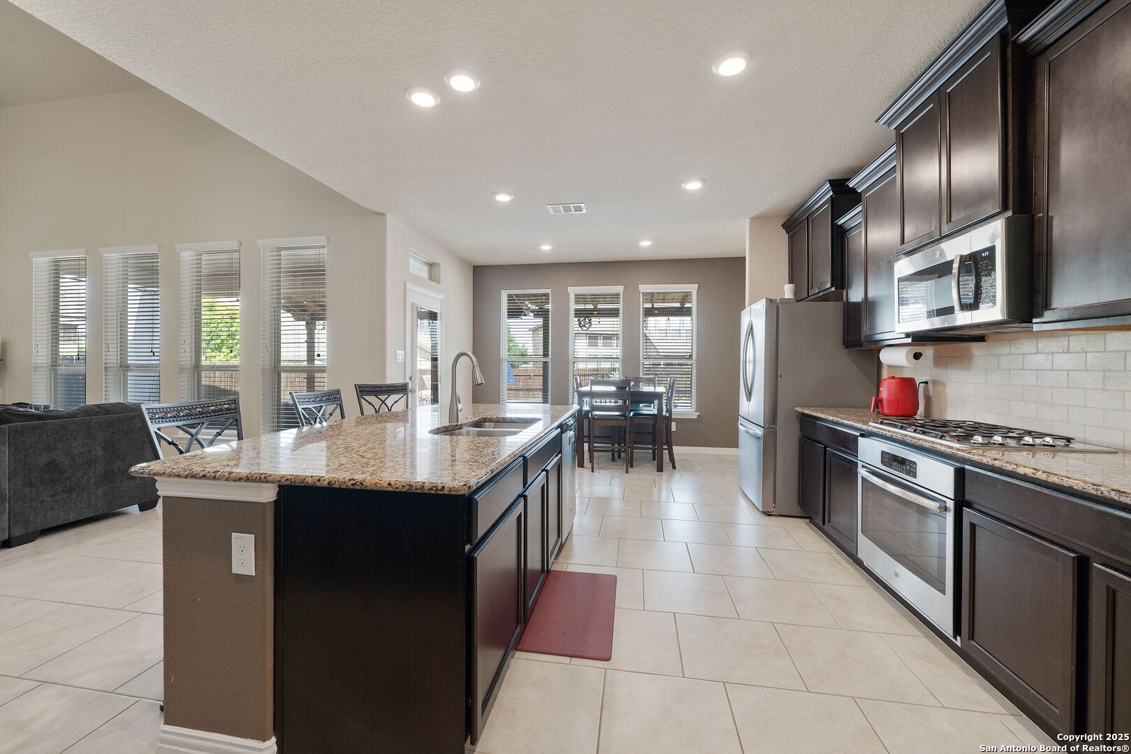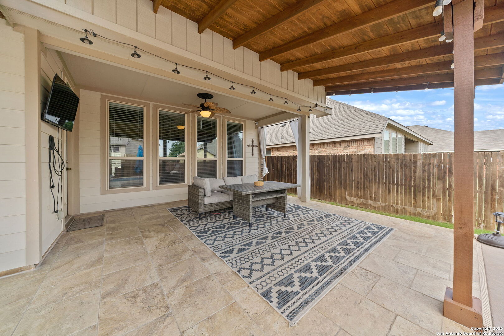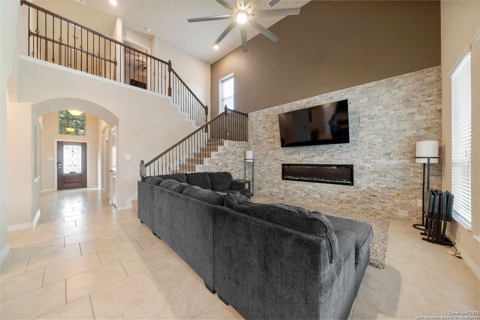 Step into comfort, elegance, and convenience of this beautifully maintained 4-bedroom, 3.5-bath home located in the sought-after Kallison Ranch community of San Antonio. This 2,868 sq ft residence offers elevated design, smart layout, and family-friendly features - all within one of the city's fastest-growing corridors. Enjoy a warm, inviting space with a custom stone backsplash and fireplace as the living room centerpiece. Chef's kitchen featuring granite countertops, 42" cabinetry, gas cooking, and a spacious island for family meals and entertaining. Media room perfect for movie nights, sports viewing, or gaming - your private home theater awaits upstairs. Primary suite downstairs includes double vanities, garden tub, walk-in shower, and a massive closet. Kids hideout: large under-the-stairs closet doubles as a magical nook for kids or clever storage. Enjoy your own resort style retreat with heated in ground pool with waterfall feature, covered patio and pergola and beautiful landscaping! Zoned to John M. Harlan High School, a rising star in Texas athletics! Prime location and exciting growth.
