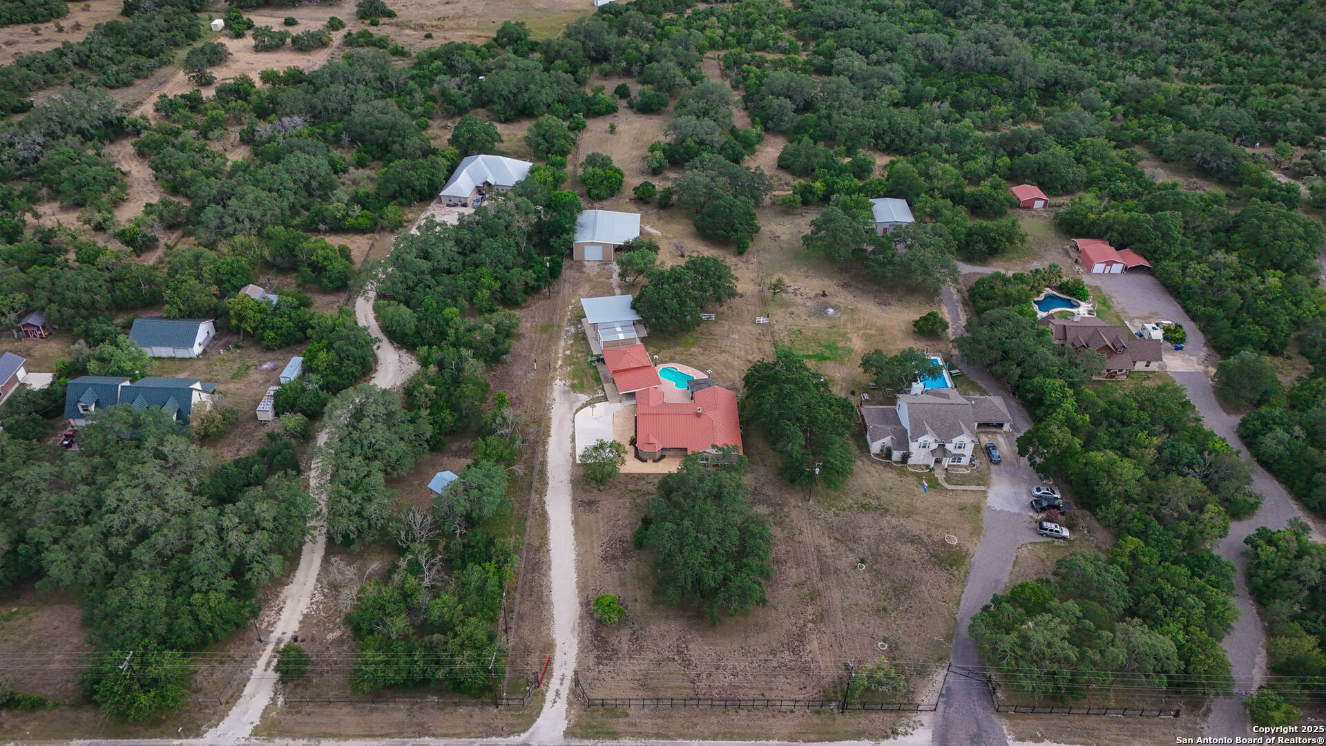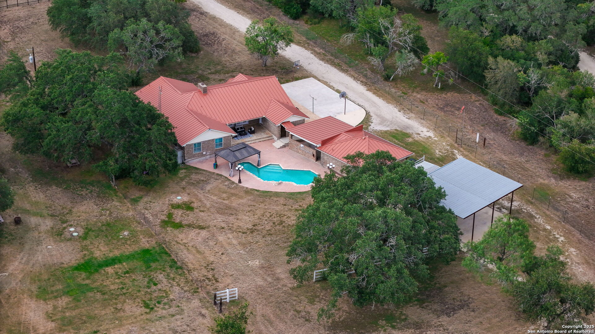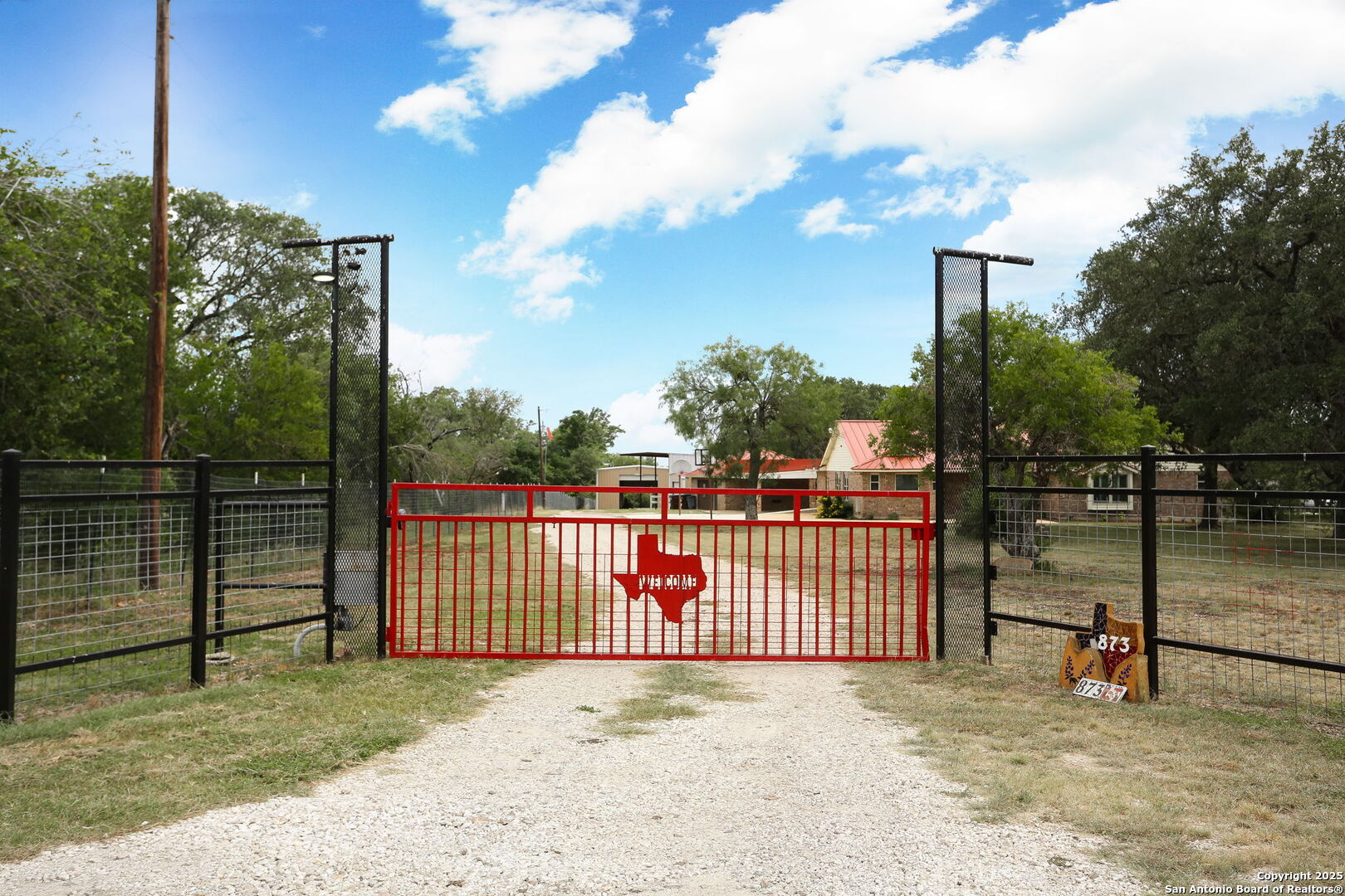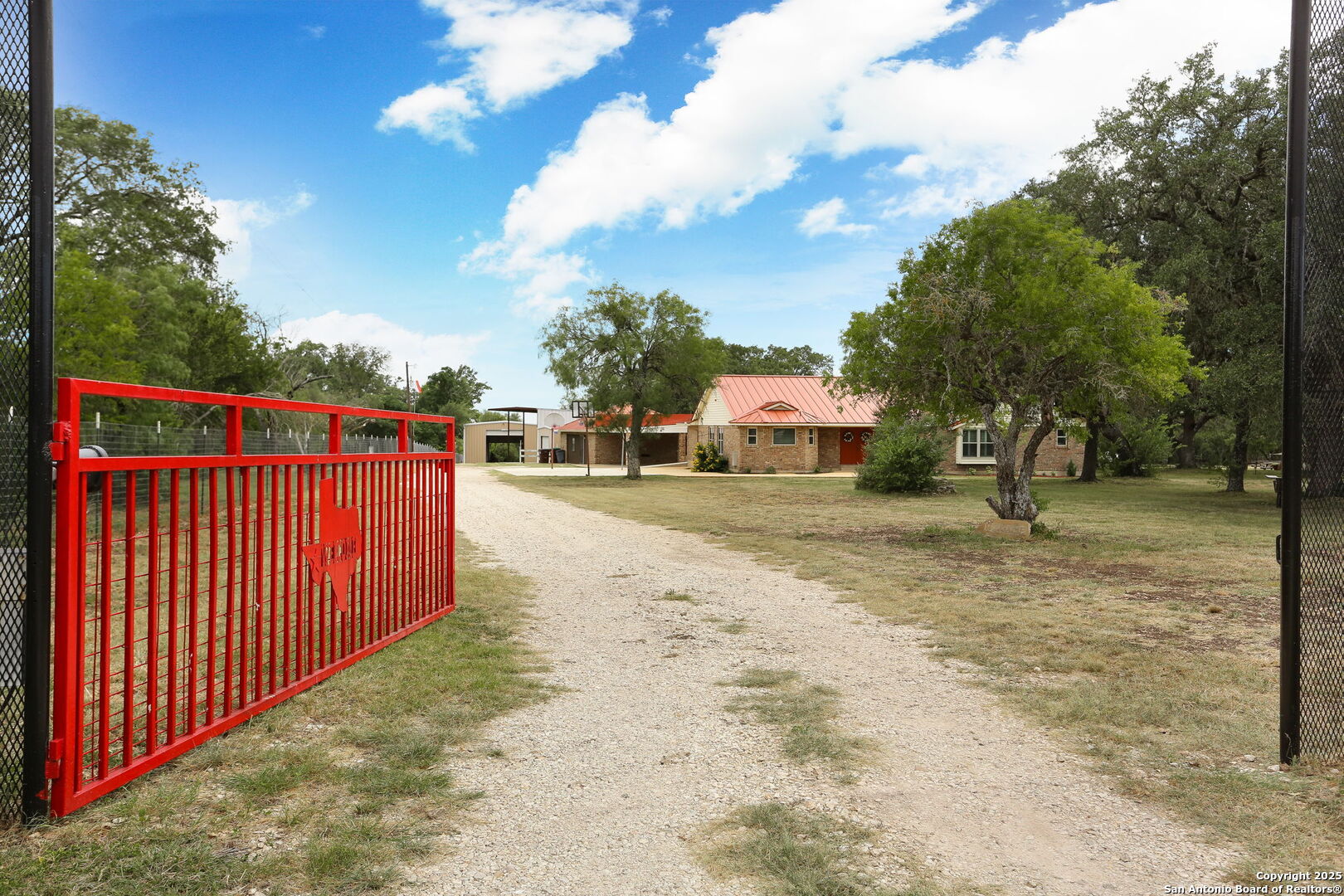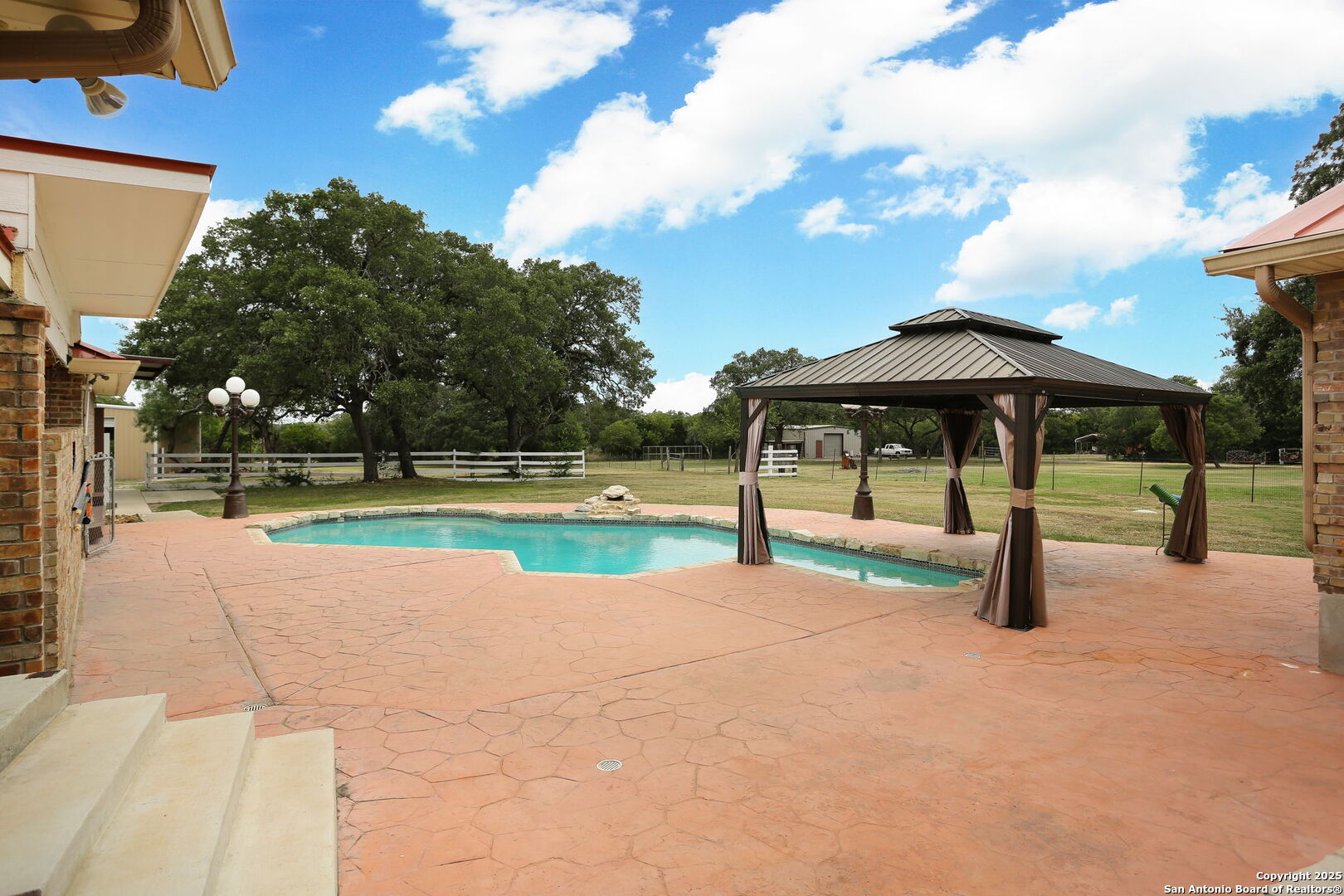 Set on 3.14 fully fenced acres, this beautiful and well maintained property offers a spacious 3-bedroom, 3-bath, 2524 sq ft main home plus a 675 sq ft casita perfect for multi-generational living, guests, or a private office. The main house features an oversized primary suite with a luxurious 6' cast iron soaking tub, separate shower, and custom solid oak built-ins for exceptional storage. The gourmet kitchen is a showstopper, featuring Blue Bahia granite countertops, custom oak cabinetry, and high-end appliances. The inviting living area boasts a cozy wood burning fireplace, creating the ideal space for relaxing evenings. This home has been modified to include wide 36" doorways, a wheelchair ramp entry, and a guest bath with a roll-in shower & safety rails. Outdoors, you'll love the sparkling pool and oversized flagstone patio that is perfect for entertaining. A short walk through the breezeway connects the main house to a 1-bedroom, 1-bath guest house with living area and kitchenette. Additionally, there is a 1,500 sq. ft. workshop with an air-conditioned upstairs office. The workshop contains another 1,000 sq. ft. of covered storage overhead with 220/110 wiring. In addition to the 2 car carport, there are 2 covered RV parking with 30 AMP hookup and an additional storage building. Best of all, this home is part of an HOA with no restrictions, giving you the freedom to truly make the property your own. Conveniently located just 27 miles west of downtown San Antonio and 11 miles from downtown Castroville. This property truly combines comfort, function, and style. Other upgrades include a standing seam metal roof, energy-efficient double-pane windows with a transferable lifetime warranty, and a high-efficiency A/C system with WiFi thermostat. Don't miss this rare opportunity-schedule your private showing today!