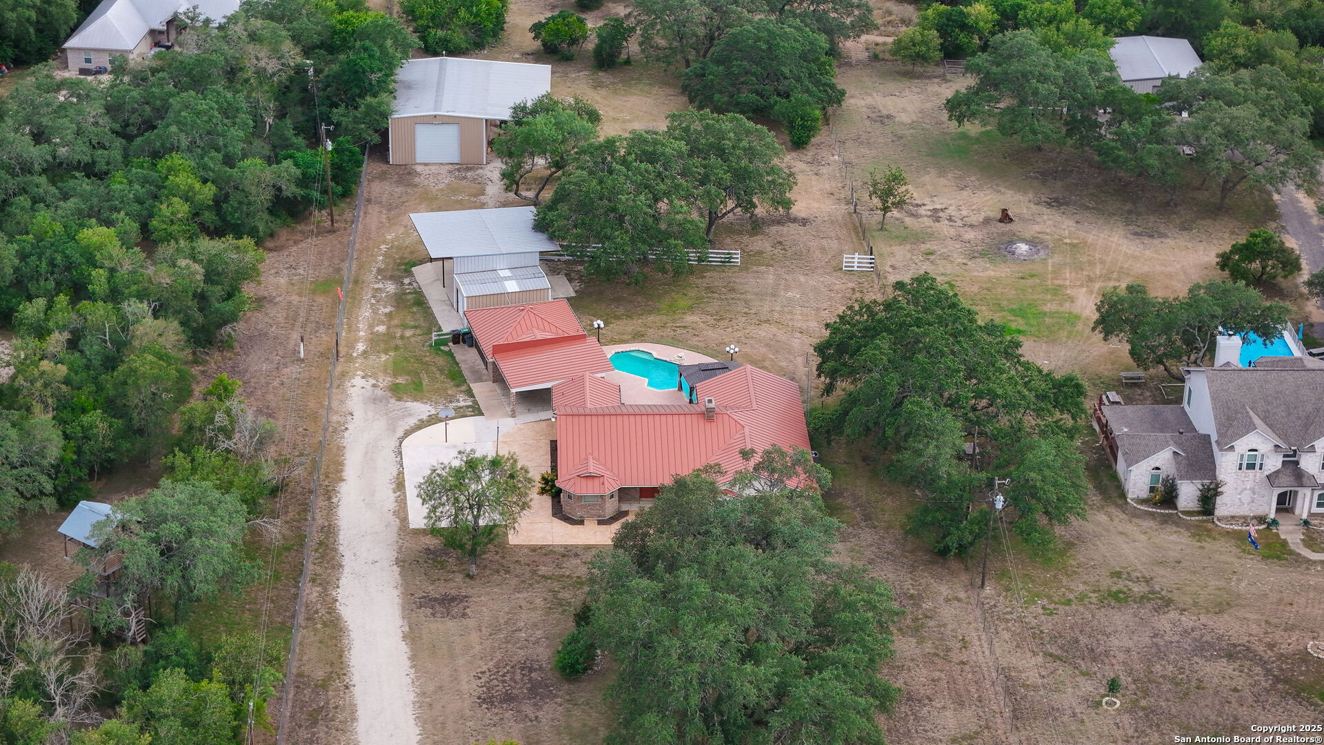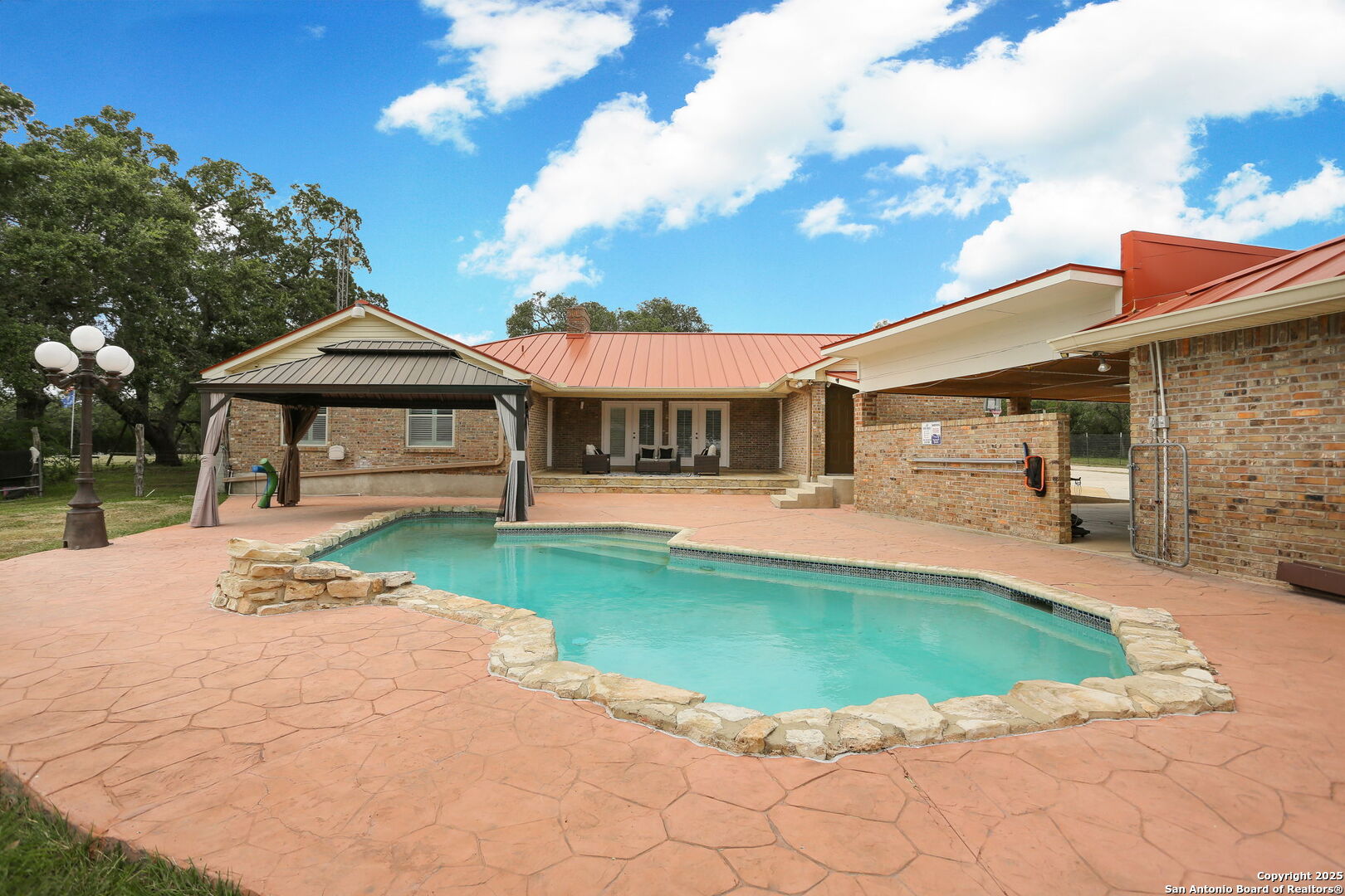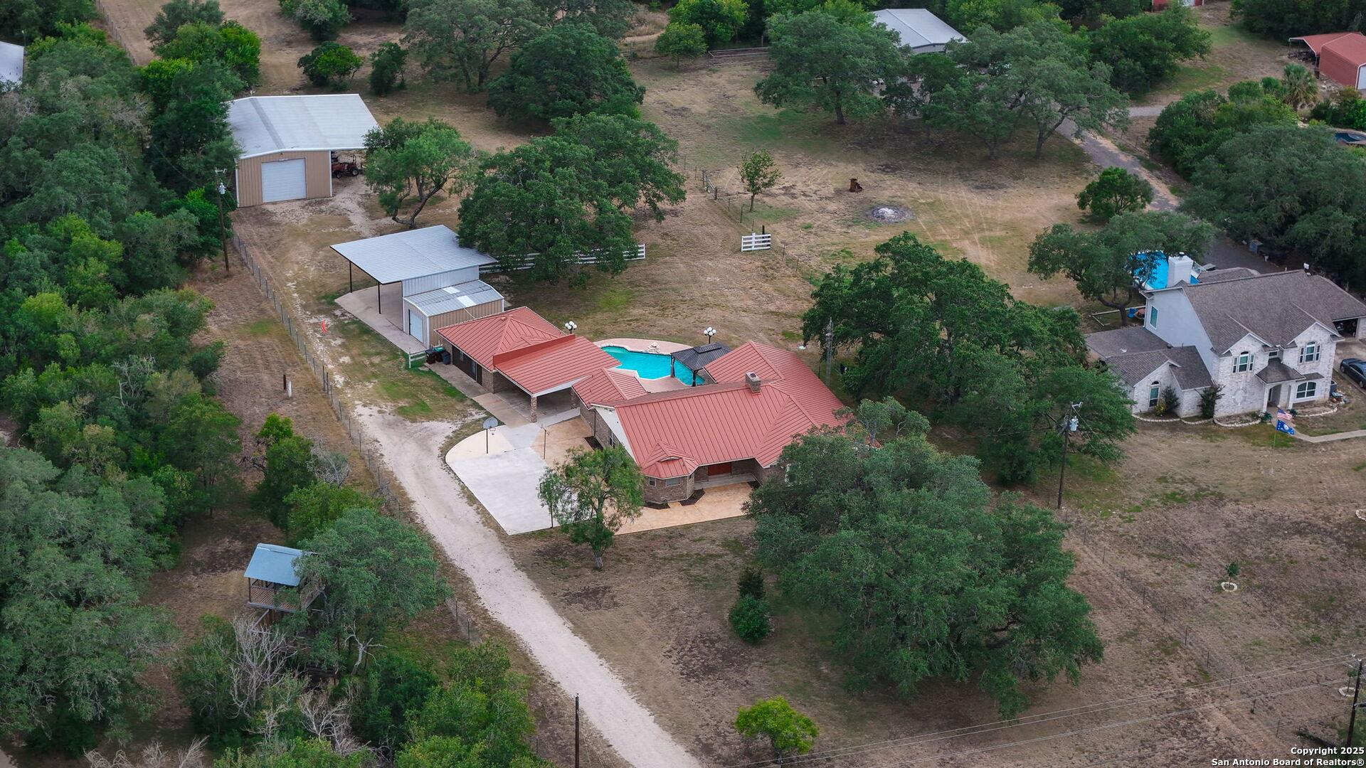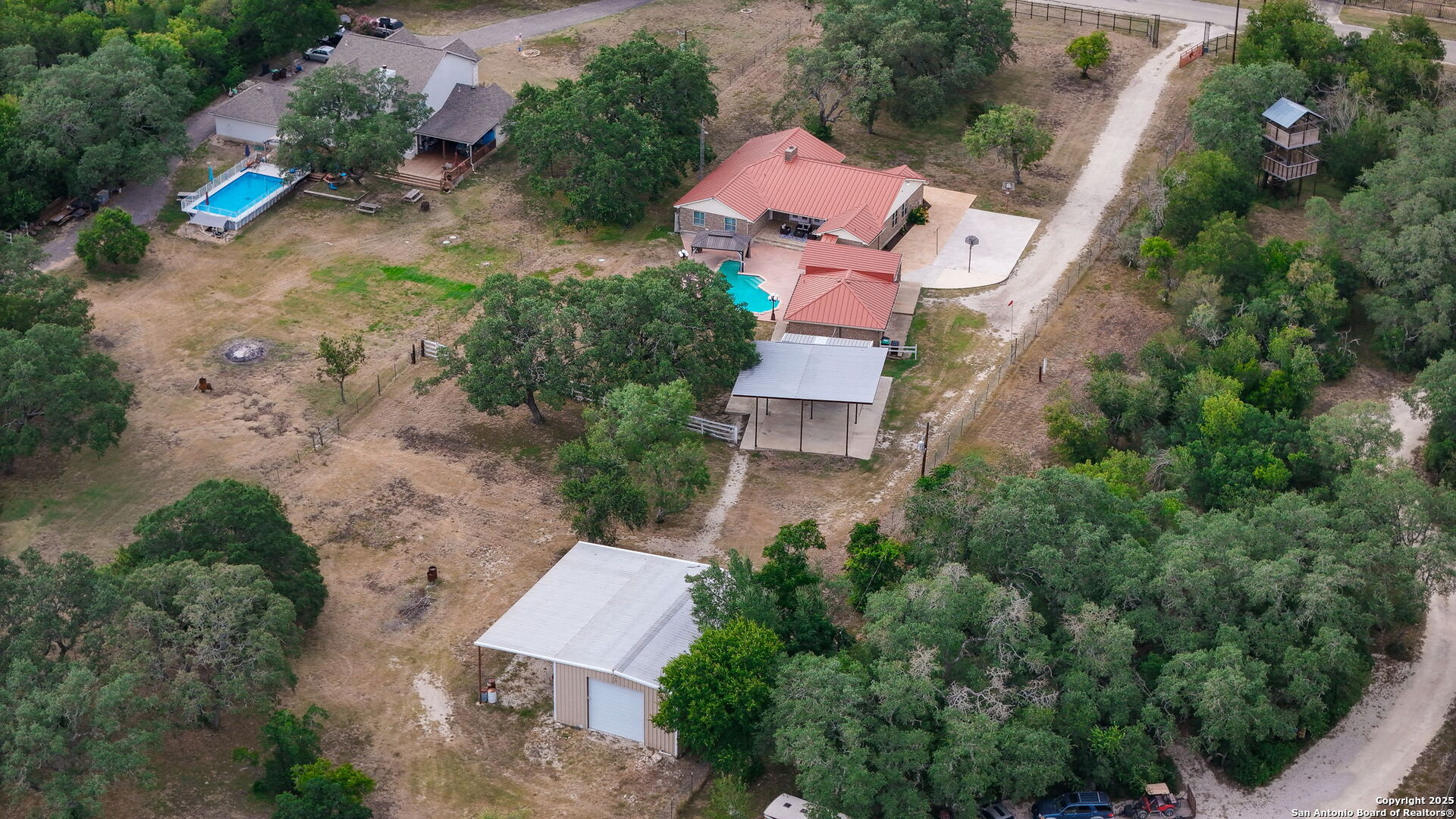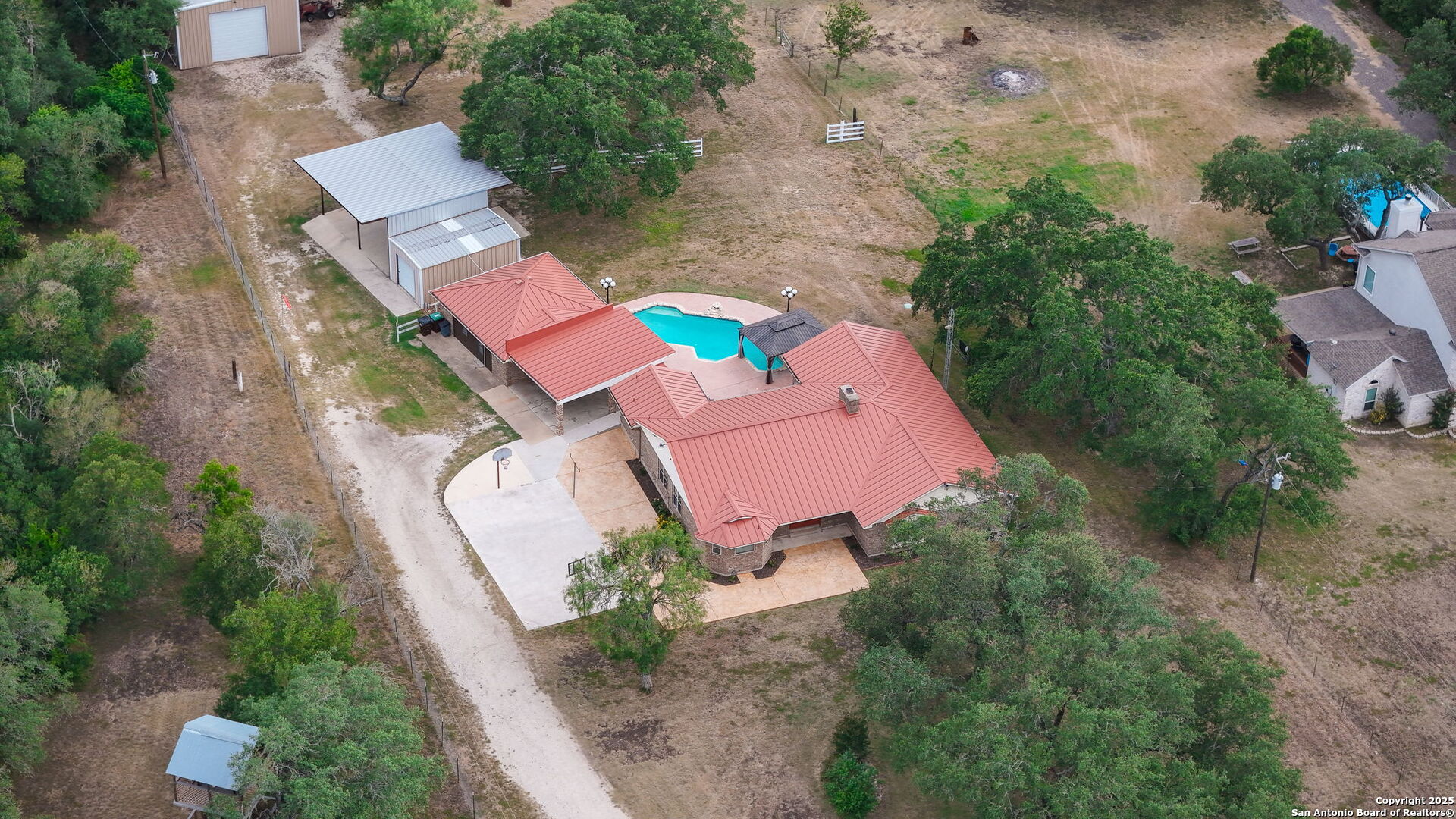 Set on 3.14 fully fenced acres, this beautiful and well maintained property offers a spacious 3-bedroom, 3-bath, 2524 sq ft main home plus a 675 sq ft casita perfect for multi-generational living, guests, or a private office. The main house features an oversized primary suite with a luxurious 6' cast iron soaking tub, separate shower, and custom solid oak built-ins for exceptional storage. The gourmet kitchen is a showstopper, featuring Blue Bahia granite countertops, custom oak cabinetry, and high-end appliances. The inviting living area boasts a cozy wood burning fireplace, creating the ideal space for relaxing evenings. This home has been modified to include wide 36" doorways, a wheelchair ramp entry, and a guest bath with a roll-in shower & safety rails. Outdoors, you'll love the sparkling pool and oversized flagstone patio that is perfect for entertaining. A short walk through the breezeway connects the main house to a 1-bedroom, 1-bath guest house with living area and kitchenette. Additionally, there is a 1,500 sq. ft. workshop with an air-conditioned upstairs office. The workshop contains another 1,000 sq. ft. of covered storage overhead with 220/110 wiring. In addition to the 2 car carport, there are 2 covered RV parking with 30 AMP hookup and an additional storage building. Best of all, this home is part of an HOA with no restrictions, giving you the freedom to truly make the property your own. Conveniently located just 27 miles west of downtown San Antonio and 11 miles from downtown Castroville. This property truly combines comfort, function, and style. Other upgrades include a standing seam metal roof, energy-efficient double-pane windows with a transferable lifetime warranty, and a high-efficiency A/C system with WiFi thermostat. Don't miss this rare opportunity-schedule your private showing today!