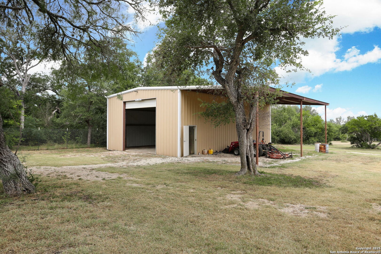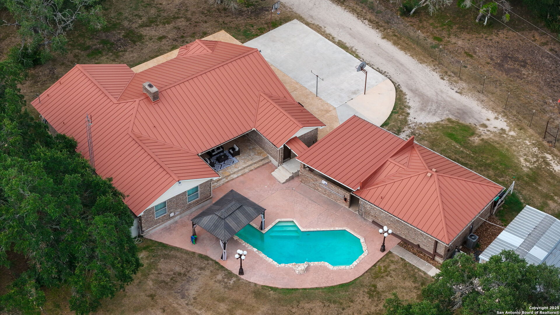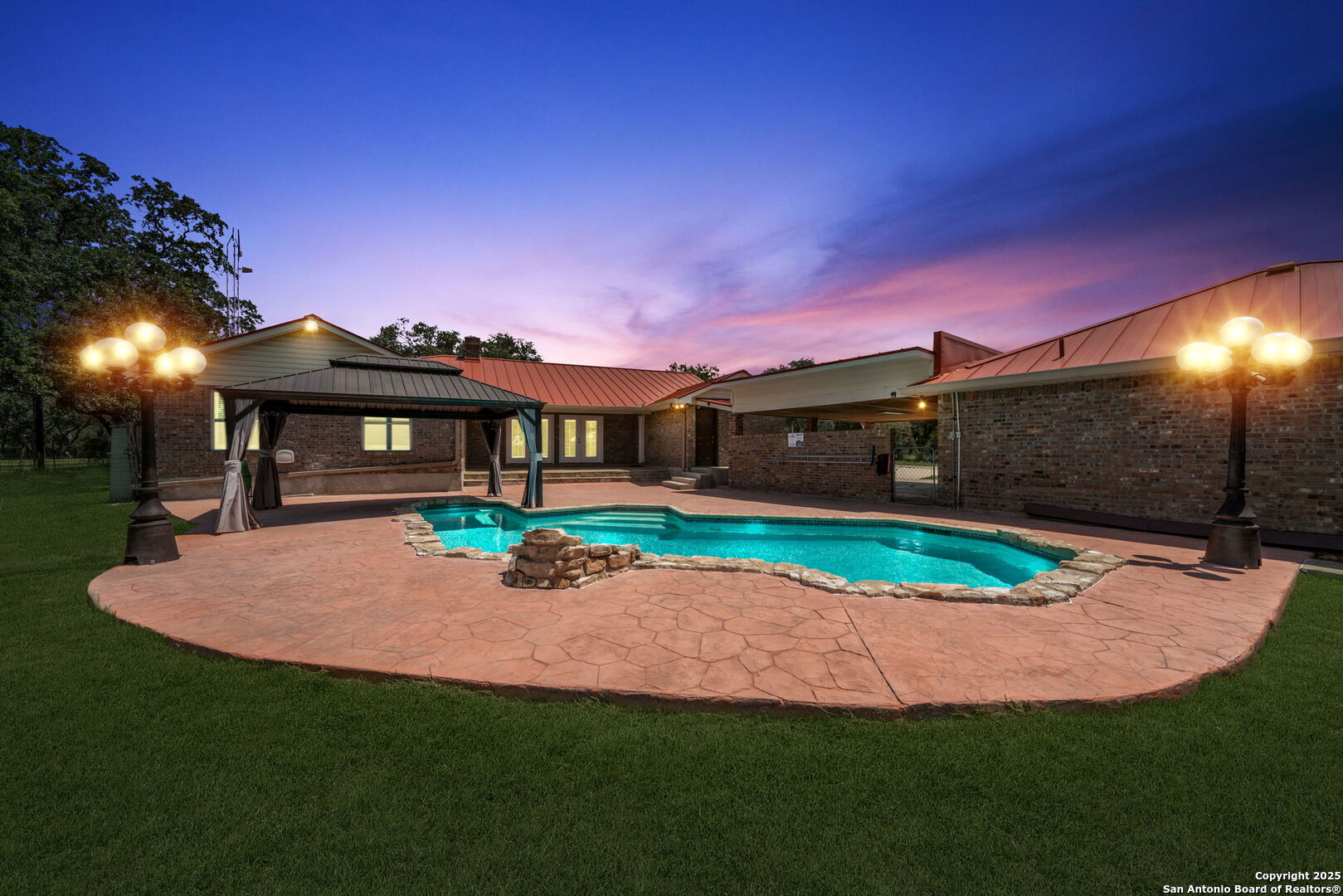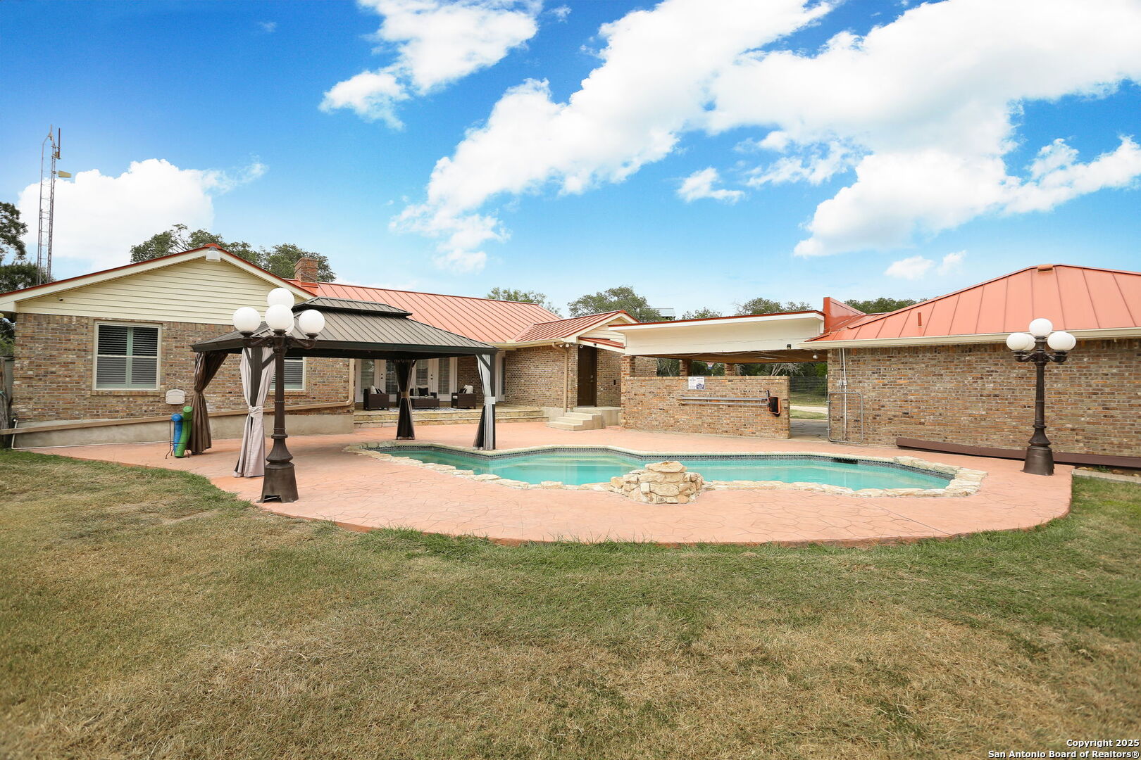 Set on 3.14 fully fenced acres, this beautiful and well maintained property offers a spacious 3-bedroom, 3-bath, 2524 sq ft main home plus a 675 sq ft casita perfect for multi-generational living, guests, or a private office. The main house features an oversized primary suite with a luxurious 6' cast iron soaking tub, separate shower, and custom solid oak built-ins for exceptional storage. The gourmet kitchen is a showstopper, featuring Blue Bahia granite countertops, custom oak cabinetry, and high-end appliances. The inviting living area boasts a cozy wood burning fireplace, creating the ideal space for relaxing evenings. This home has been modified to include wide 36" doorways, a wheelchair ramp entry, and a guest bath with a roll-in shower & safety rails. Outdoors, you'll love the sparkling pool and oversized flagstone patio that is perfect for entertaining. A short walk through the breezeway connects the main house to a 1-bedroom, 1-bath guest house with living area and kitchenette. Additionally, there is a 1,500 sq. ft. workshop with an air-conditioned upstairs office. The workshop contains another 1,000 sq. ft. of covered storage overhead with 220/110 wiring. In addition to the 2 car carport, there are 2 covered RV parking with 30 AMP hookup and an additional storage building. Best of all, this home is part of an HOA with no restrictions, giving you the freedom to truly make the property your own. Conveniently located just 27 miles west of downtown San Antonio and 11 miles from downtown Castroville. This property truly combines comfort, function, and style. Other upgrades include a standing seam metal roof, energy-efficient double-pane windows with a transferable lifetime warranty, and a high-efficiency A/C system with WiFi thermostat. Don't miss this rare opportunity-schedule your private showing today!