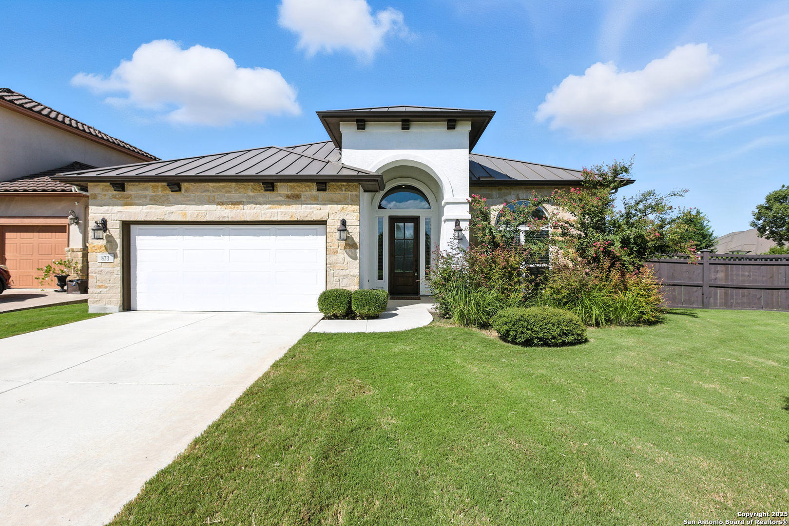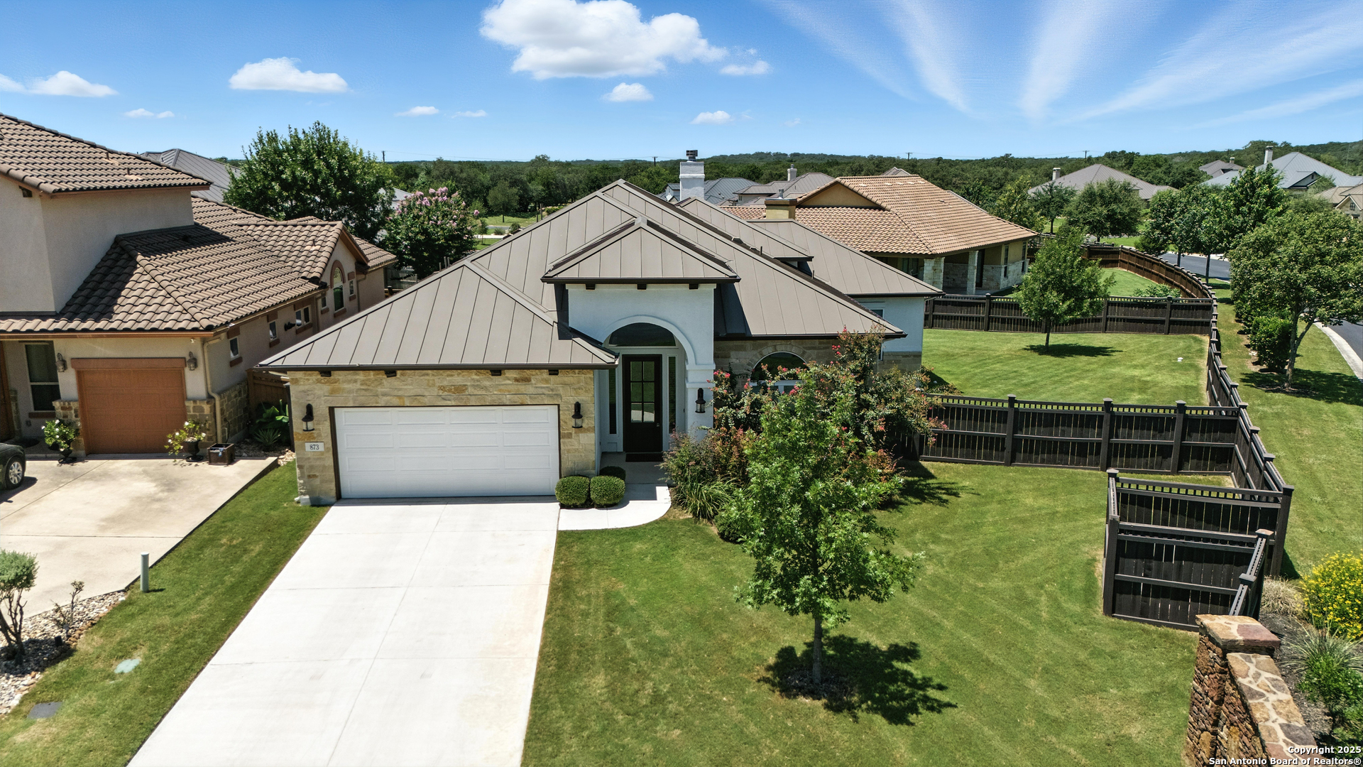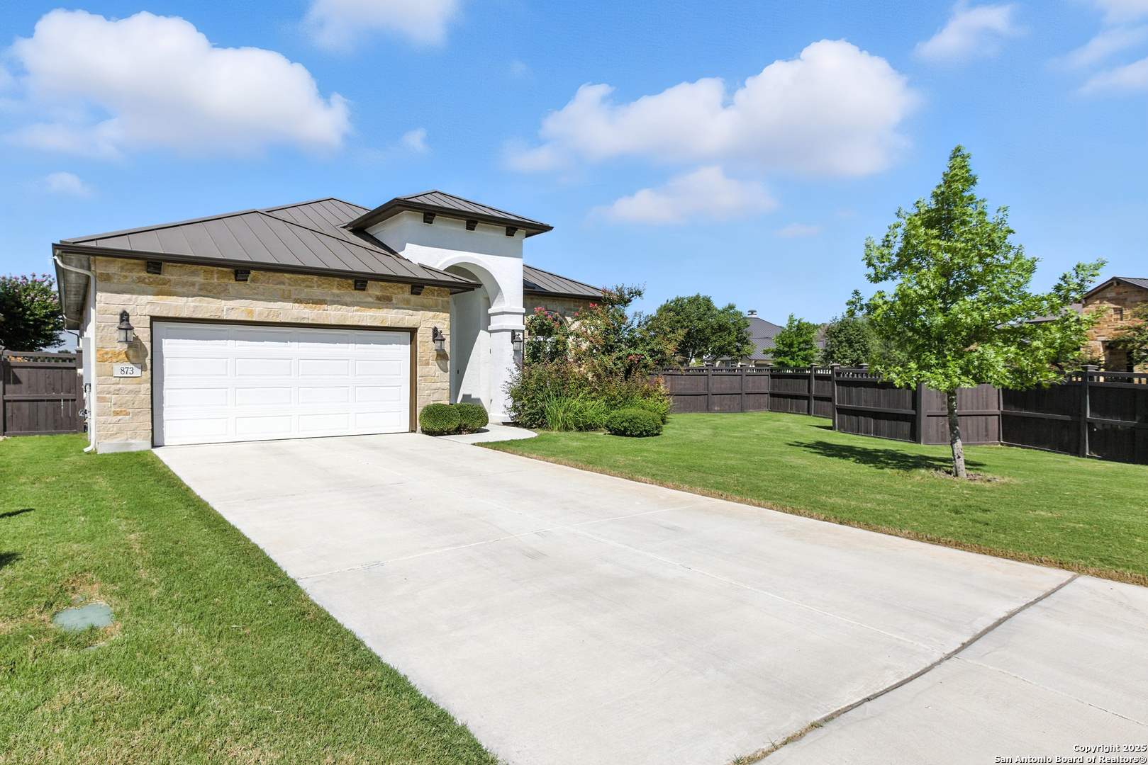 Welcome to 873 Lorikeet Lane, a custom-designed single-story home located in the prestigious gated community of Newcombe Tennis Ranch. Built by Rialto Homes in 2019, this 2,282 sq ft beauty offers 3 spacious bedrooms and 3 full bathrooms in a modern, open-concept layout. As you step through the grand entrance, you'll be greeted by soaring ceilings and a welcoming flow into the heart of the home. The living area features a floor-to-ceiling stone fireplace and flows seamlessly into the gourmet kitchen, complete with 42" cabinetry, granite countertops, a large walk-in pantry, stainless appliances, and a custom tile backsplash. The island eat-in setup and hardwood flooring elevate the space. The primary bedroom retreat is thoughtfully located downstairs and features a tray ceiling, oversized walk-in closet with built-ins, dual vanities, and an impressive walk-in shower. A guest suite with its own ensuite bath and walk-in closet sits privately at the front of the home, while a third bedroom and full bath offer additional flexibility. Enjoy the convenience of a mudroom as well as utility room with extra storage. Step outside to the 10'x10' covered patio surrounded by mature landscaping and a full sprinkler system. Other highlights include a water softener, Low E windows, radiant barrier decking, and variable speed HVAC. Enjoy neighborhood amenities including a tennis complex, pool, clubhouse, and more-all just minutes from shopping, dining, and top-rated New Braunfels ISD schools.