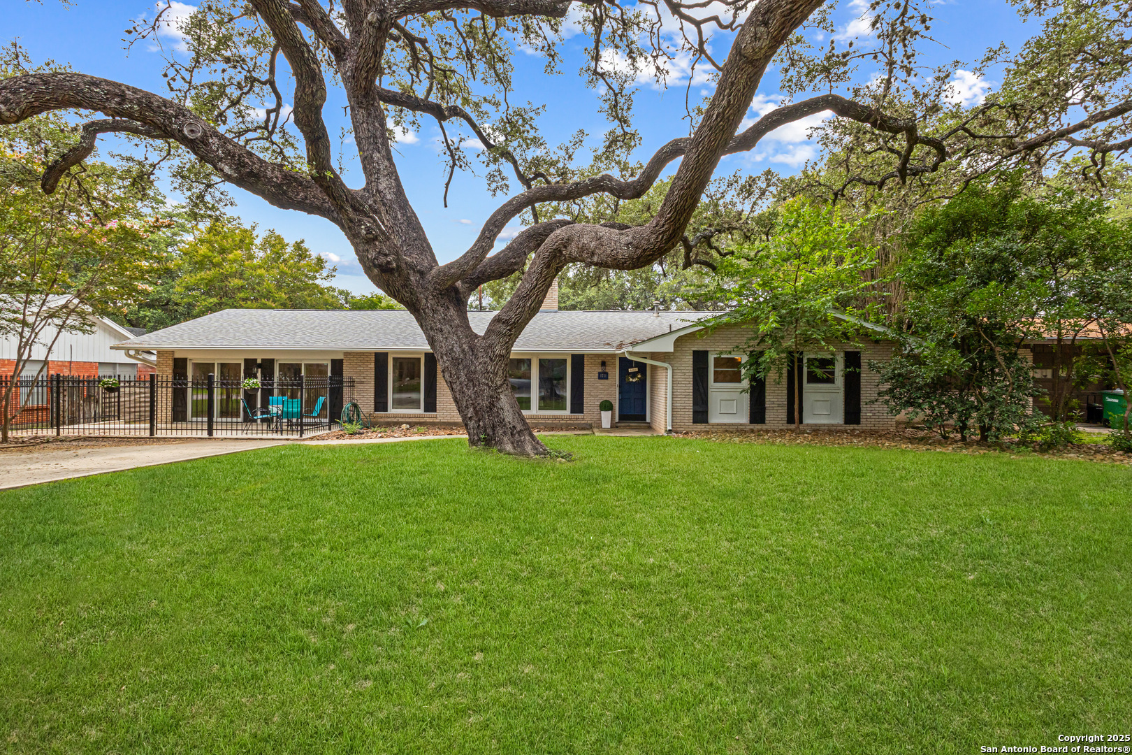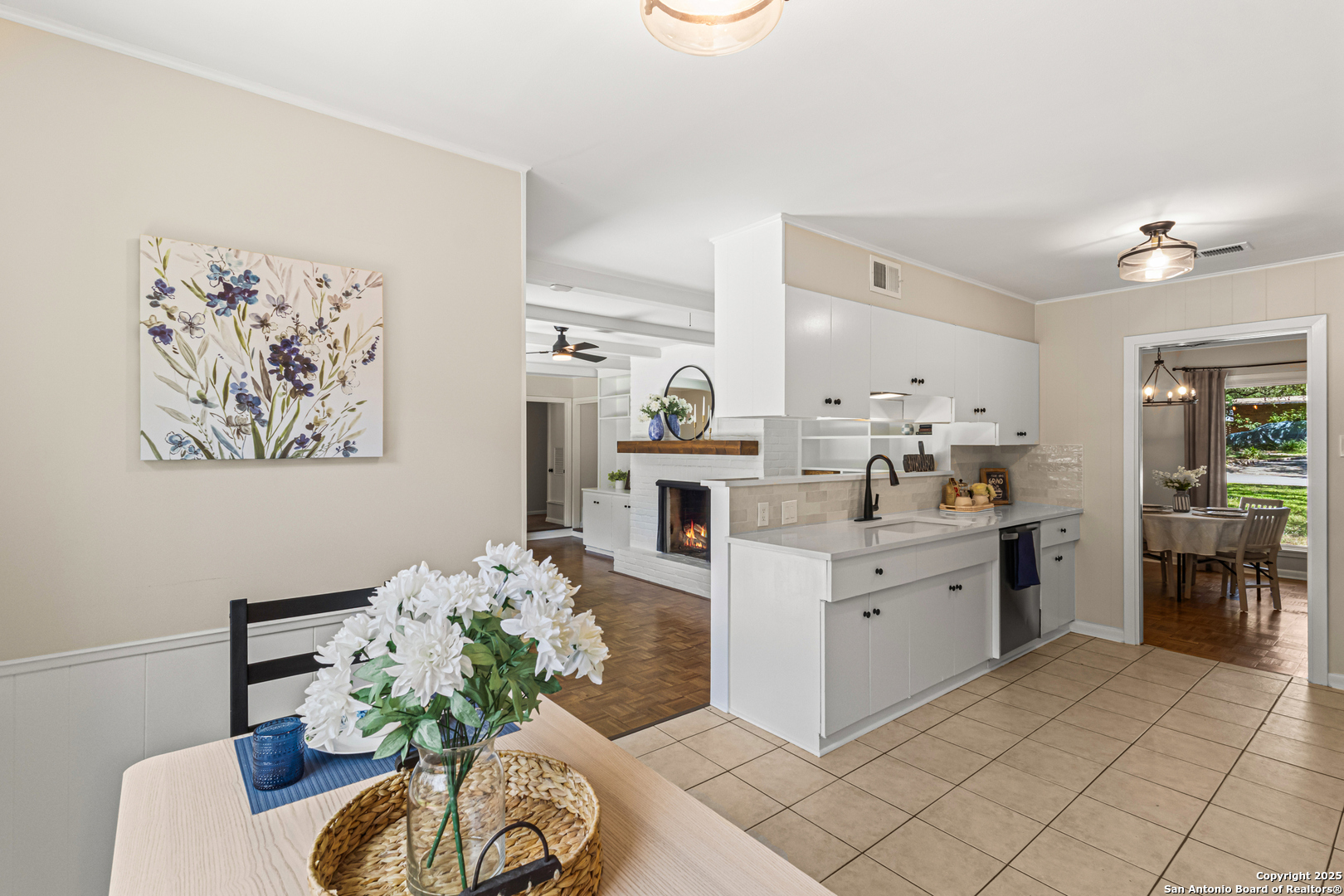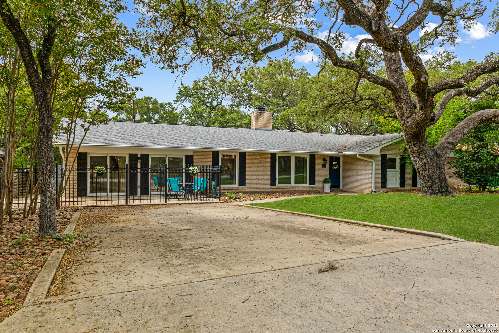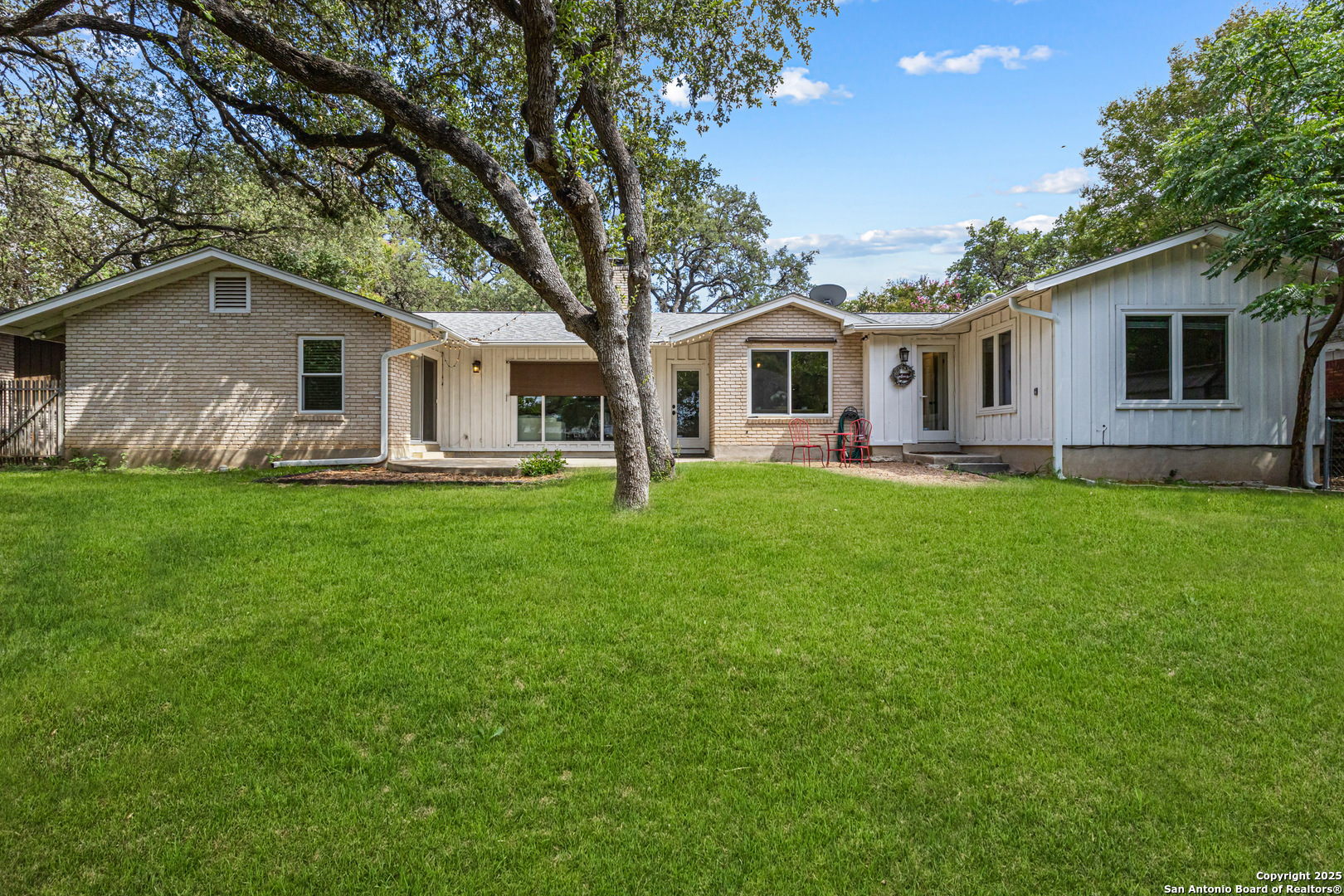 This Midcentury Modern 1-story home with Pella windows throughout offers serene views and natural light. The thoughtfully designed residence features clean architectural lines, a dual-sided wood-burning fireplace, and two patios perfect for outdoor relaxation or entertaining. Freshly painted interior and double-pane windows add to the comfort and energy efficiency. The home includes three flexible living areas, including a large bonus room ideal as a game room, media space, office, or home gym. The updated kitchen boasts quartz countertops, subway tile backsplash, stainless steel vent hood, dishwasher, and gas cooktop. Layout offers privacy with 3 bedrooms and 2 bathrooms on one side, and a separate guest suite with its own entrance and private bath-ideal for visitors, multigenerational living, or potential income use. Converted garage offers additional storage or workshop space. Conveniently located near Fort Sam Houston/SAMMC, Loop 410, and the airport. Discover comfort, style, and versatility in this well-maintained home!