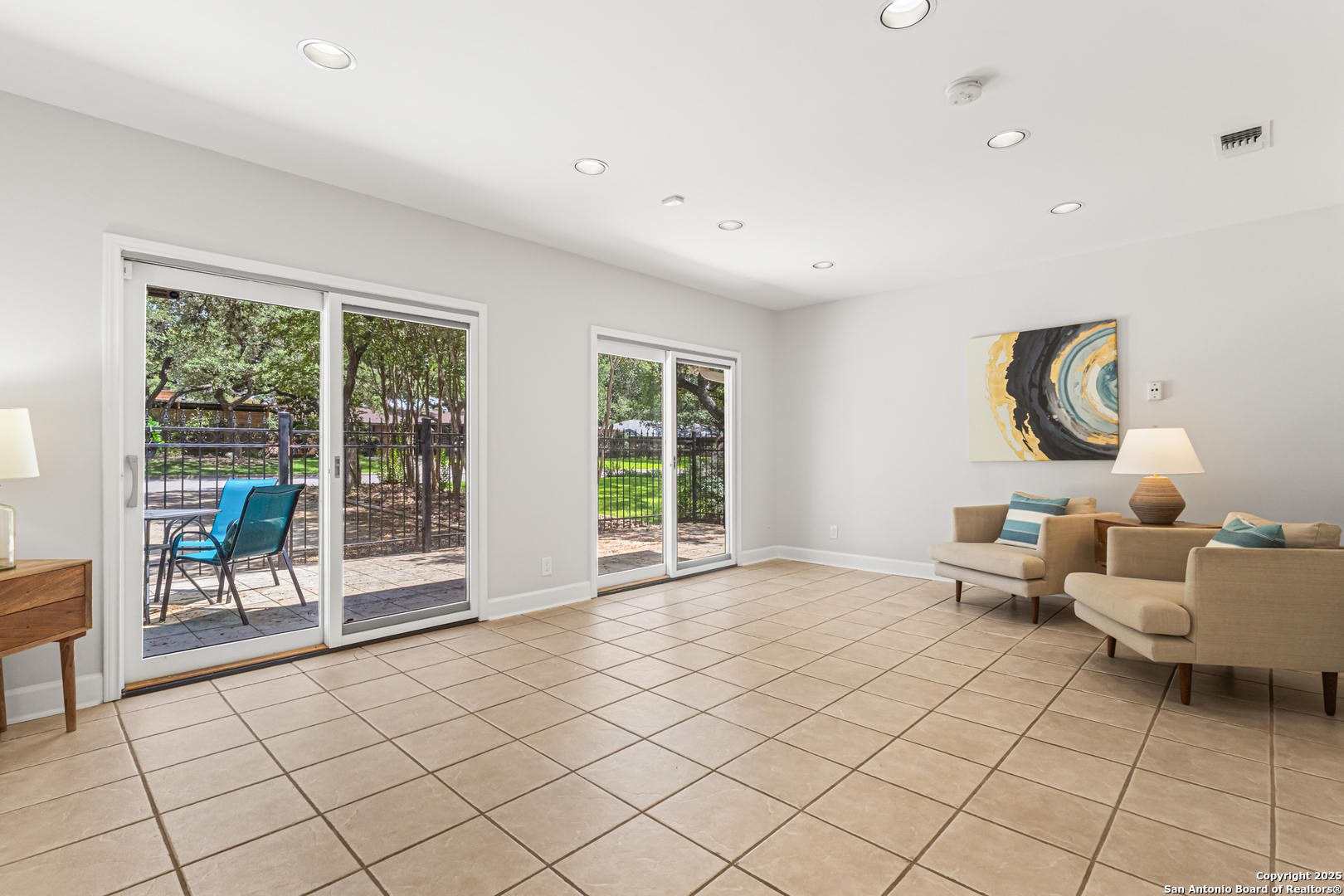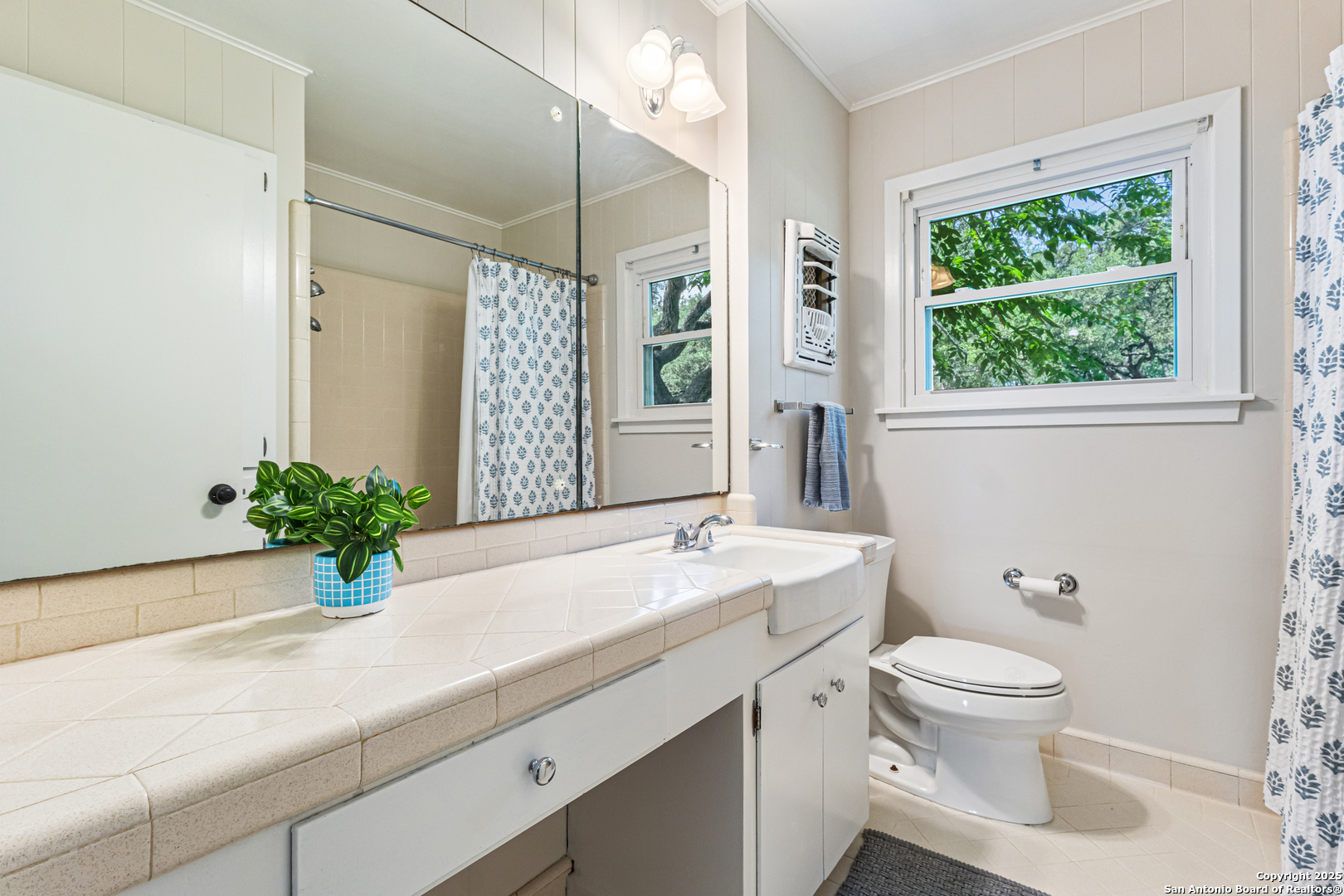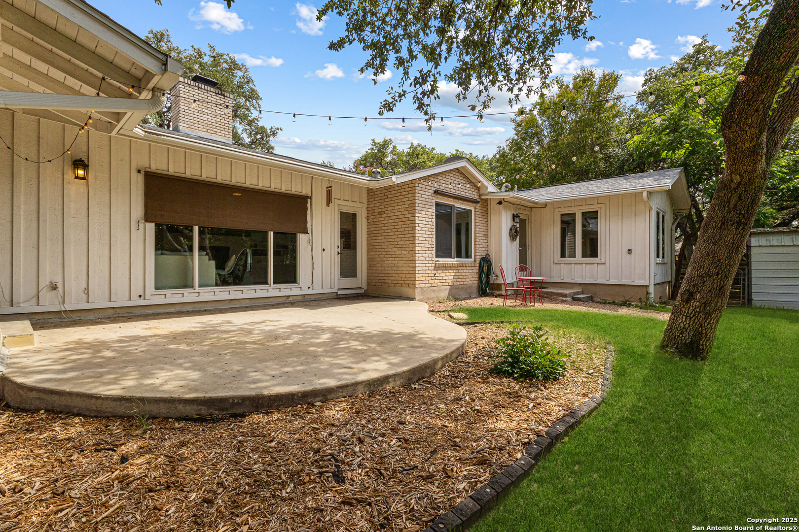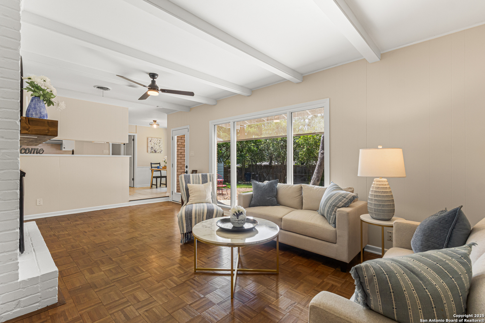 This Midcentury Modern 1-story home with Pella windows throughout offers serene views and natural light. The thoughtfully designed residence features clean architectural lines, a dual-sided wood-burning fireplace, and two patios perfect for outdoor relaxation or entertaining. Freshly painted interior and double-pane windows add to the comfort and energy efficiency. The home includes three flexible living areas, including a large bonus room ideal as a game room, media space, office, or home gym. The updated kitchen boasts quartz countertops, subway tile backsplash, stainless steel vent hood, dishwasher, and gas cooktop. Layout offers privacy with 3 bedrooms and 2 bathrooms on one side, and a separate guest suite with its own entrance and private bath-ideal for visitors, multigenerational living, or potential income use. Converted garage offers additional storage or workshop space. Conveniently located near Fort Sam Houston/SAMMC, Loop 410, and the airport. Discover comfort, style, and versatility in this well-maintained home!